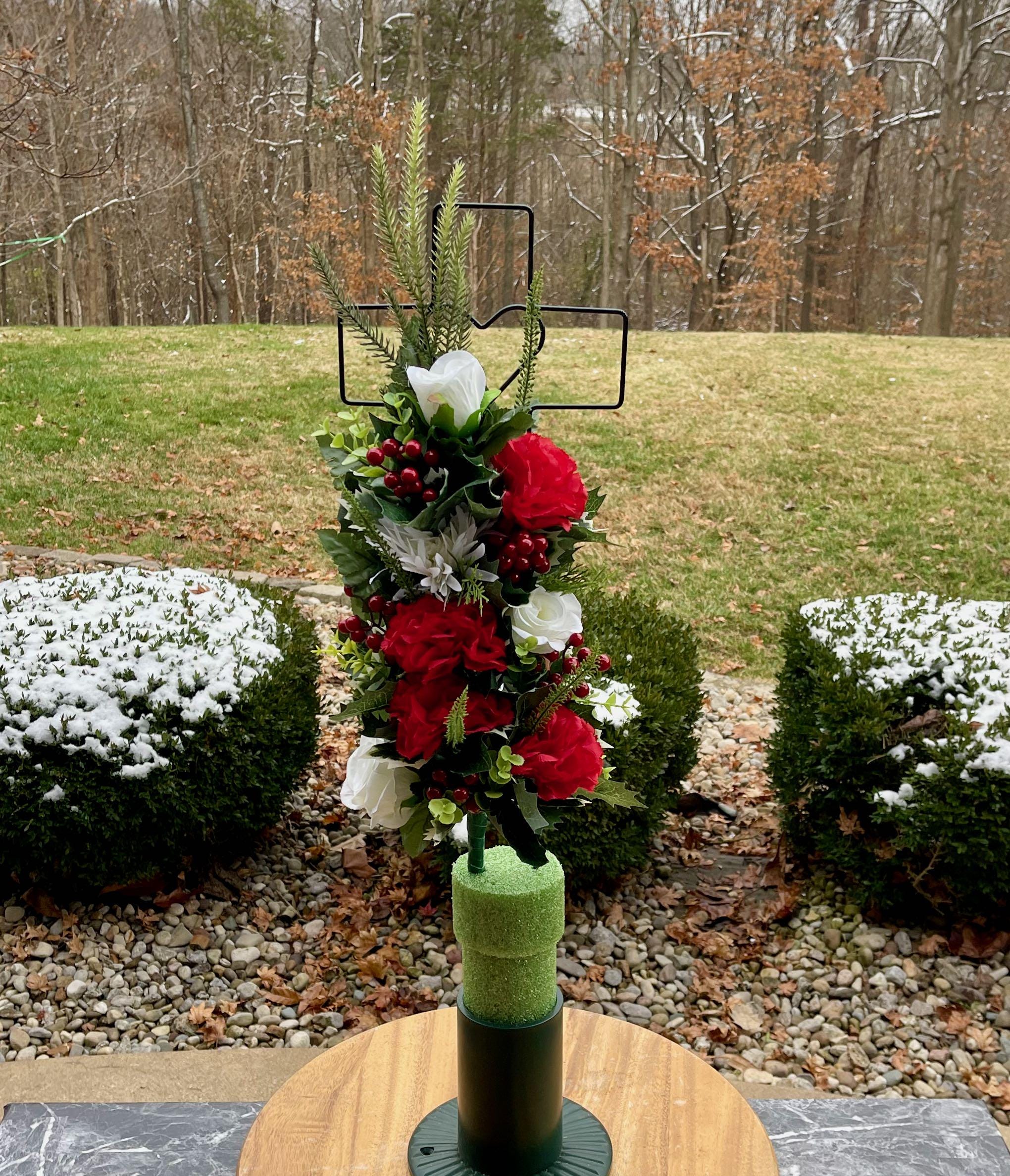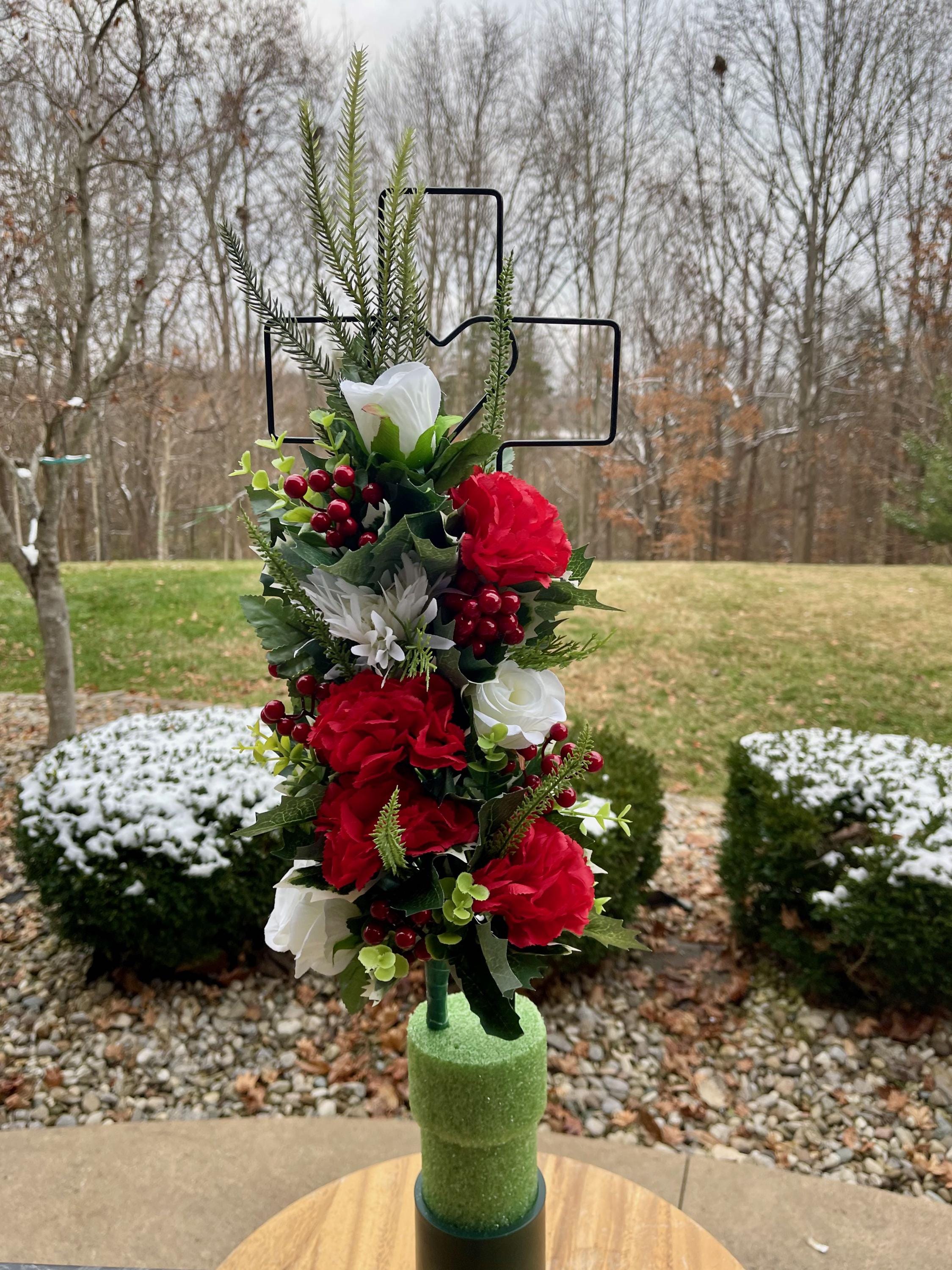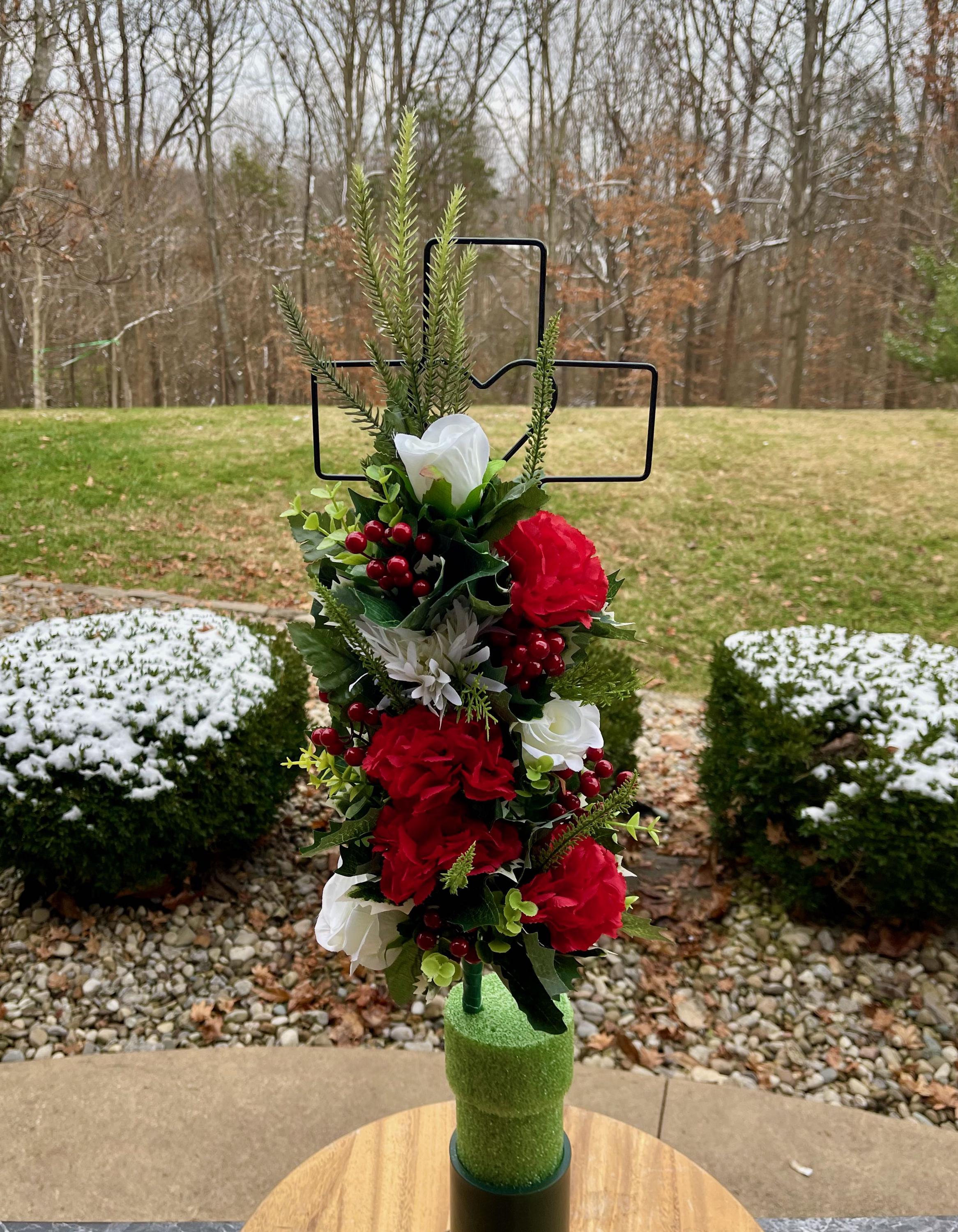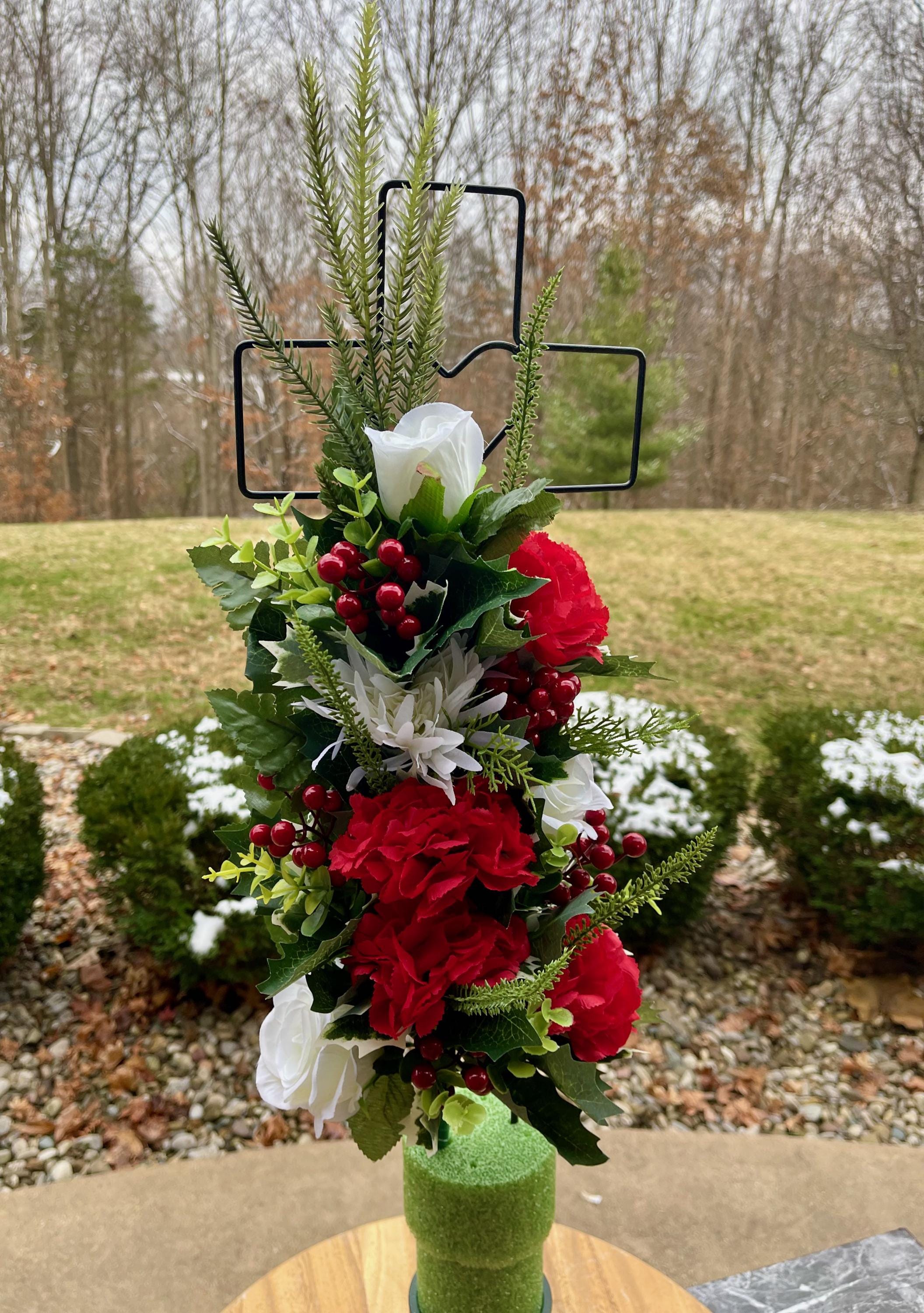 - Vase and Metal Cross arrangements use a “foam” insert; but for photos, they're displayed in a “plastic” holder just for stability—which is not included but can be purchased separately.