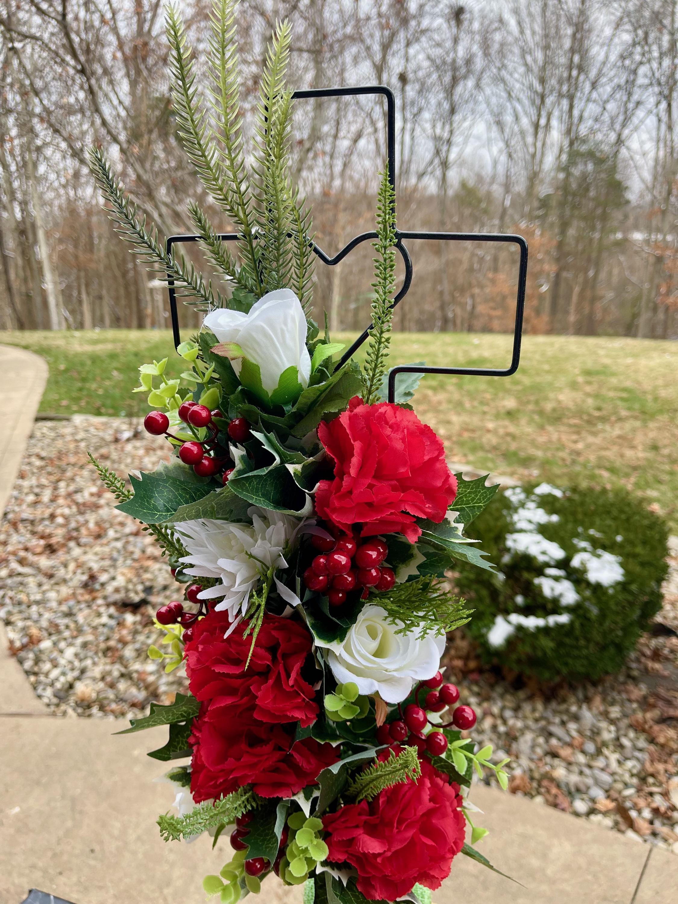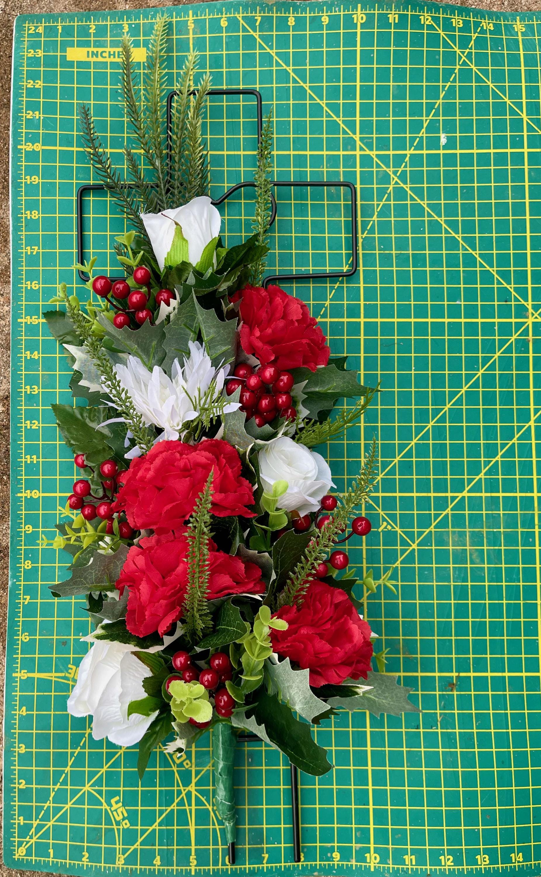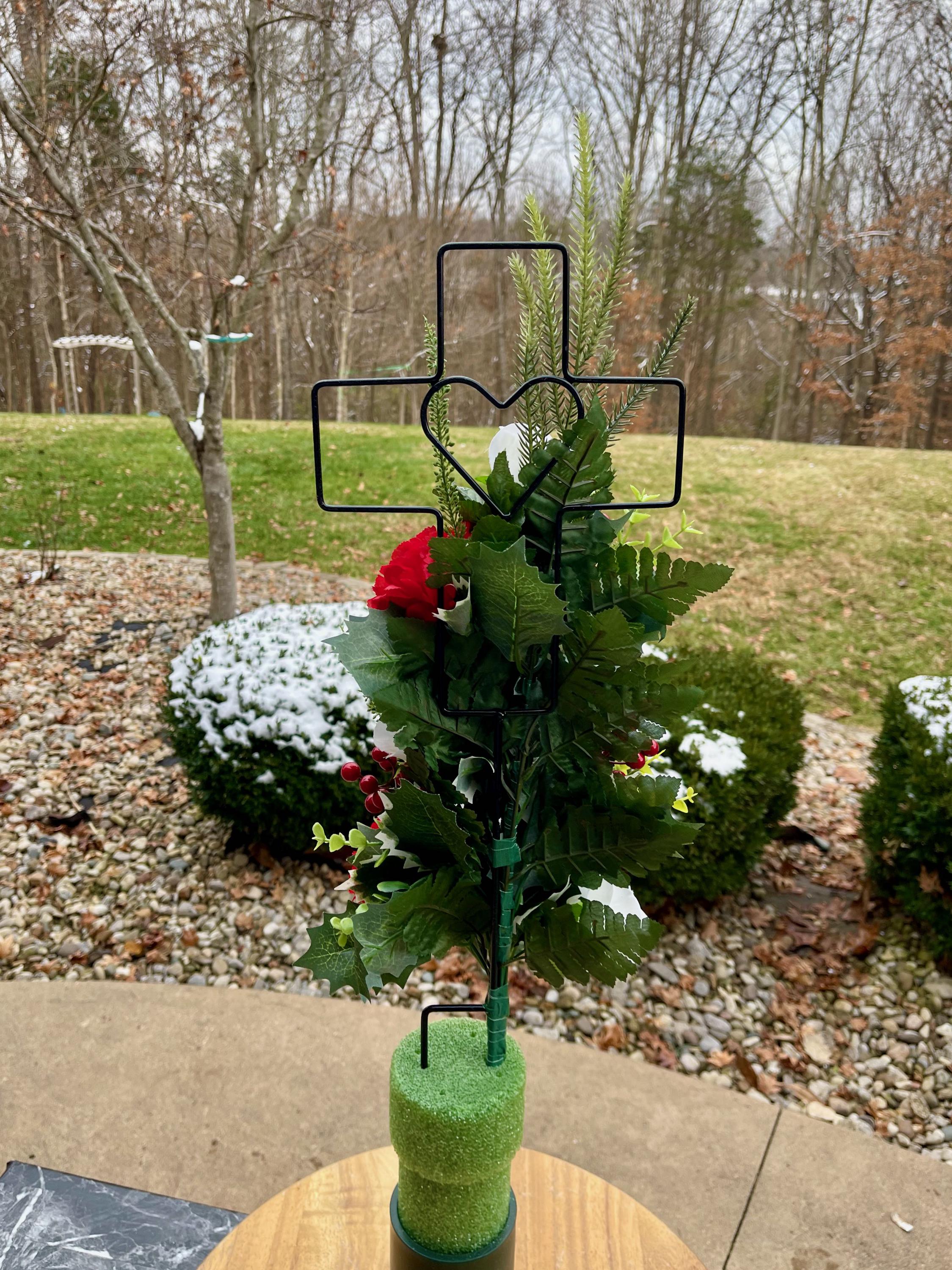 Christmas Arrangement on Metal Cross with Heart for Cemetery; Flowers with Berries