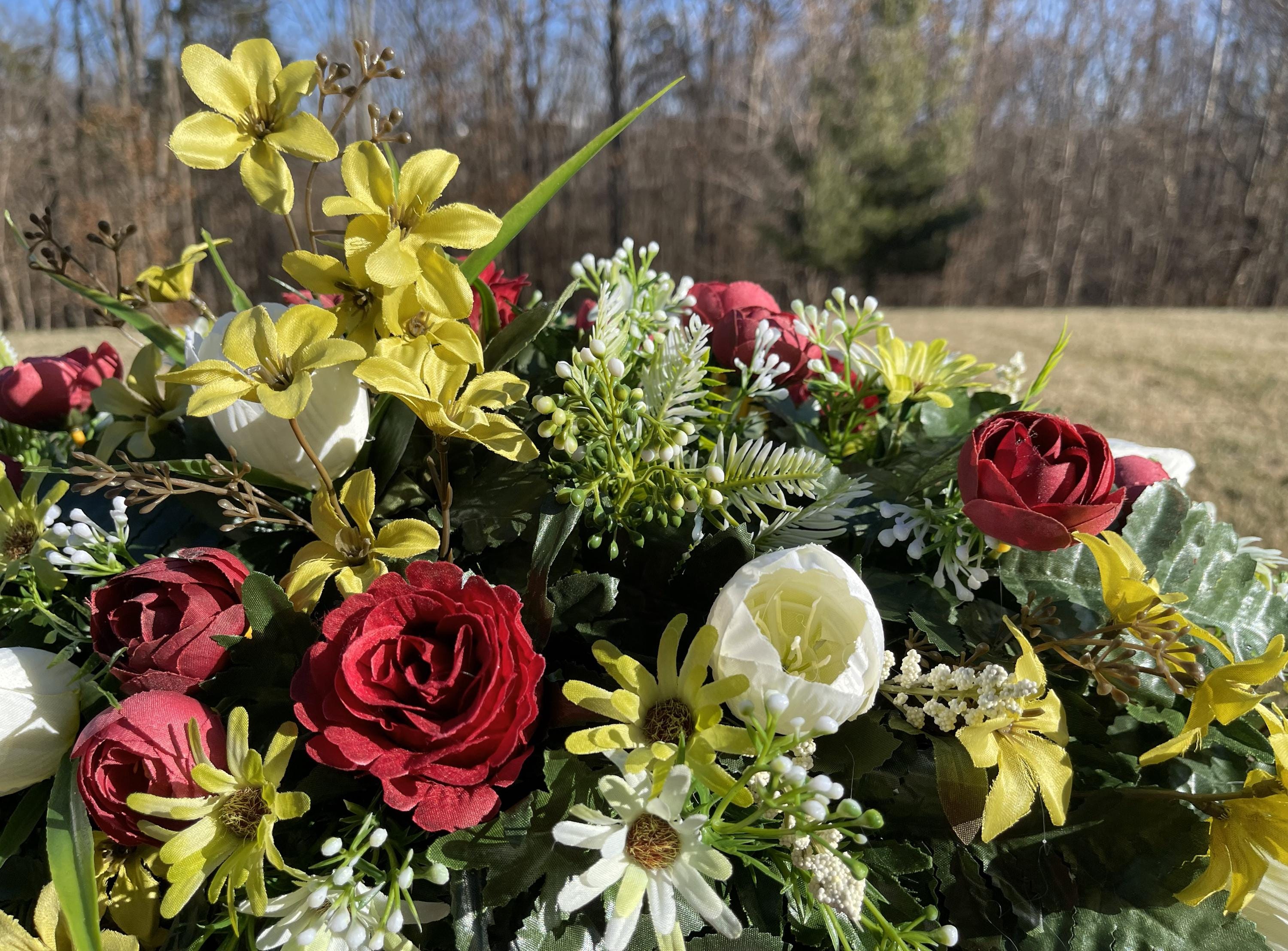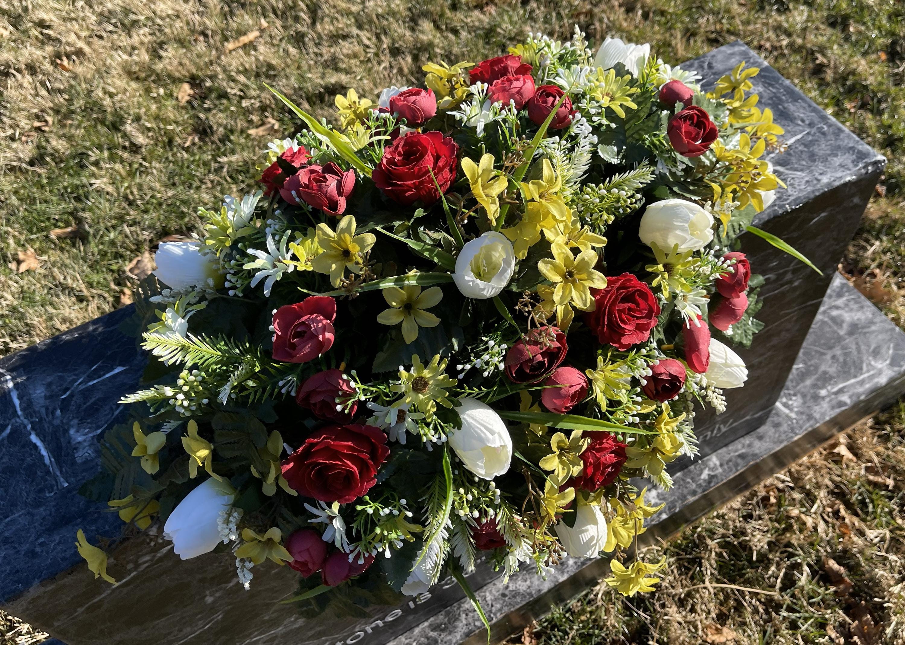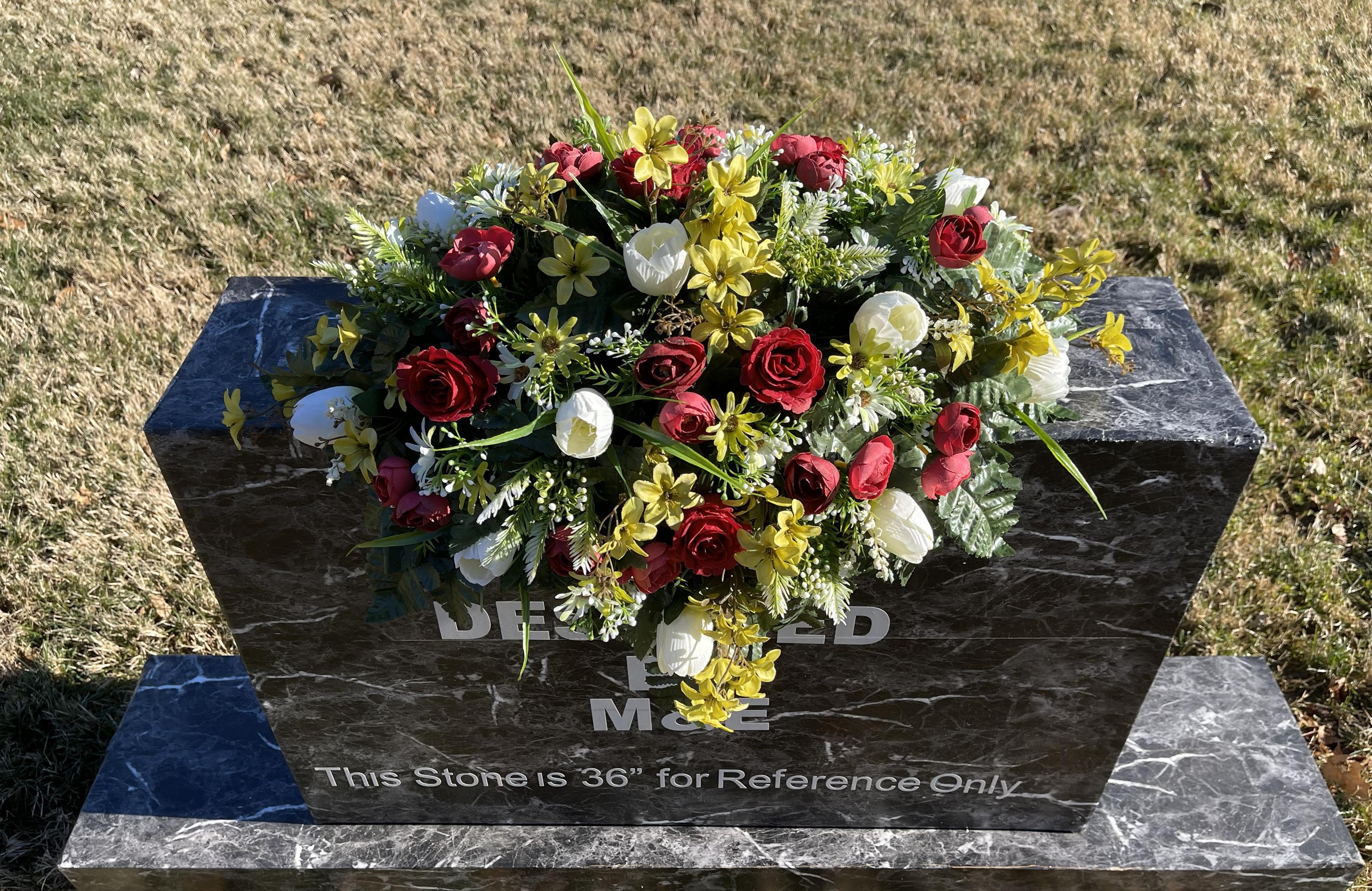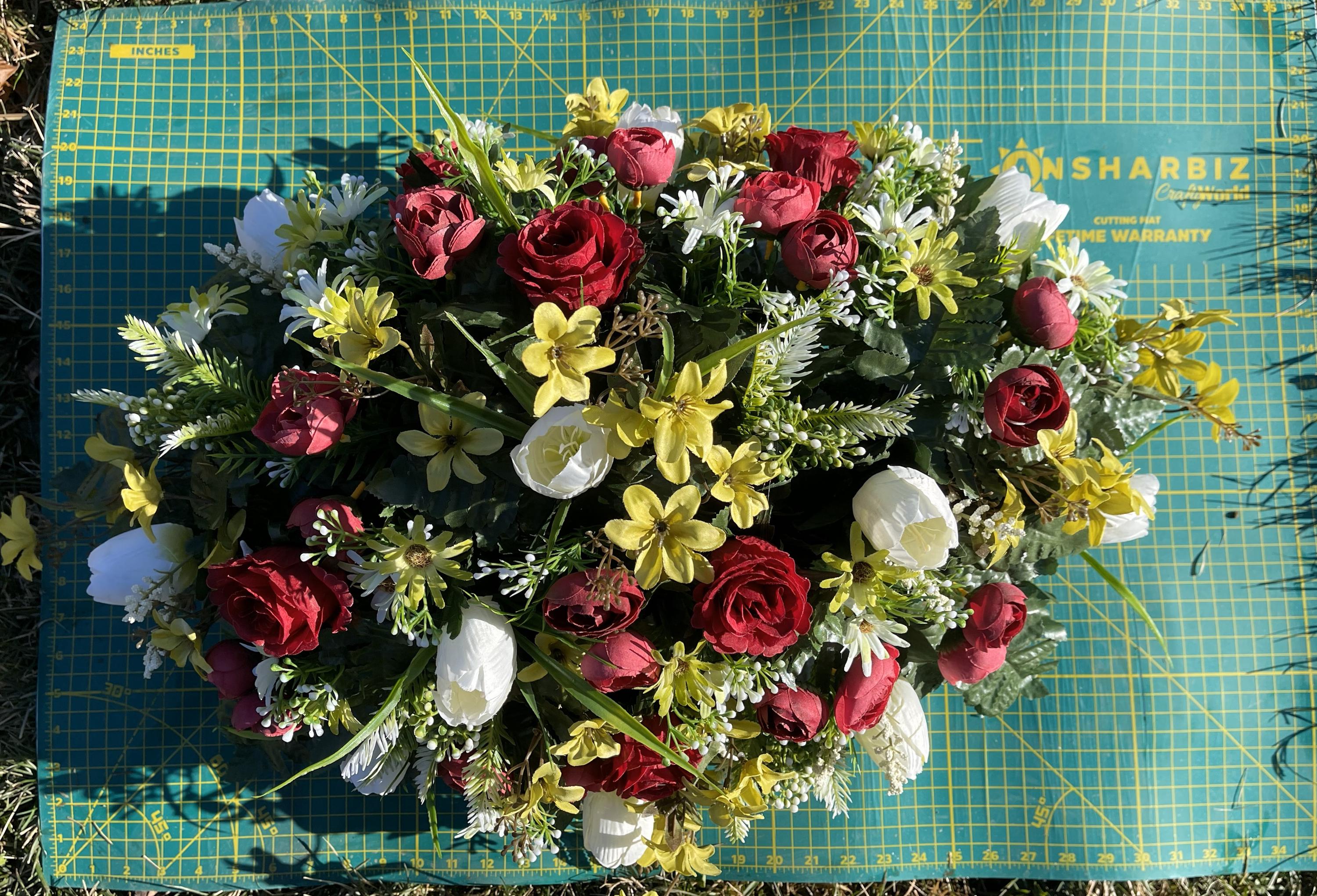 One of a Kind Cemetery Saddle, Red, Yellow & White Flowers, Headstone Flowers, Cemetery Flowers, Grave Arrangement