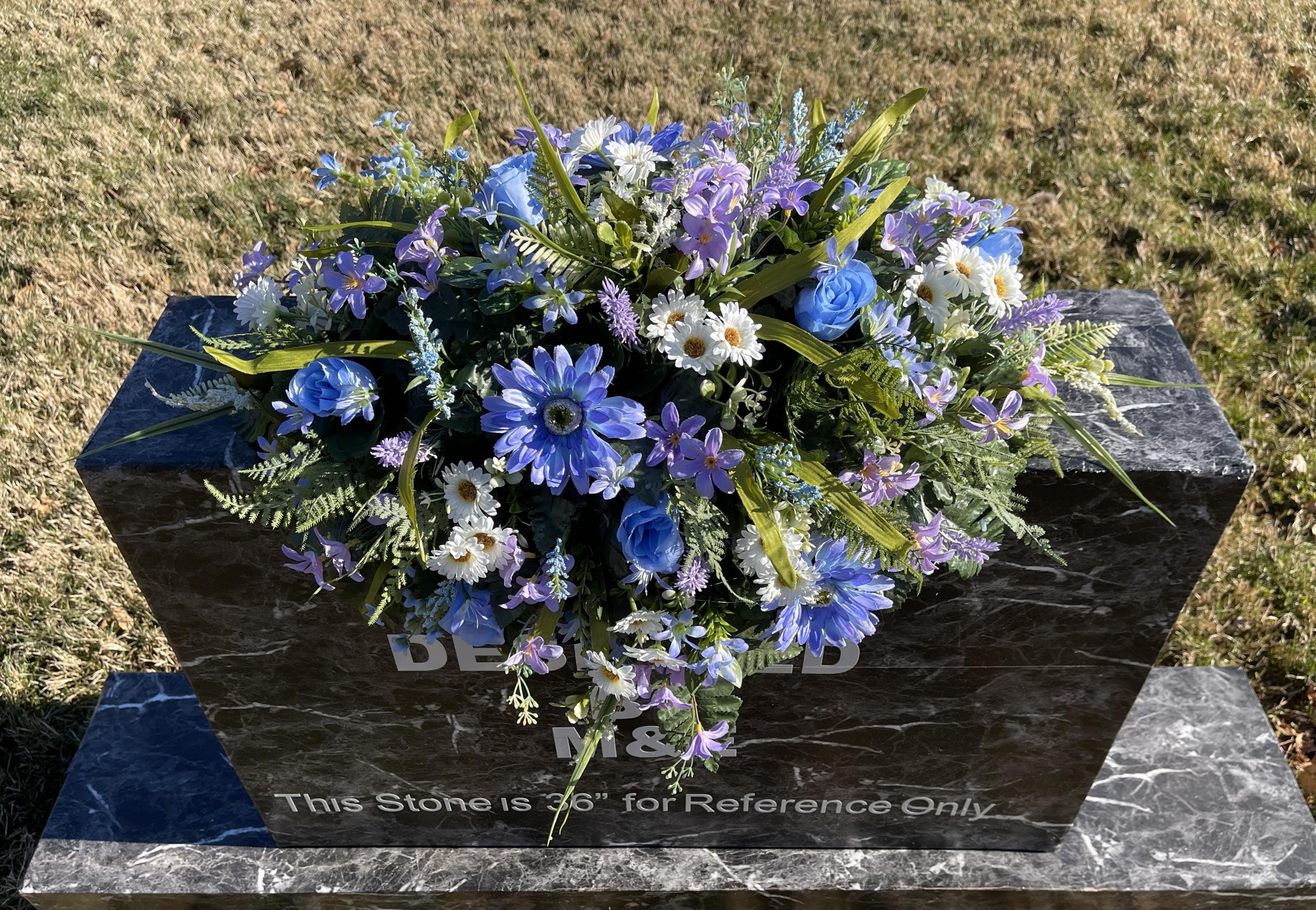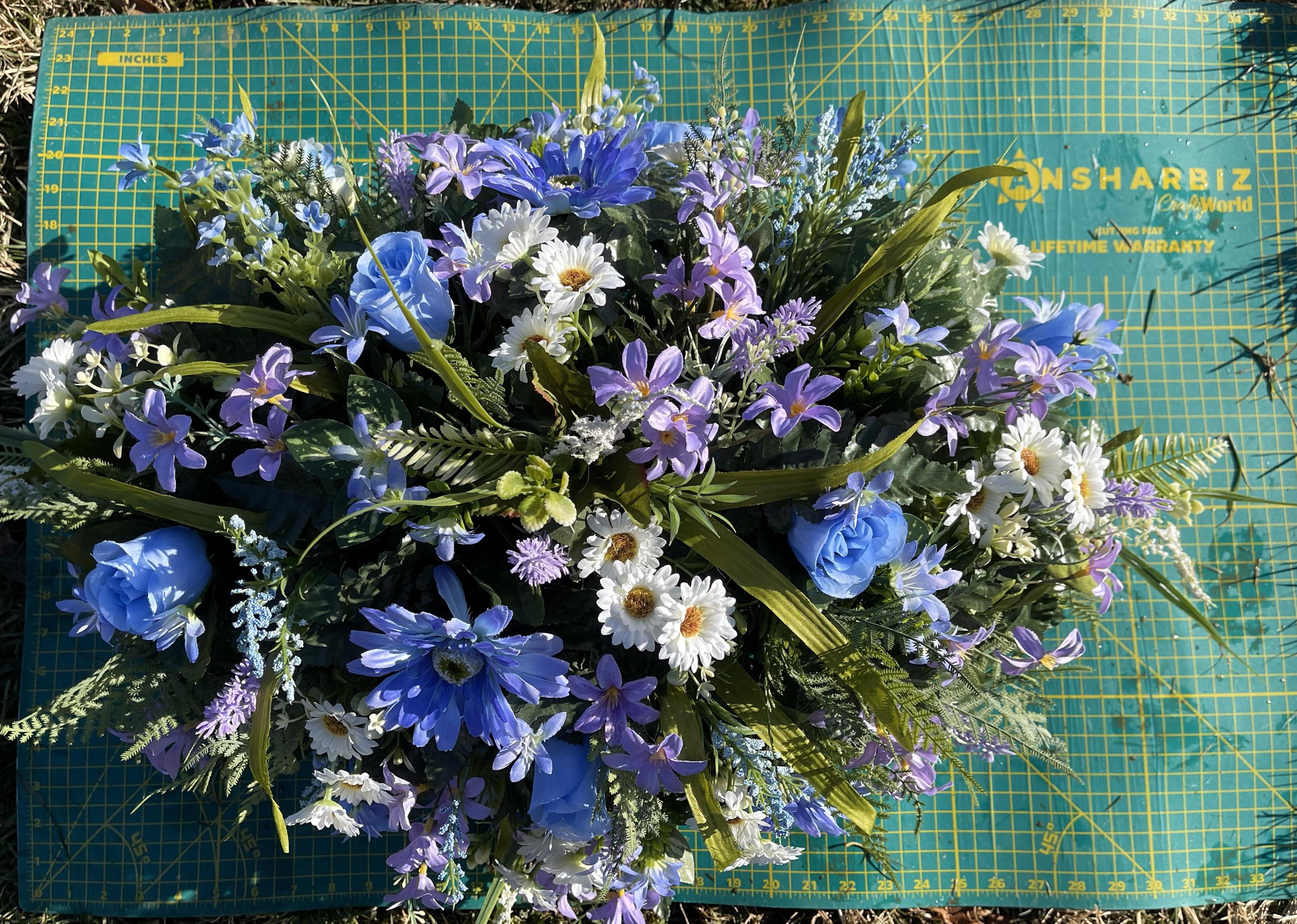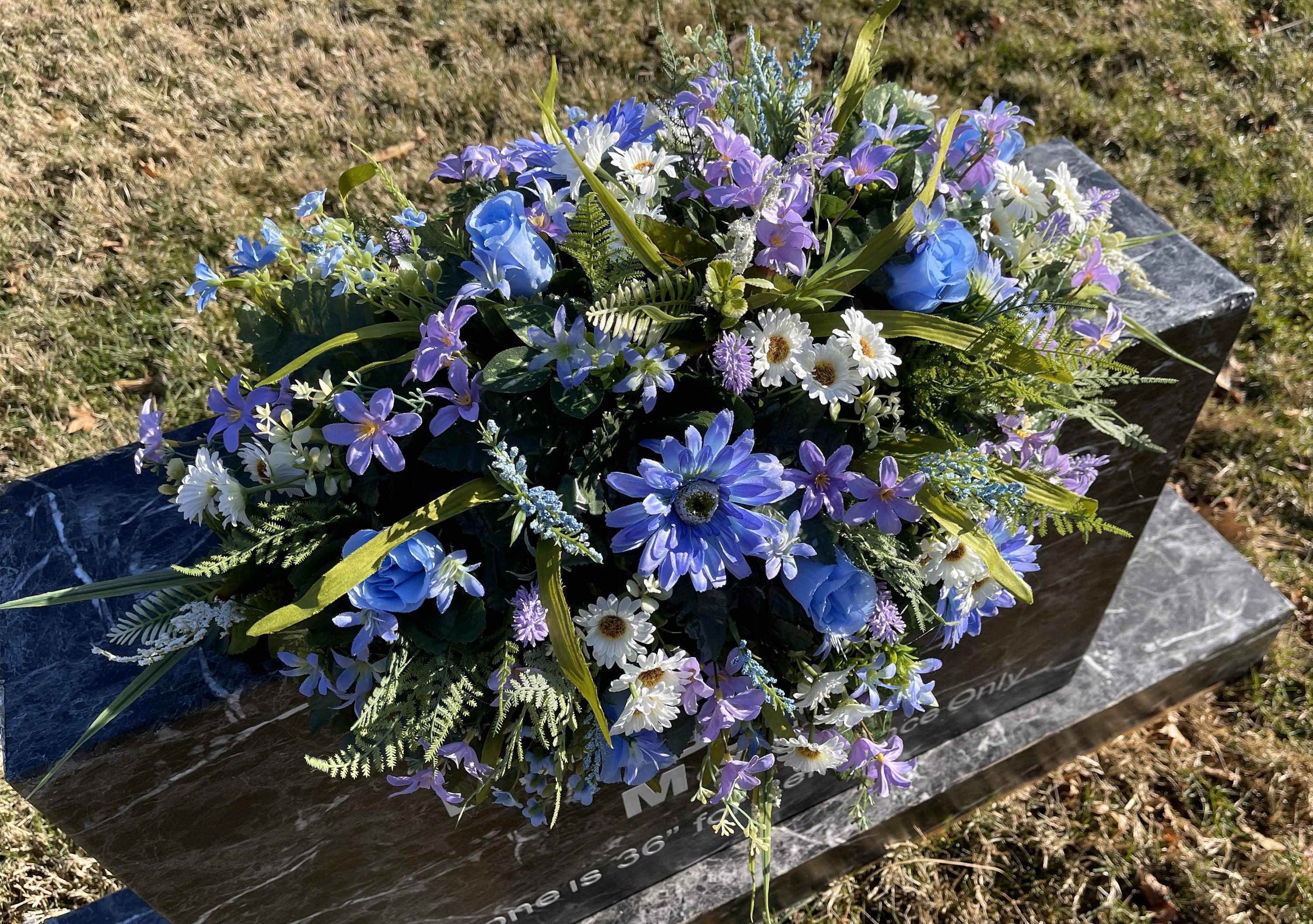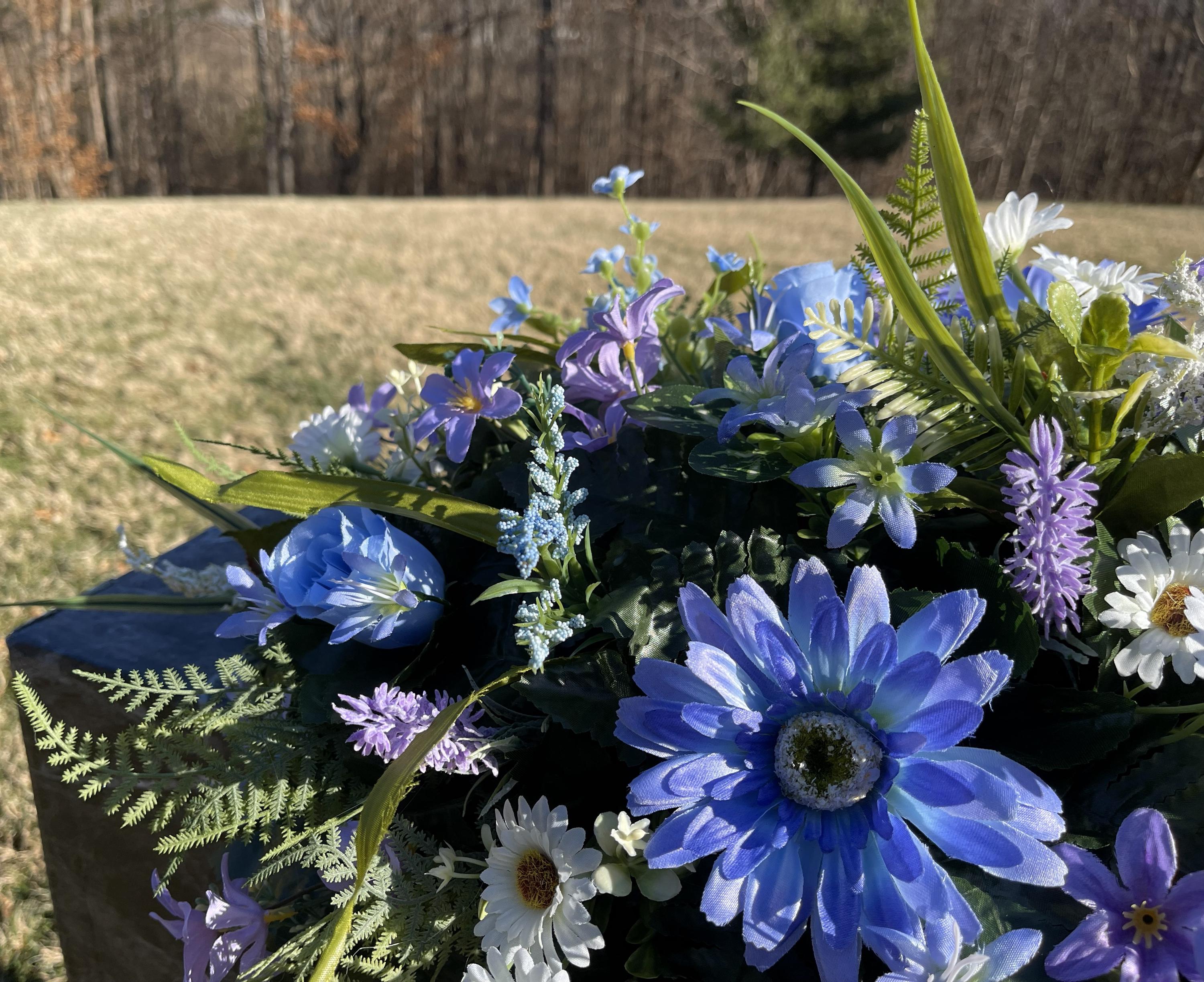 One of a Kind Cemetery Saddle, Blue & White Wild Flowers, Headstone Flowers, Cemetery Flowers, Grave Arrangement