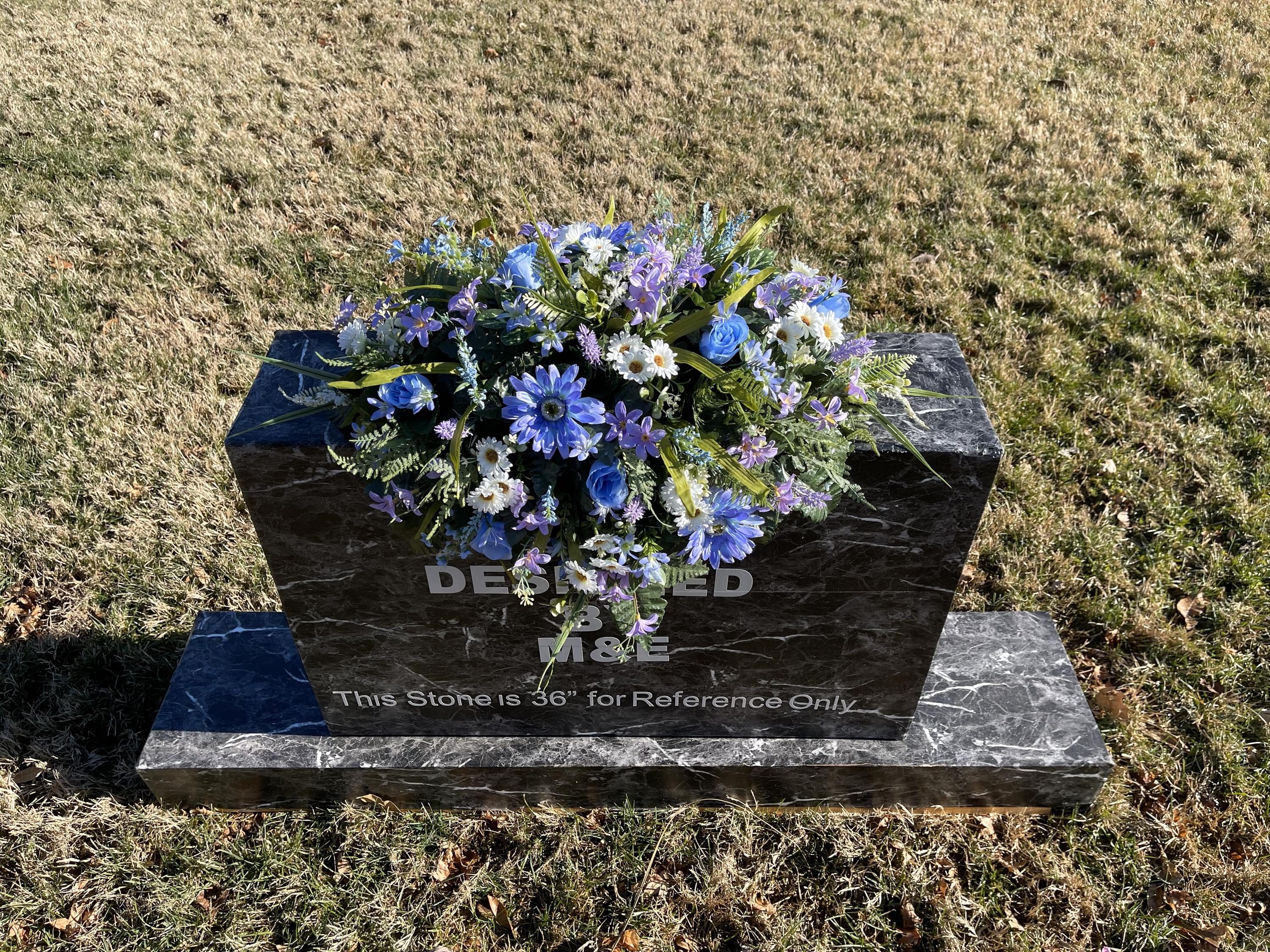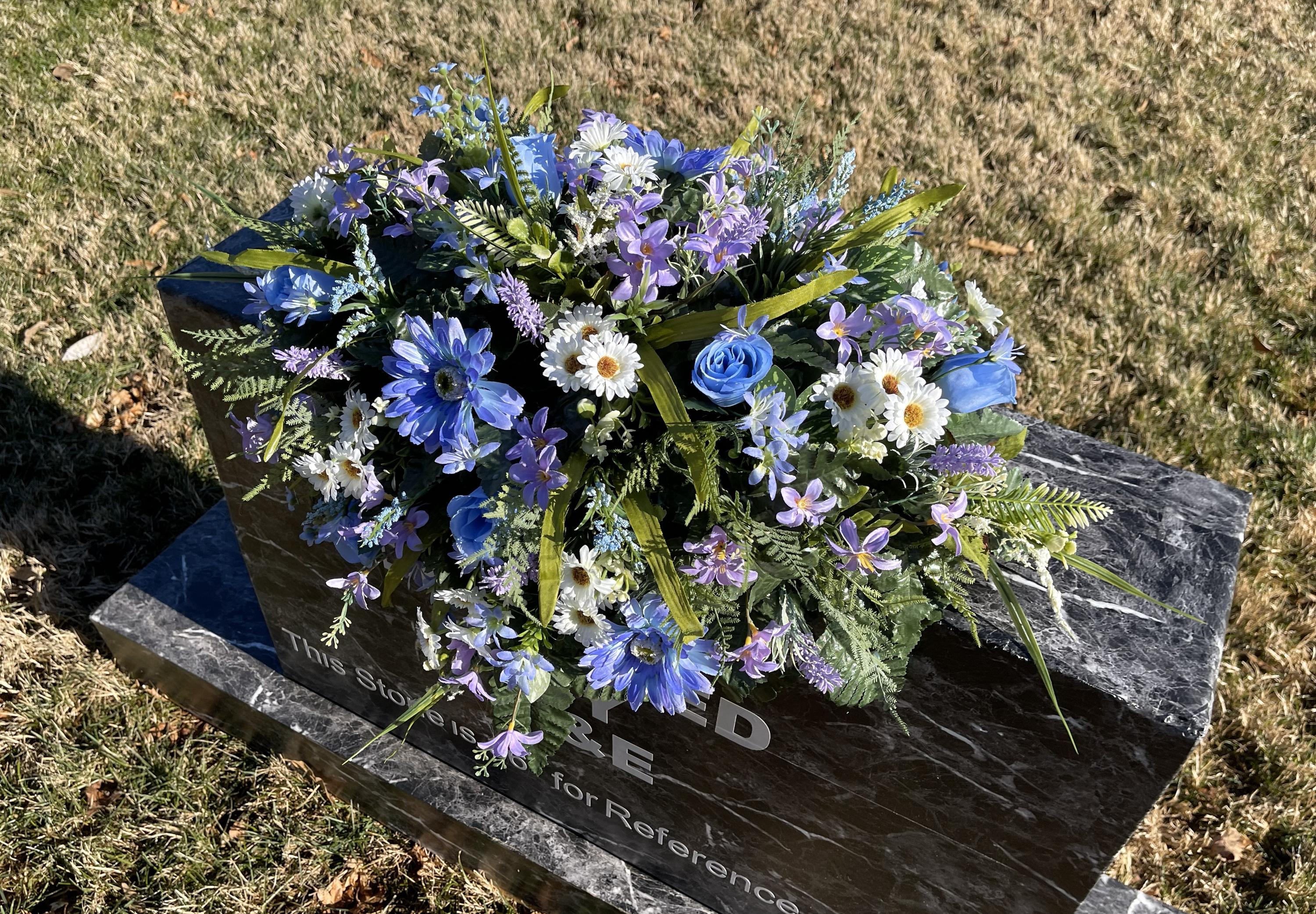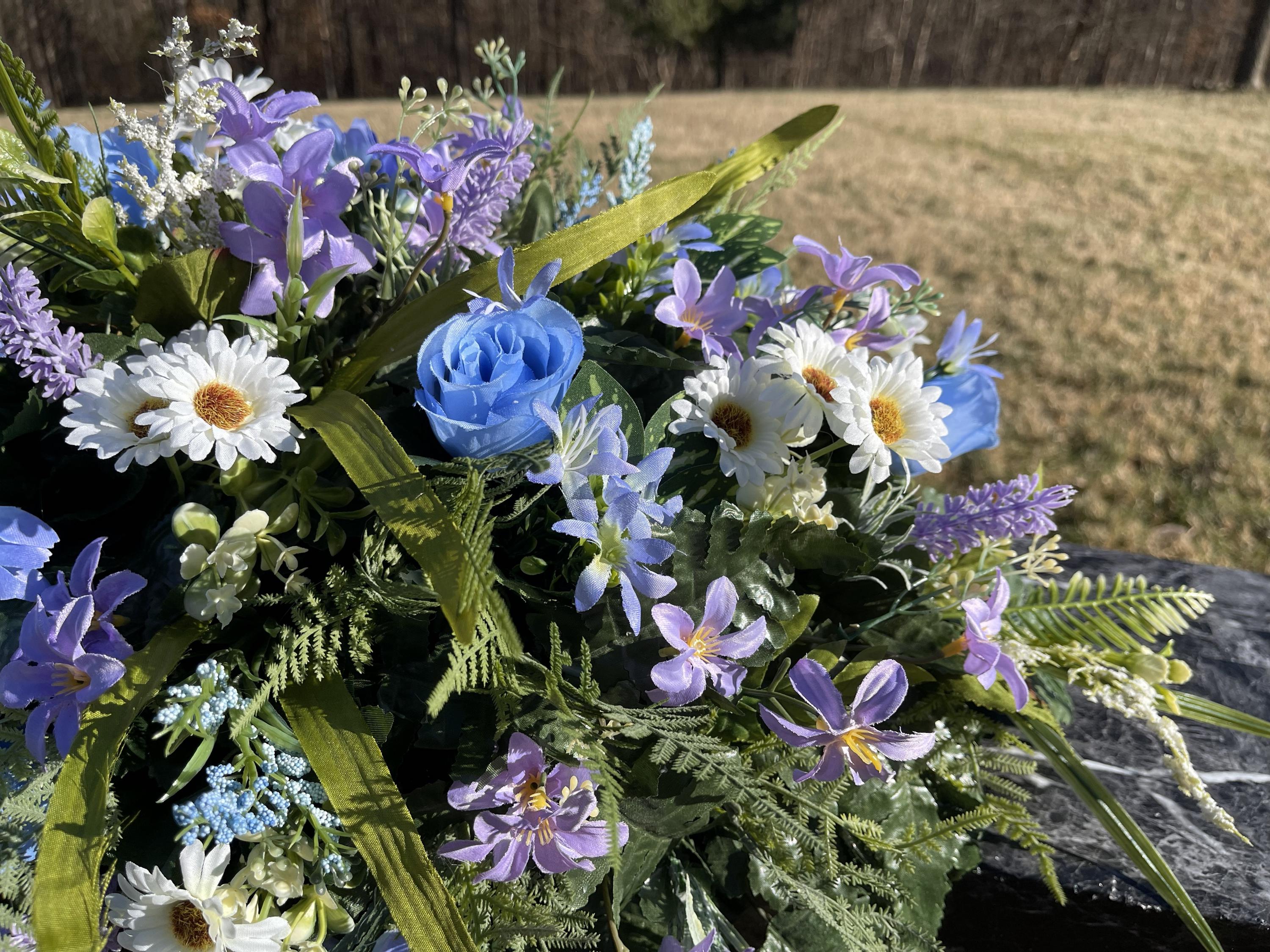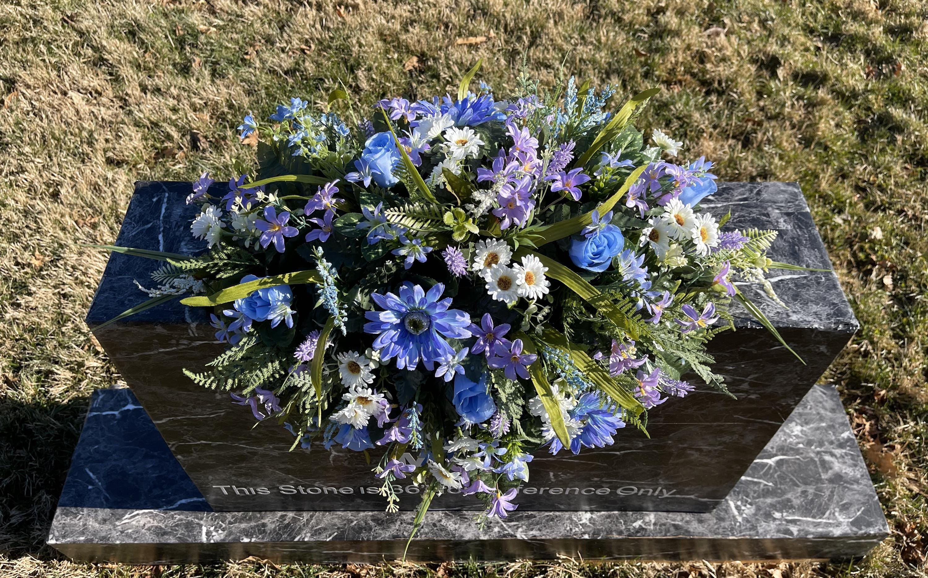 One of a Kind Cemetery Saddle, Blue & White Wild Flowers, Headstone Flowers, Cemetery Flowers, Grave Arrangement