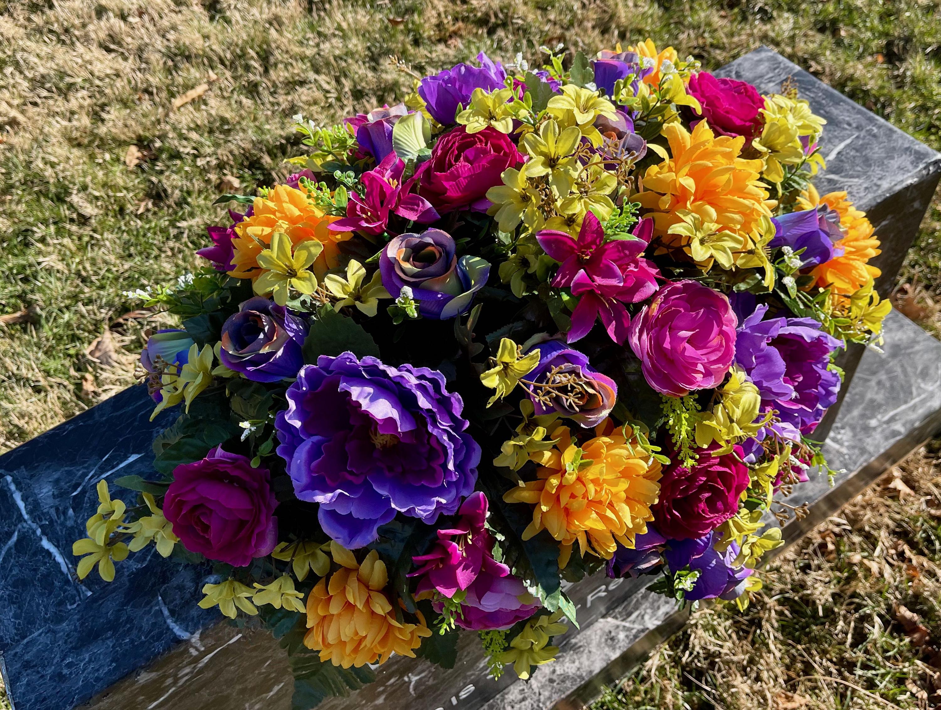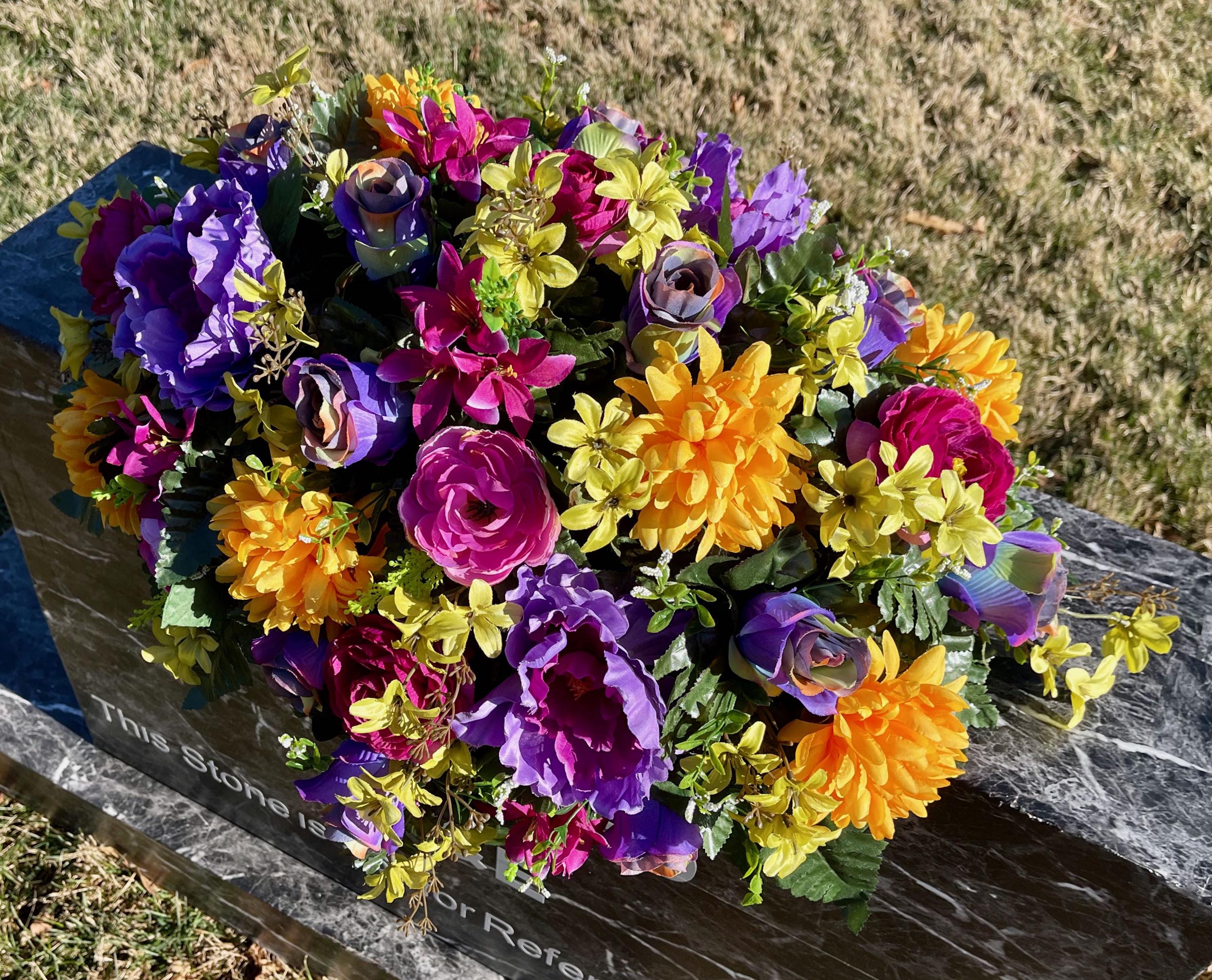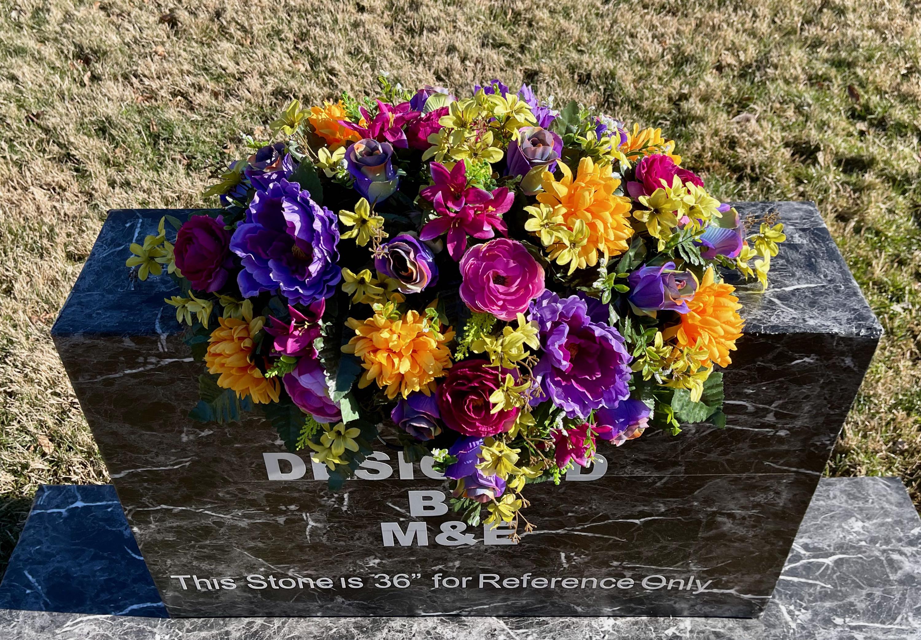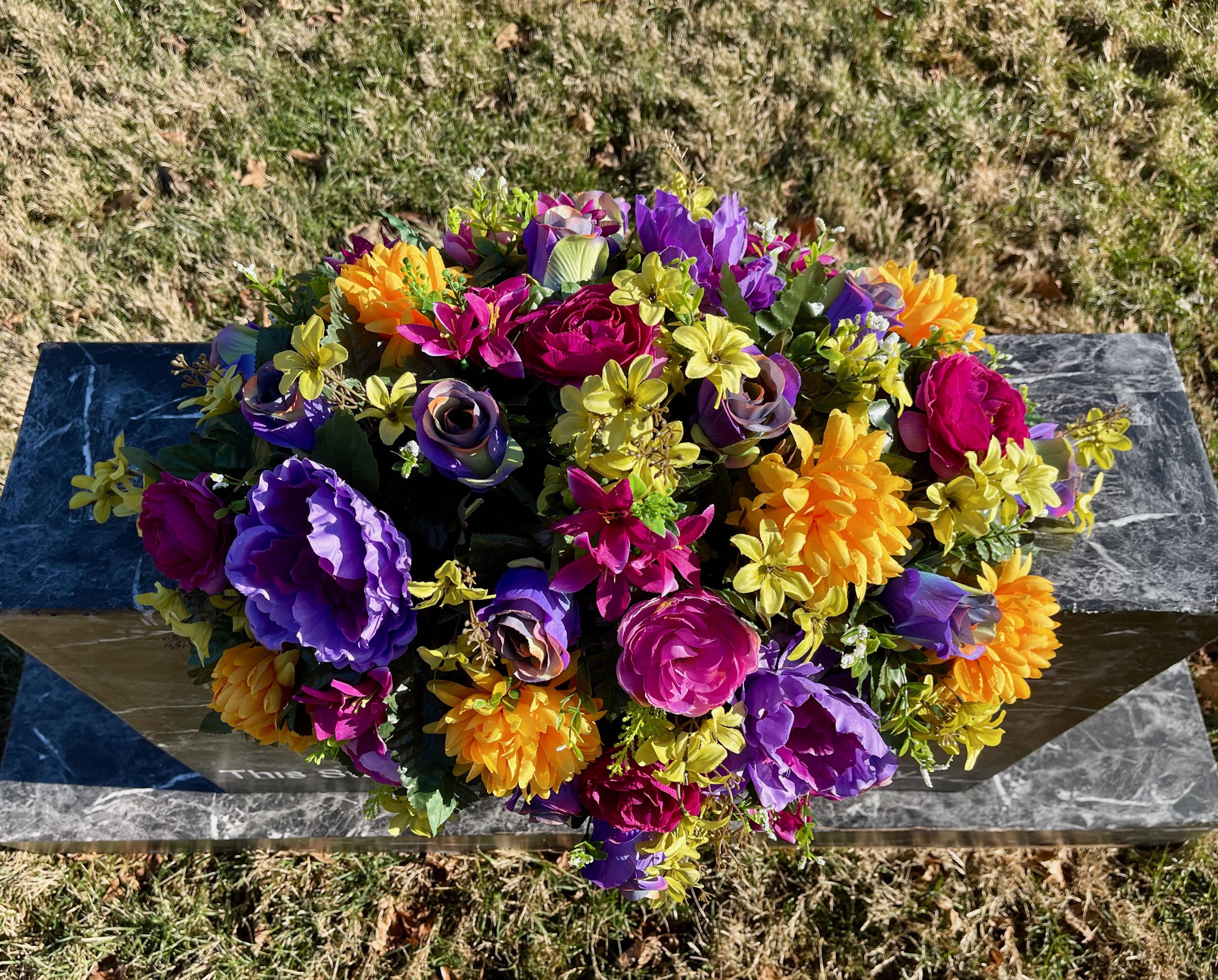 One of a Kind Cemetery Saddle, Bright Multi-Color Flowers, Headstone Flowers, Cemetery Flowers, Grave Arrangement