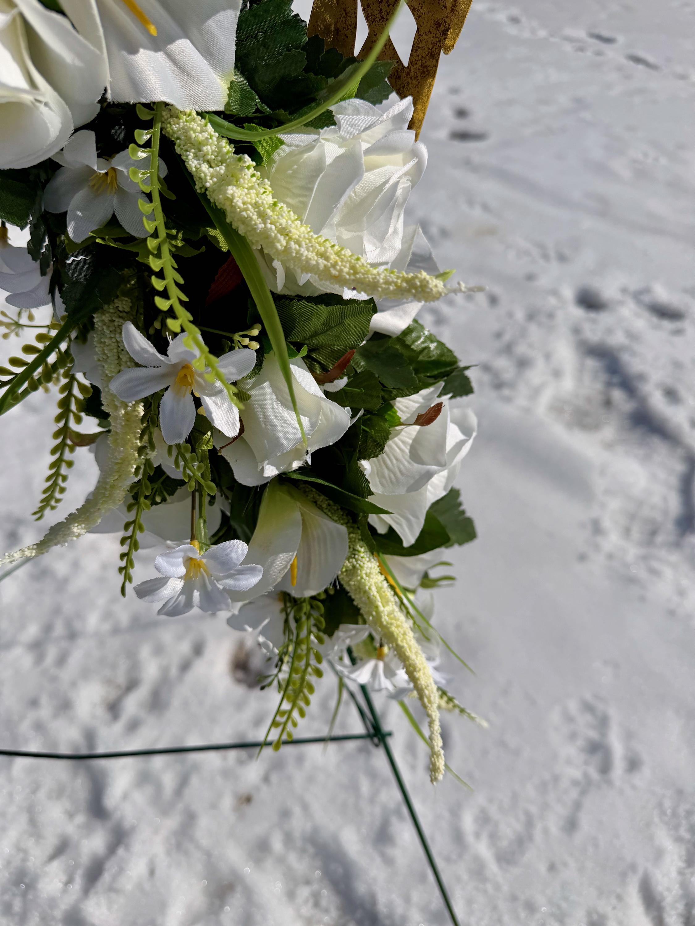 - Vase and Metal Cross arrangements use a “foam” insert; but for photos, they're displayed in a “plastic” holder just for stability—which is not included but can be purchased separately.