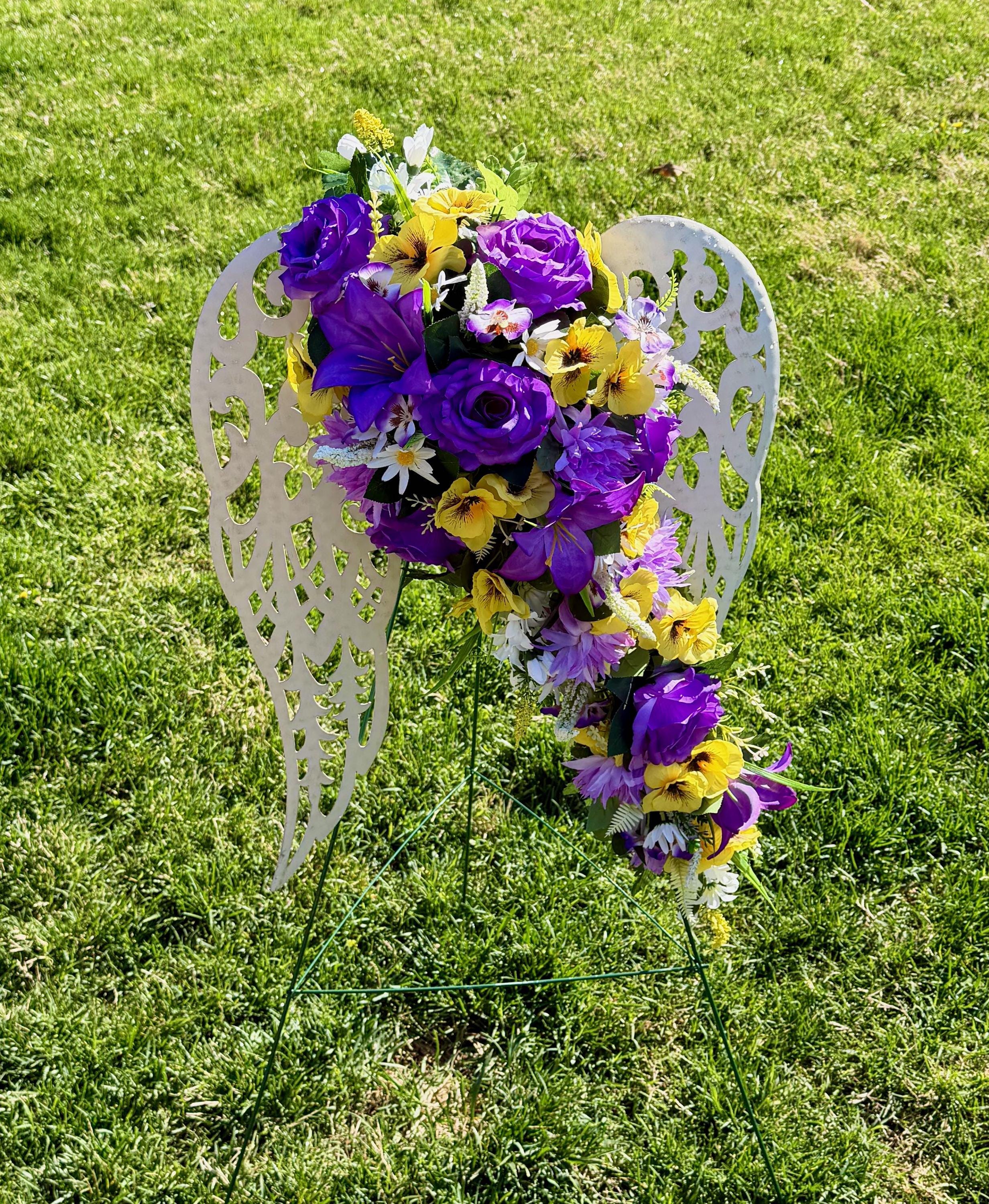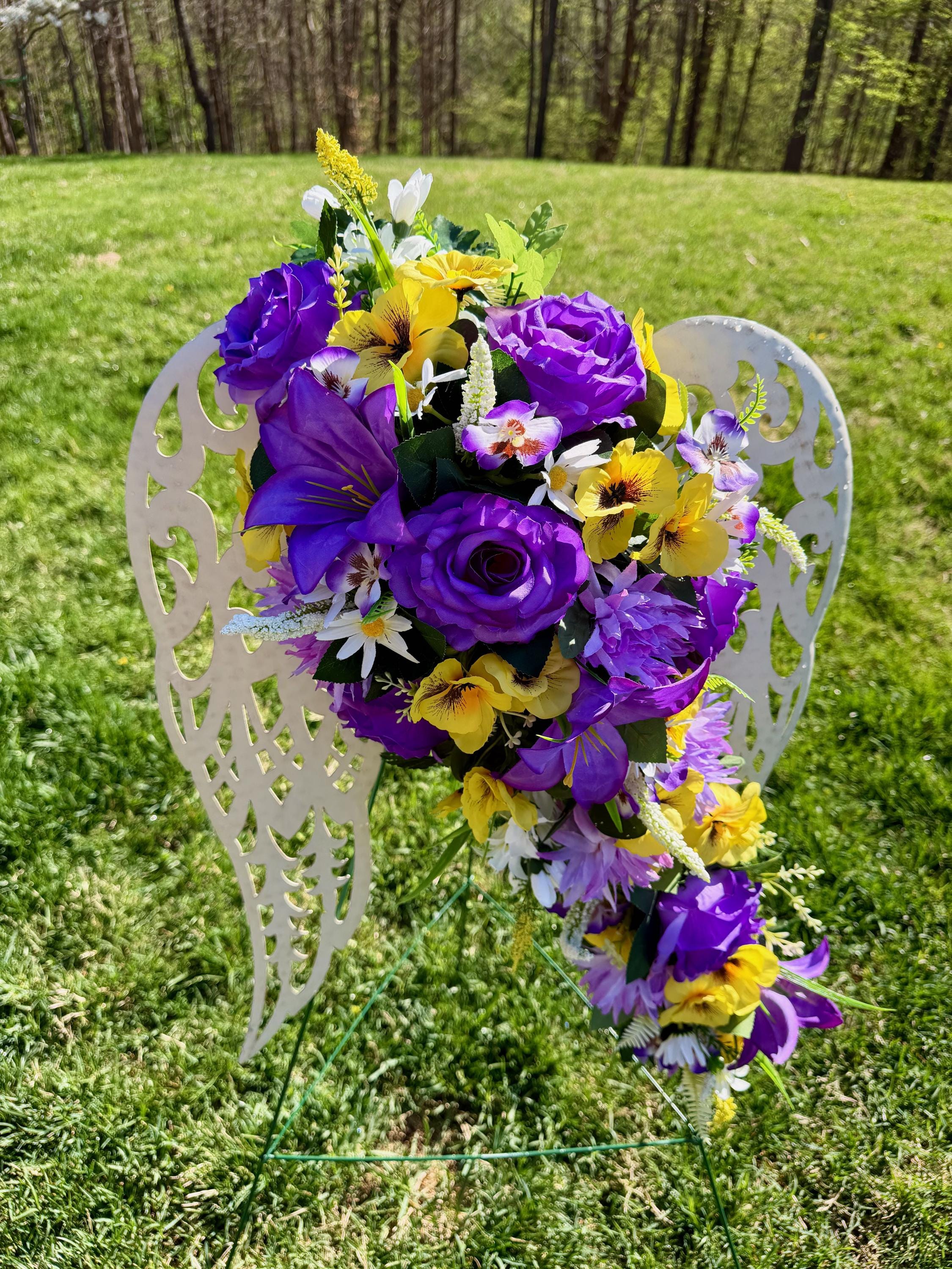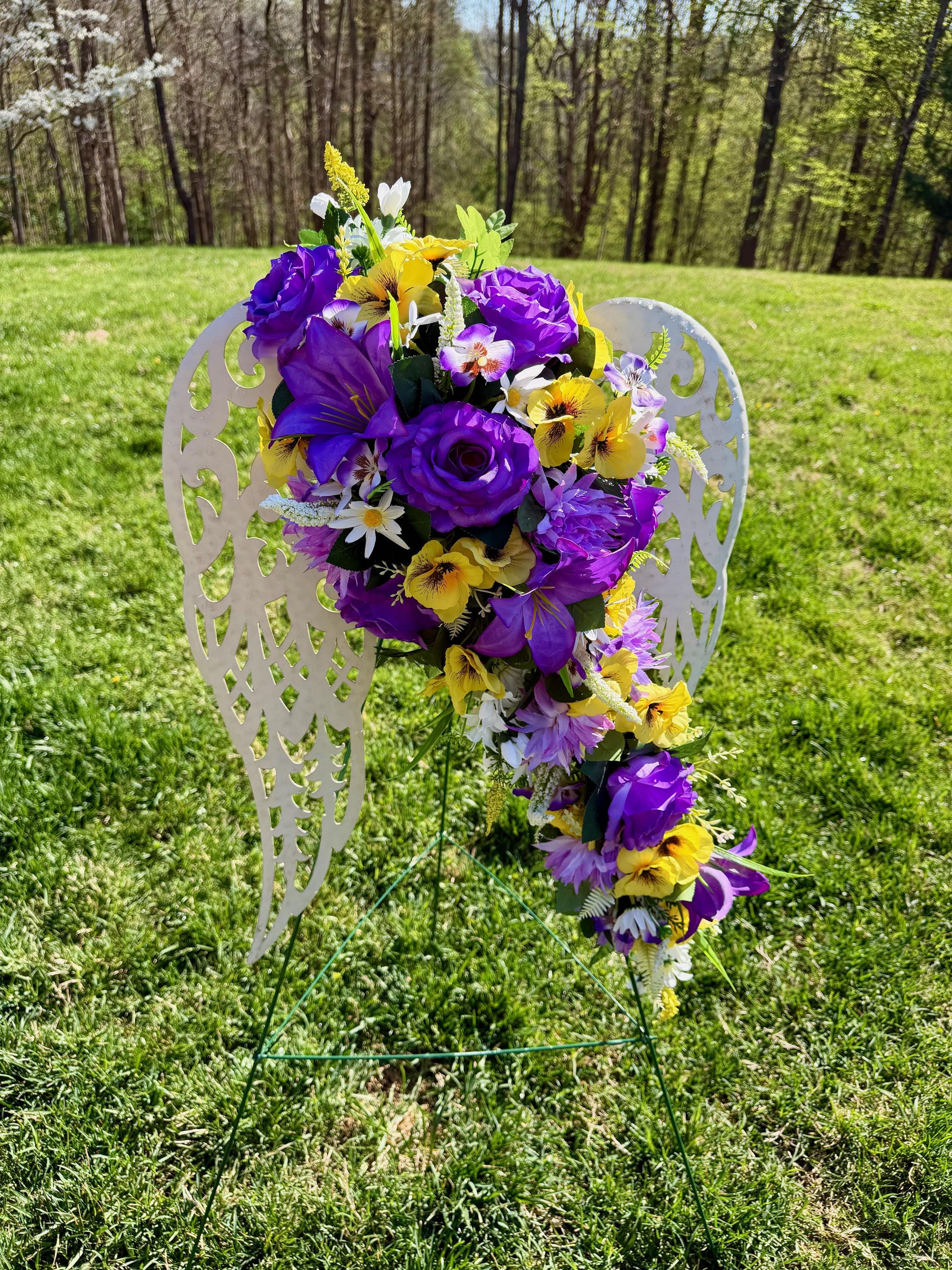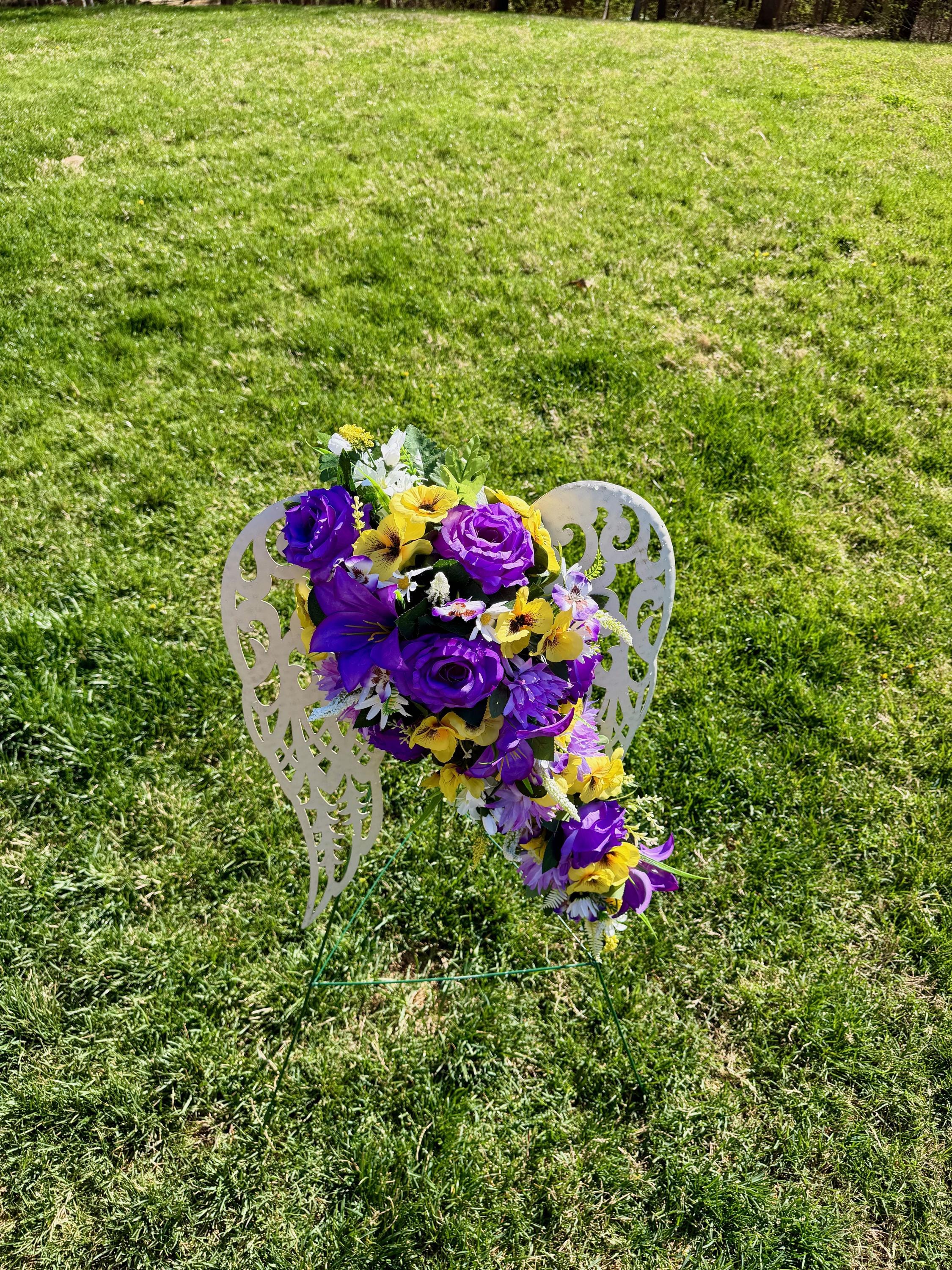 White Angel Wings with Purple and Yellow Flowers Cemetery Arrangement, Memorial Flowers, Headstone Decorations,