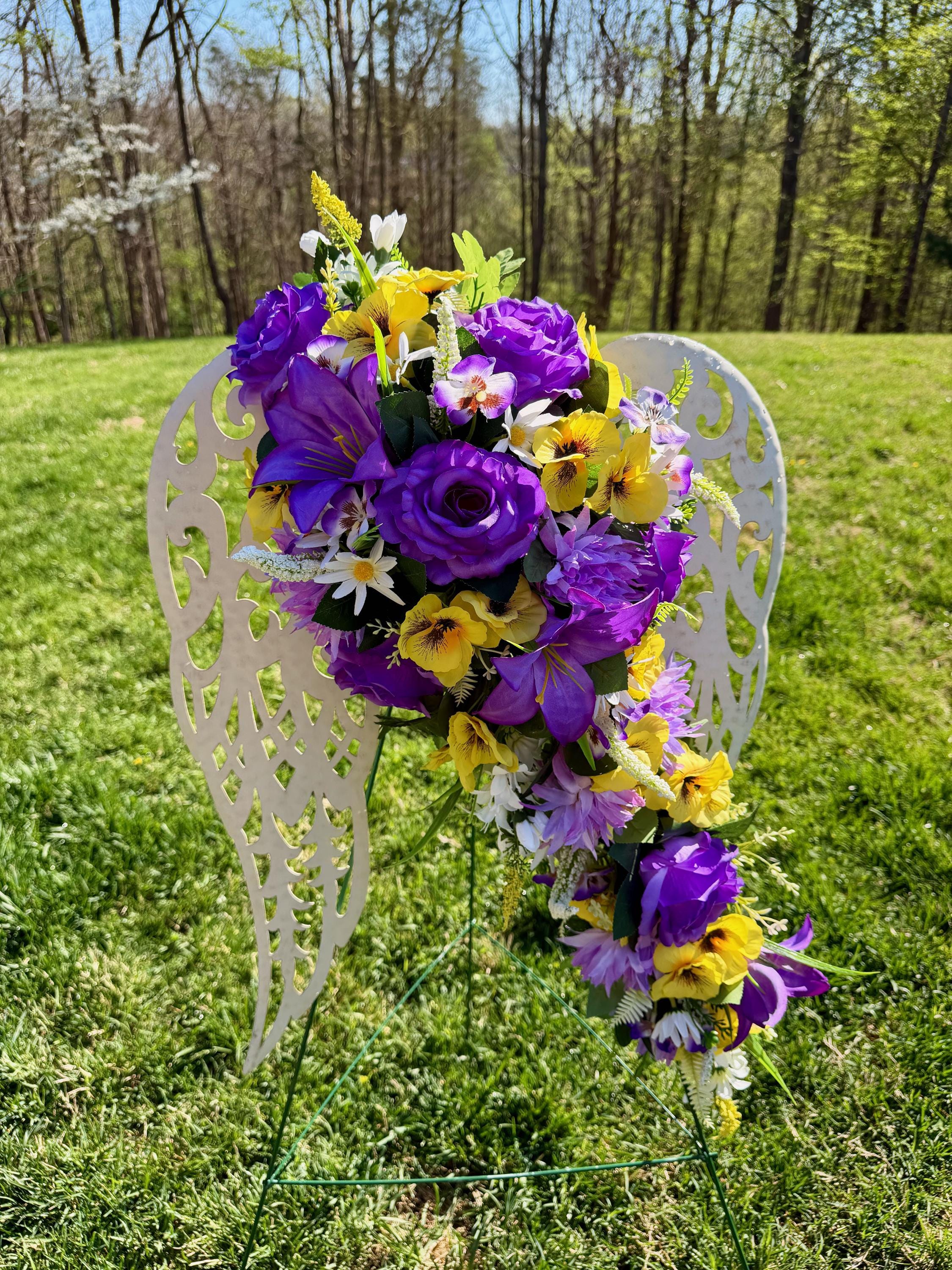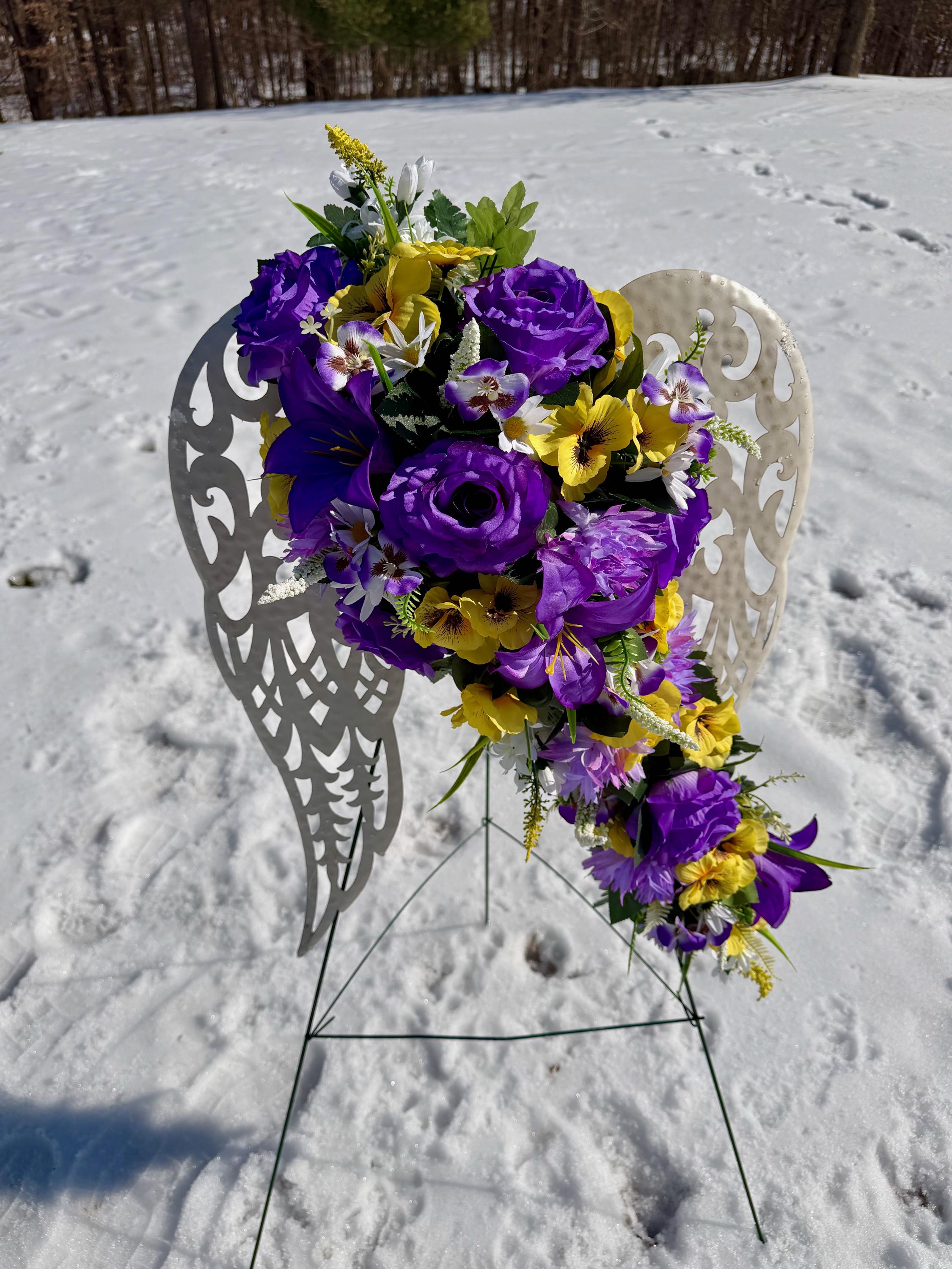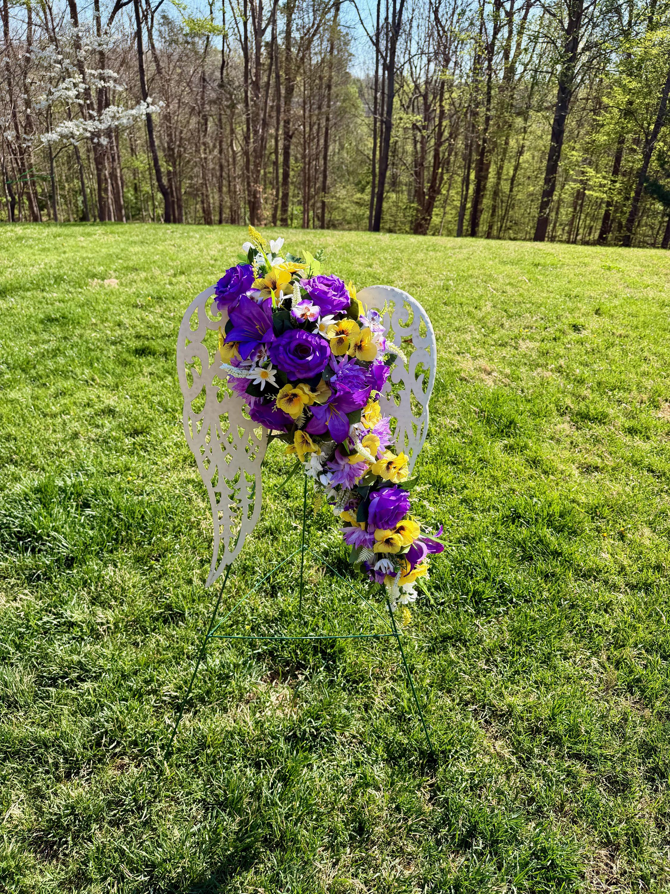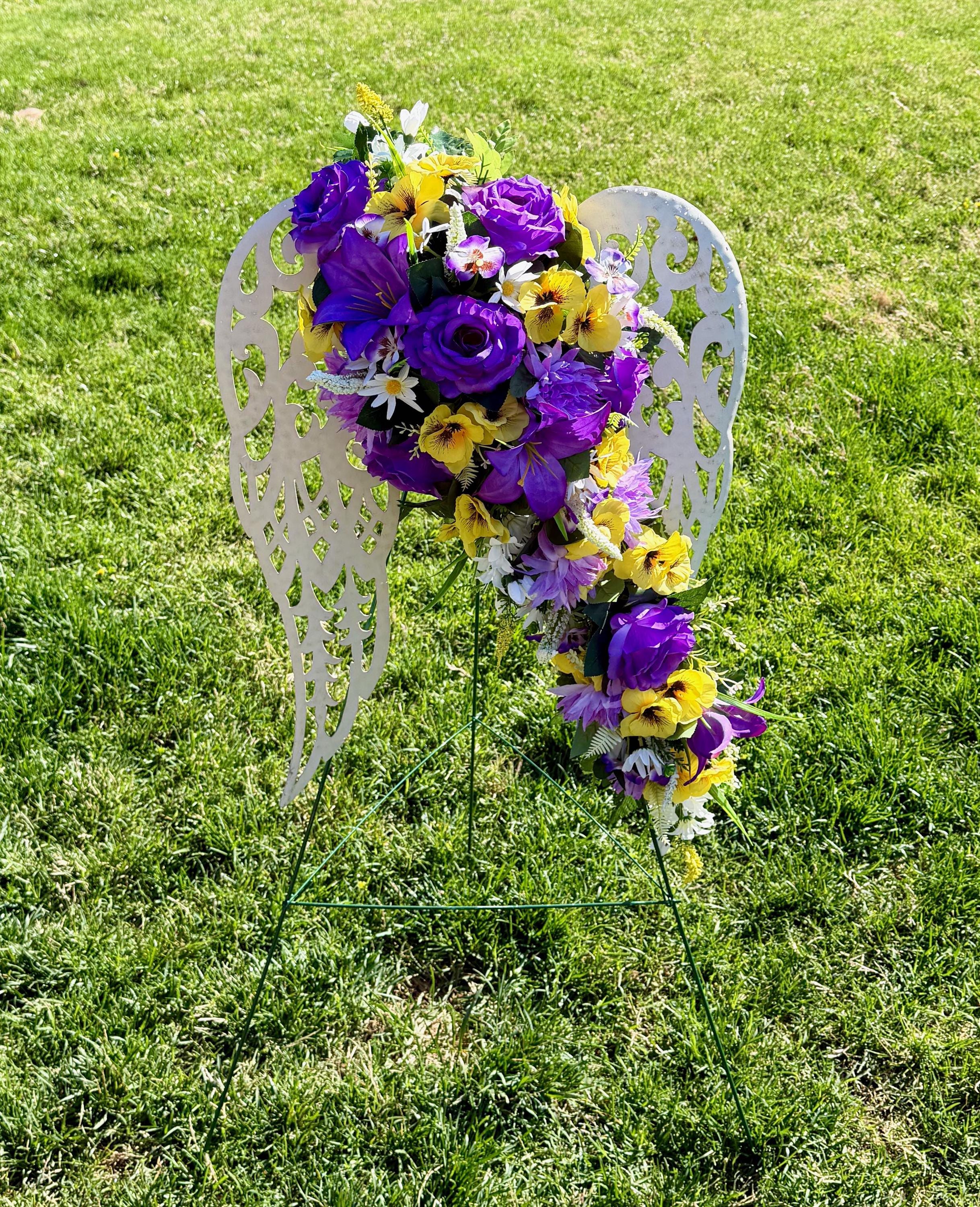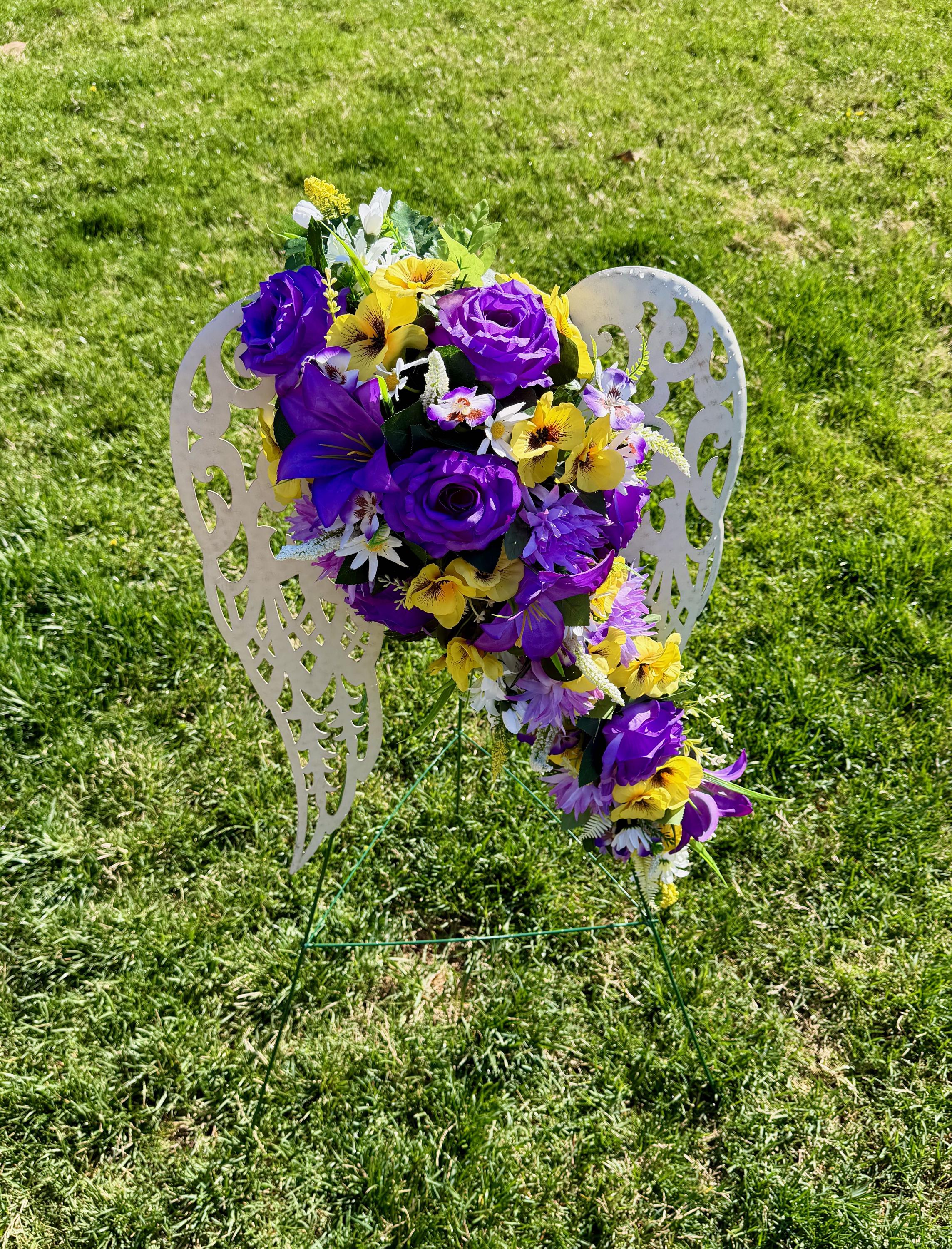 White Angel Wings with Purple and Yellow Flowers Cemetery Arrangement, Memorial Flowers, Headstone Decorations,