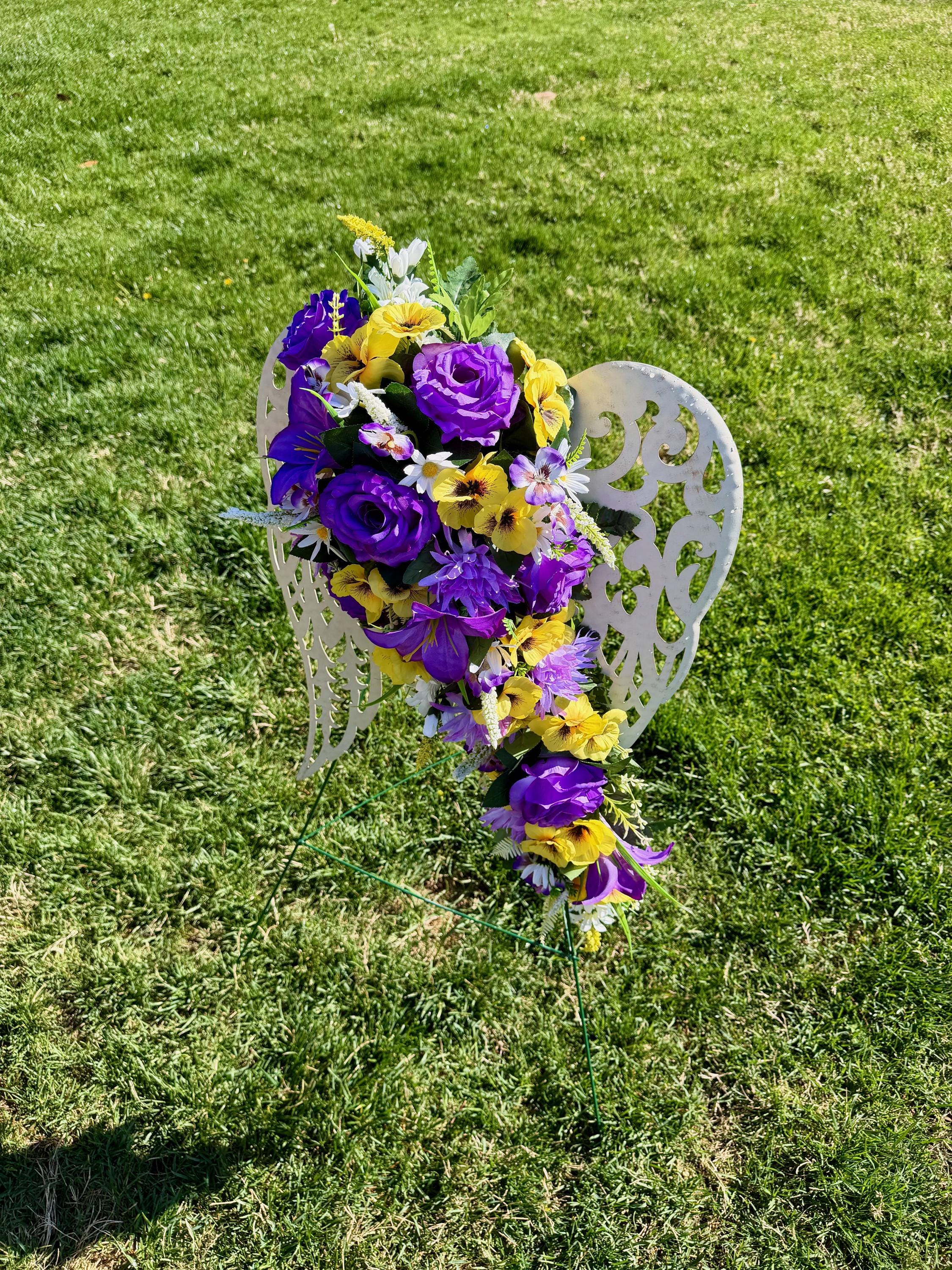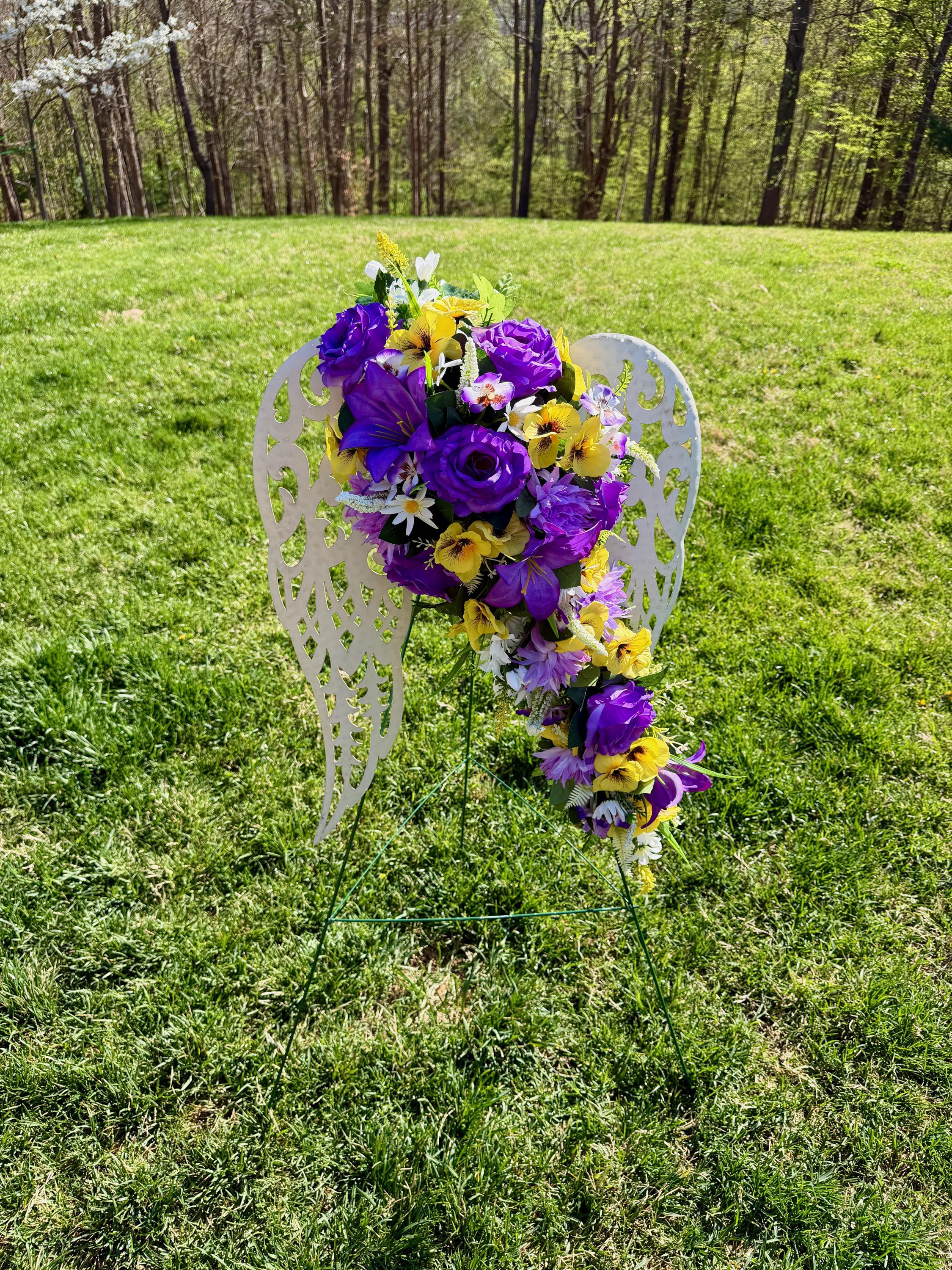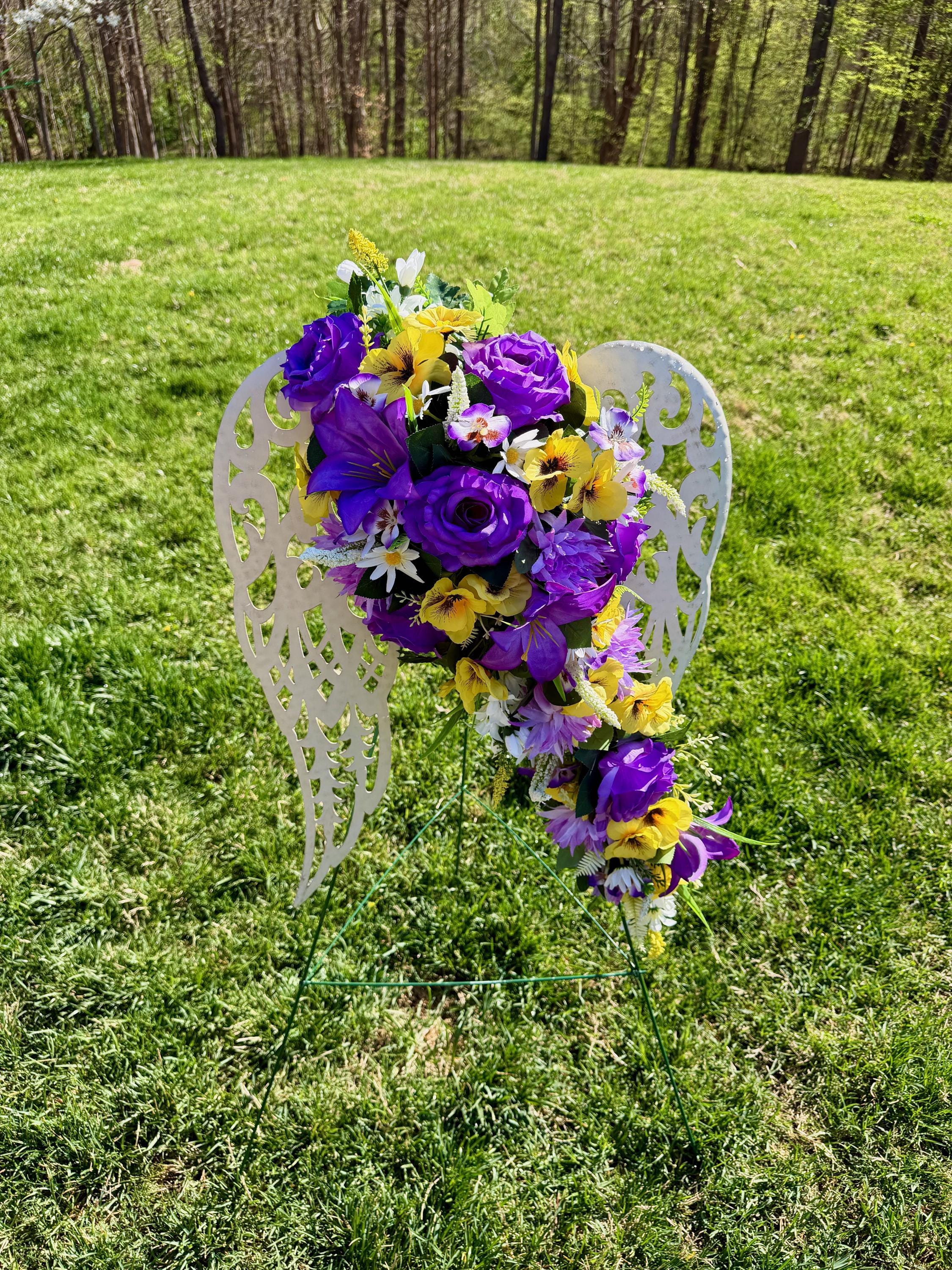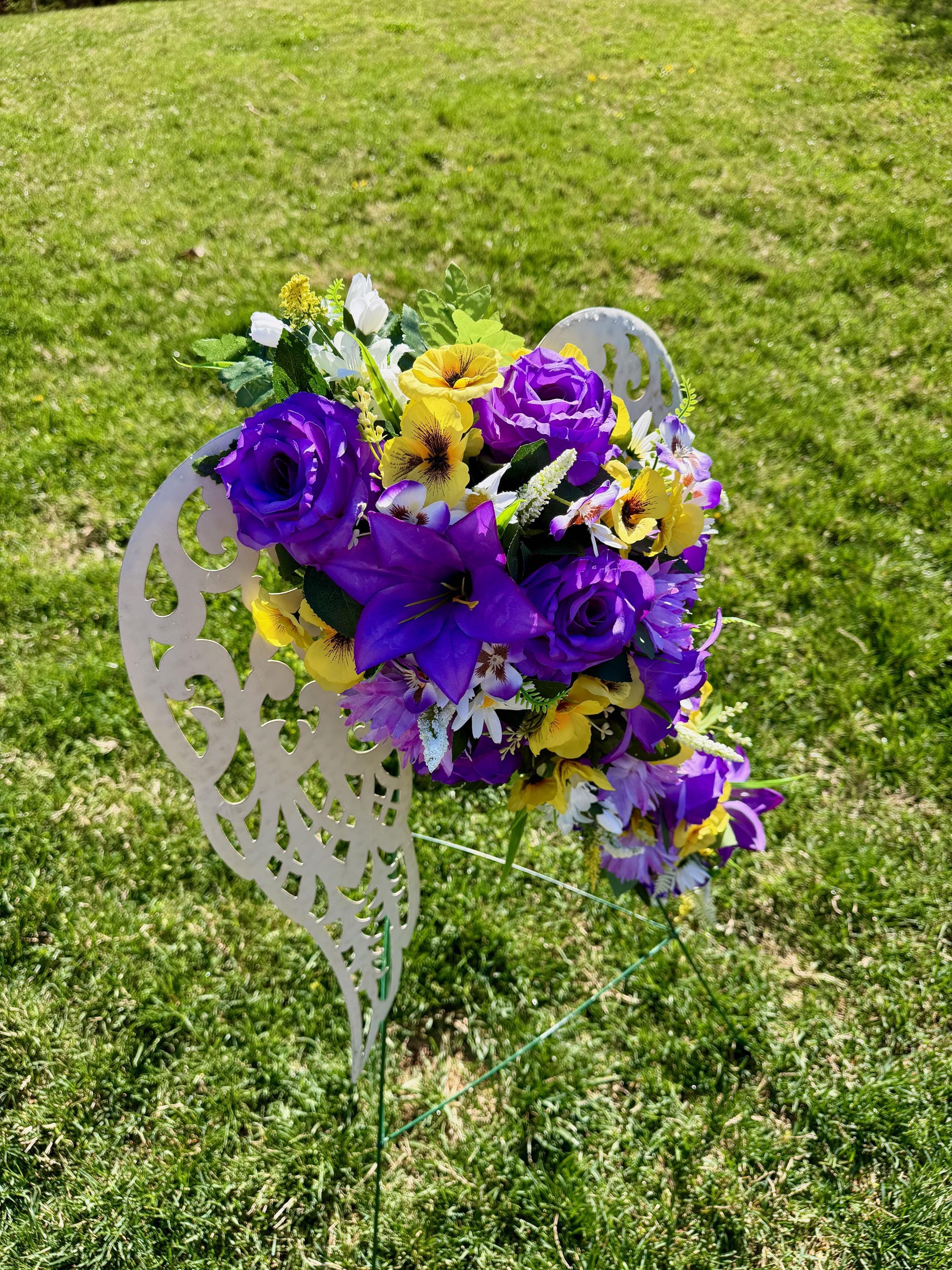 White Angel Wings with Purple and Yellow Flowers Cemetery Arrangement, Memorial Flowers, Headstone Decorations,