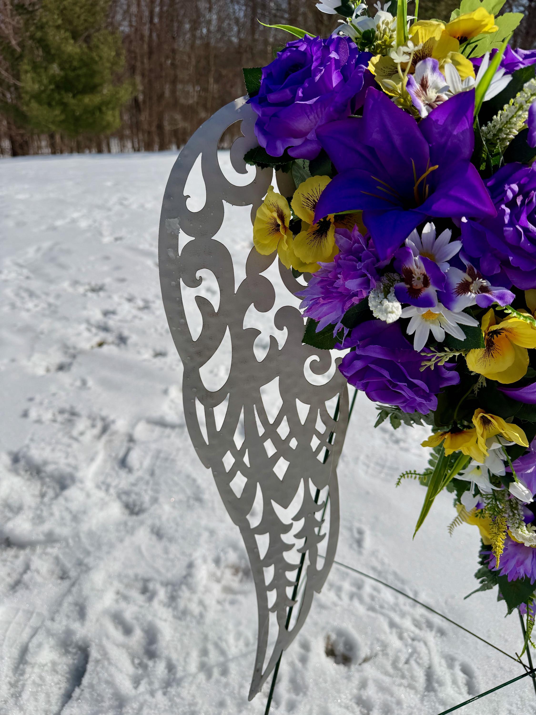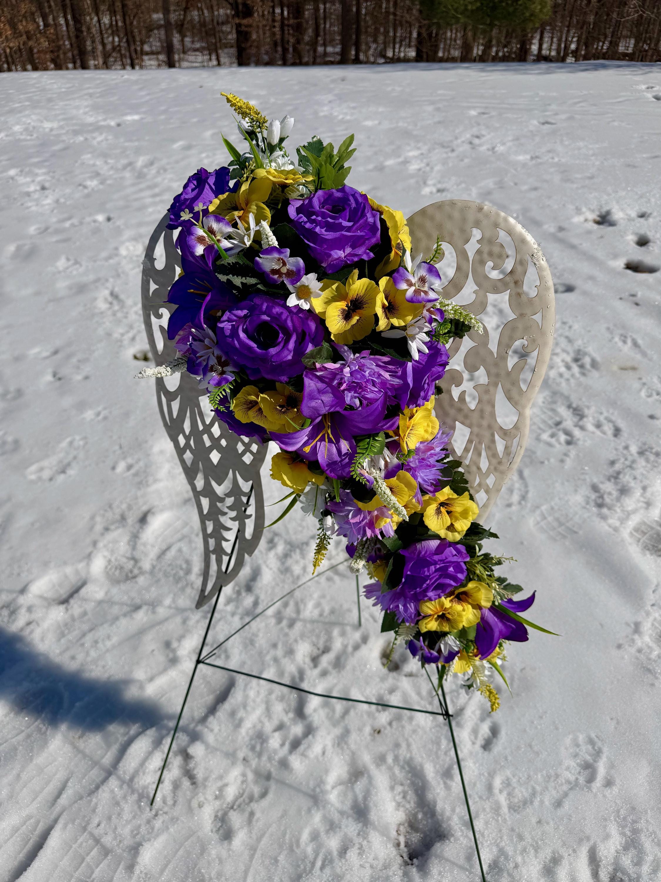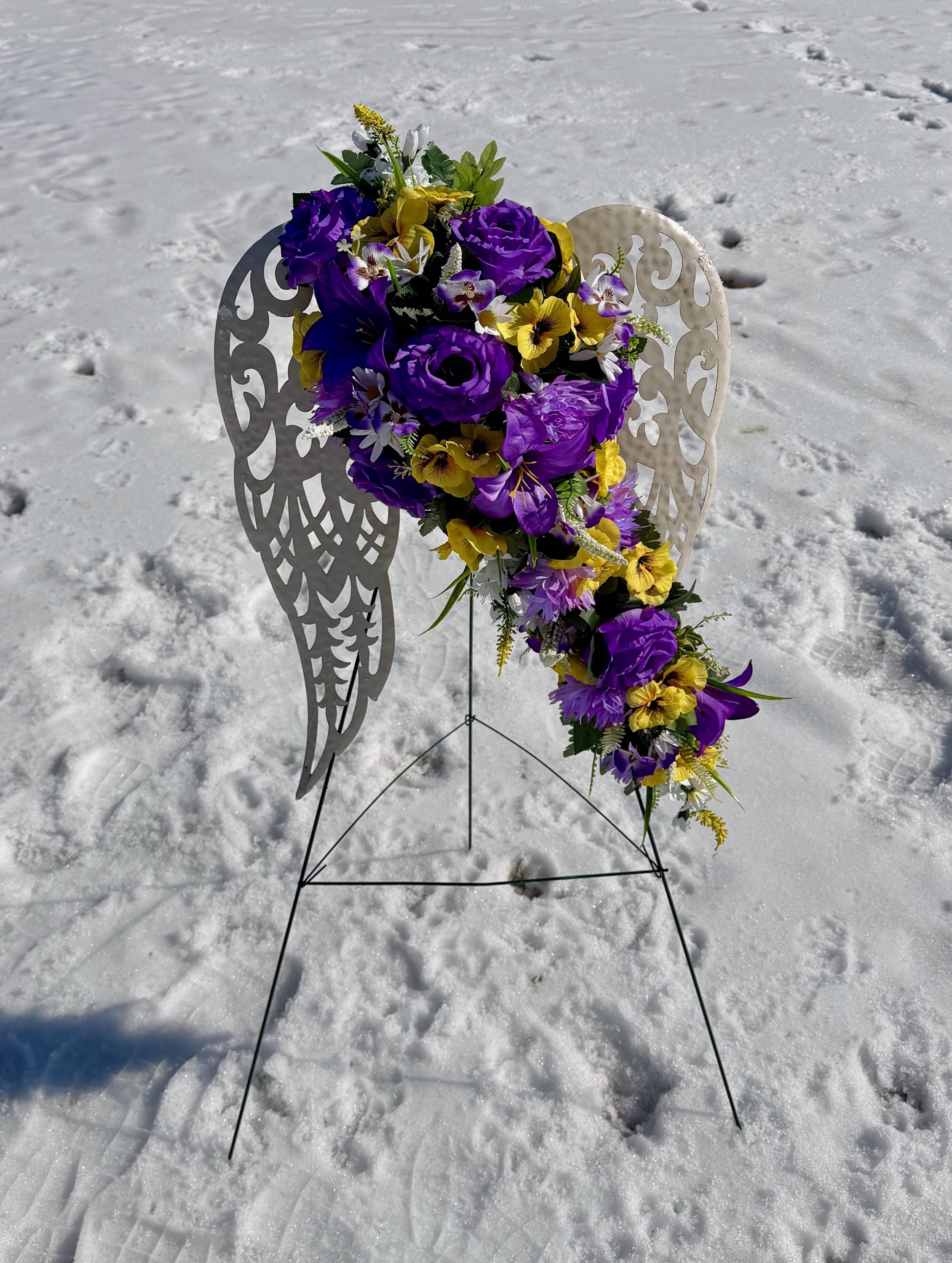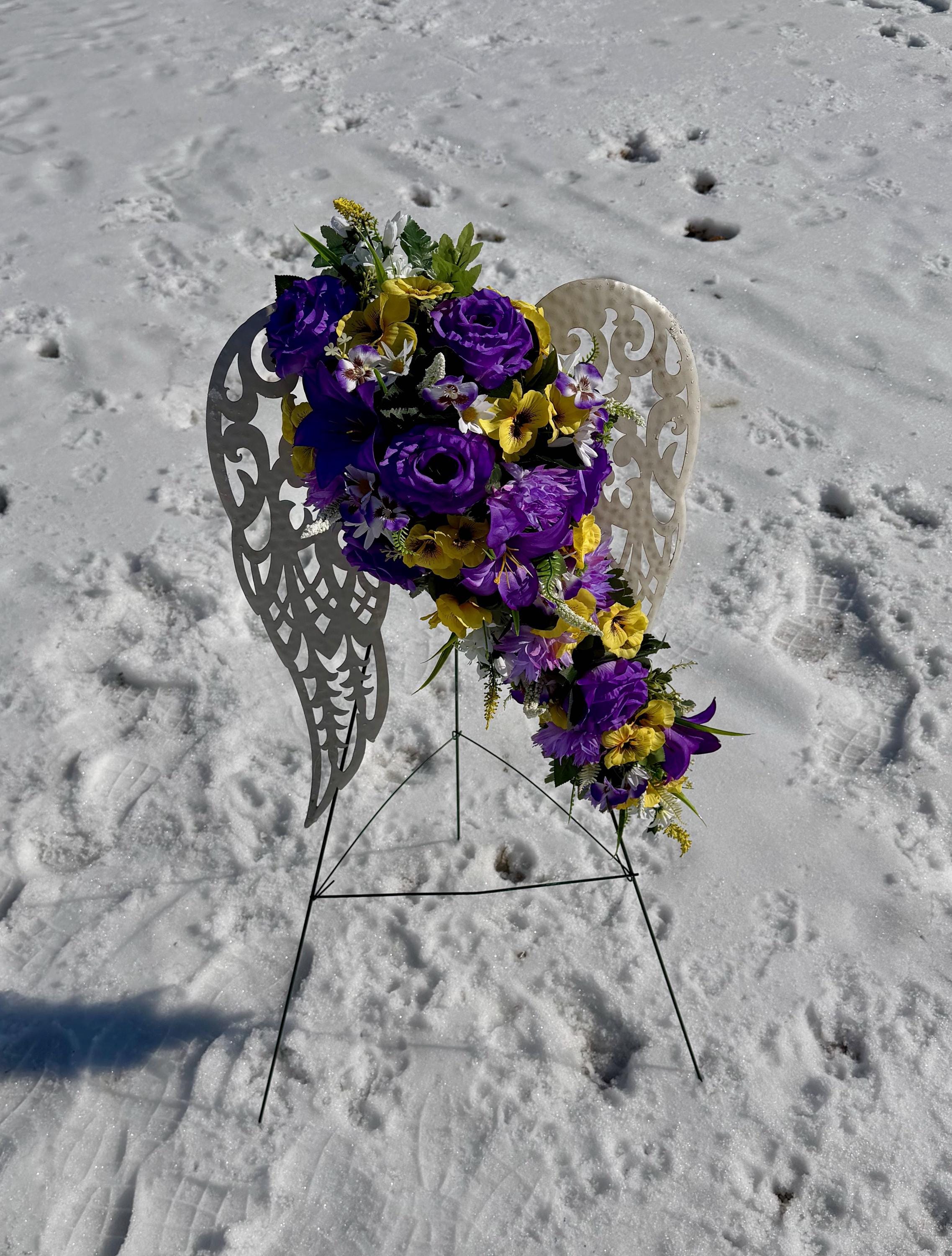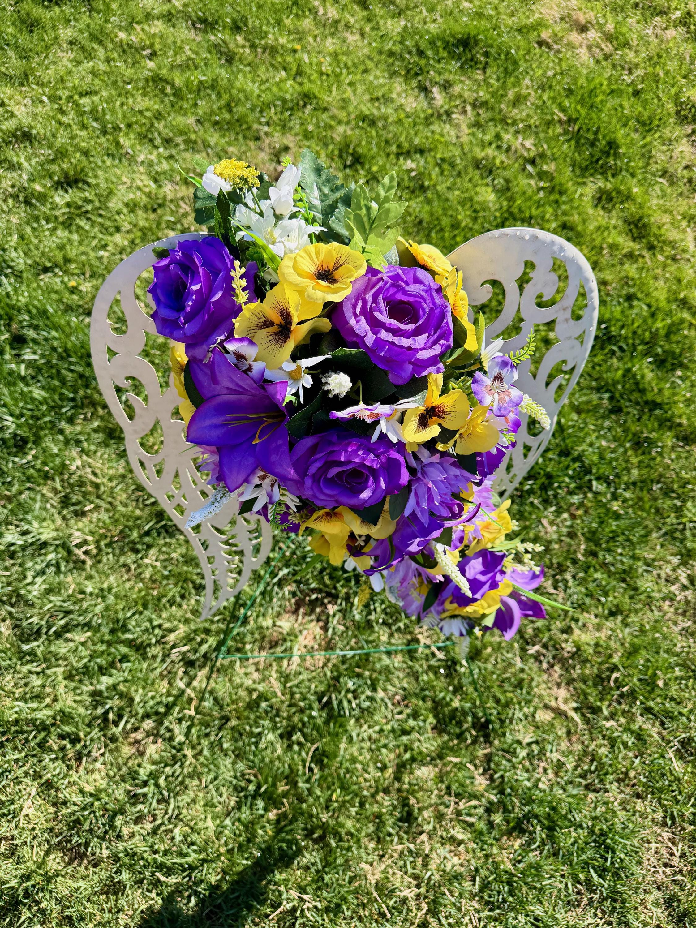 White Angel Wings with Purple and Yellow Flowers Cemetery Arrangement, Memorial Flowers, Headstone Decorations,