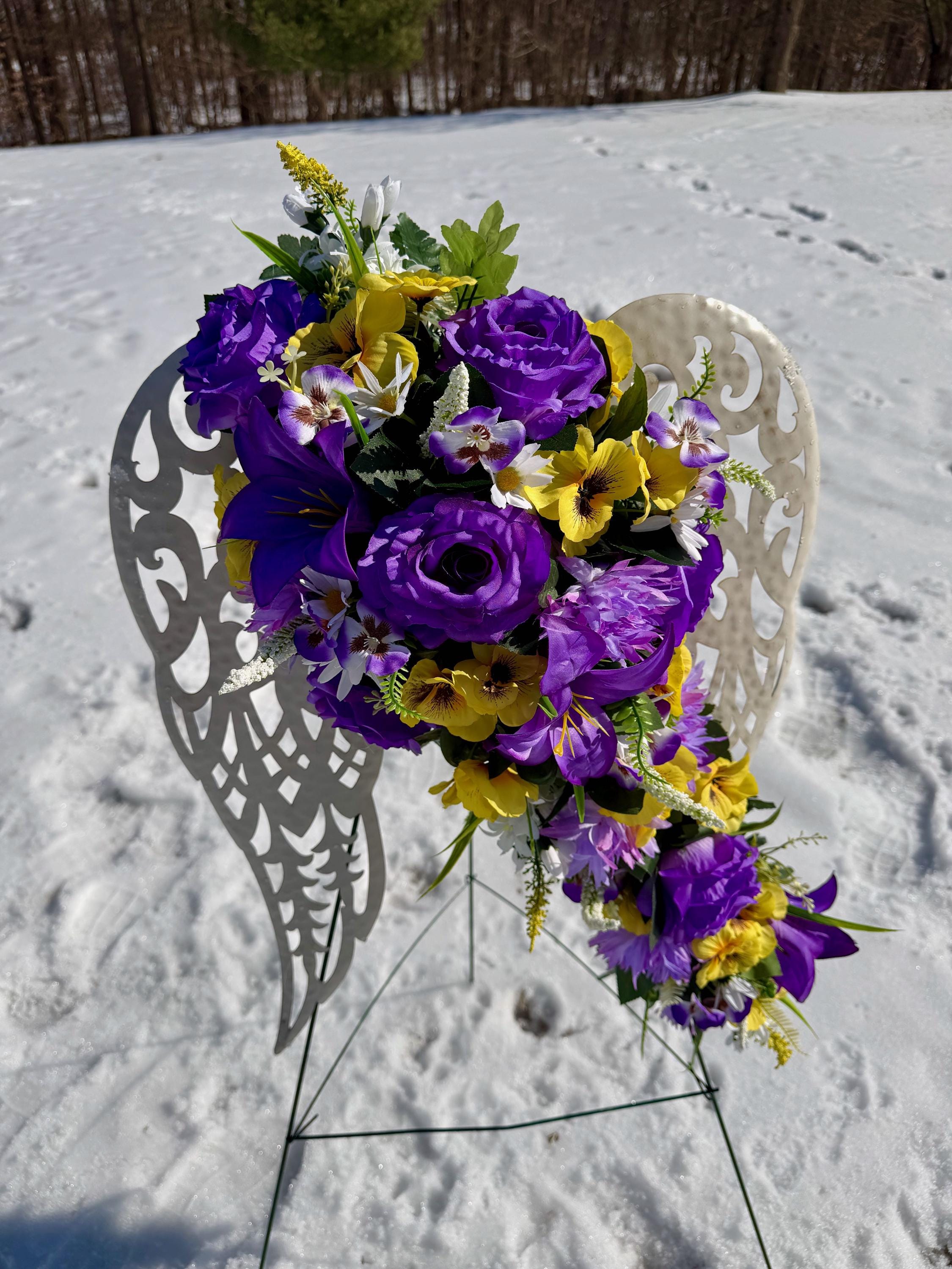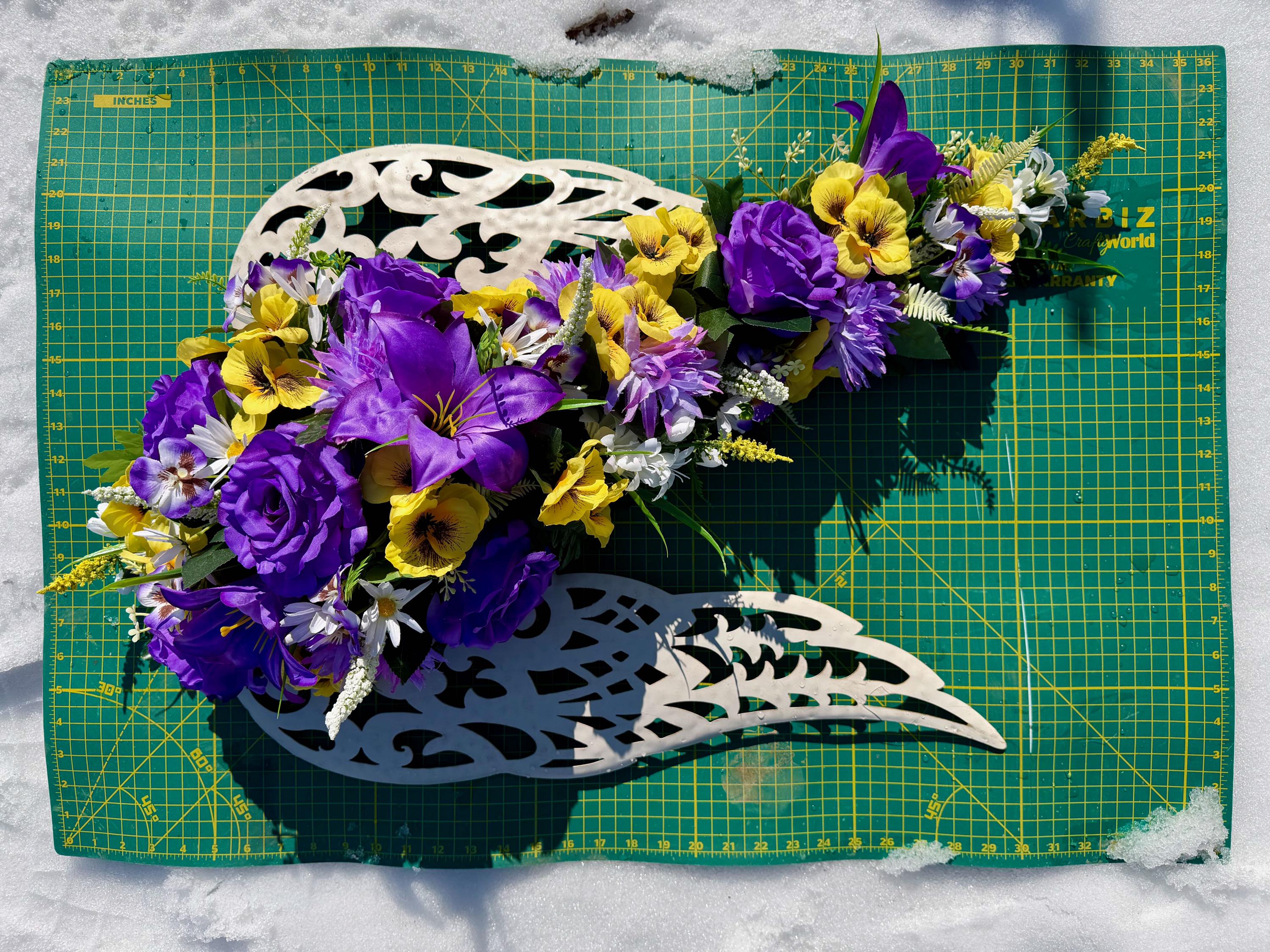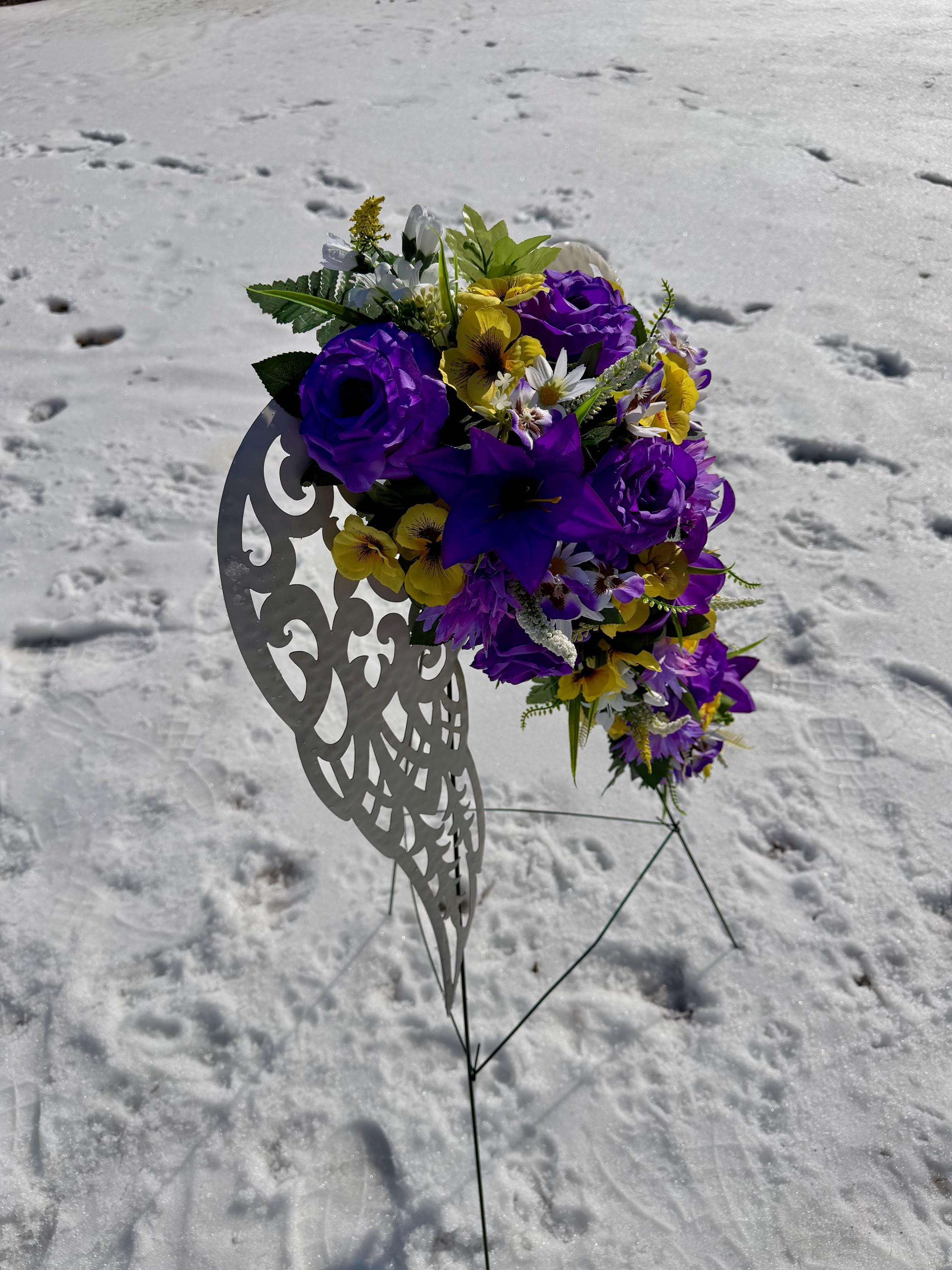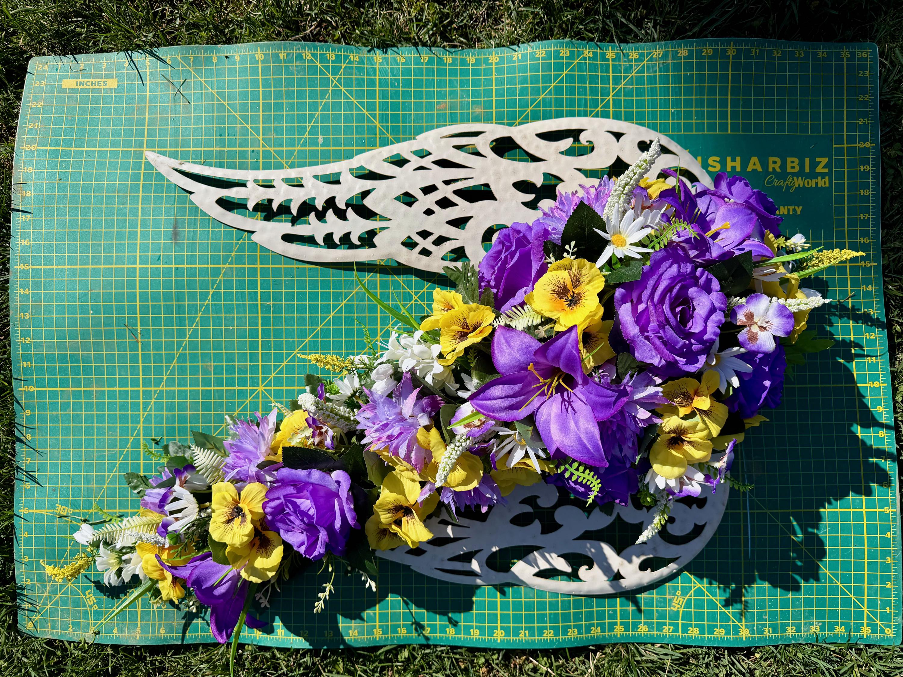 White Angel Wings with Purple and Yellow Flowers Cemetery Arrangement, Memorial Flowers, Headstone Decorations,