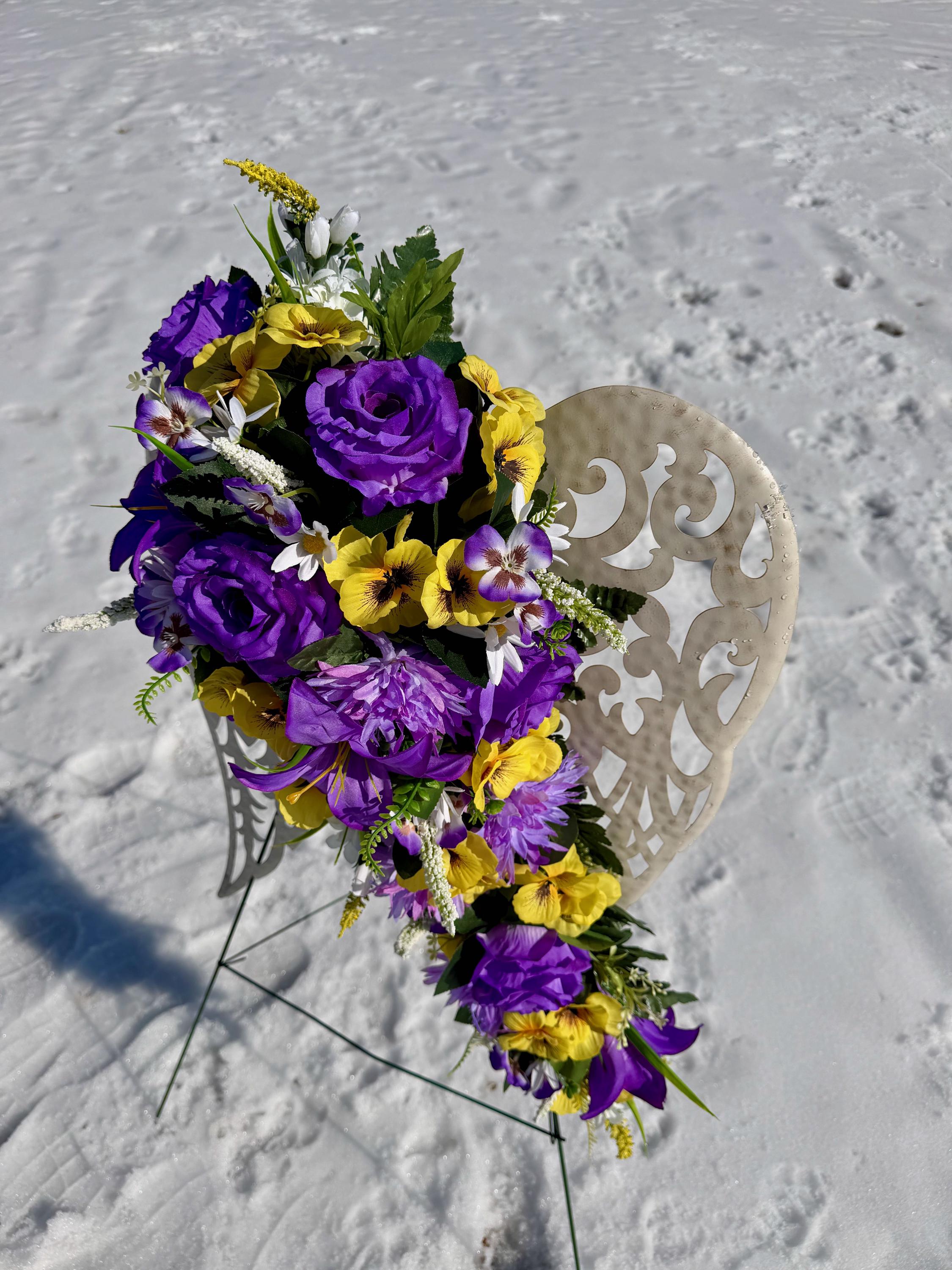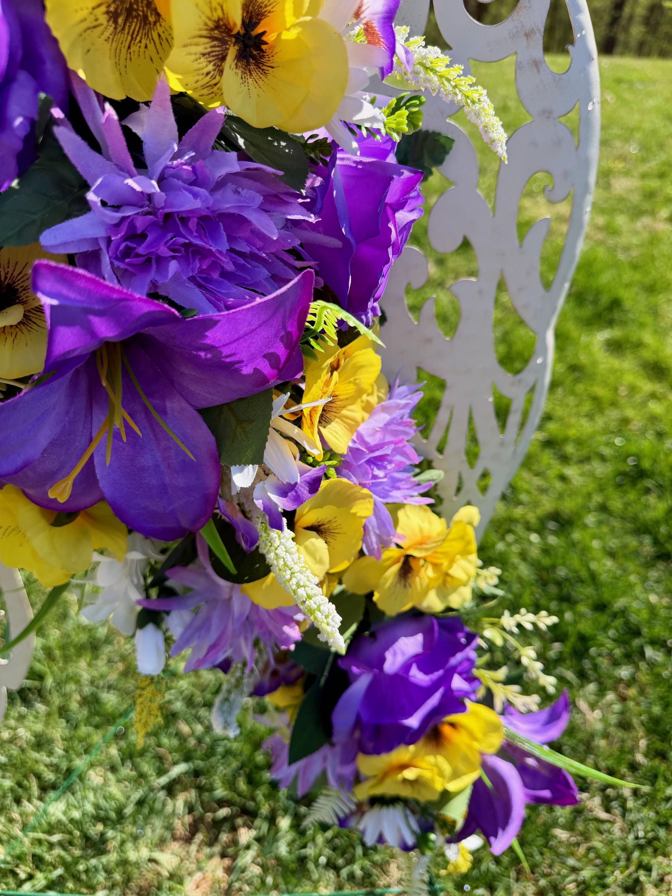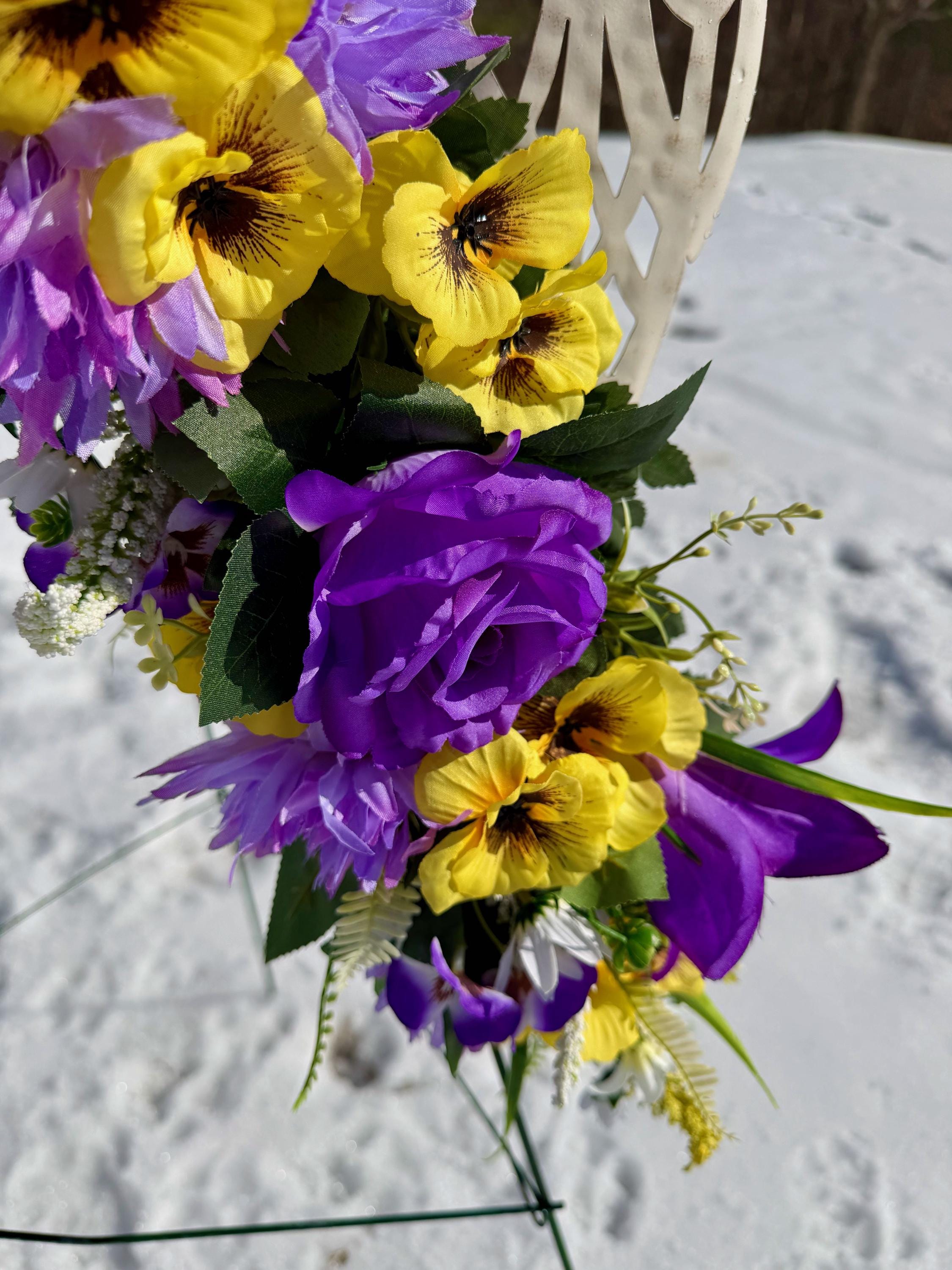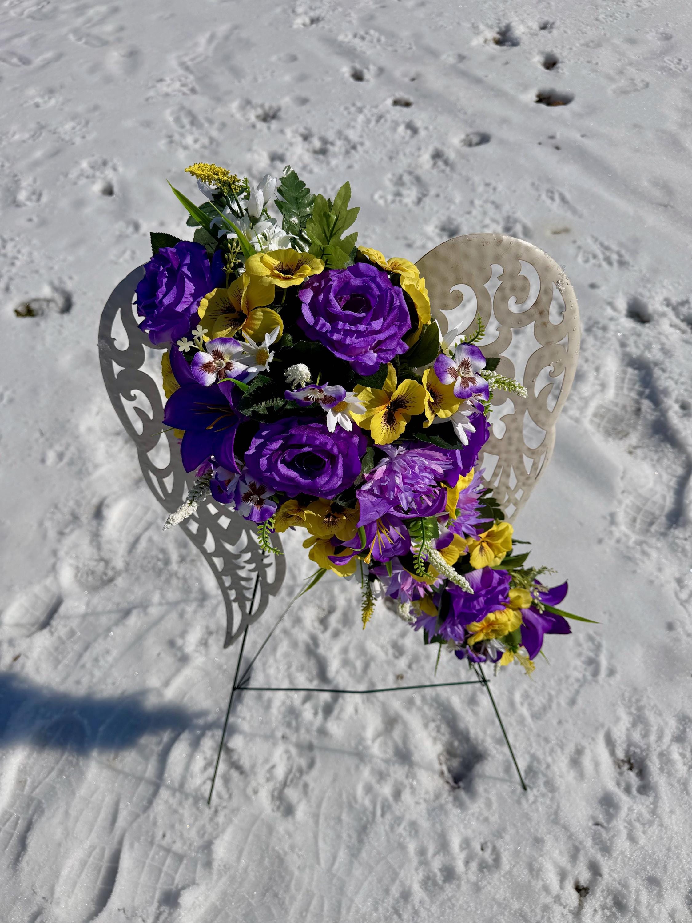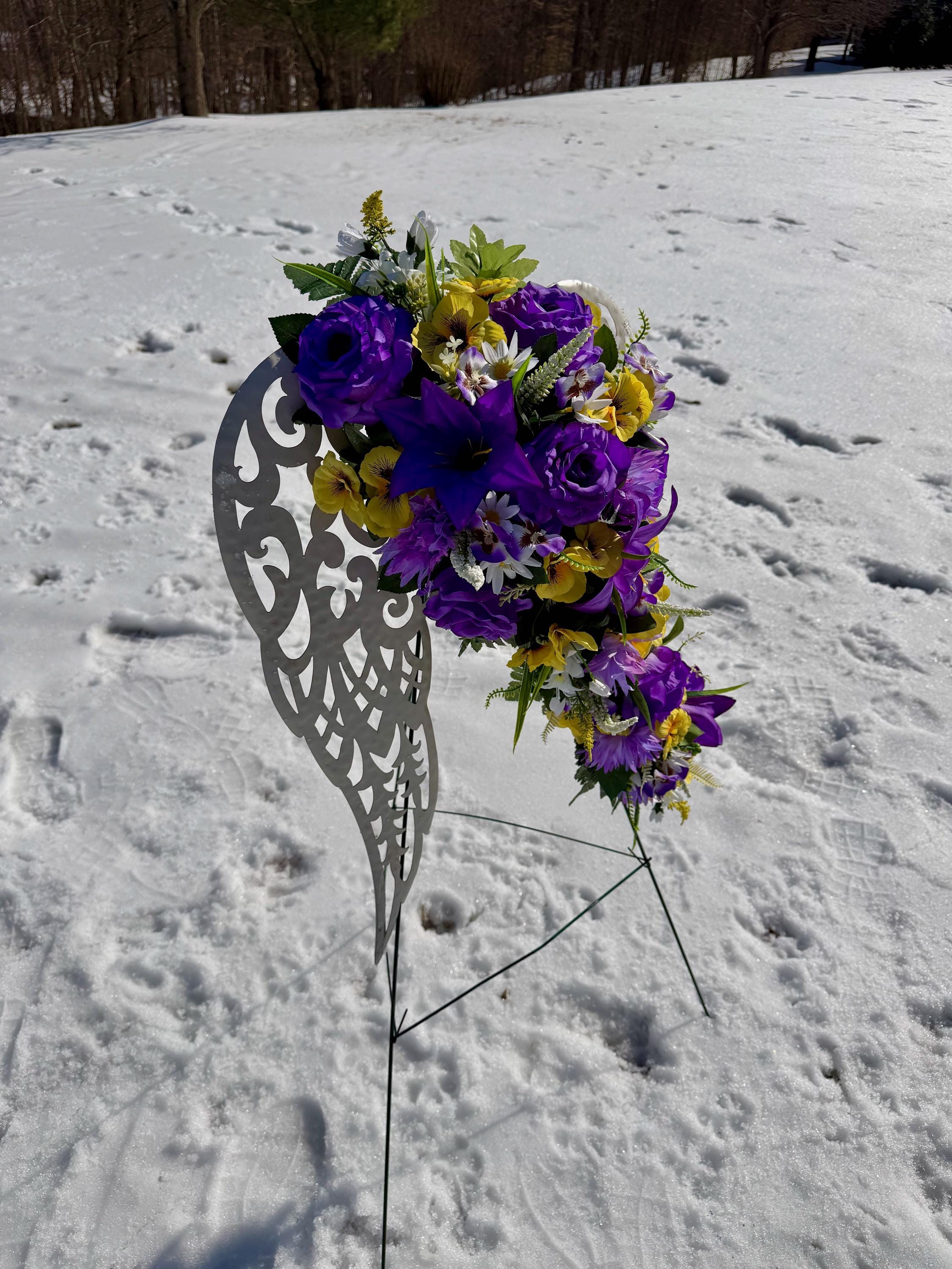 White Angel Wings with Purple and Yellow Flowers Cemetery Arrangement, Memorial Flowers, Headstone Decorations,
