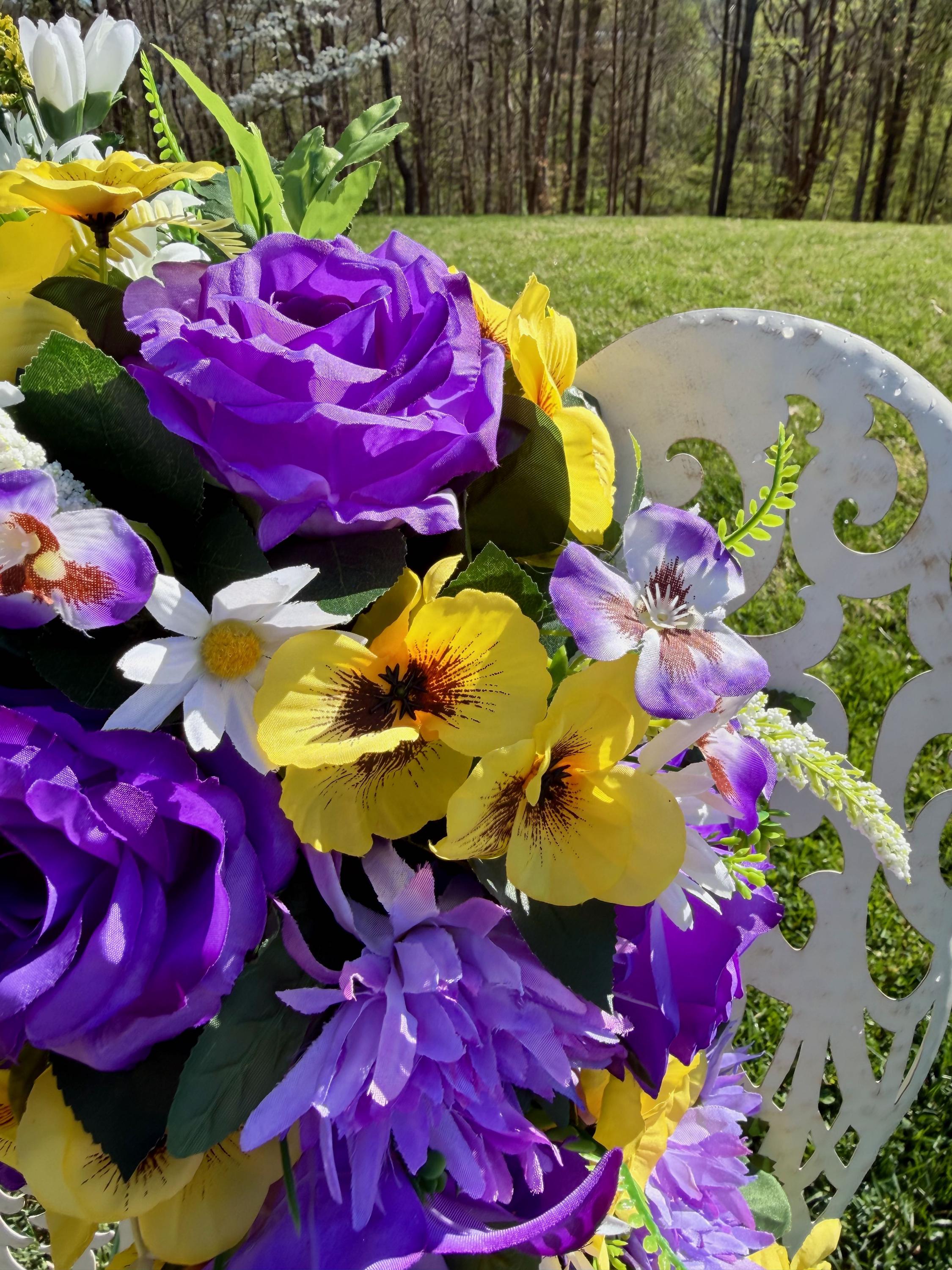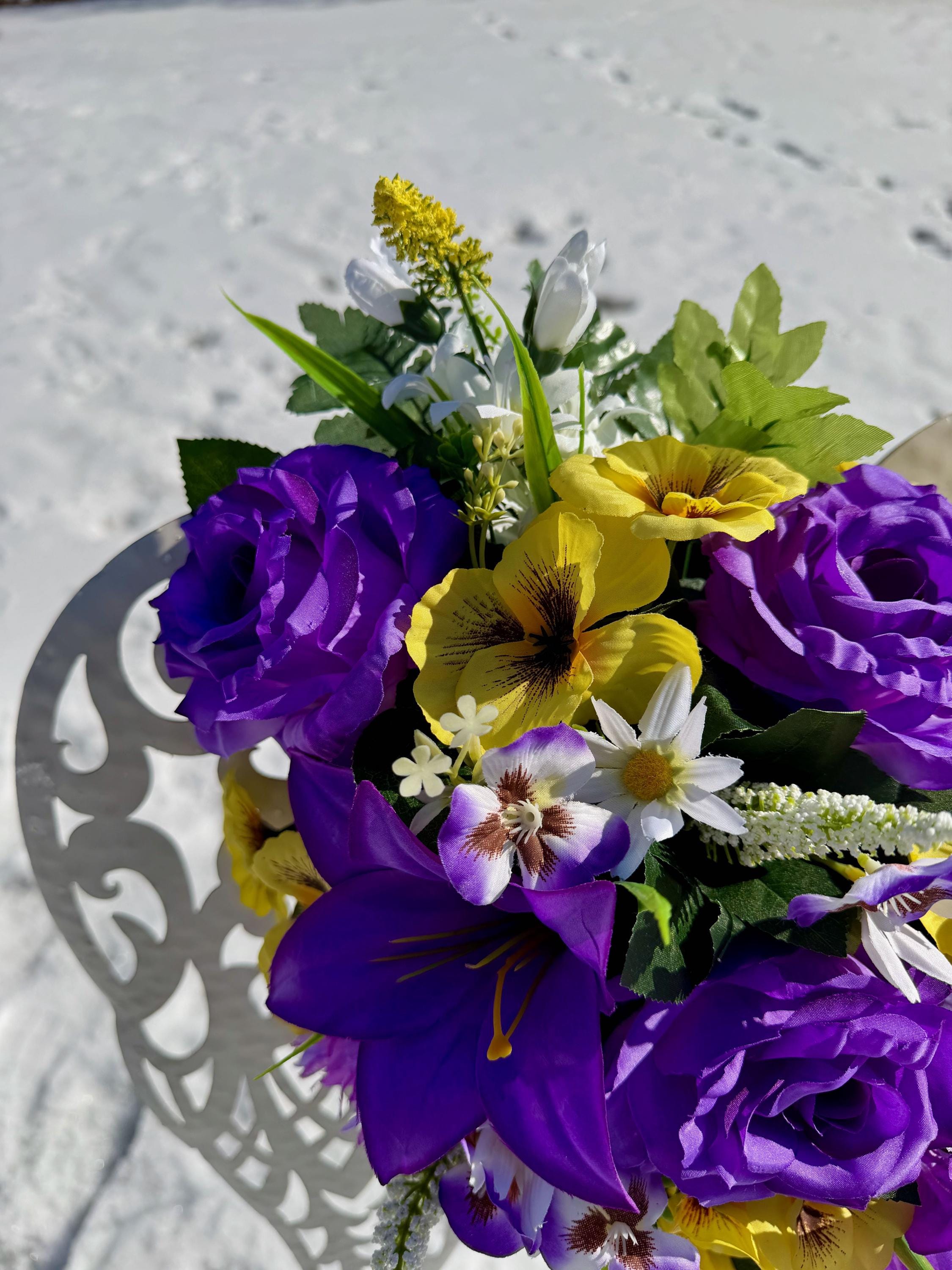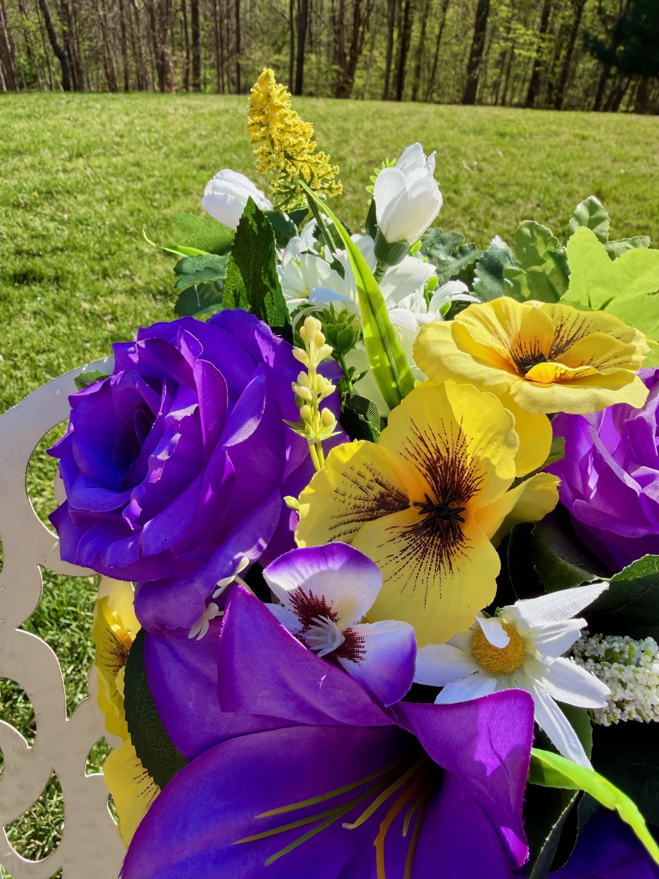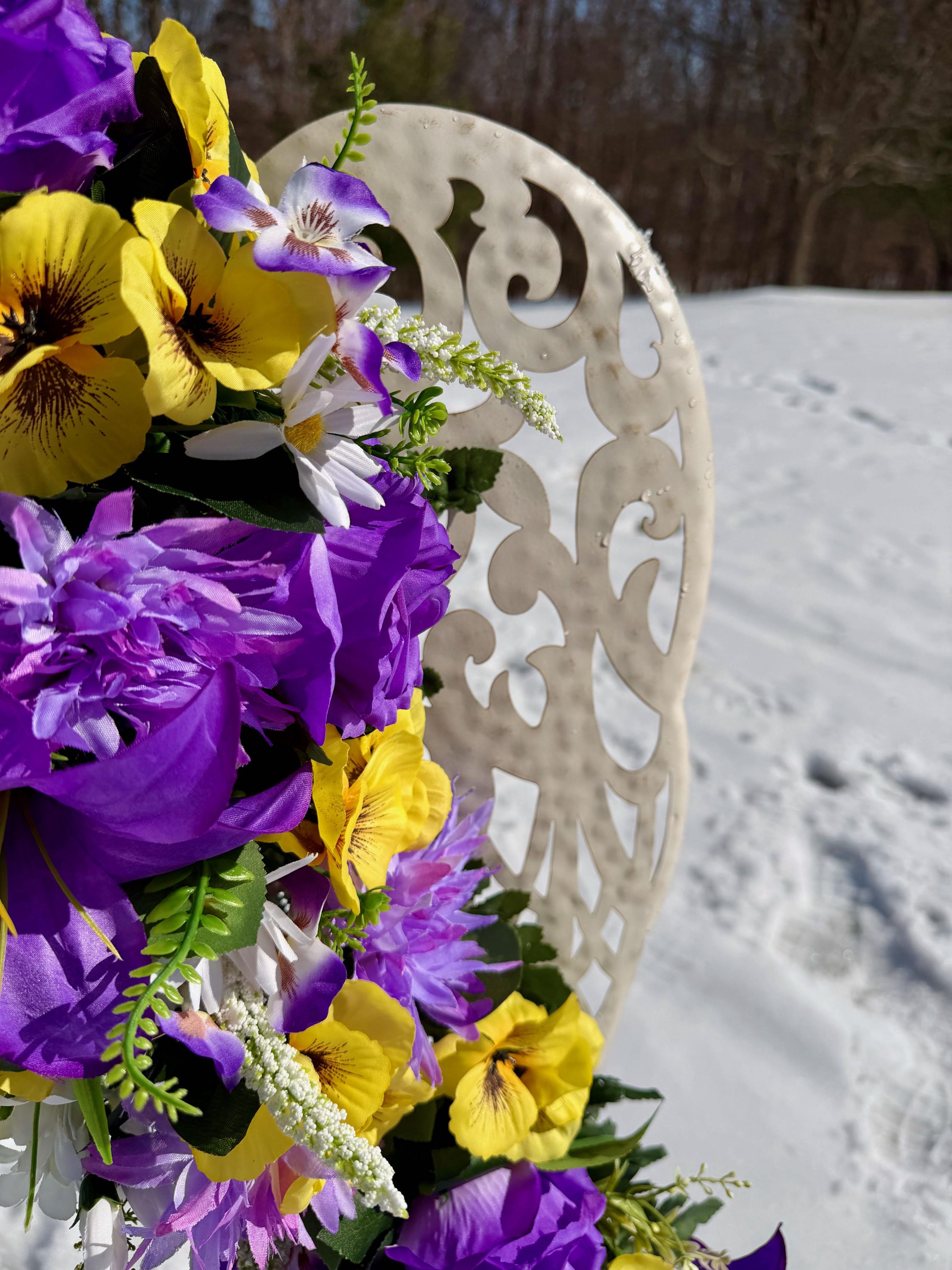 We’re a small, family-operated business consisting of myself, my husband, and my daughter. We personally manage every order and strive for excellent customer service. All our arrangements use high-quality silk flowers, though all silk blooms may fade over time. Each stem is glued into foam to withstand the elements. Designed by M&E uses only premium silks, and we put genuine care into every piece we create. Rest assured, the arrangement shown in our photos is exactly the one you’ll receive, as I design and assemble each one myself. If you’re searching for something unique or have a particular flower, color, or matching vases in mind, please contact me to discuss a custom order.