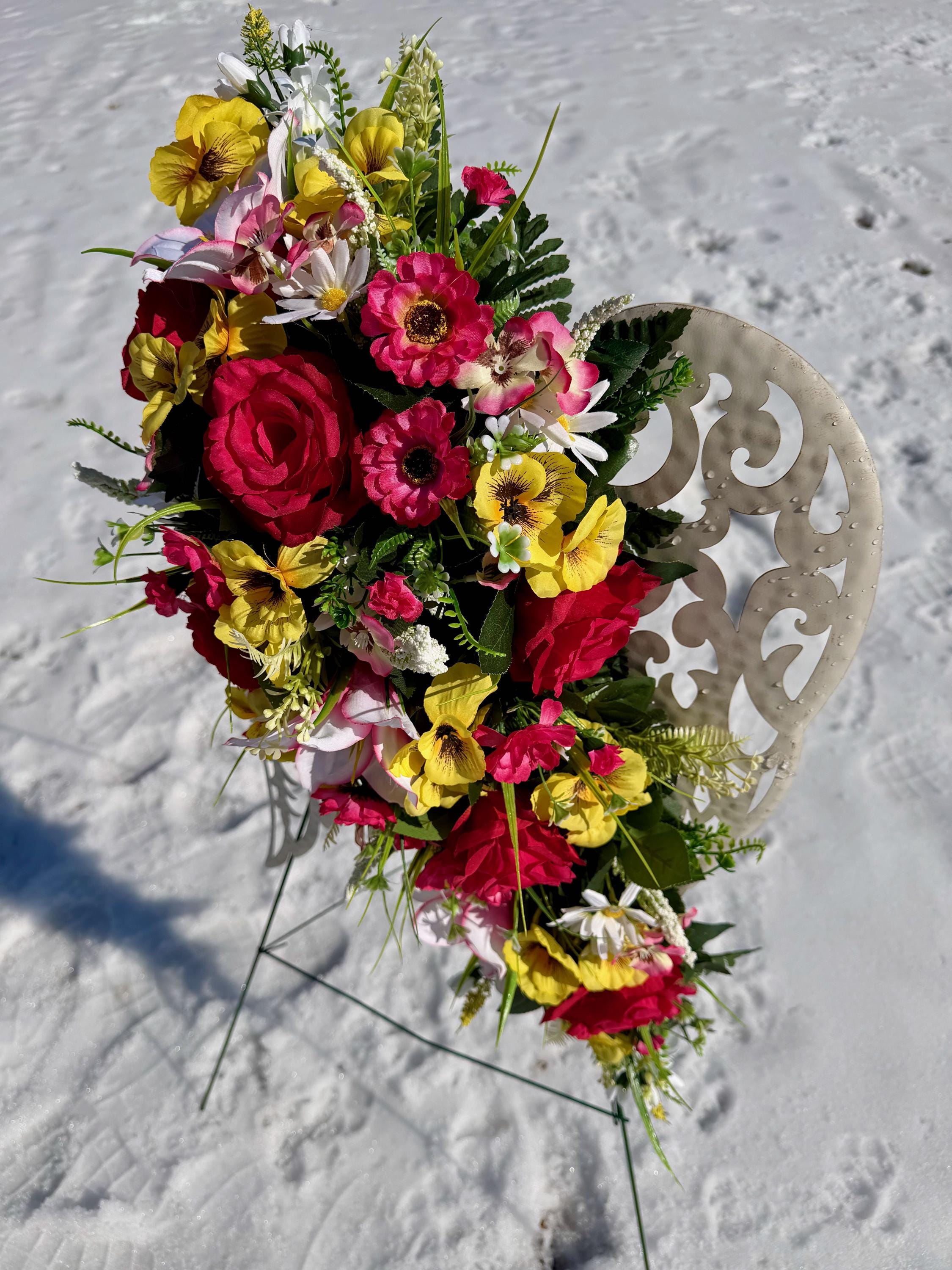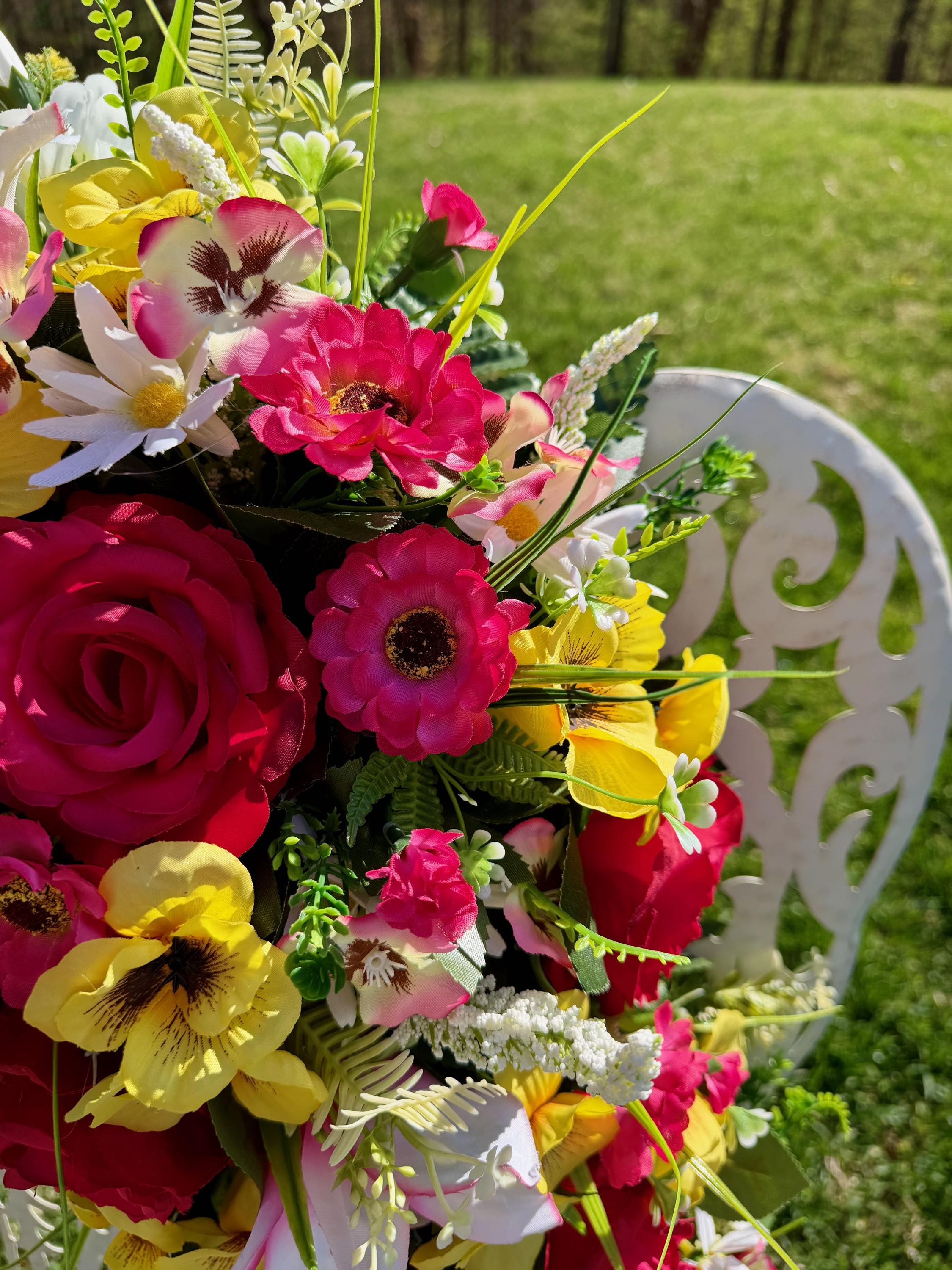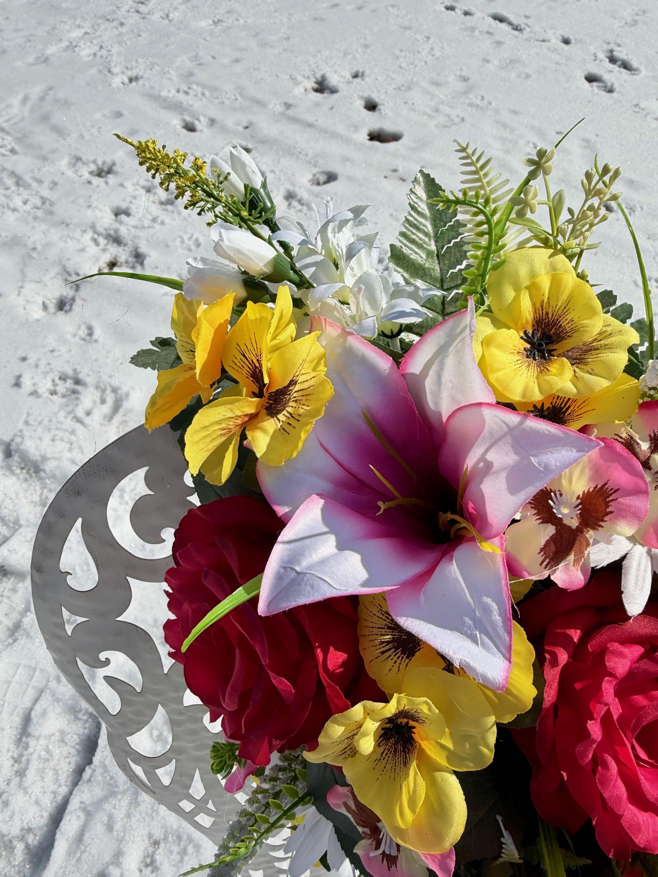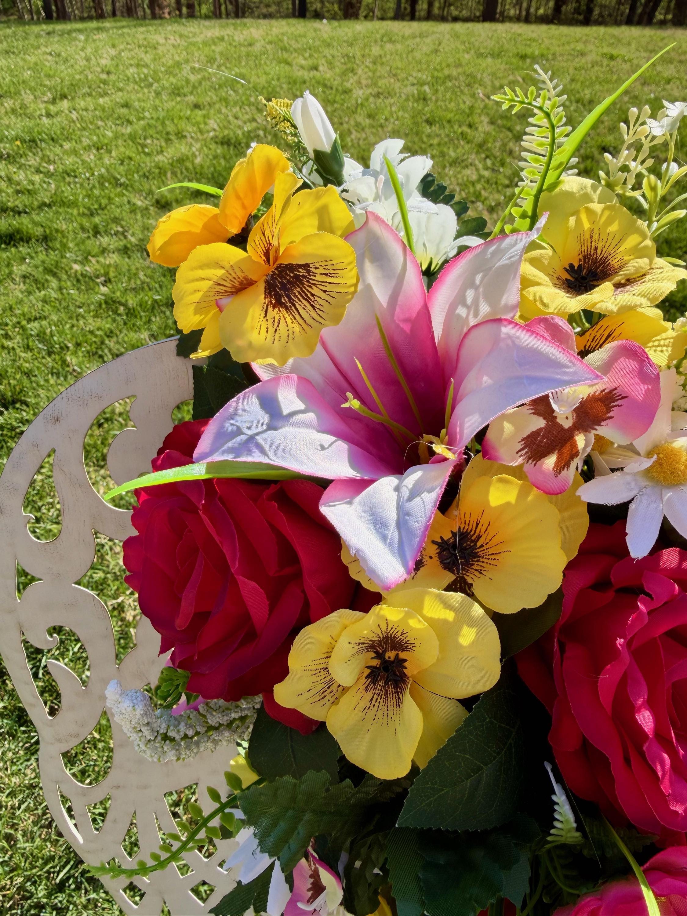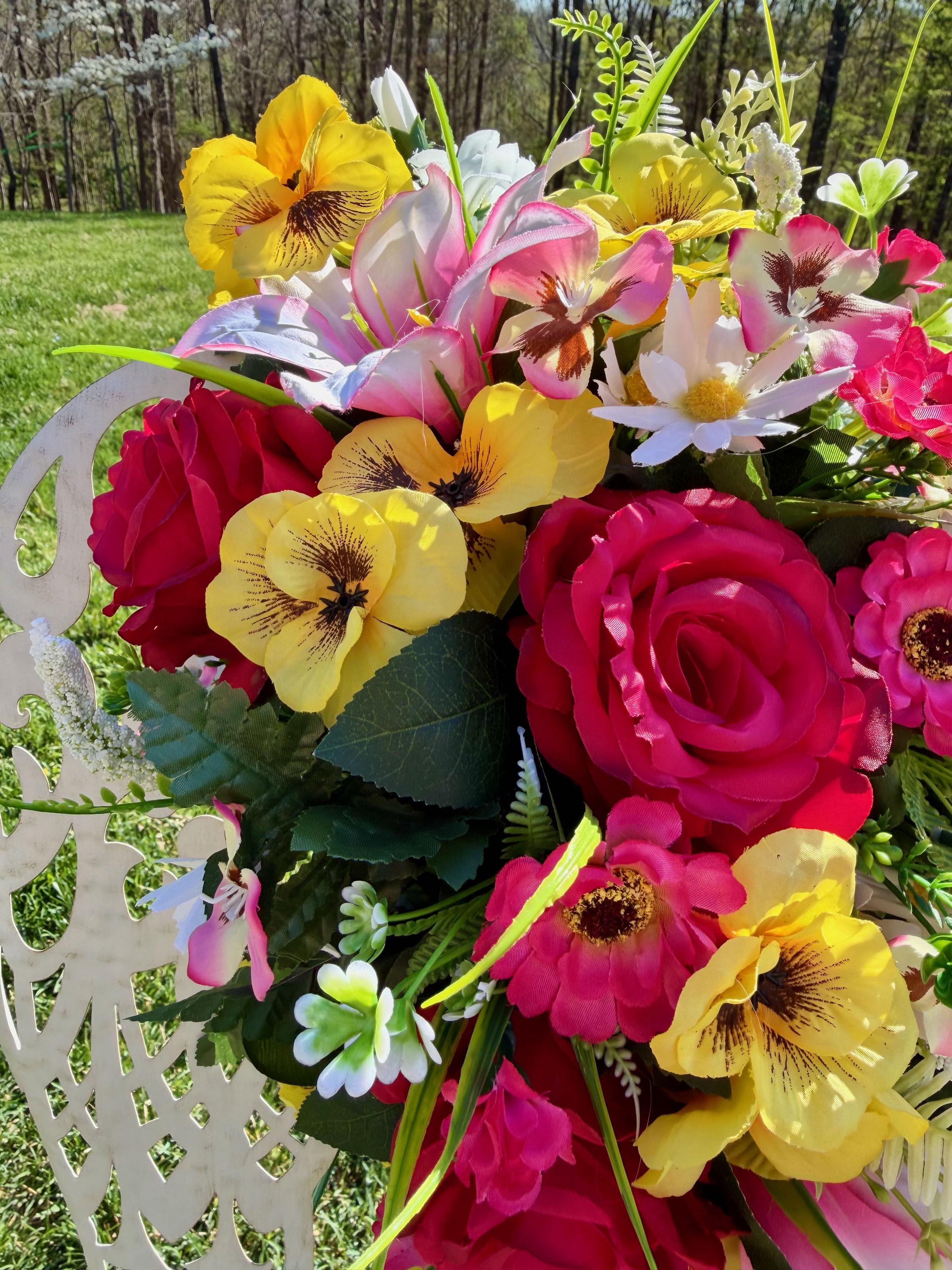 We’re a small, family-operated business consisting of myself, my husband, and my daughter. We personally manage every order and strive for excellent customer service. All our arrangements use high-quality silk flowers, though all silk blooms may fade over time. Each stem is glued into foam to withstand the elements. Designed by M&E uses only premium silks, and we put genuine care into every piece we create. Rest assured, the arrangement shown in our photos is exactly the one you’ll receive, as I design and assemble each one myself. If you’re searching for something unique or have a particular flower, color, or matching vases in mind, please contact me to discuss a custom order.