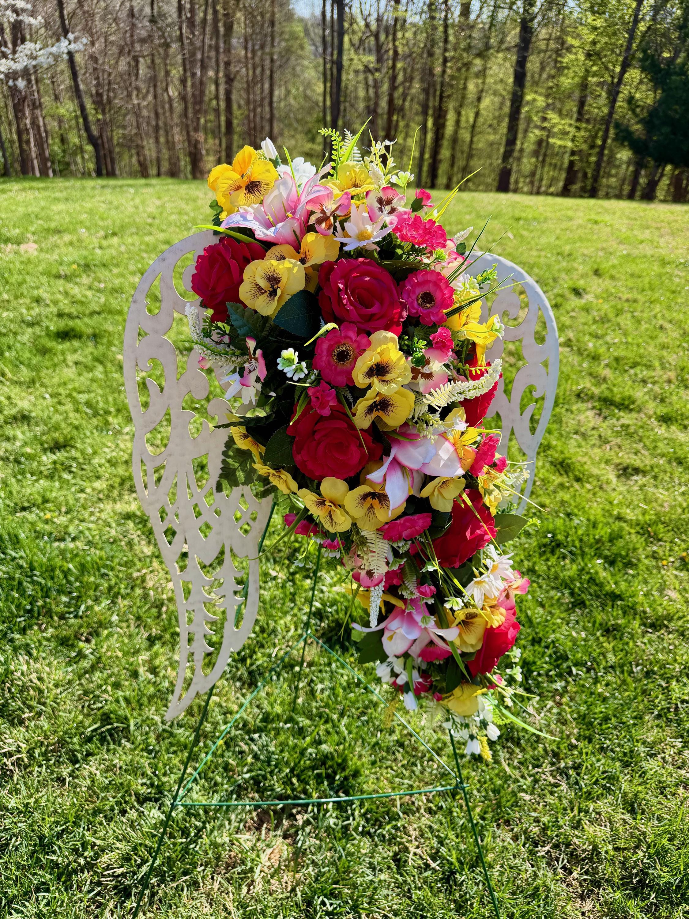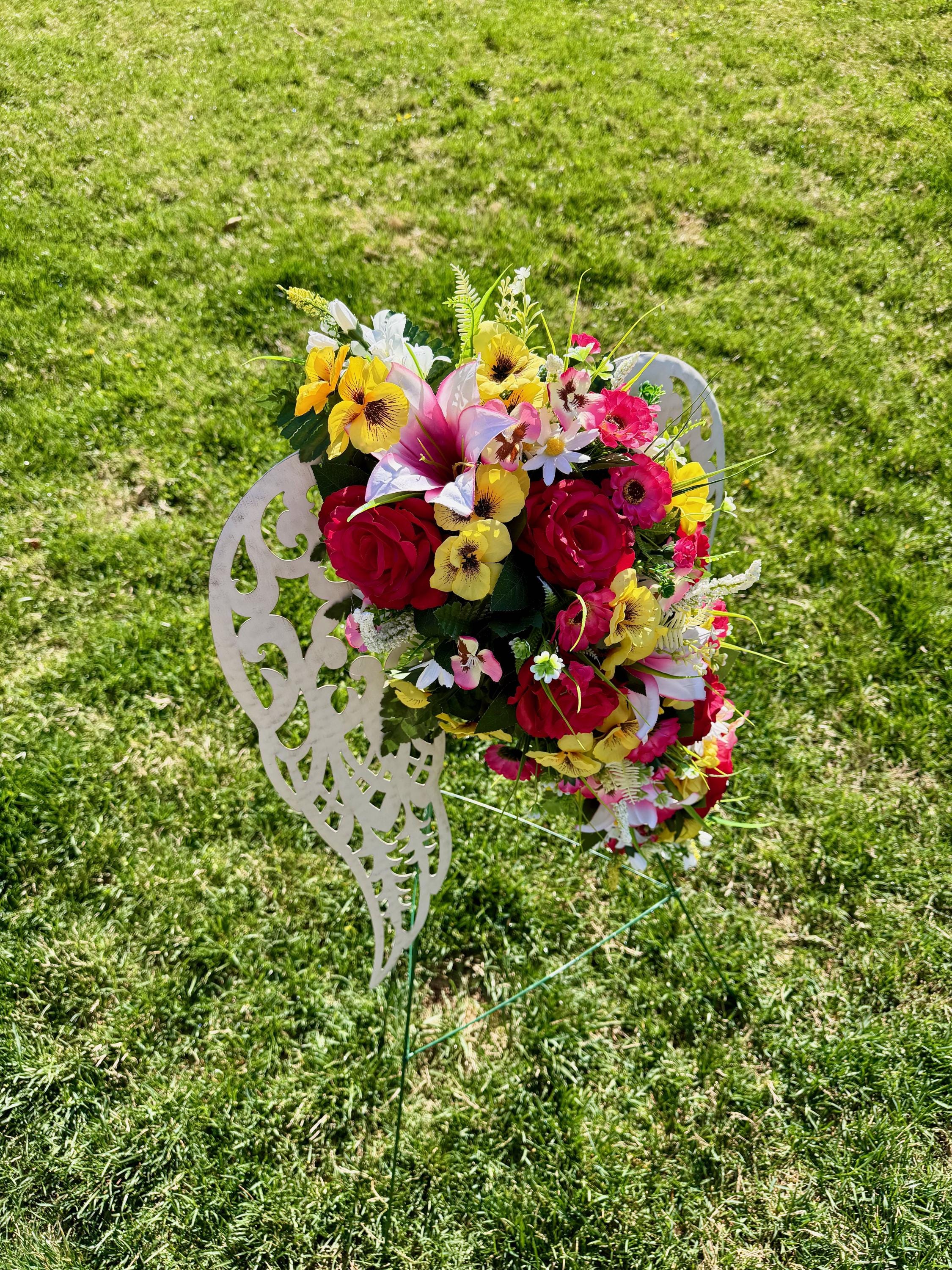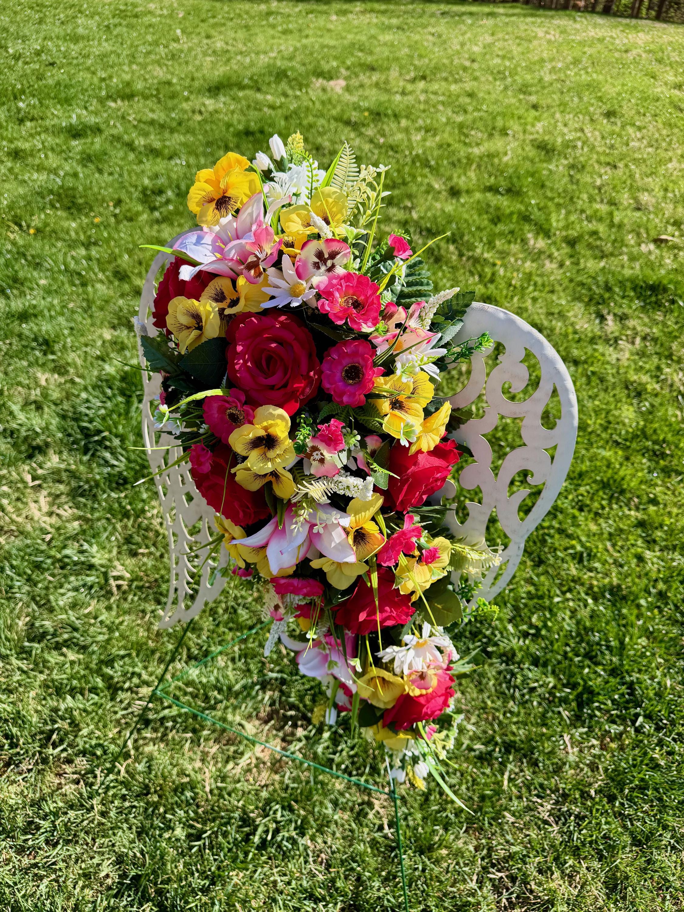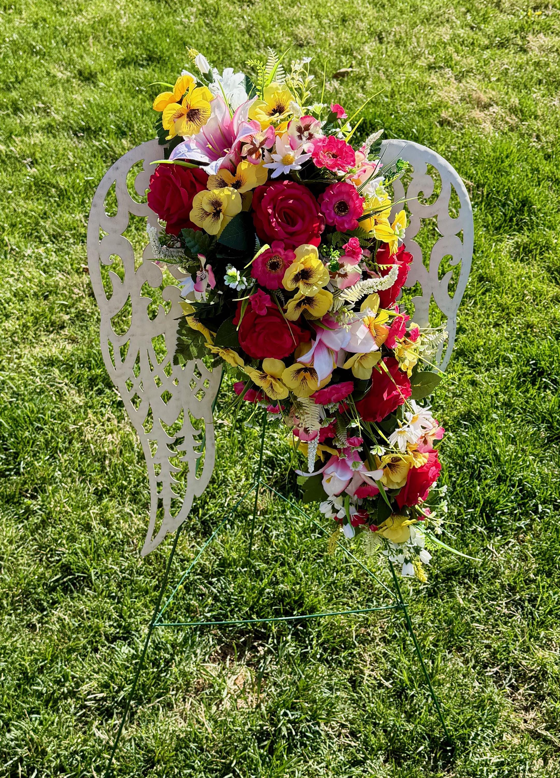 White Angel Wings with Bright Flowers Cemetery Arrangement, Memorial Flowers, Headstone Decorations,