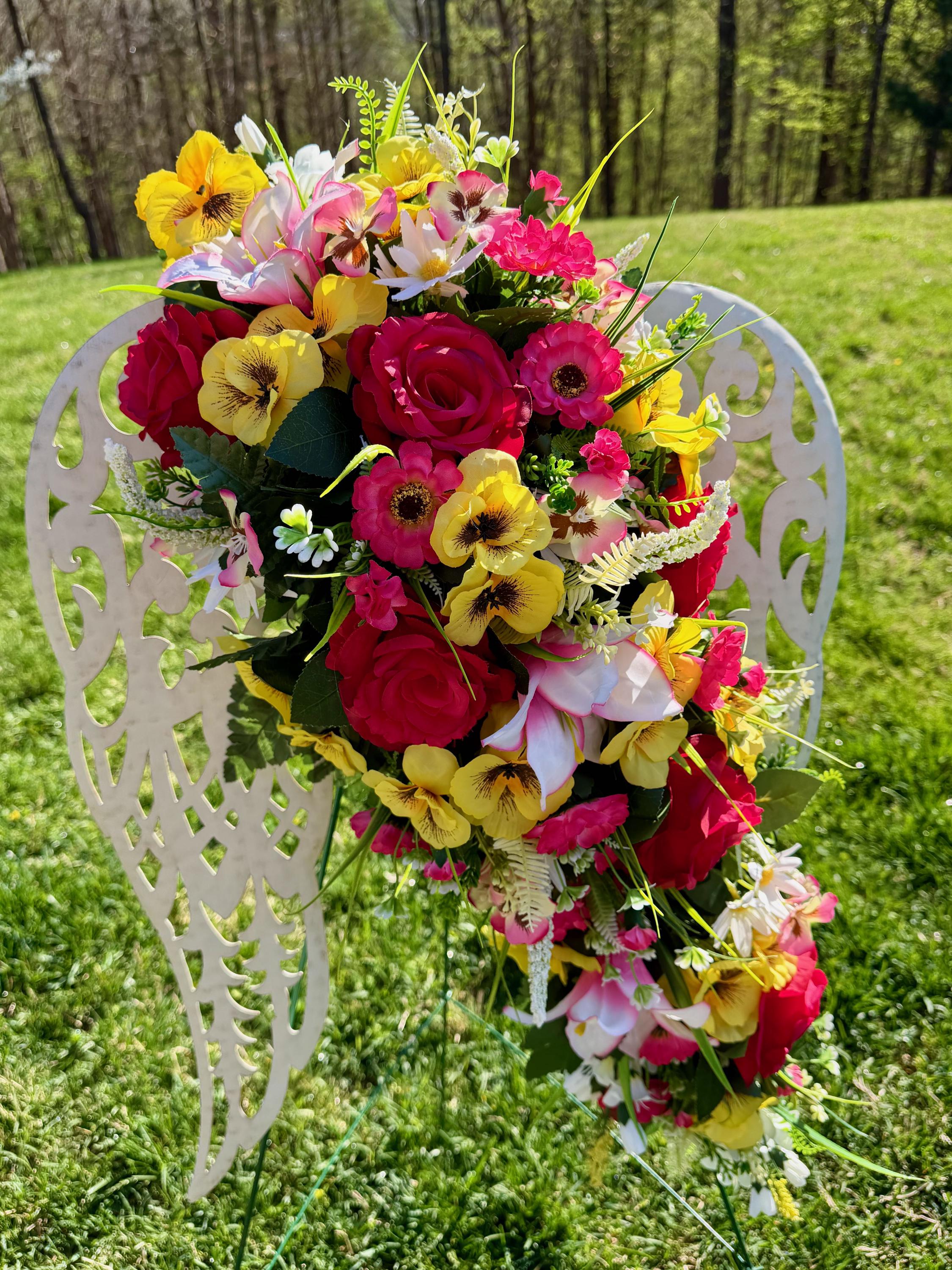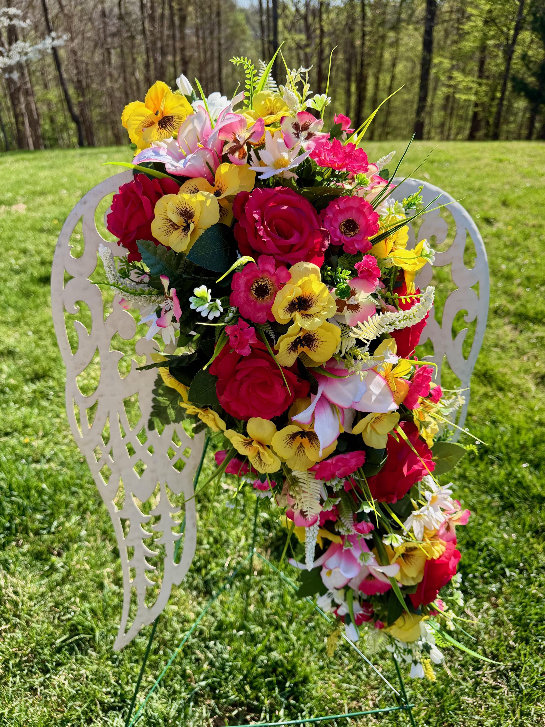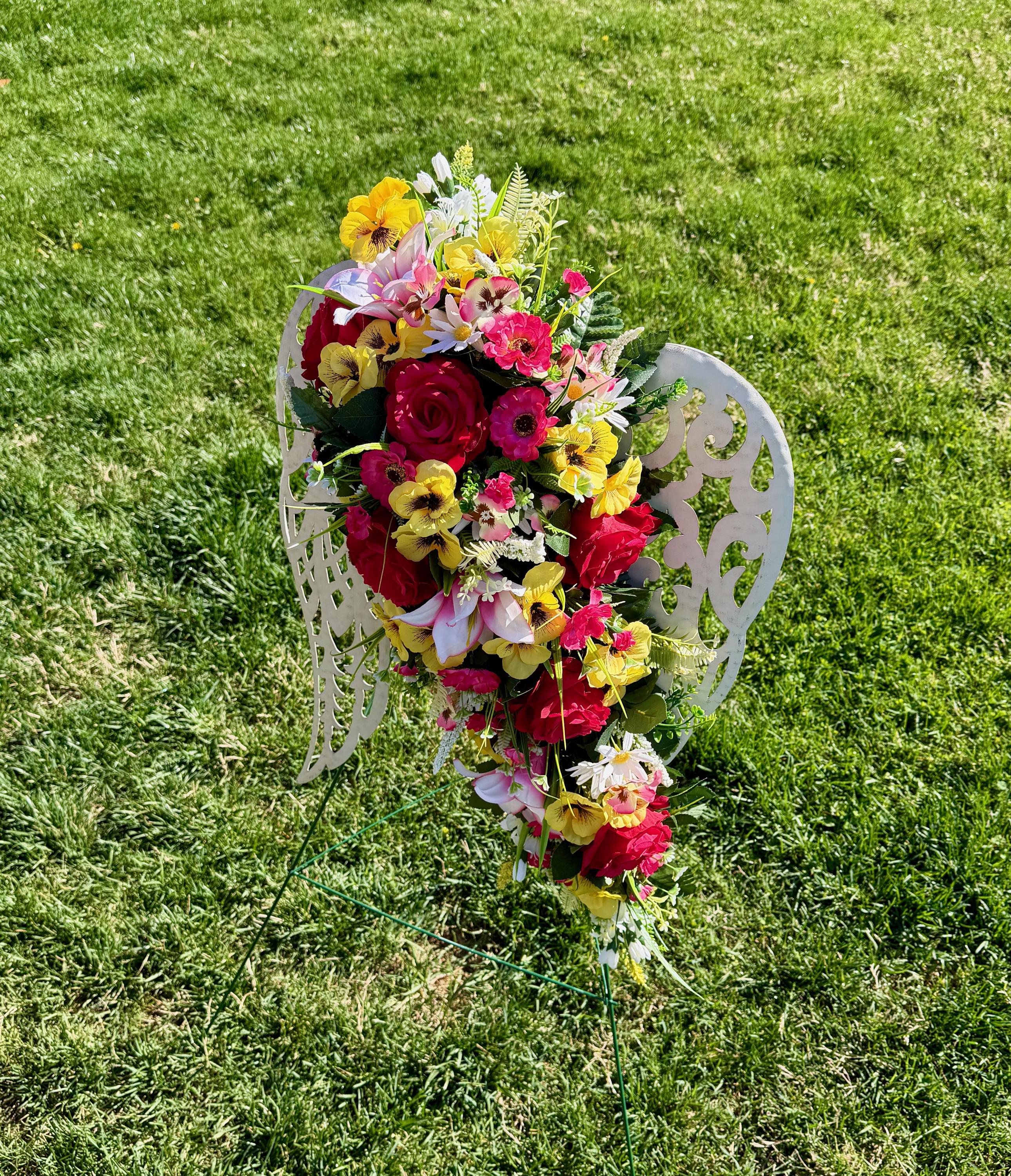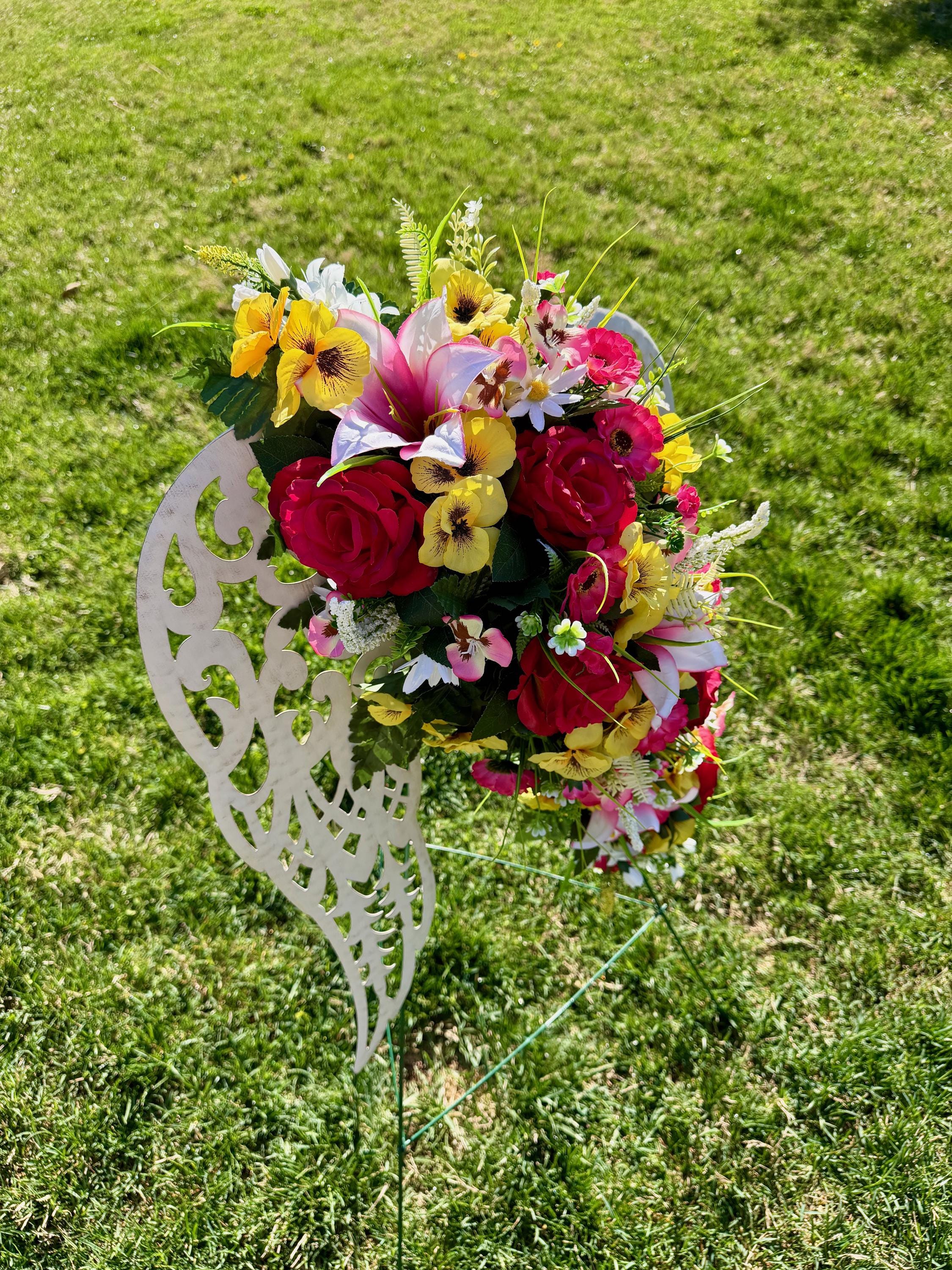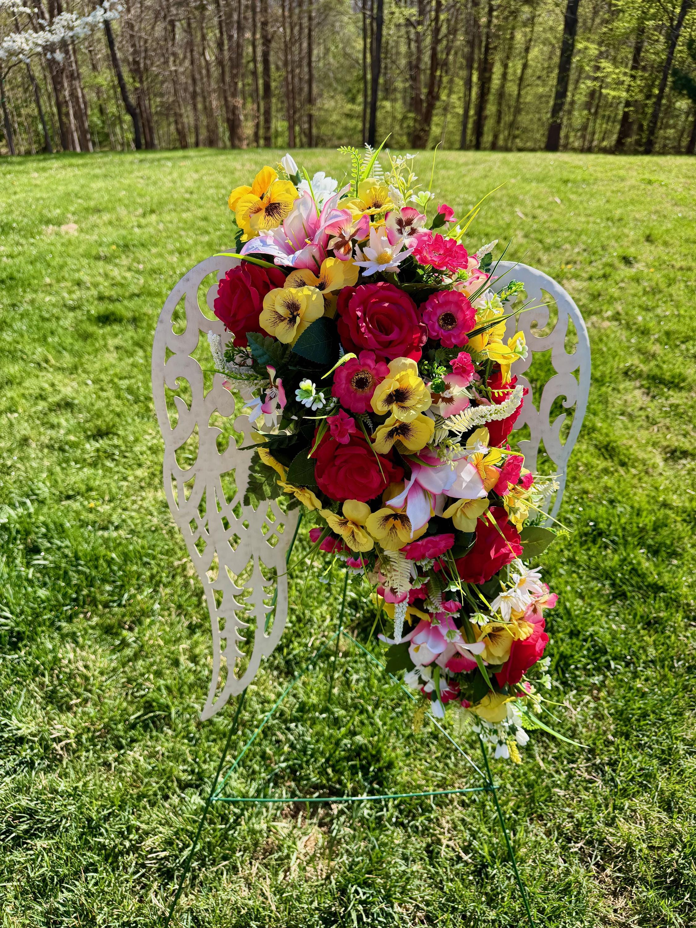 White Angel Wings with Bright Flowers Cemetery Arrangement, Memorial Flowers, Headstone Decorations,