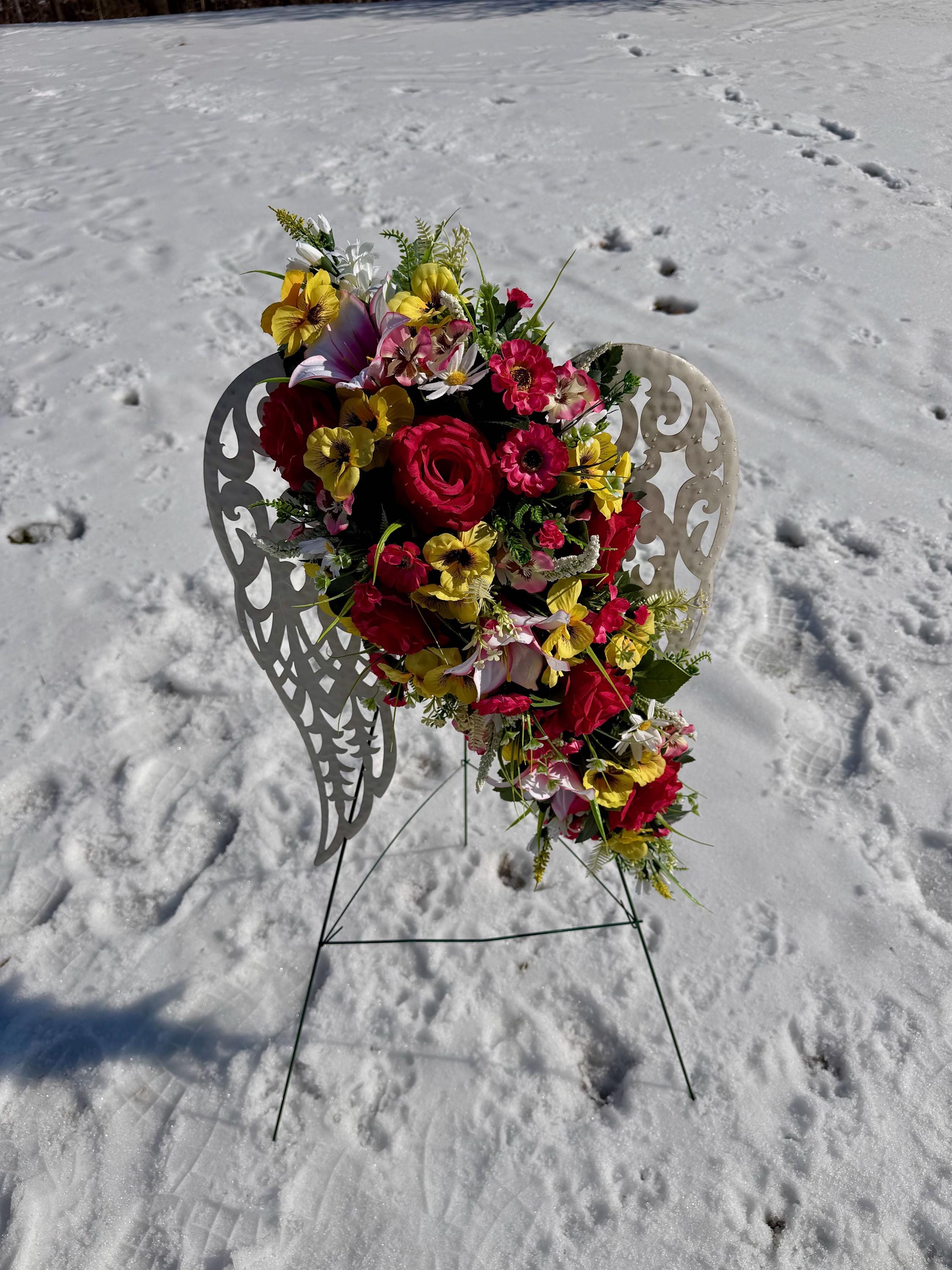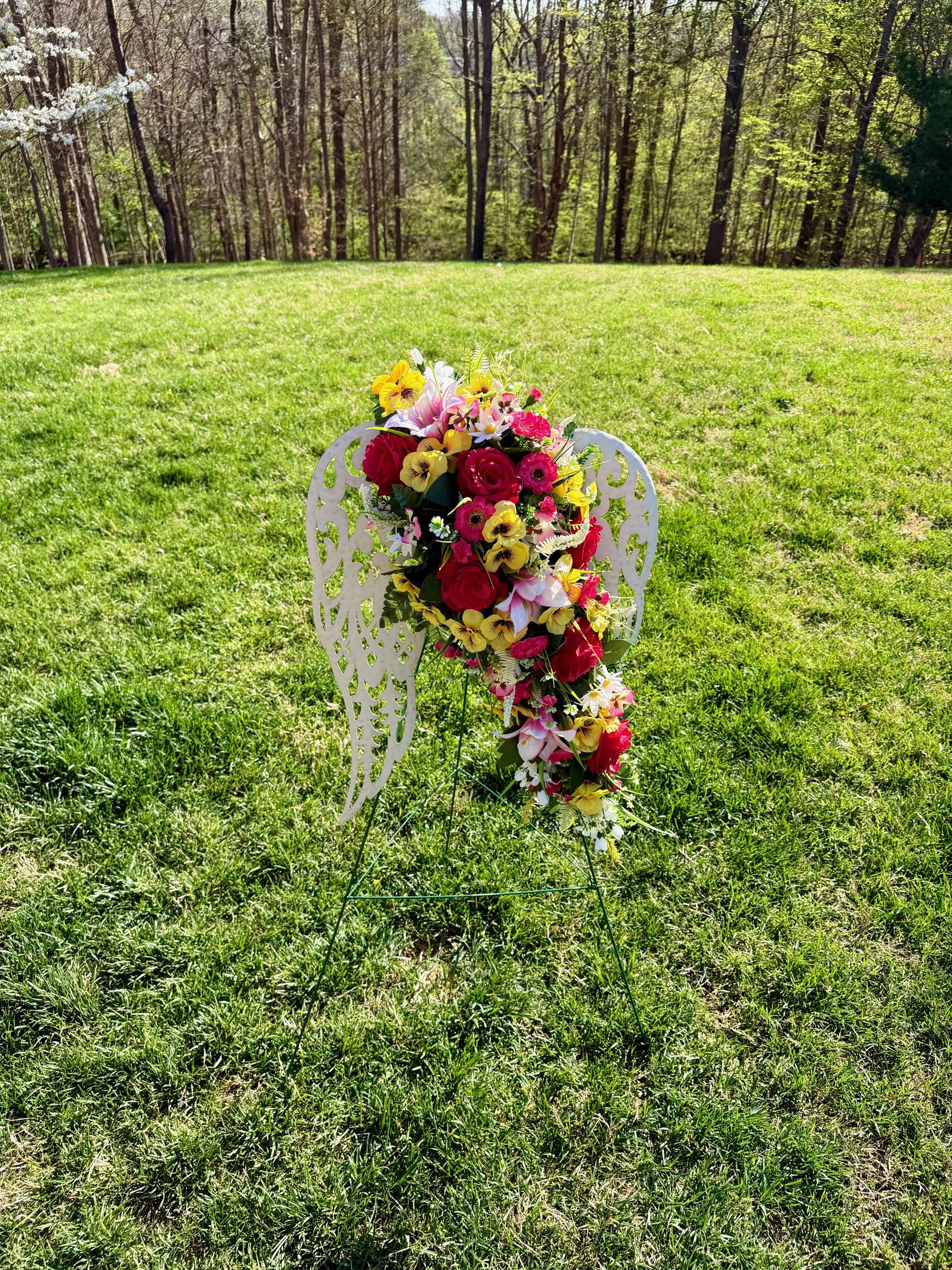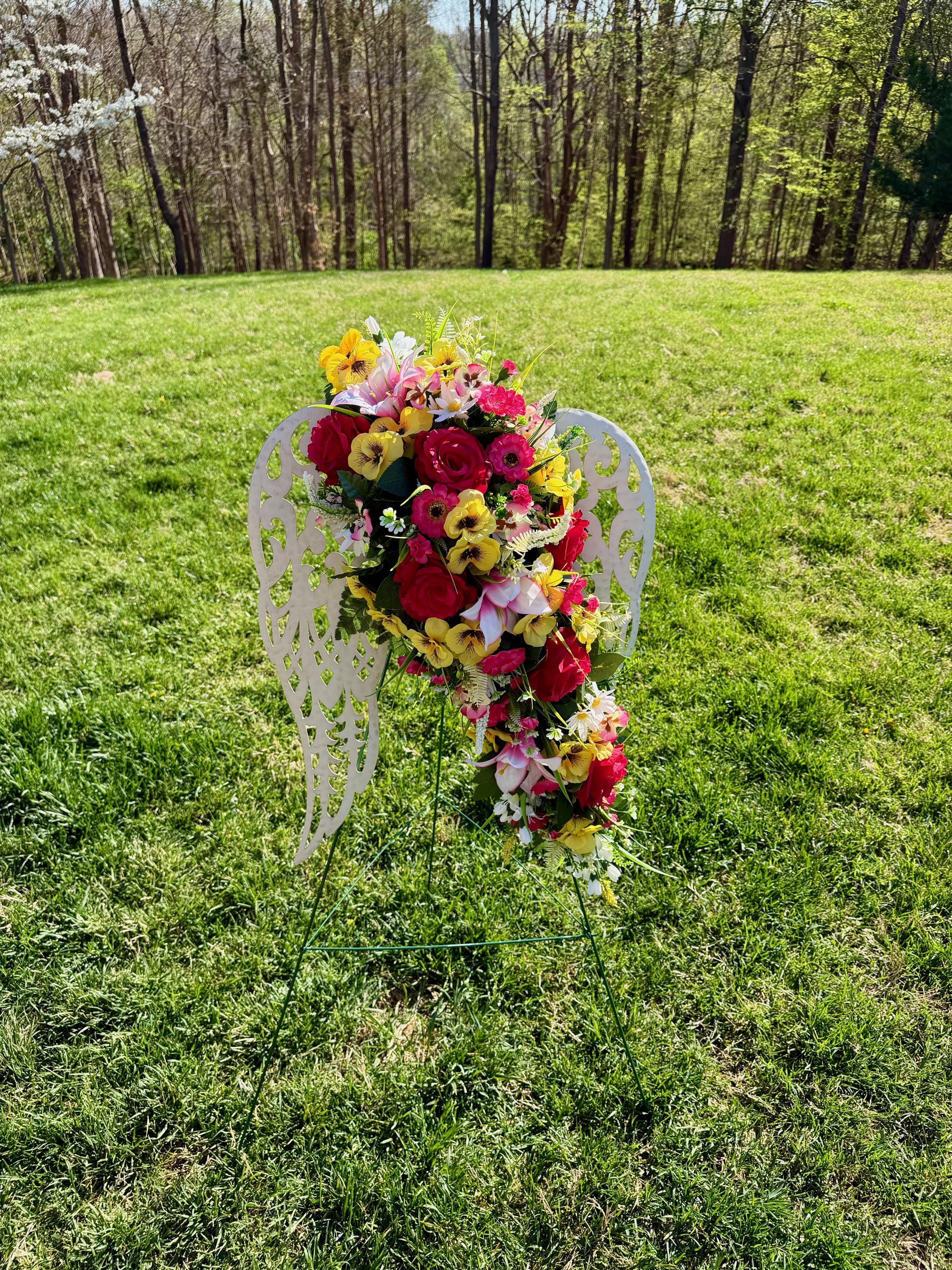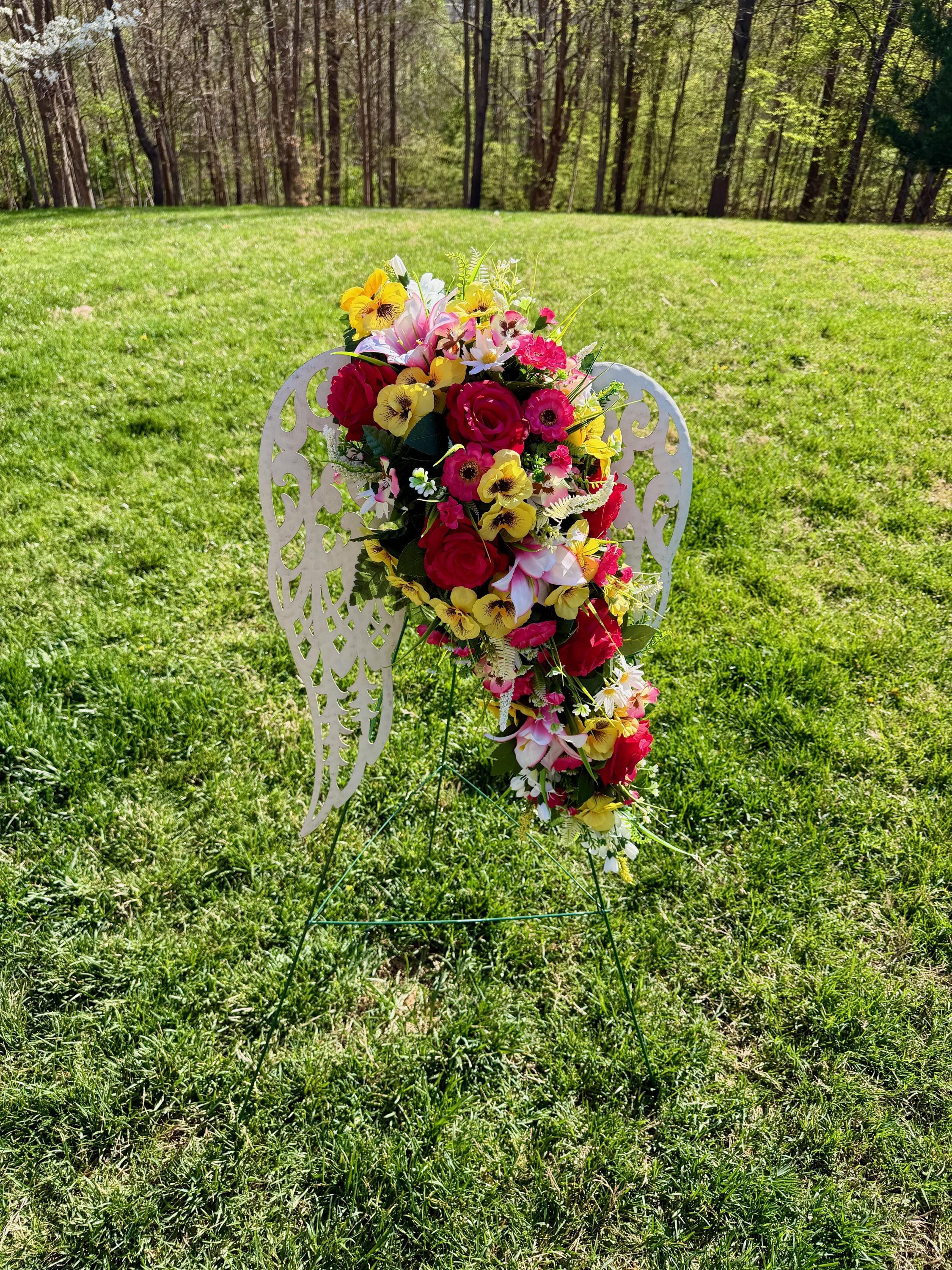 White Angel Wings with Bright Flowers Cemetery Arrangement, Memorial Flowers, Headstone Decorations,