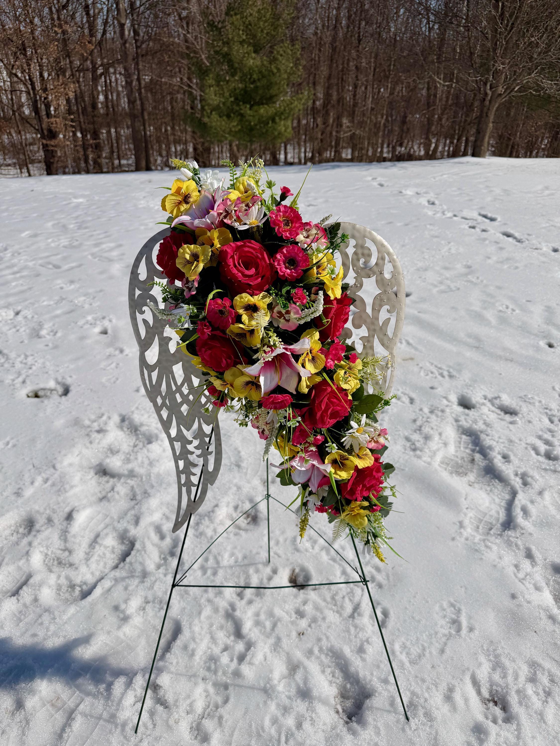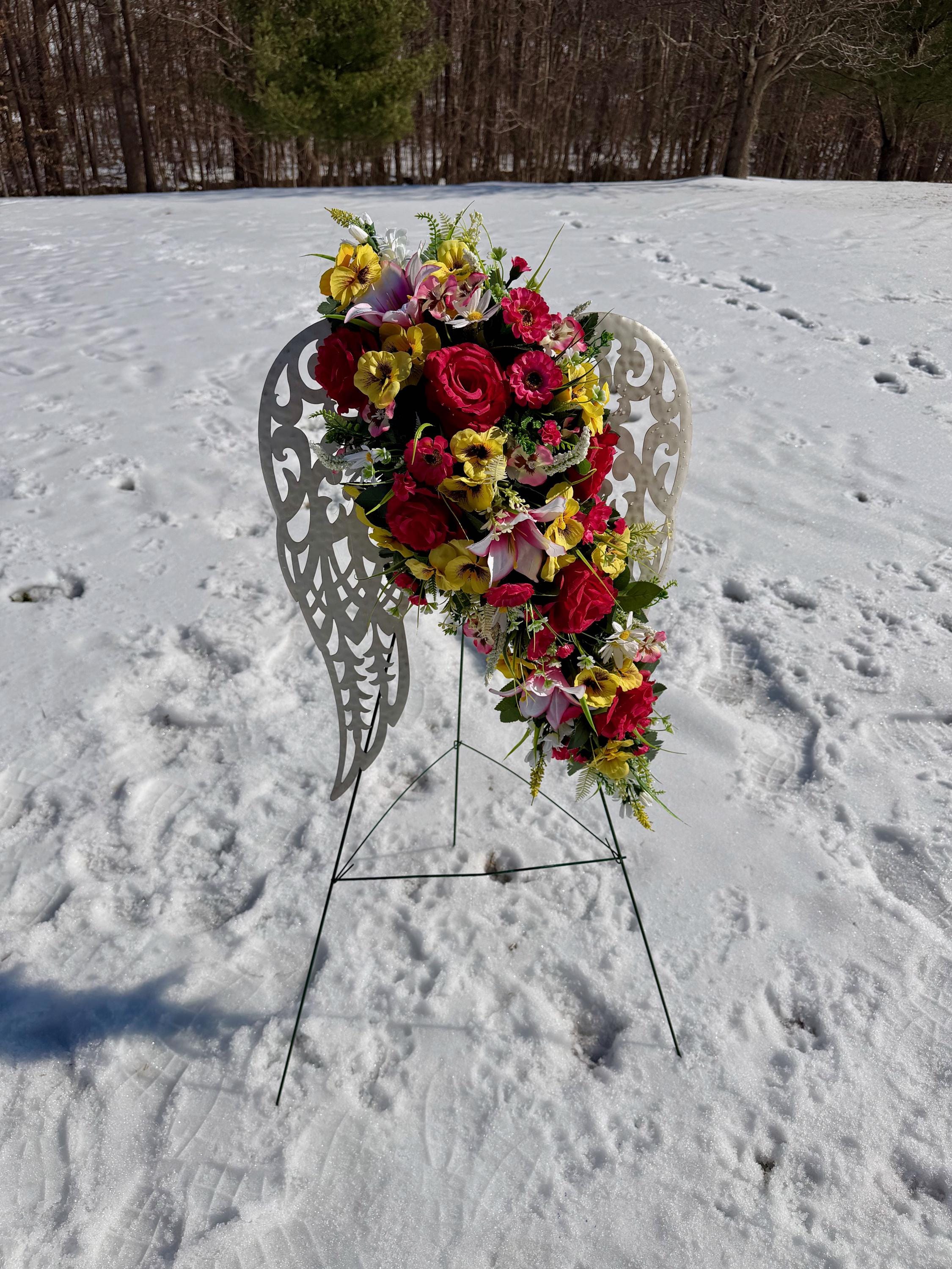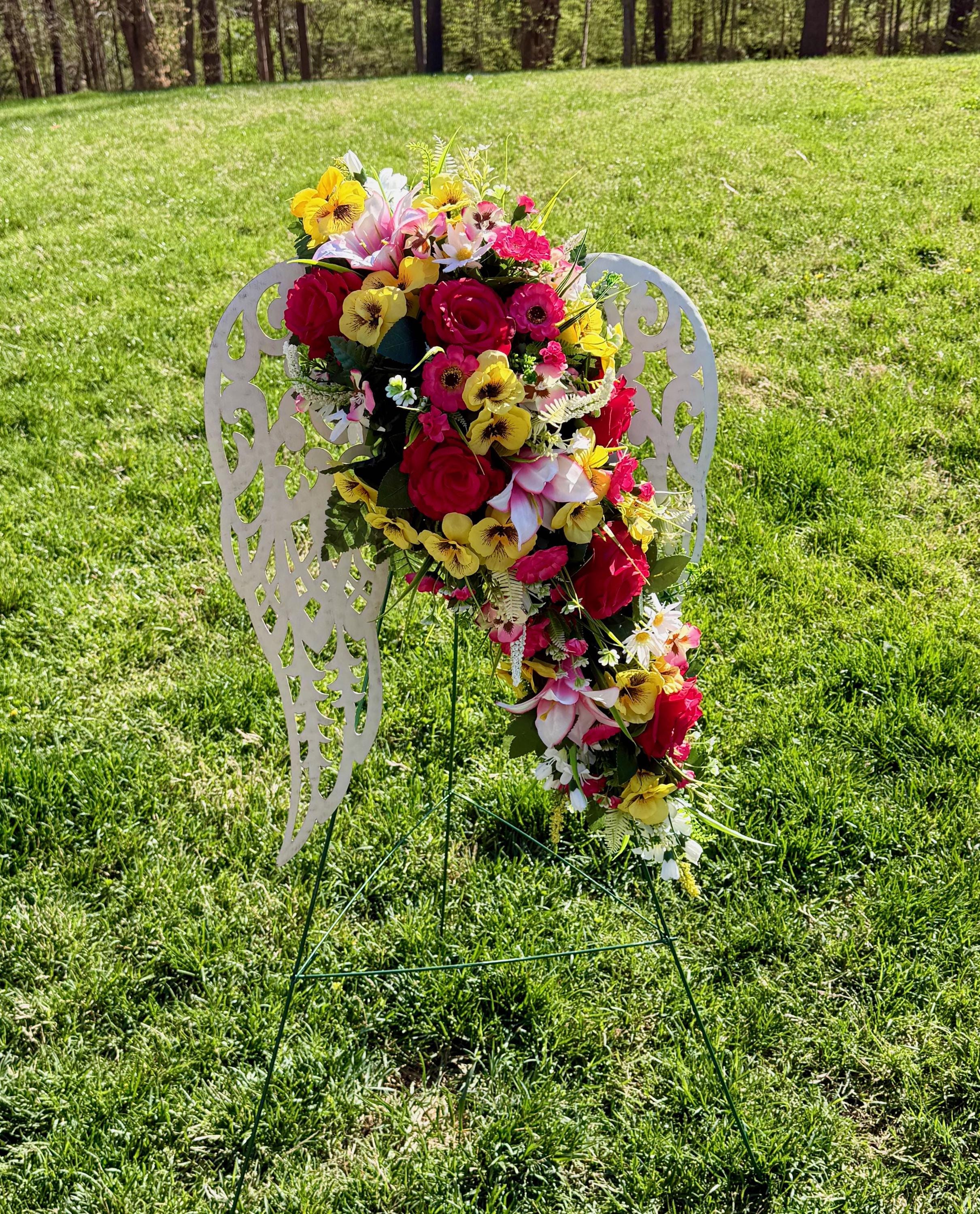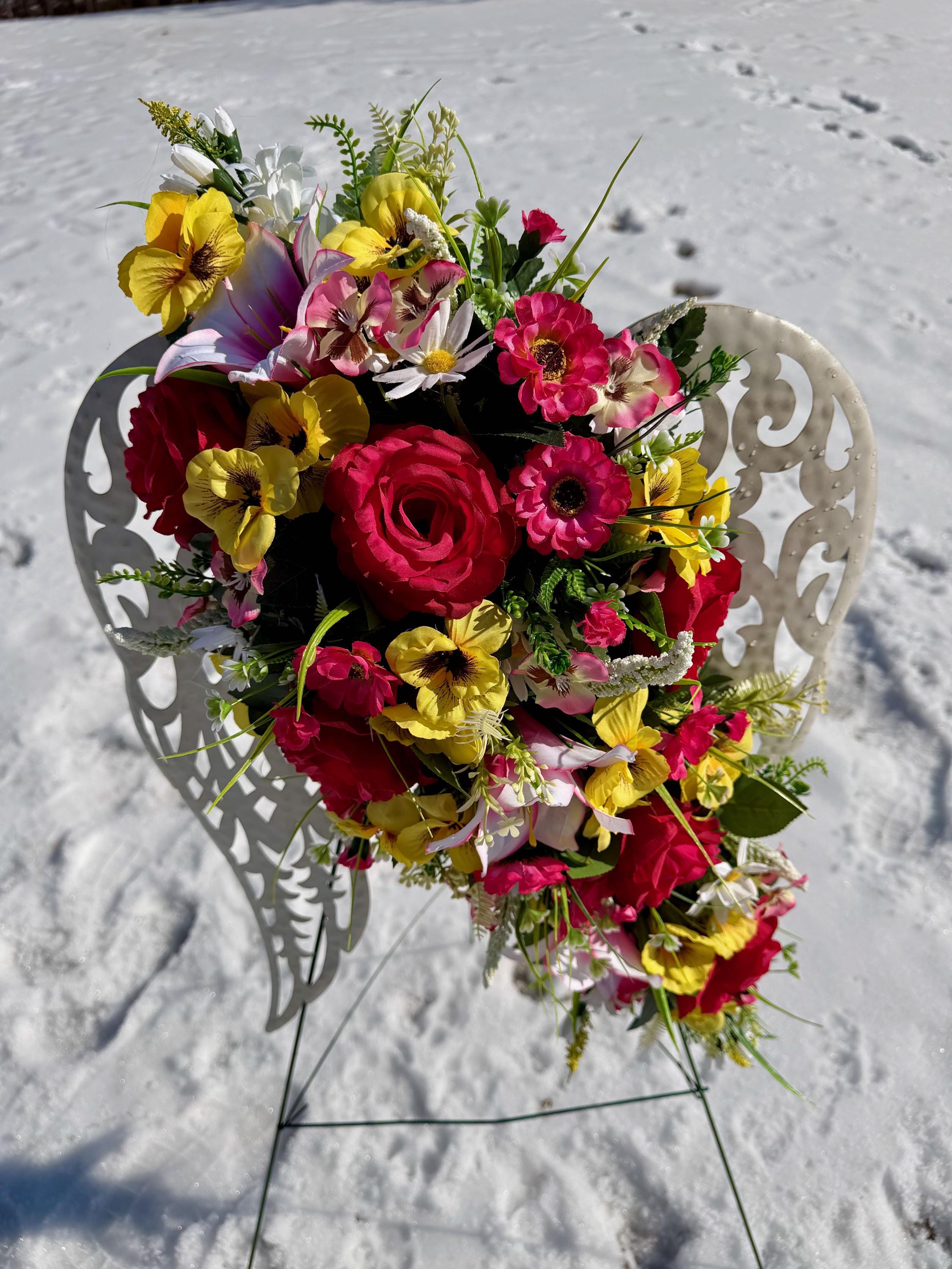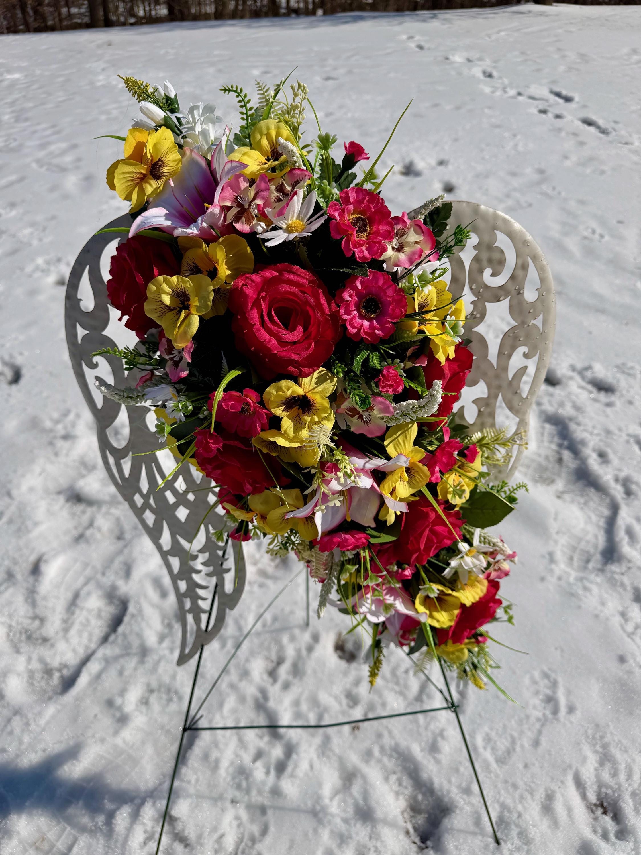 White Angel Wings with Bright Flowers Cemetery Arrangement, Memorial Flowers, Headstone Decorations,