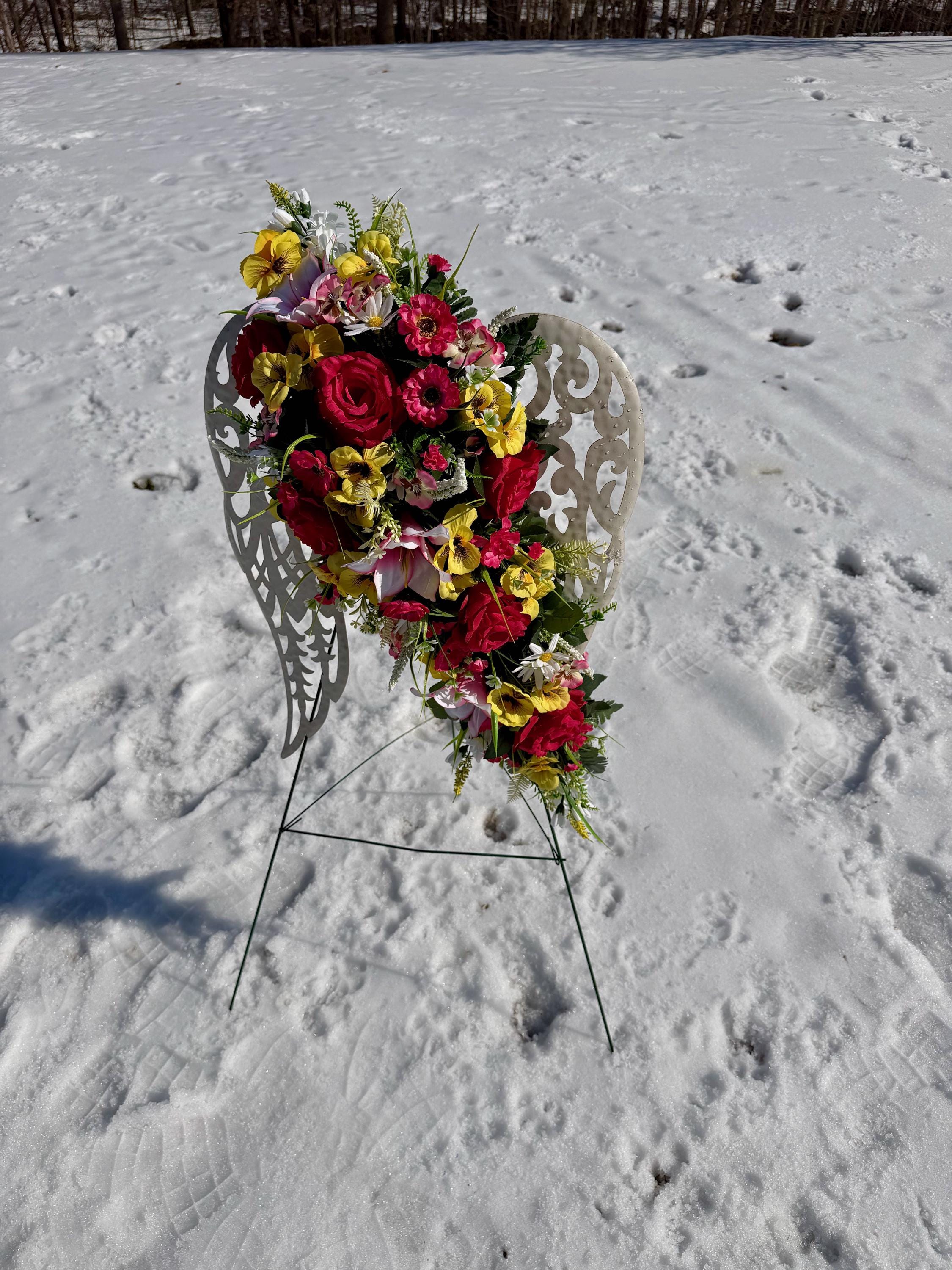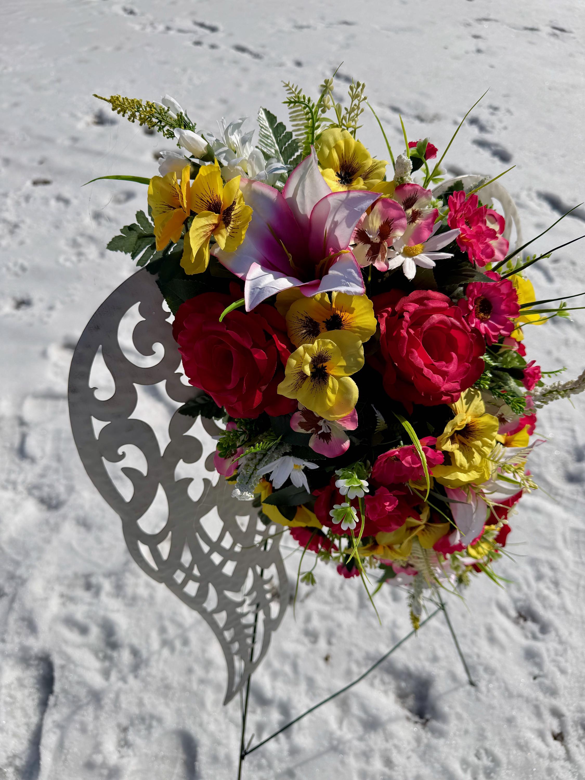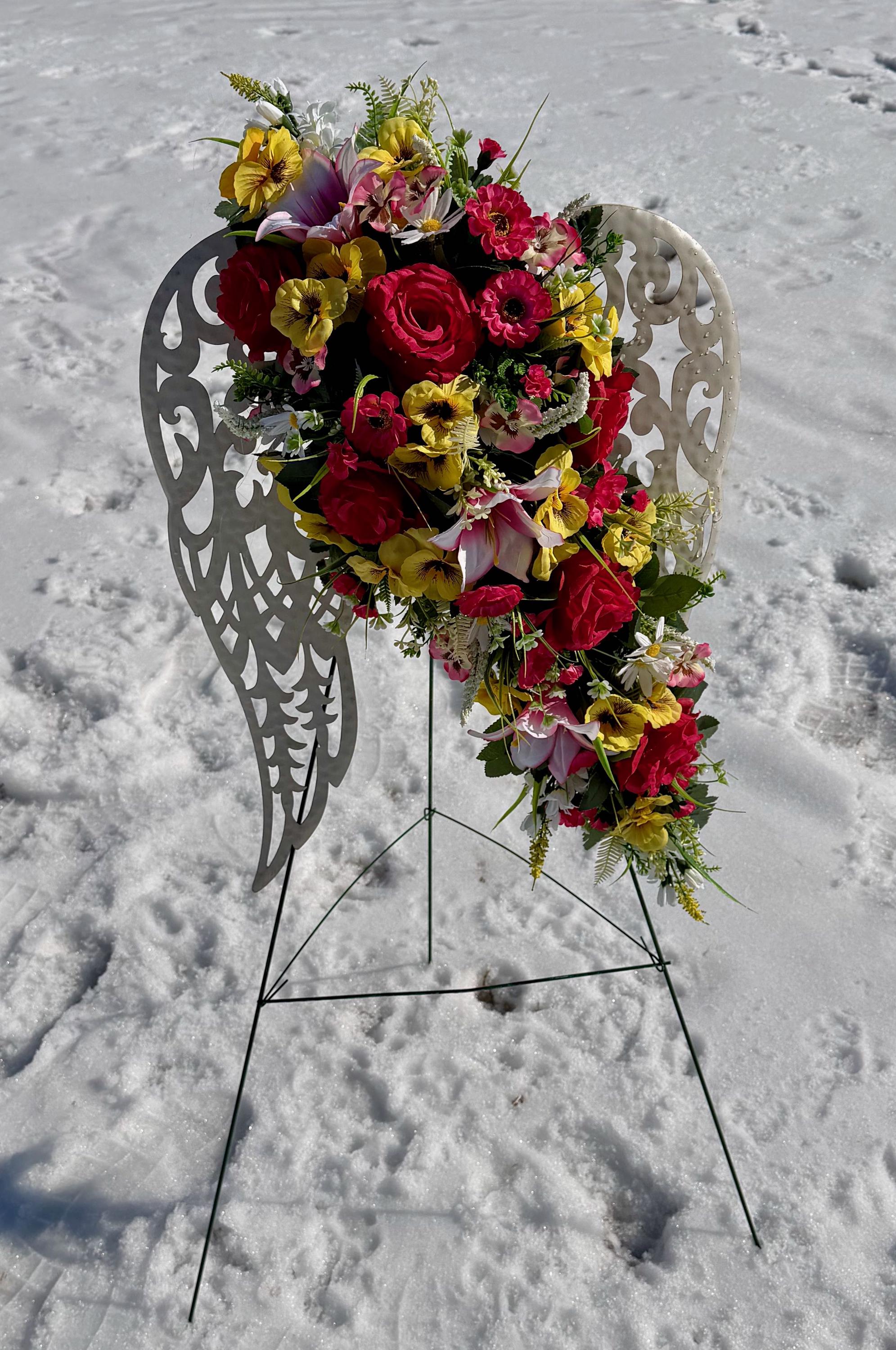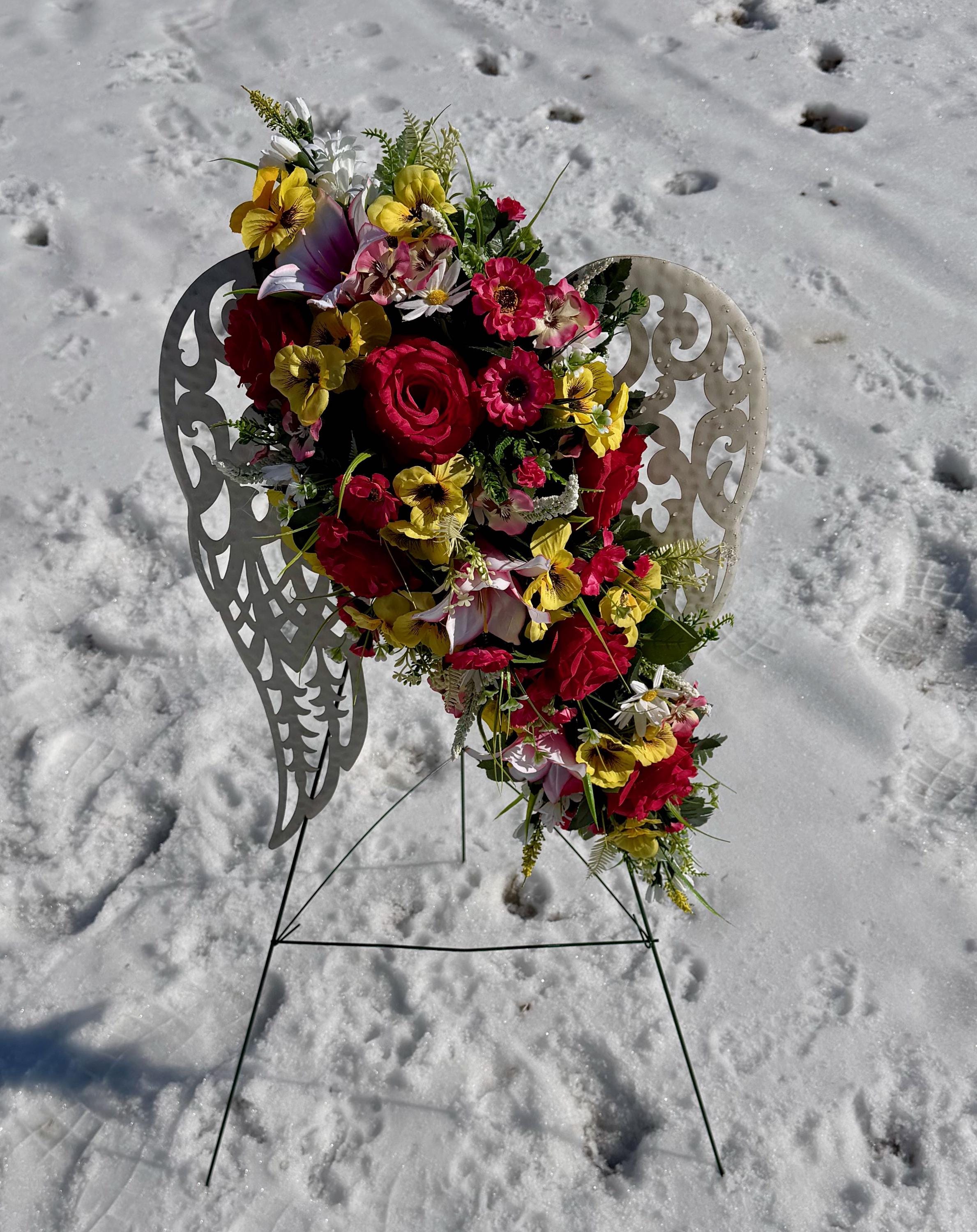 White Angel Wings with Bright Flowers Cemetery Arrangement, Memorial Flowers, Headstone Decorations,