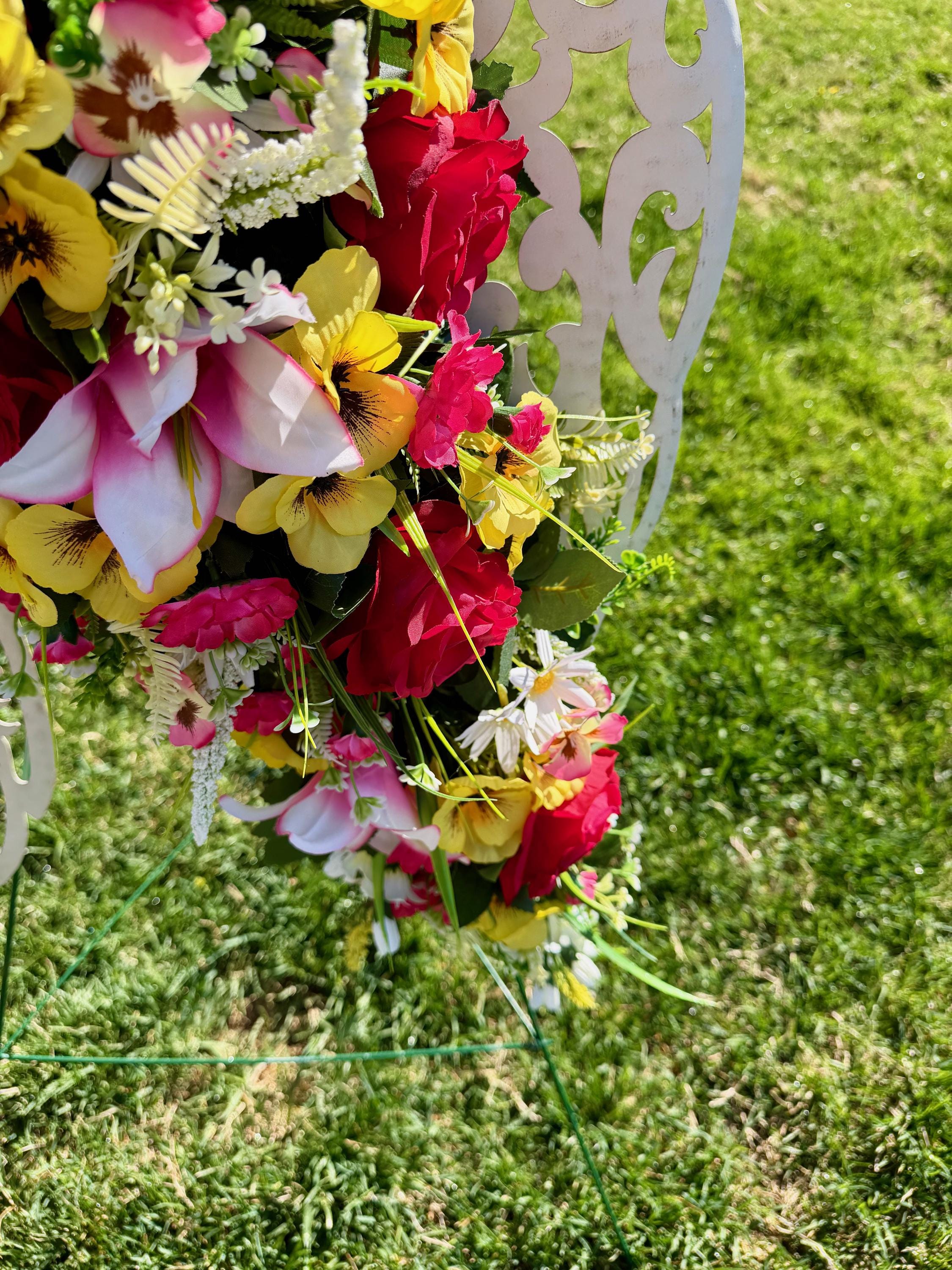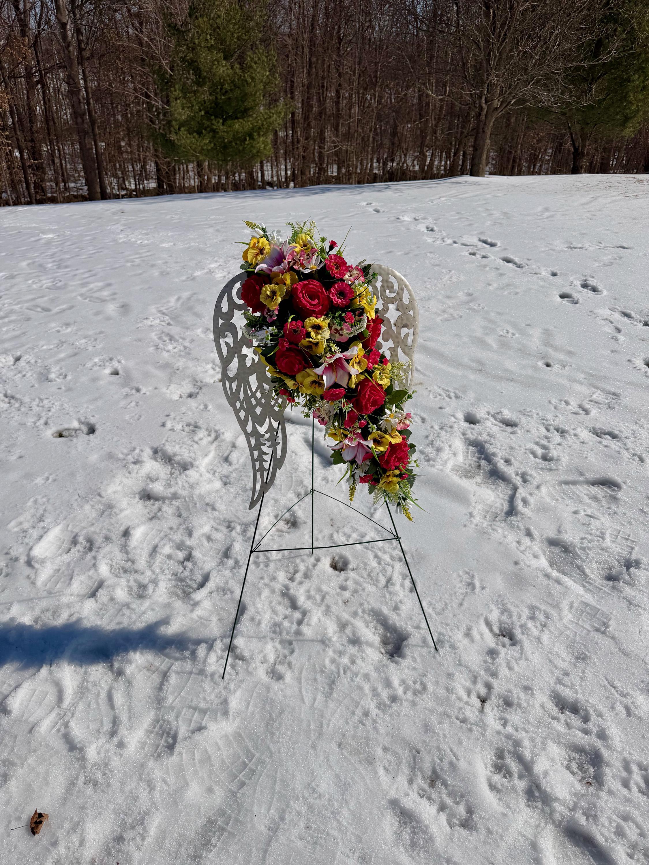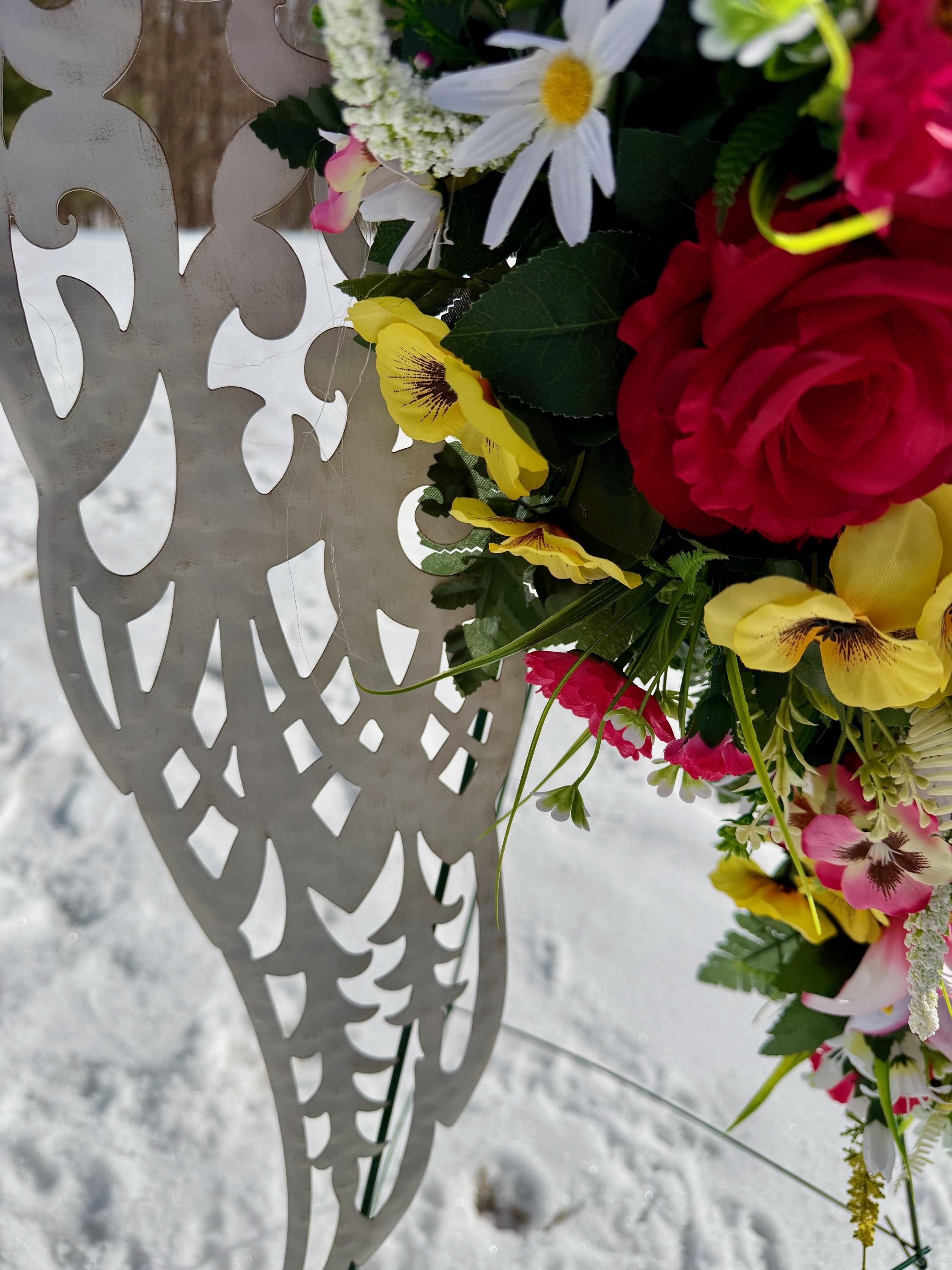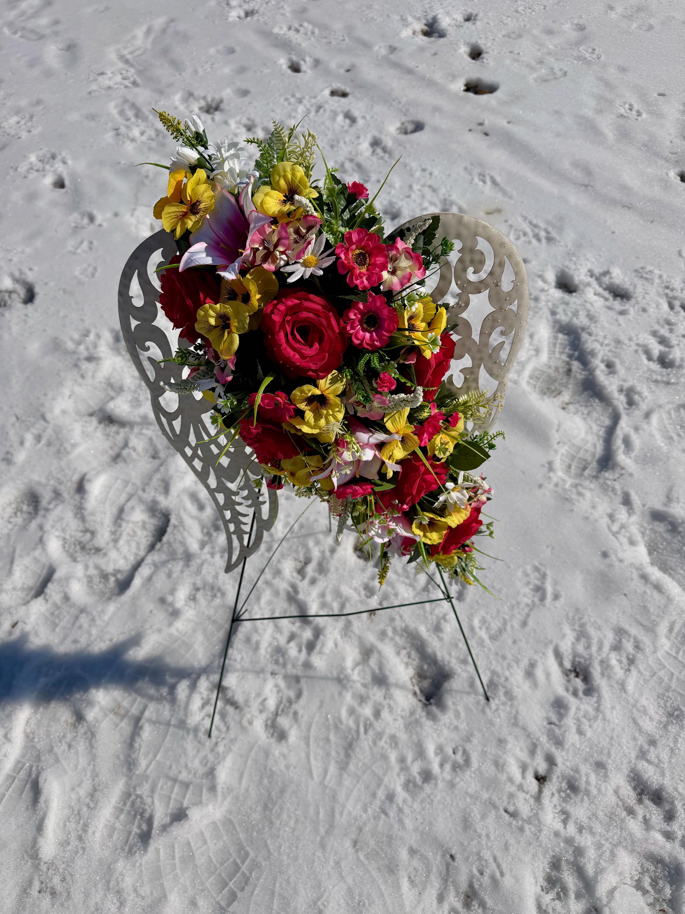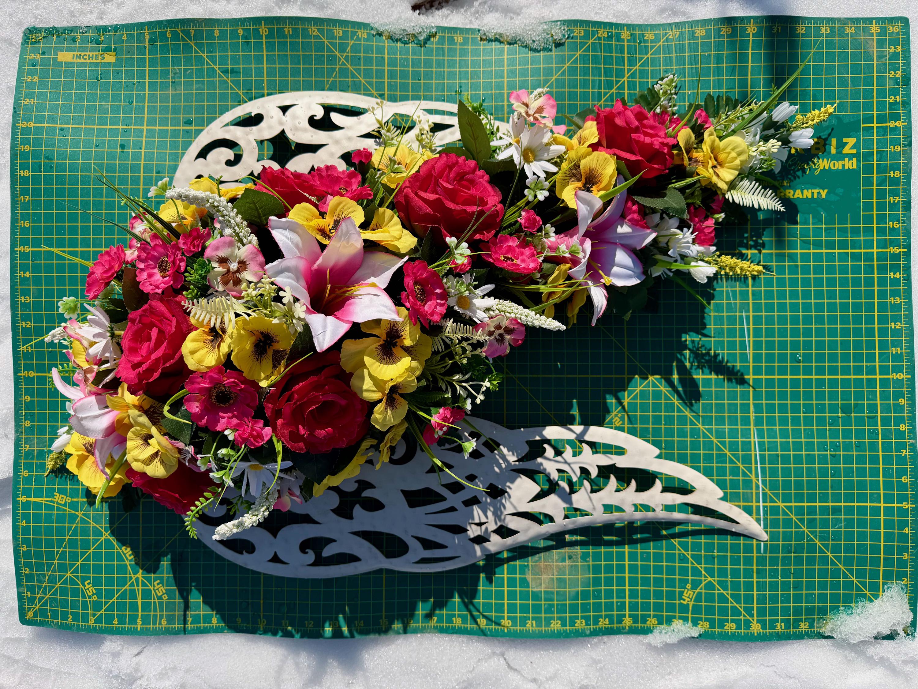 White Angel Wings with Bright Flowers Cemetery Arrangement, Memorial Flowers, Headstone Decorations,
