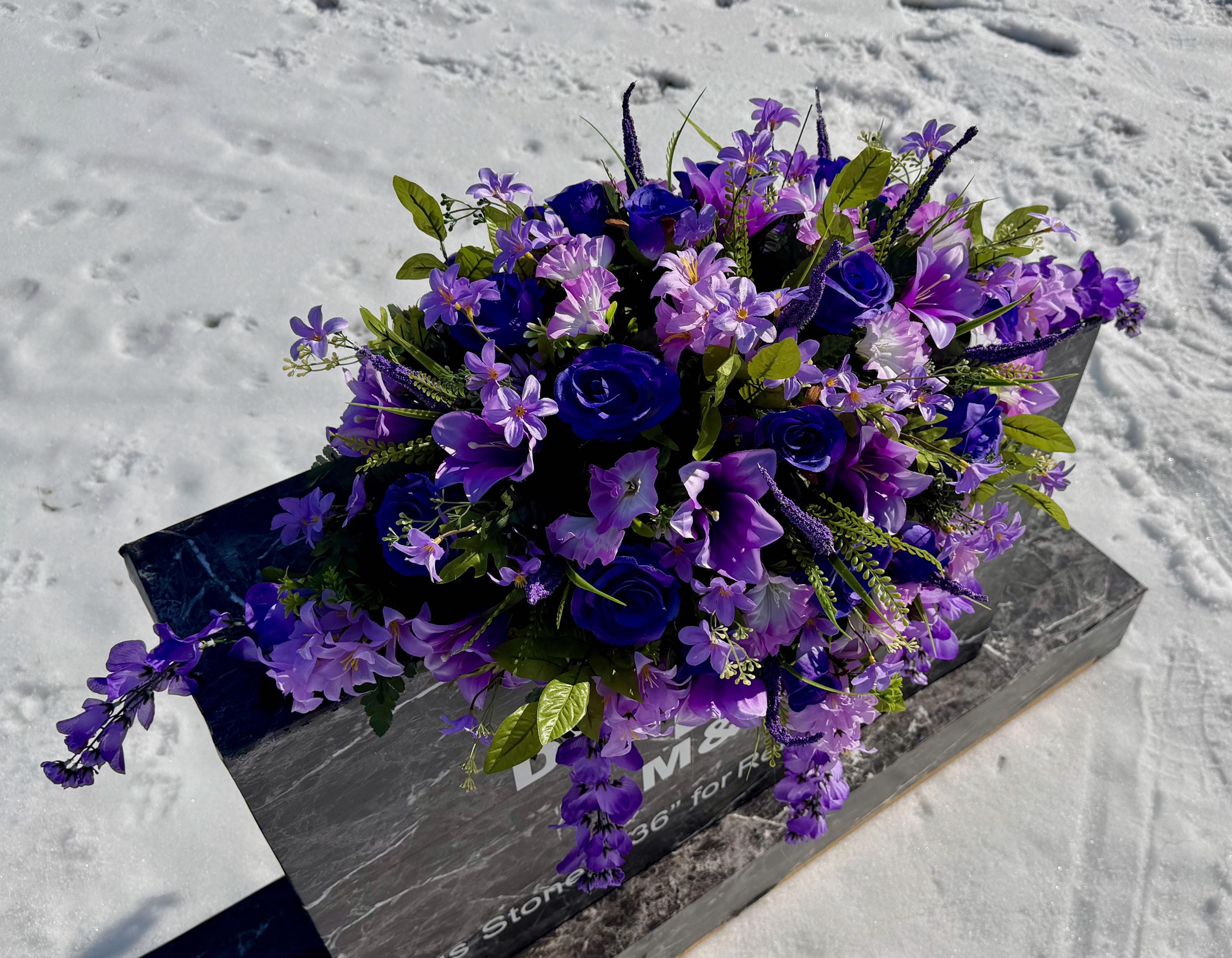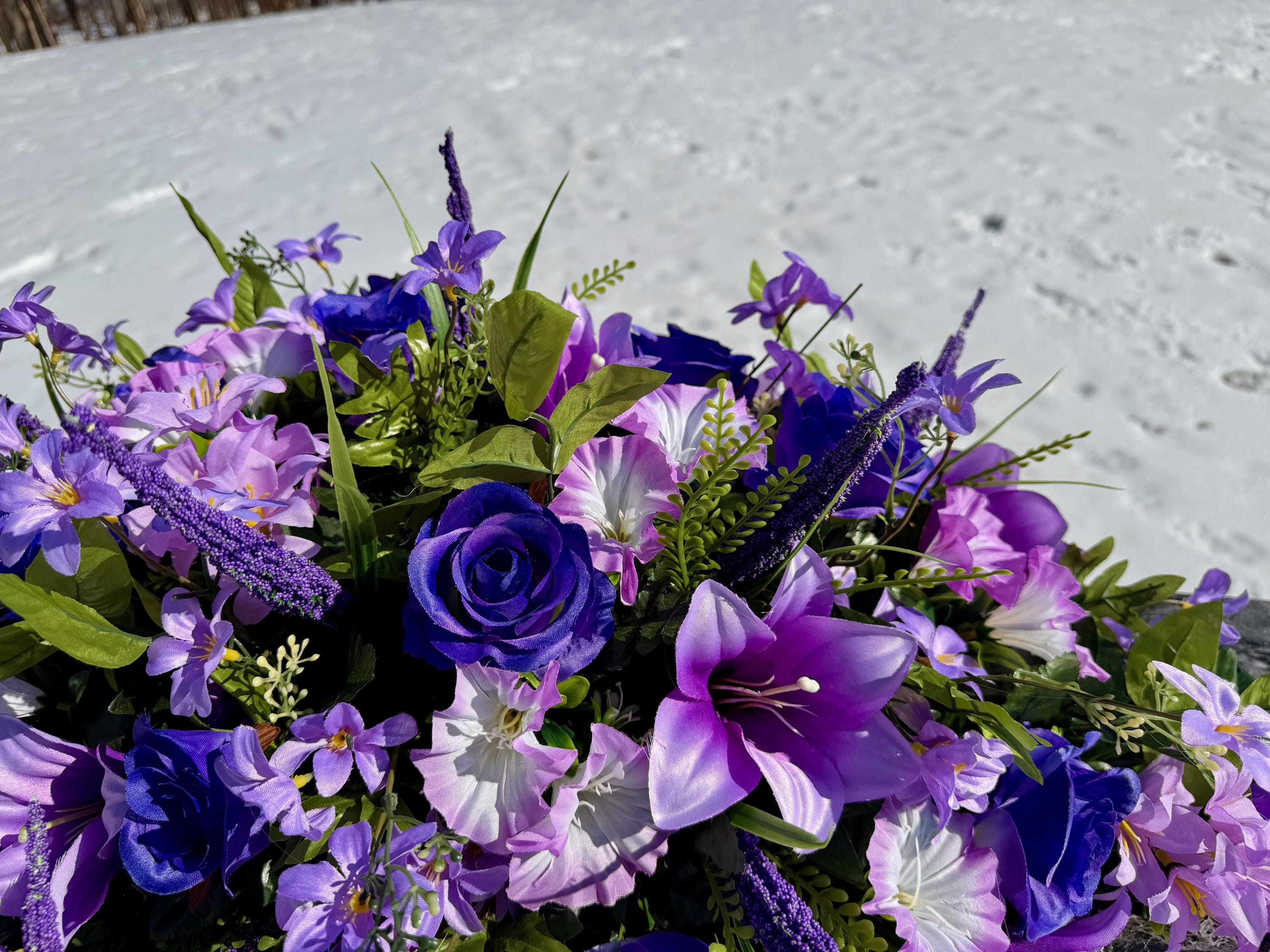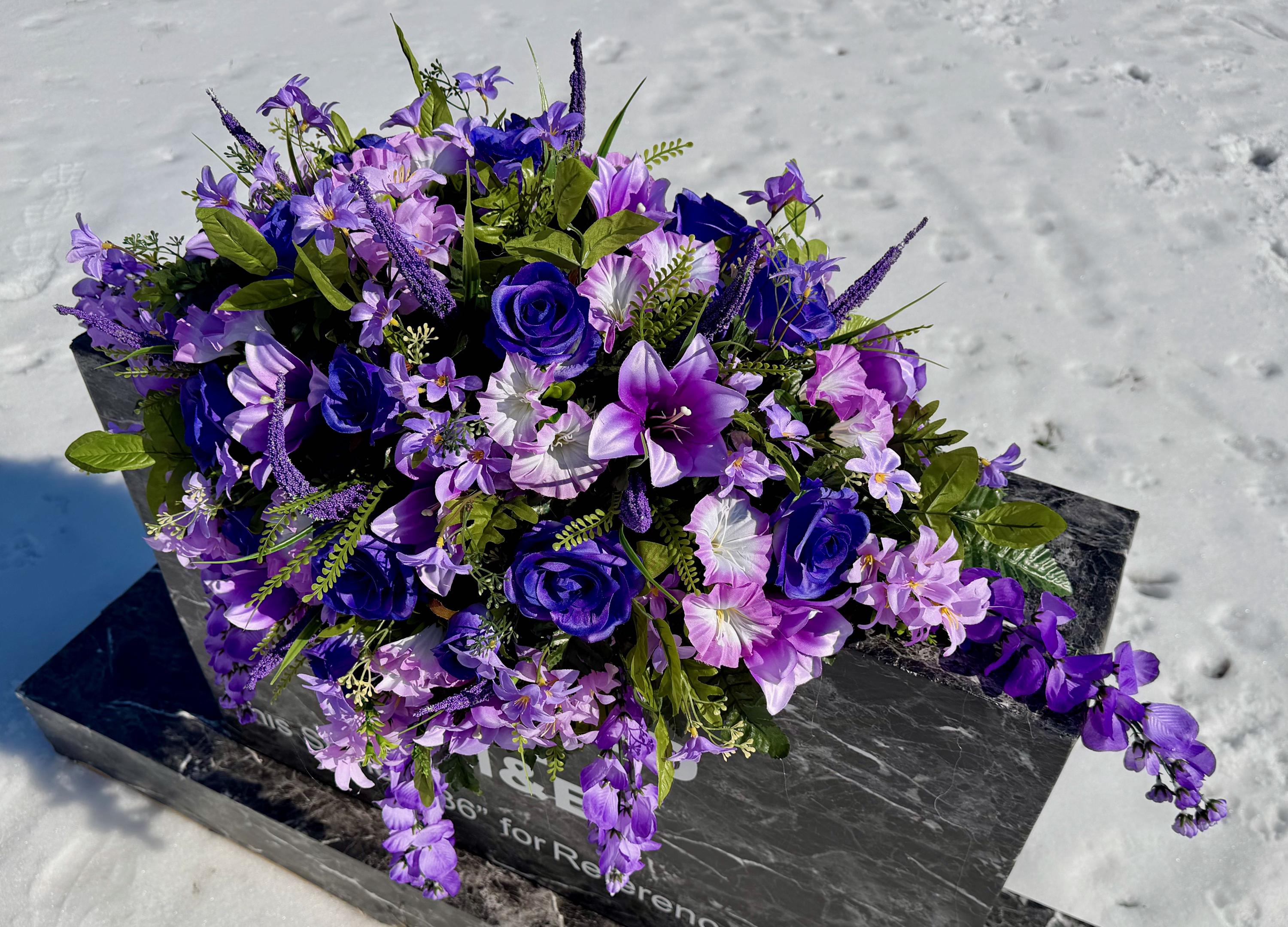 Large Lavender and Purple Quality Silk Flower Cemetery Saddle, Memorial Headstone Arrangement, Grave Flowers