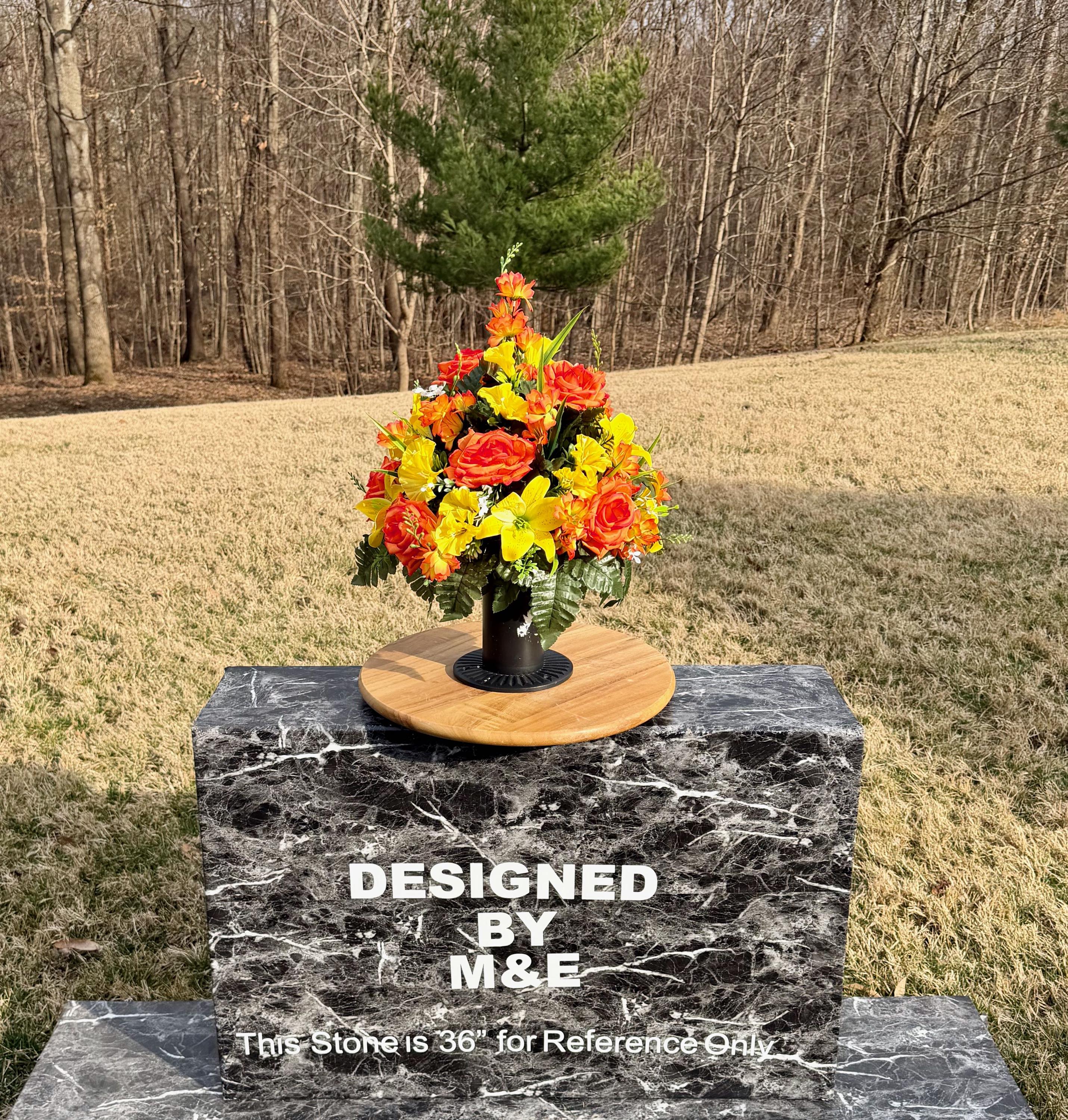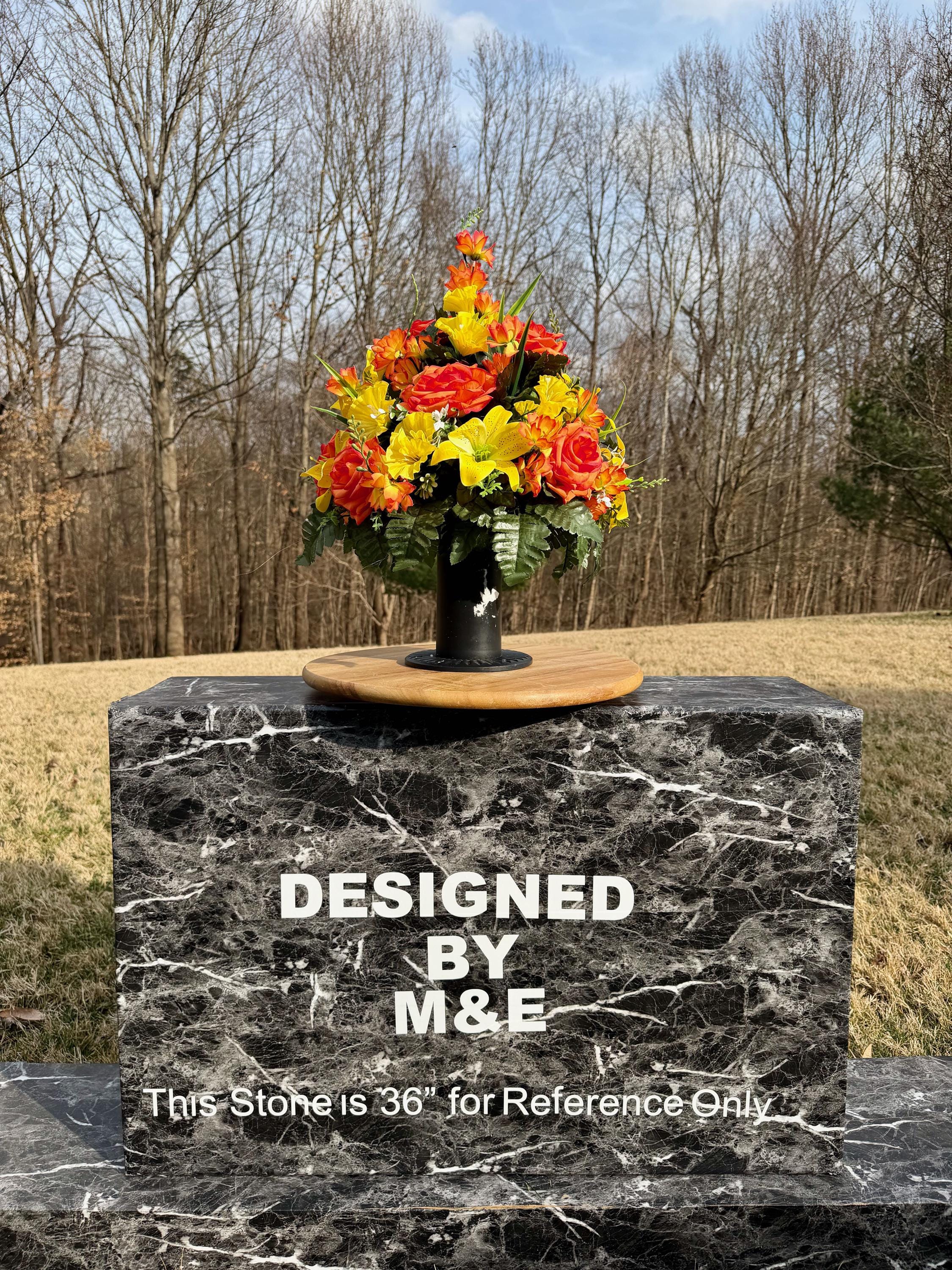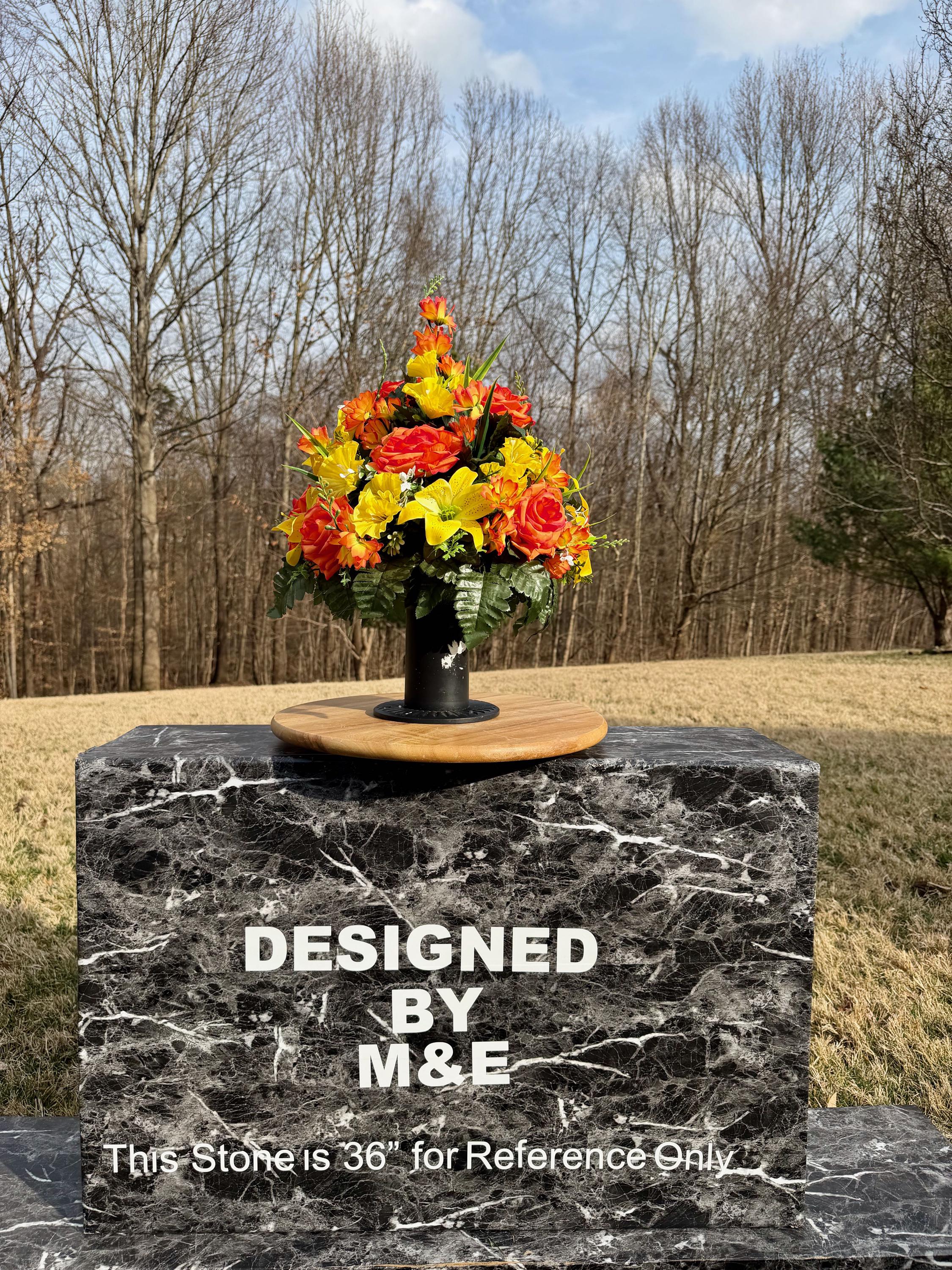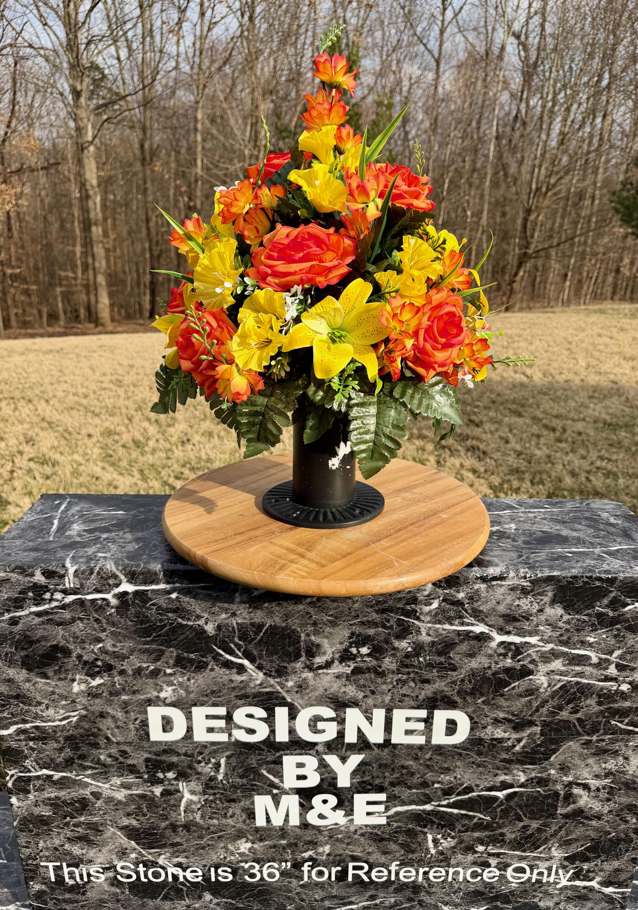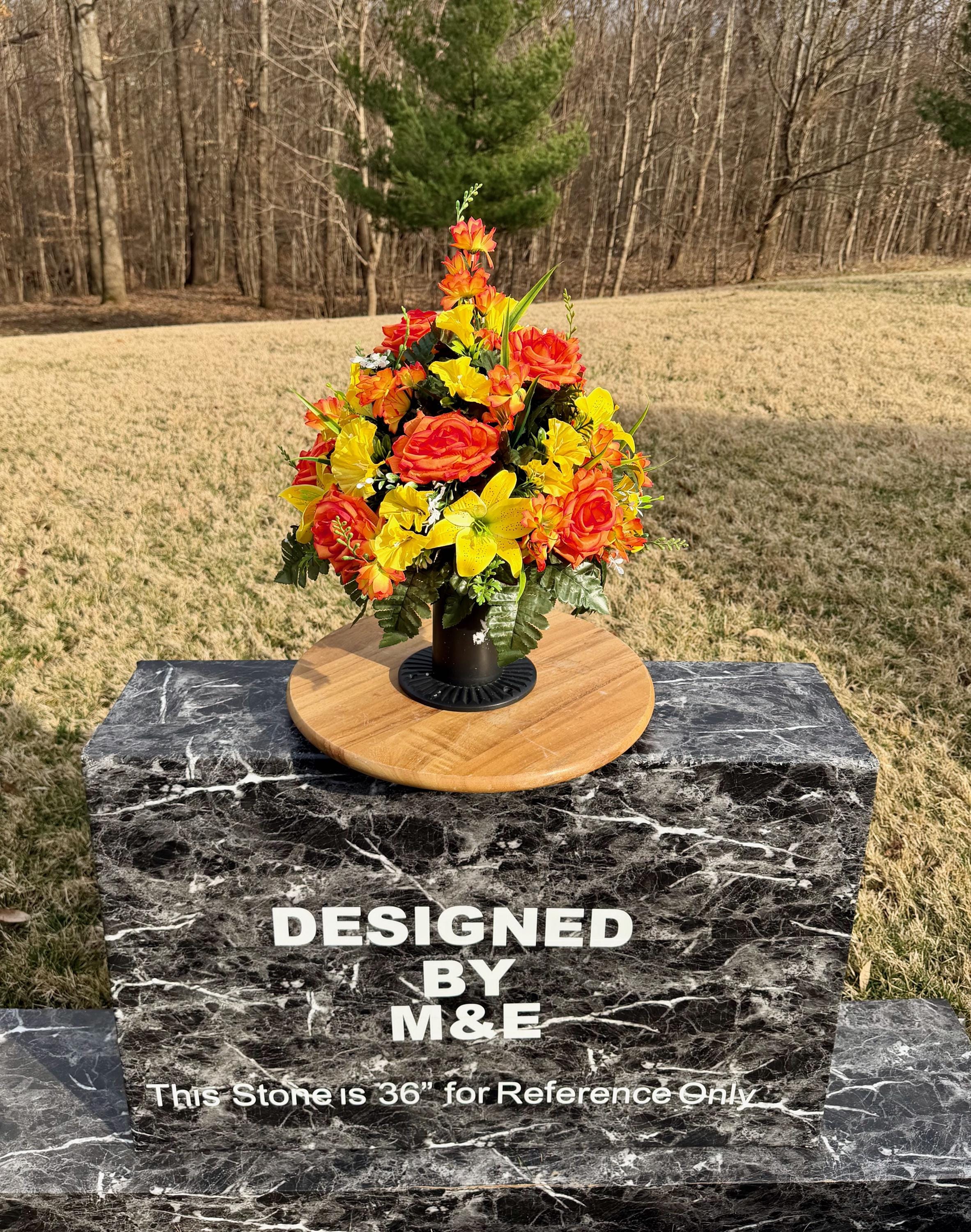 We’re a small, family-operated business consisting of myself, my husband, and my daughter. We personally manage every order and strive for excellent customer service. All our arrangements use high-quality silk flowers, though all silk blooms may fade over time. Each stem is glued into foam to withstand the elements. Designed by M&E uses only premium silks, and we put genuine care into every piece we create. Rest assured, the arrangement shown in our photos is exactly the one you’ll receive, as I design and assemble each one myself. If you’re searching for something unique or have a particular flower, color, or matching vases in mind, please contact me to discuss a custom order.