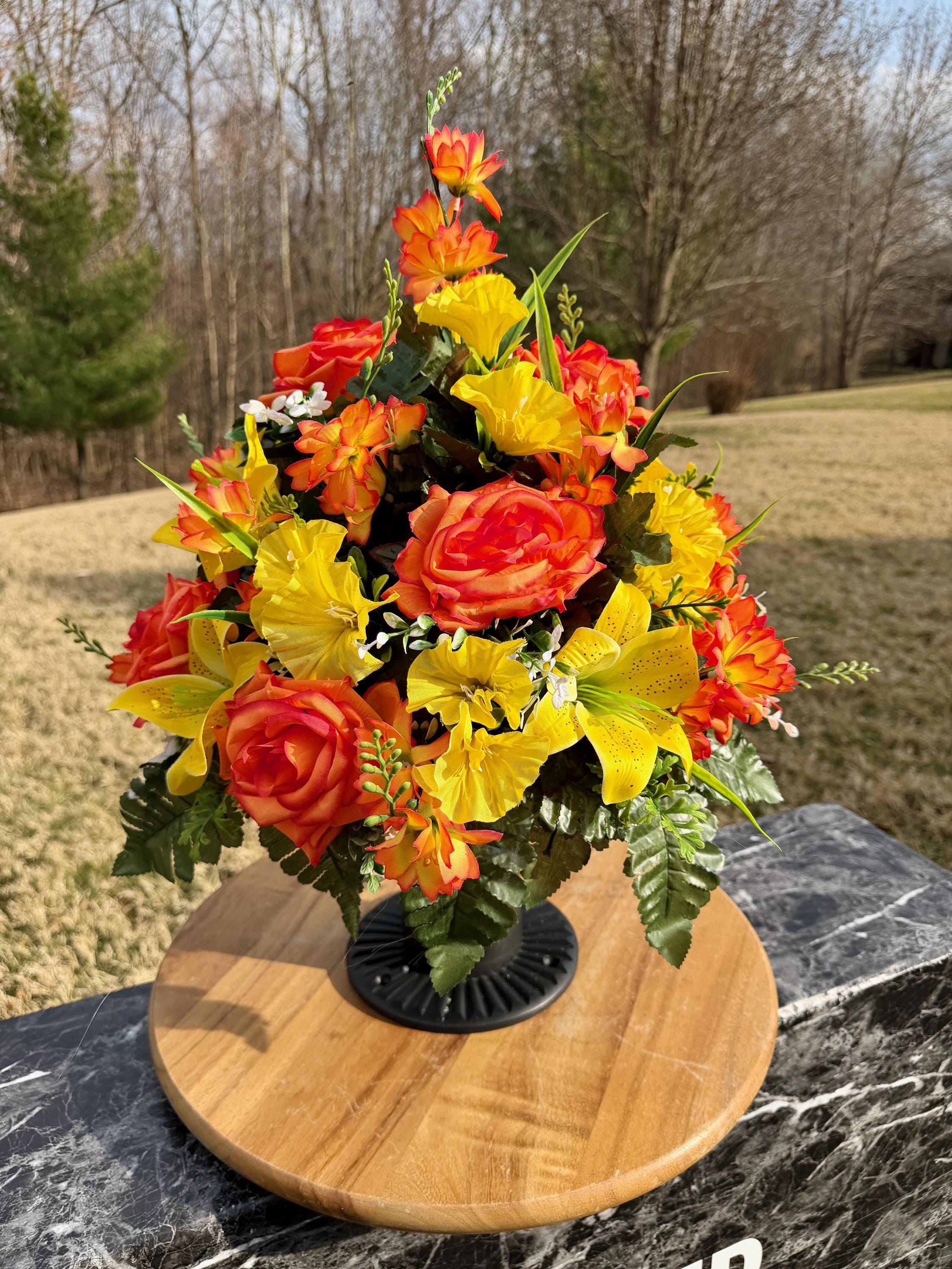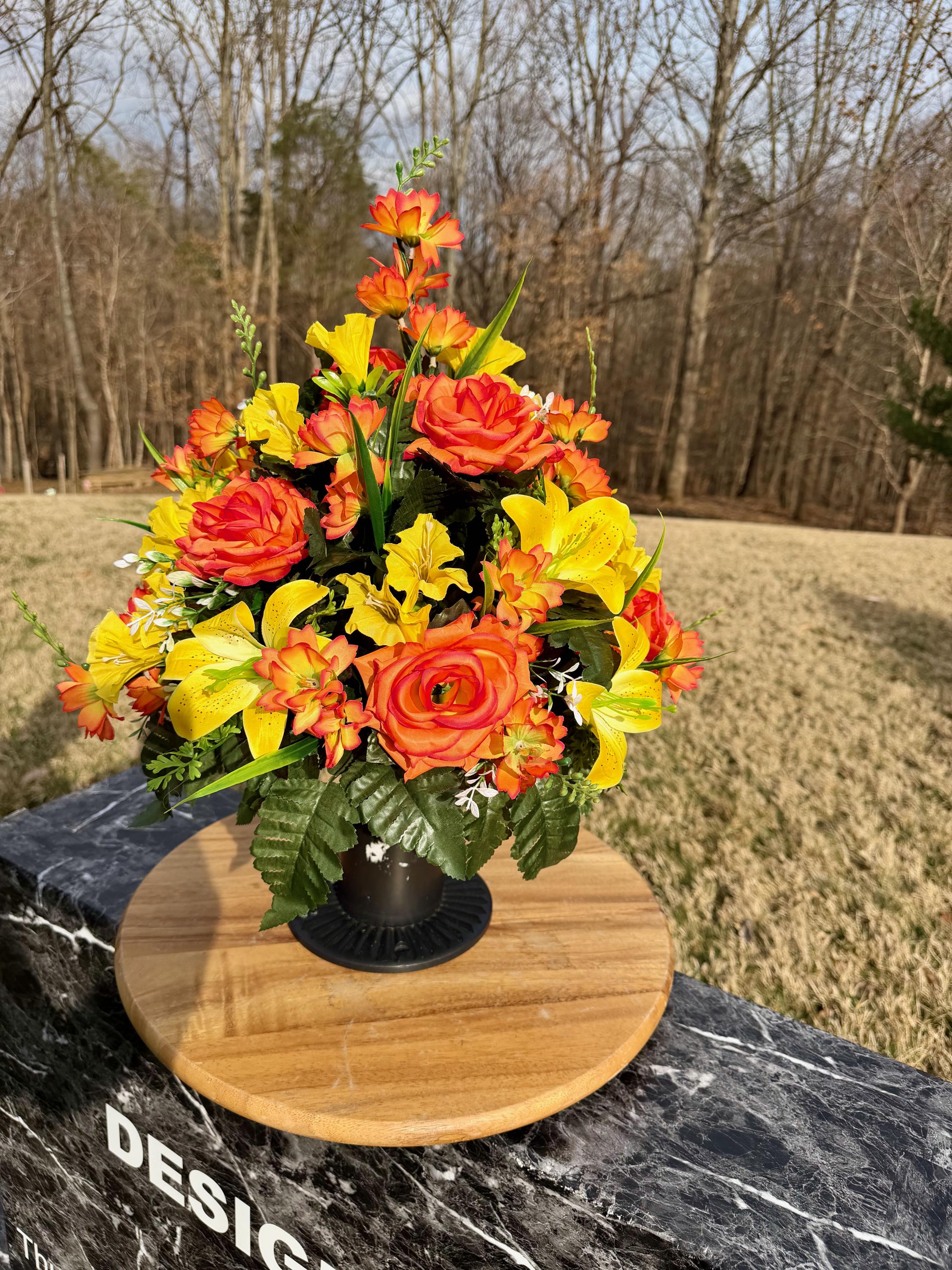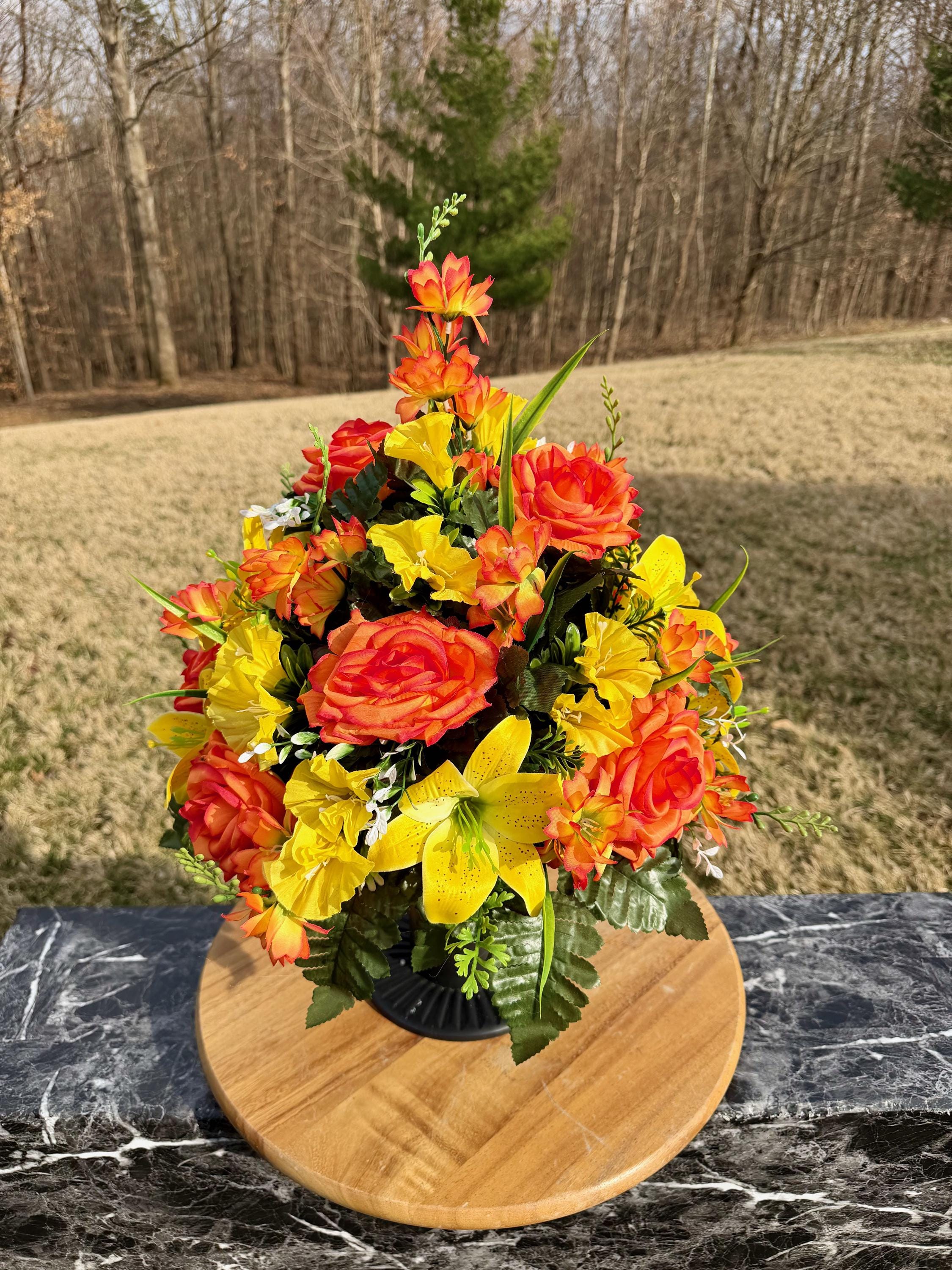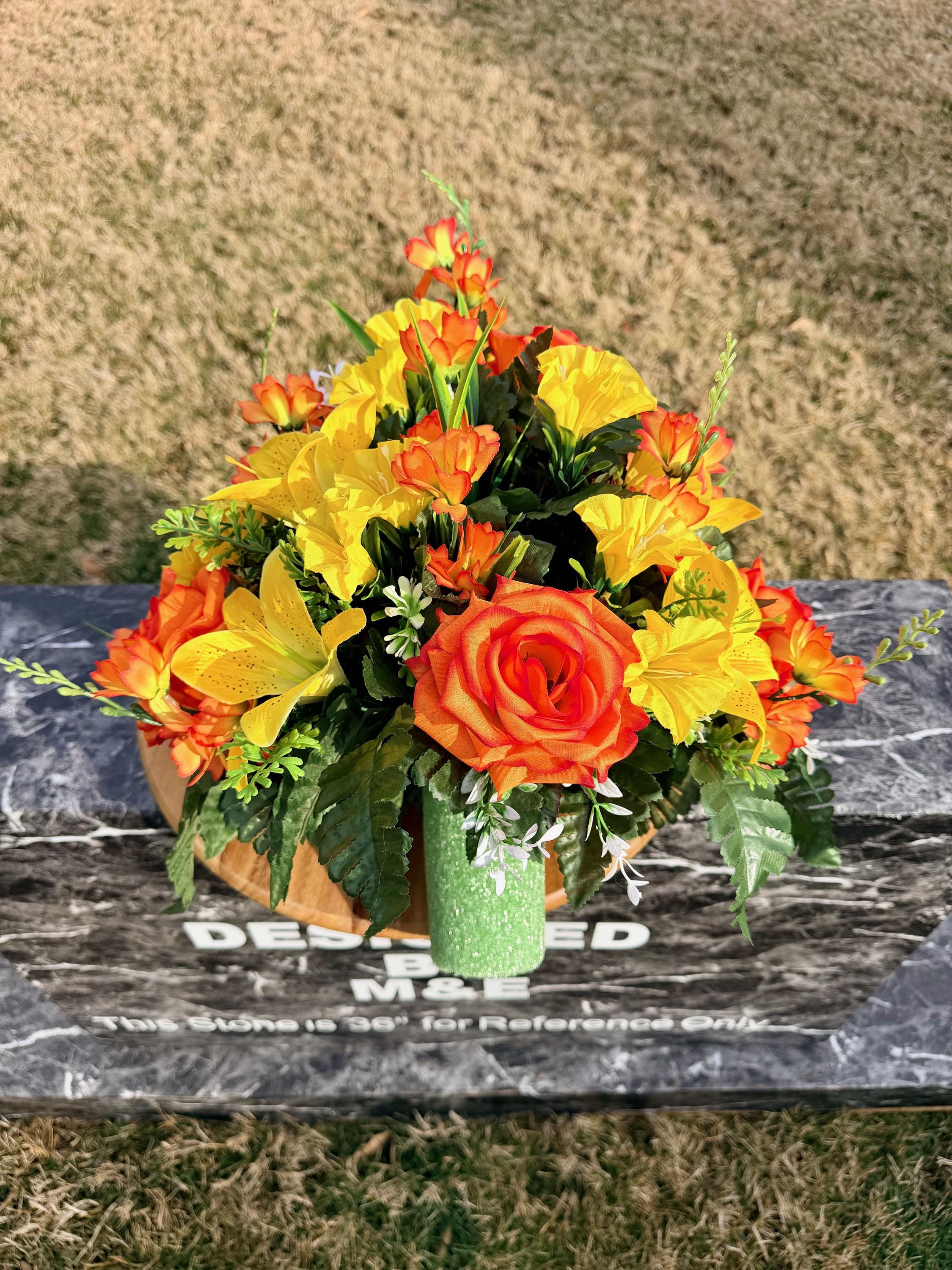 Orange and Yellow Cemetery Vase, Memorial Flowers, Spring Cemetery Arrangement, Sympathy Flowers