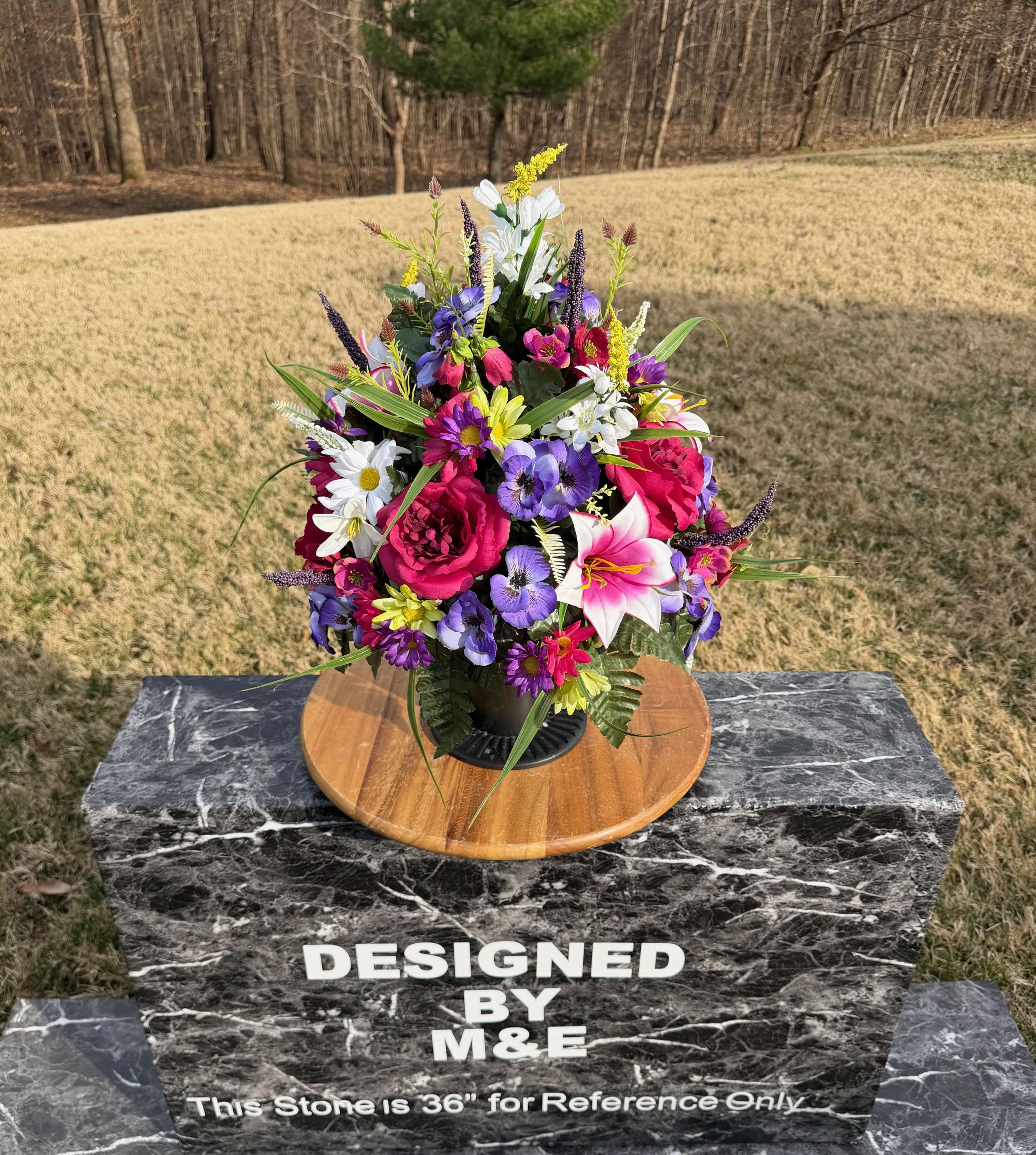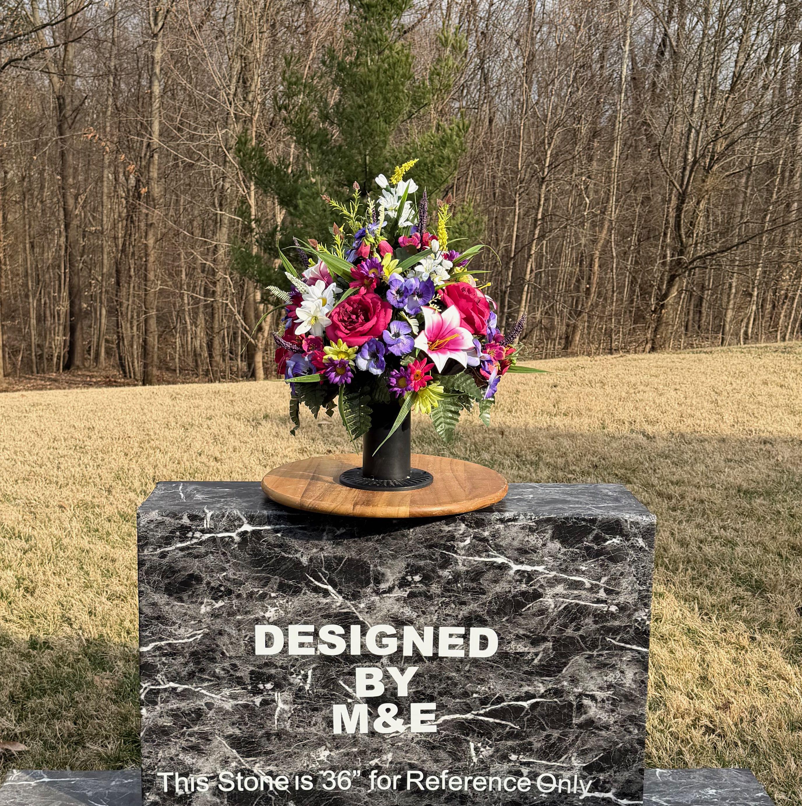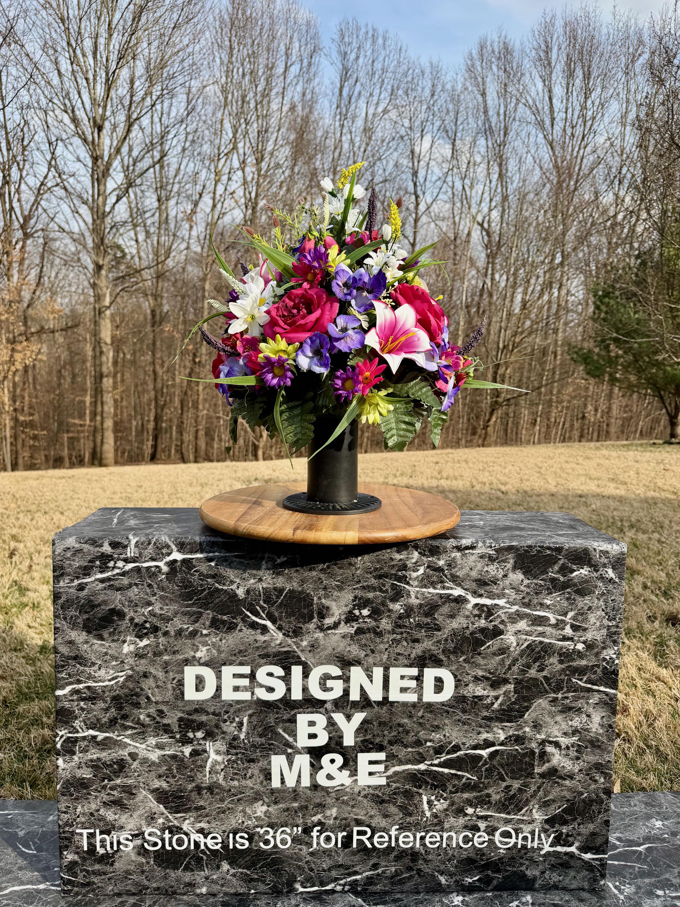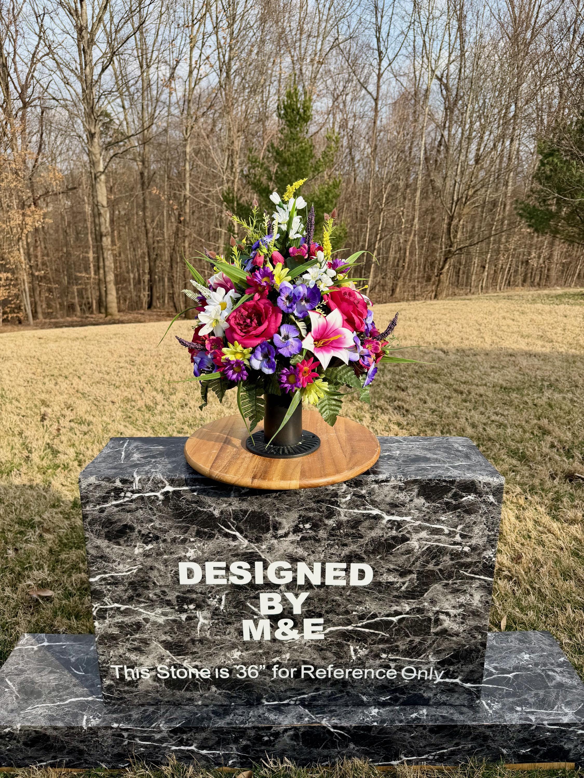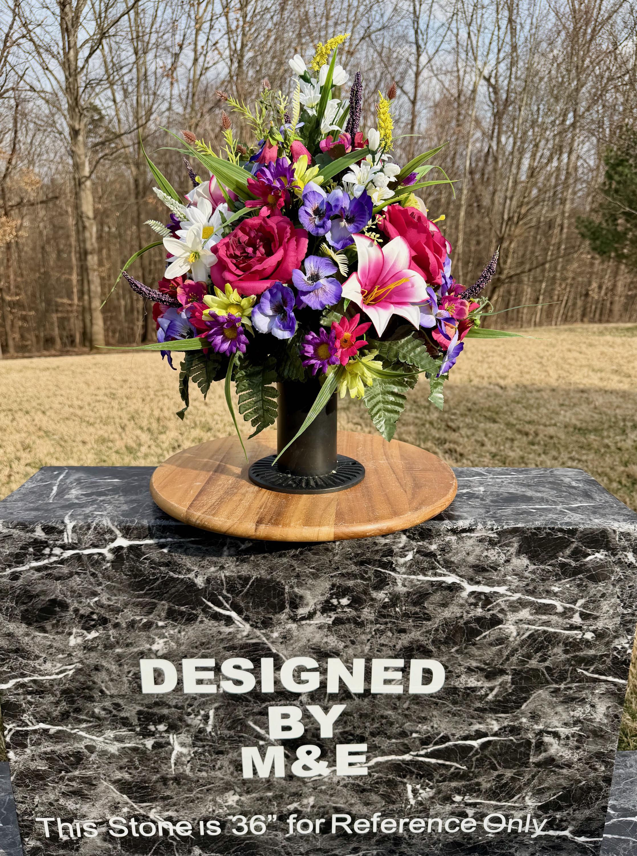 We’re a small, family-operated business consisting of myself, my husband, and my daughter. We personally manage every order and strive for excellent customer service. All our arrangements use high-quality silk flowers, though all silk blooms may fade over time. Each stem is glued into foam to withstand the elements. Designed by M&E uses only premium silks, and we put genuine care into every piece we create. Rest assured, the arrangement shown in our photos is exactly the one you’ll receive, as I design and assemble each one myself. If you’re searching for something unique or have a particular flower, color, or matching vases in mind, please contact me to discuss a custom order.