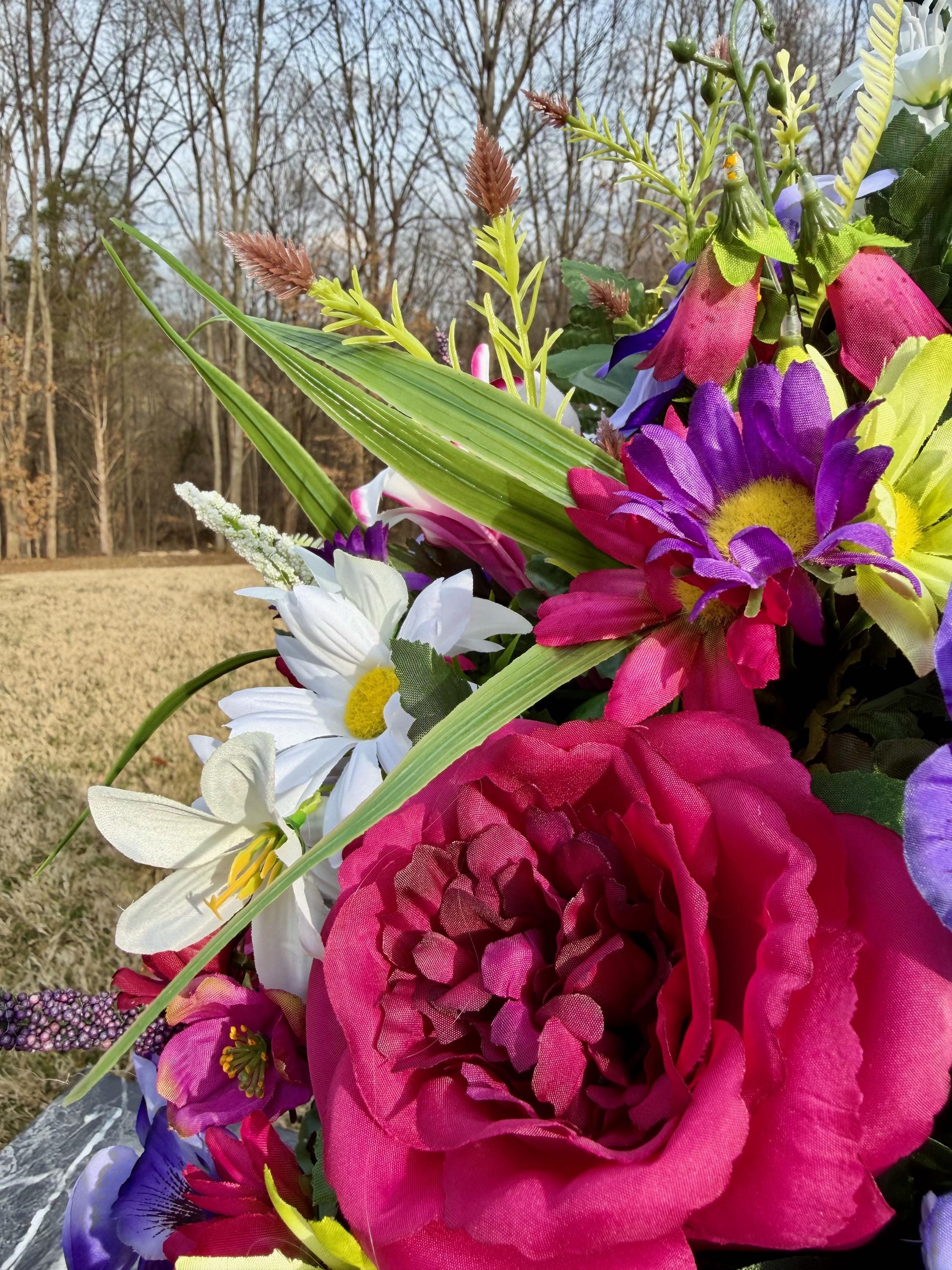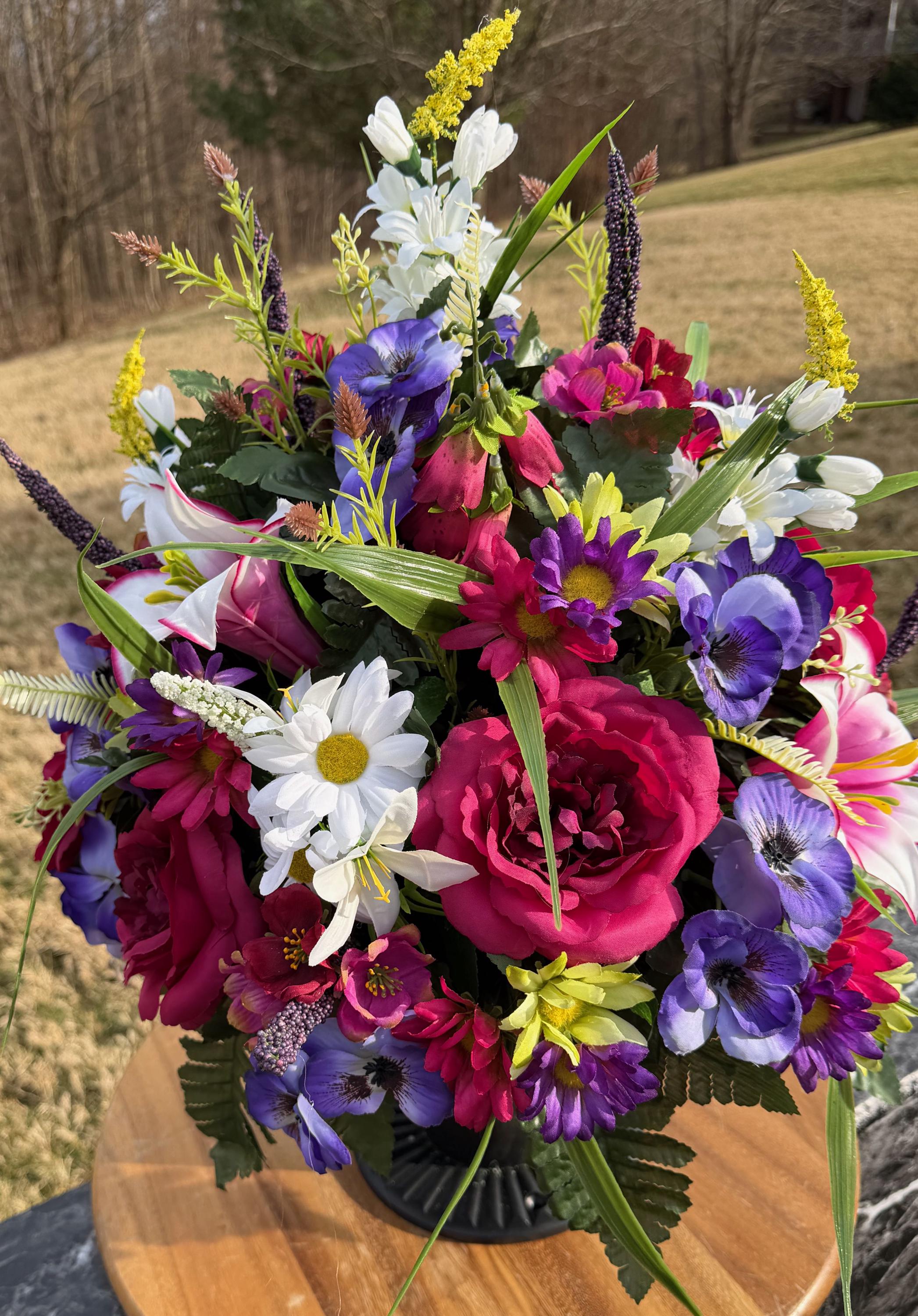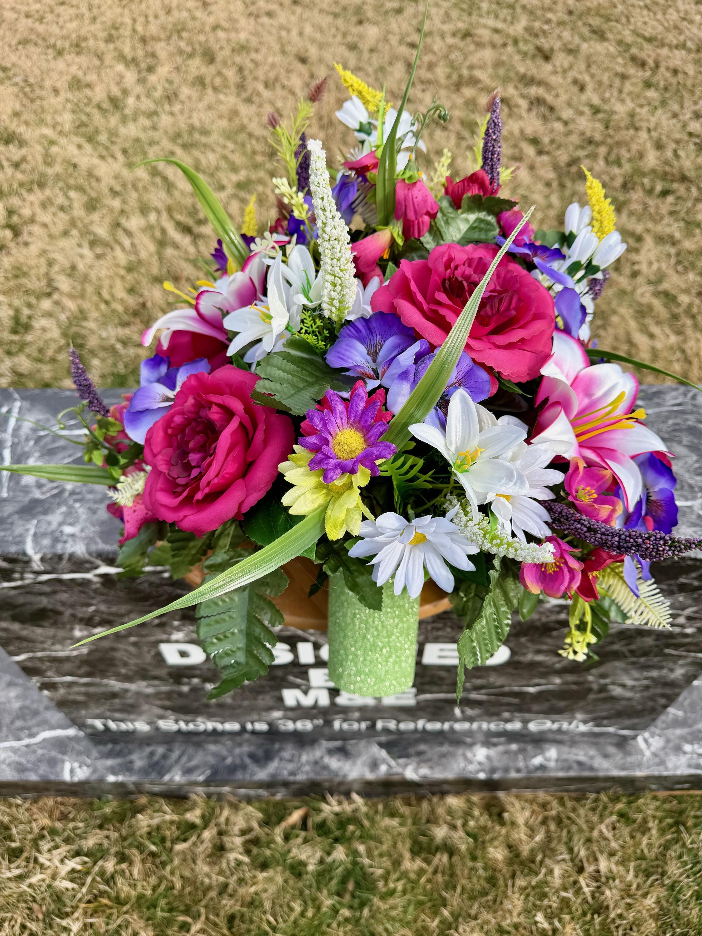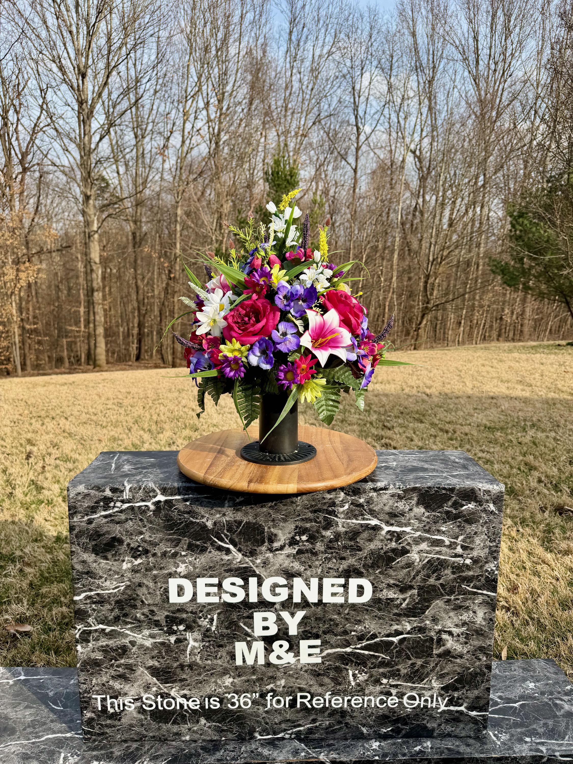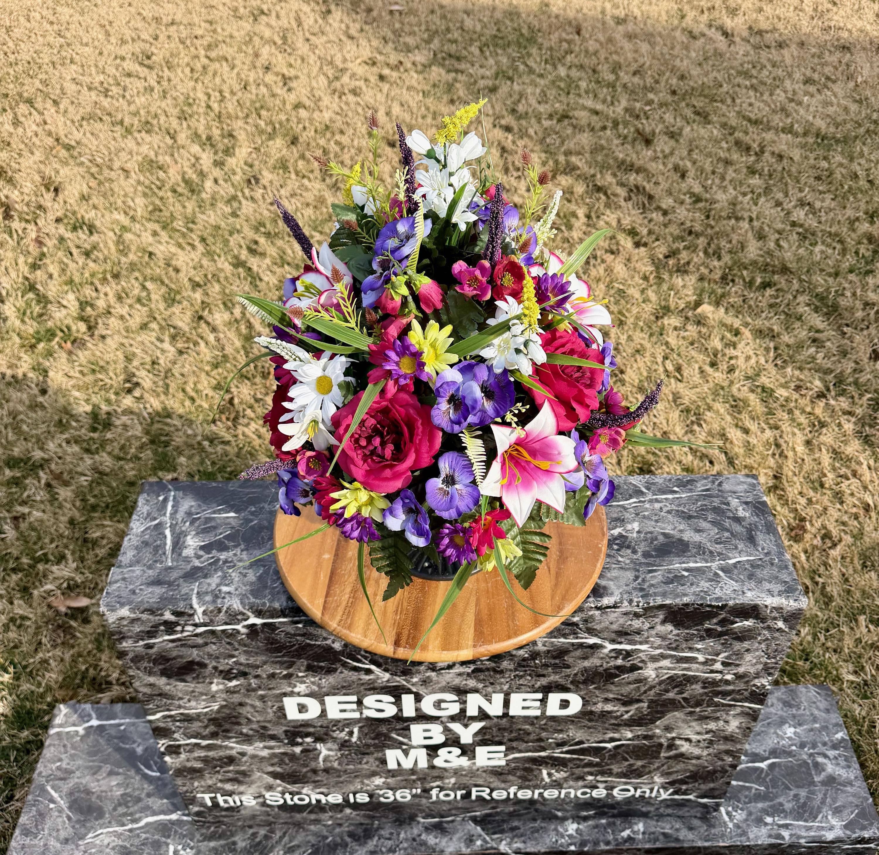 We’re a small, family-operated business consisting of myself, my husband, and my daughter. We personally manage every order and strive for excellent customer service. All our arrangements use high-quality silk flowers, though all silk blooms may fade over time. Each stem is glued into foam to withstand the elements. Designed by M&E uses only premium silks, and we put genuine care into every piece we create. Rest assured, the arrangement shown in our photos is exactly the one you’ll receive, as I design and assemble each one myself. If you’re searching for something unique or have a particular flower, color, or matching vases in mind, please contact me to discuss a custom order.