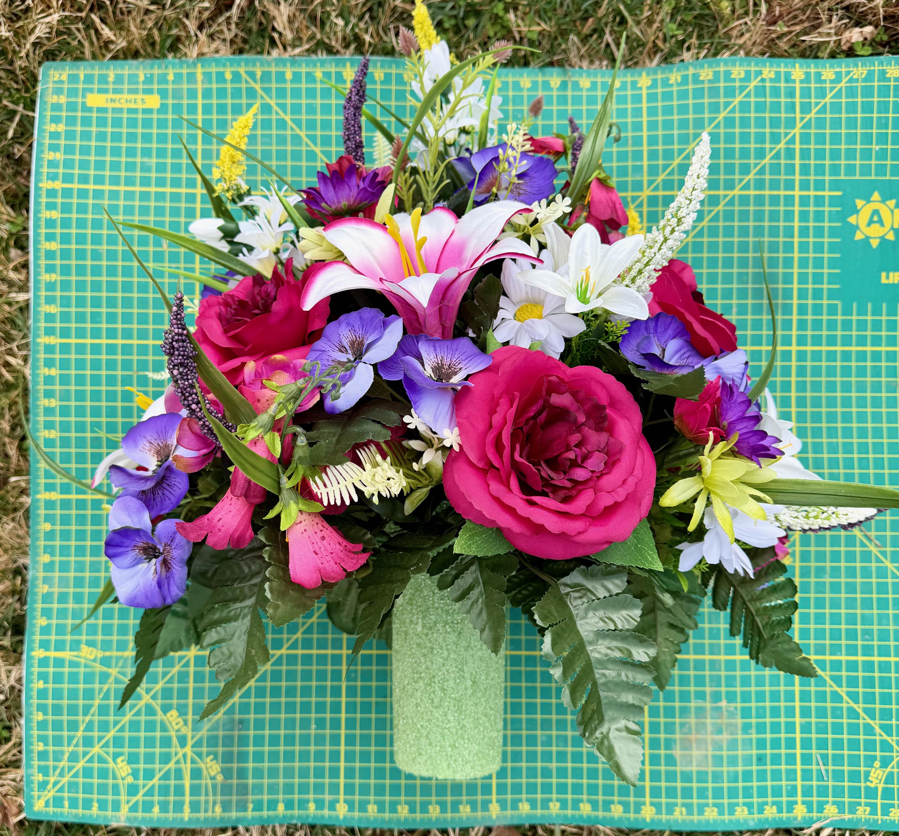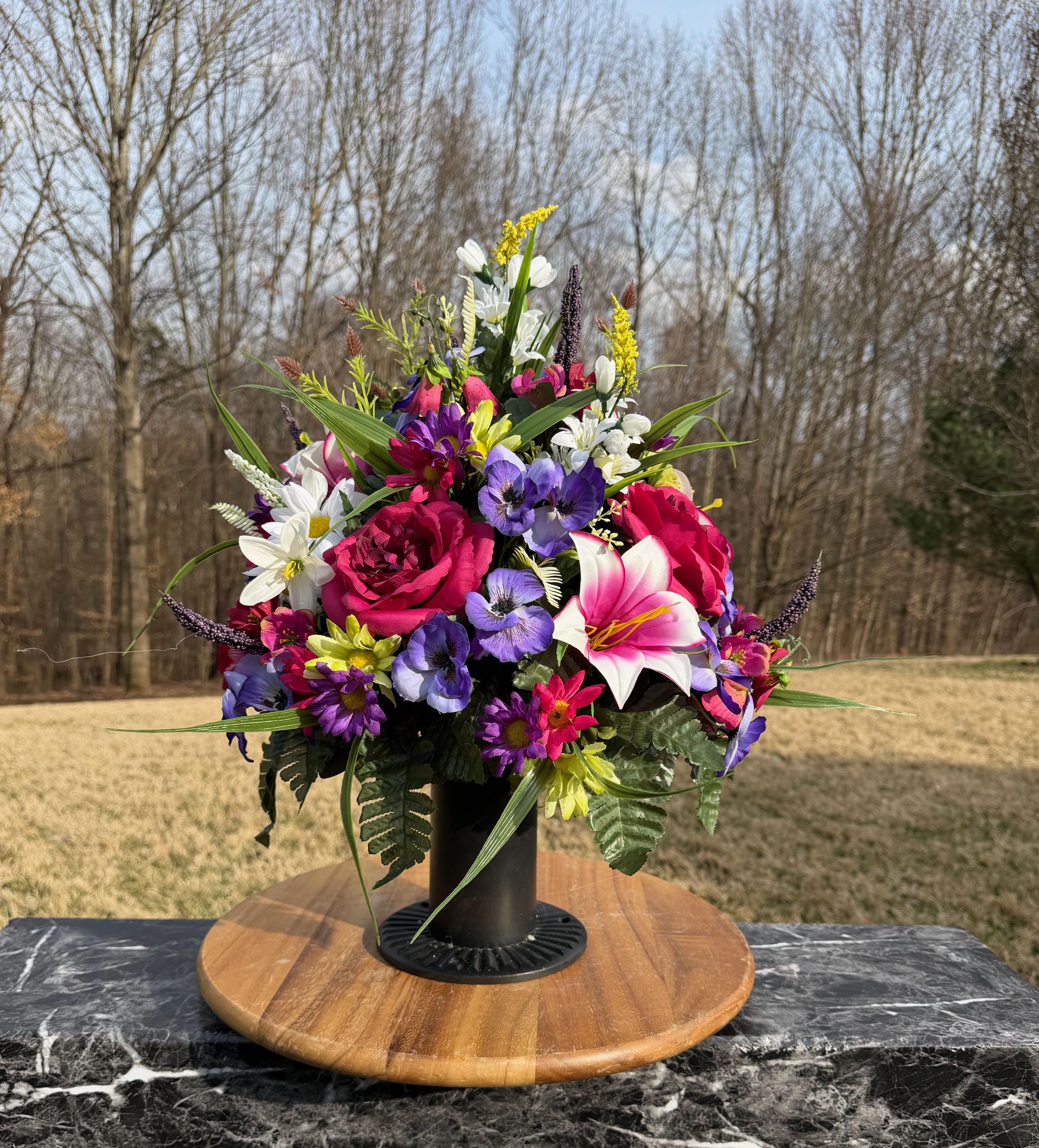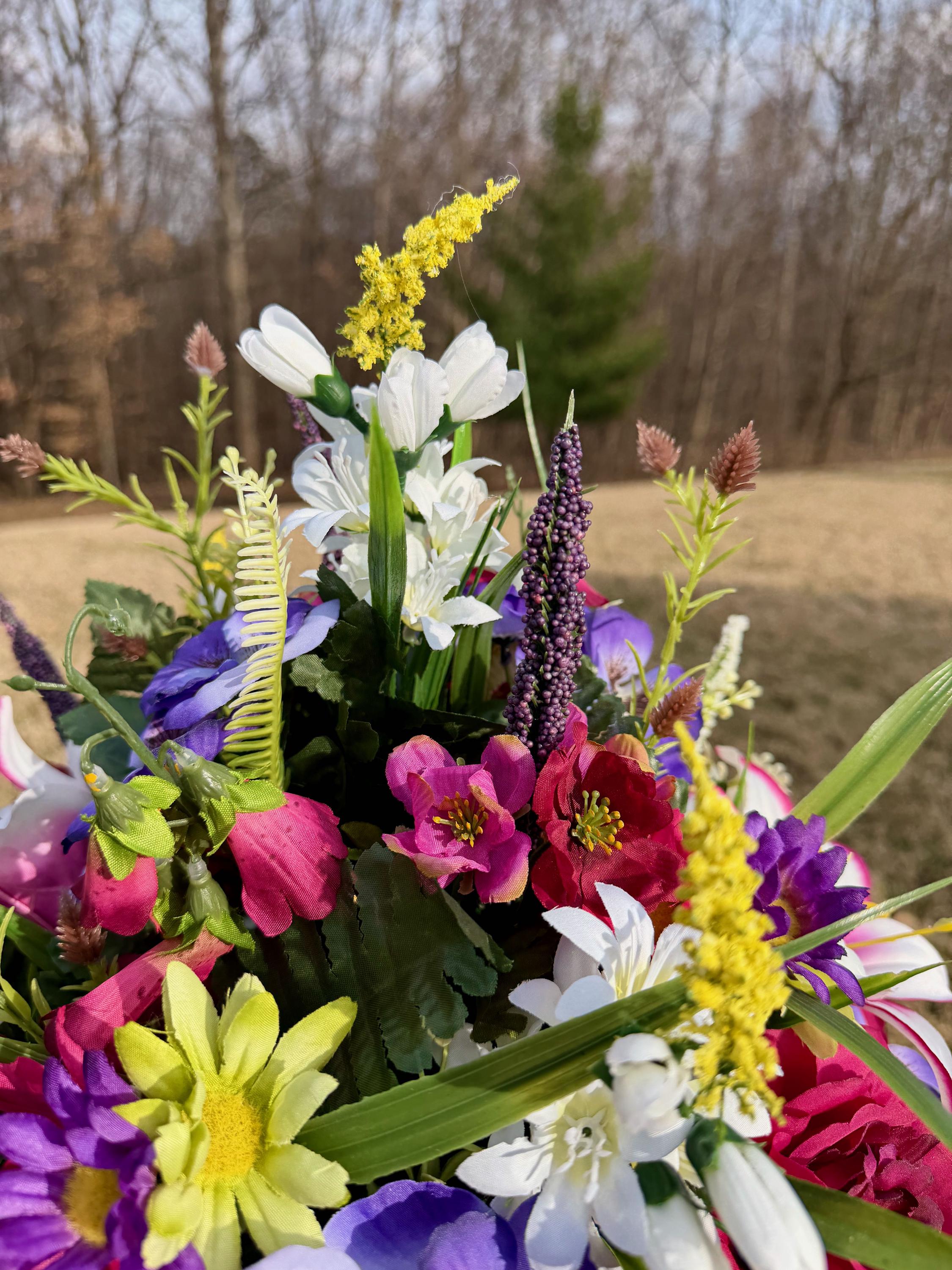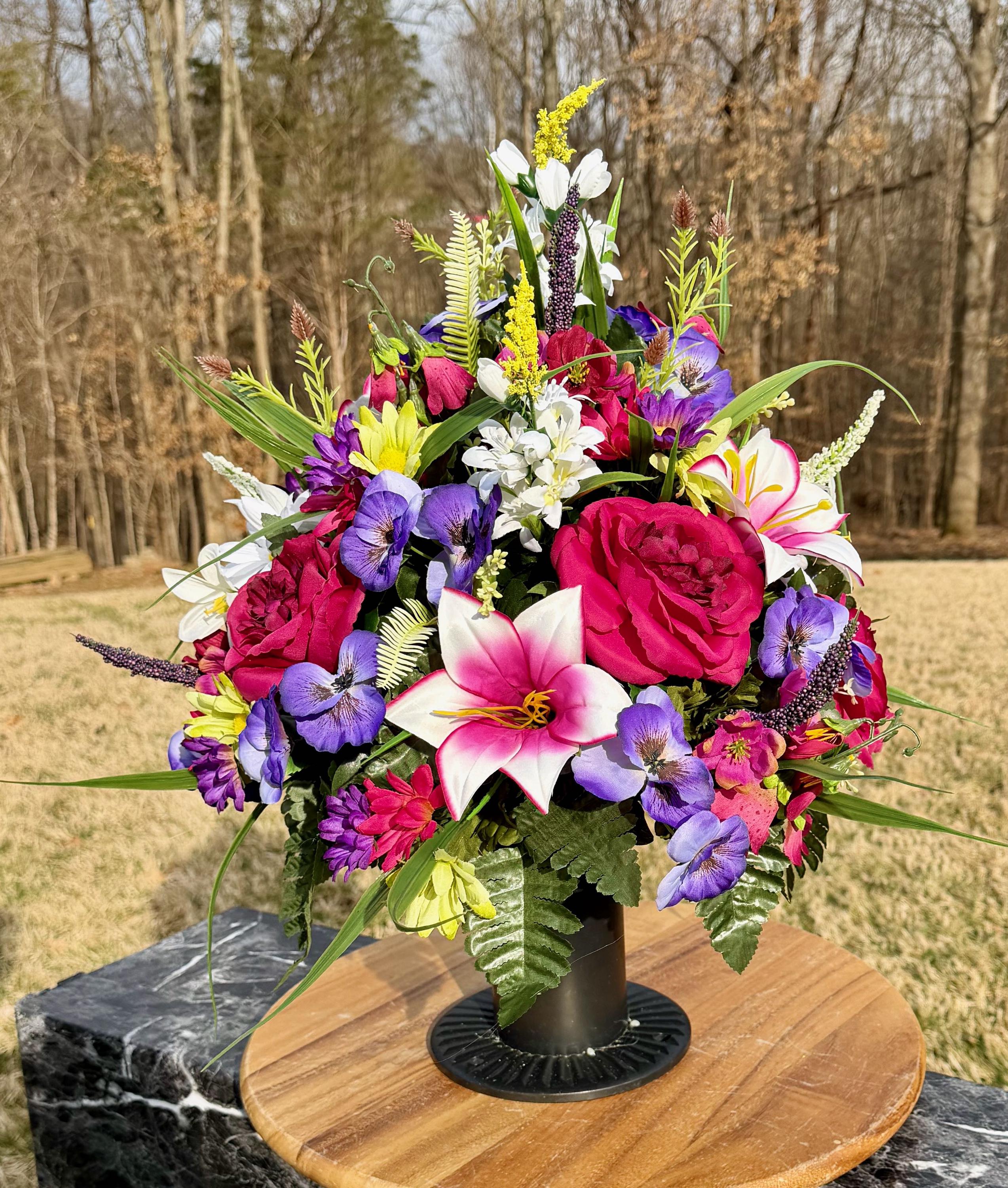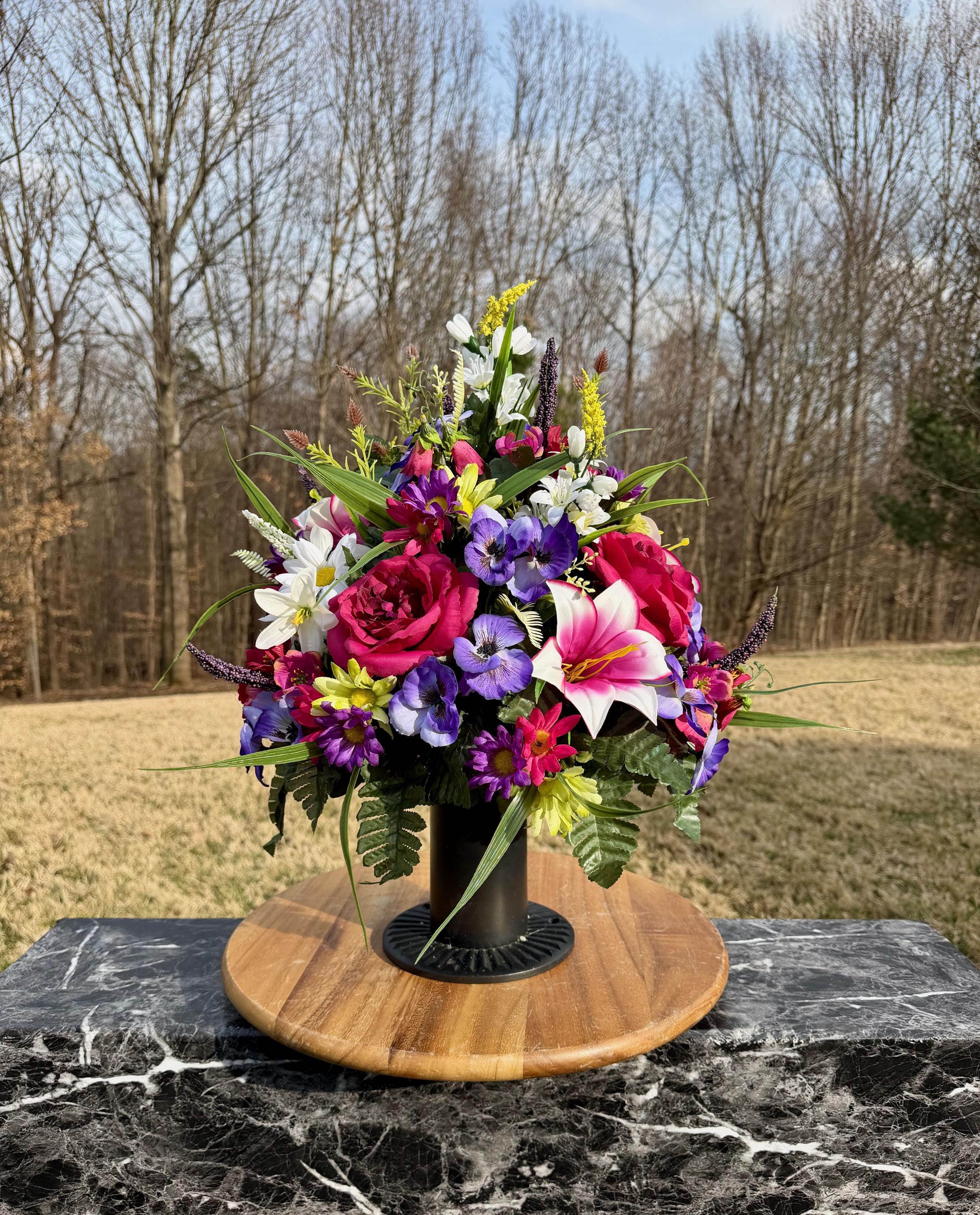 We’re a small, family-operated business consisting of myself, my husband, and my daughter. We personally manage every order and strive for excellent customer service. All our arrangements use high-quality silk flowers, though all silk blooms may fade over time. Each stem is glued into foam to withstand the elements. Designed by M&E uses only premium silks, and we put genuine care into every piece we create. Rest assured, the arrangement shown in our photos is exactly the one you’ll receive, as I design and assemble each one myself. If you’re searching for something unique or have a particular flower, color, or matching vases in mind, please contact me to discuss a custom order.