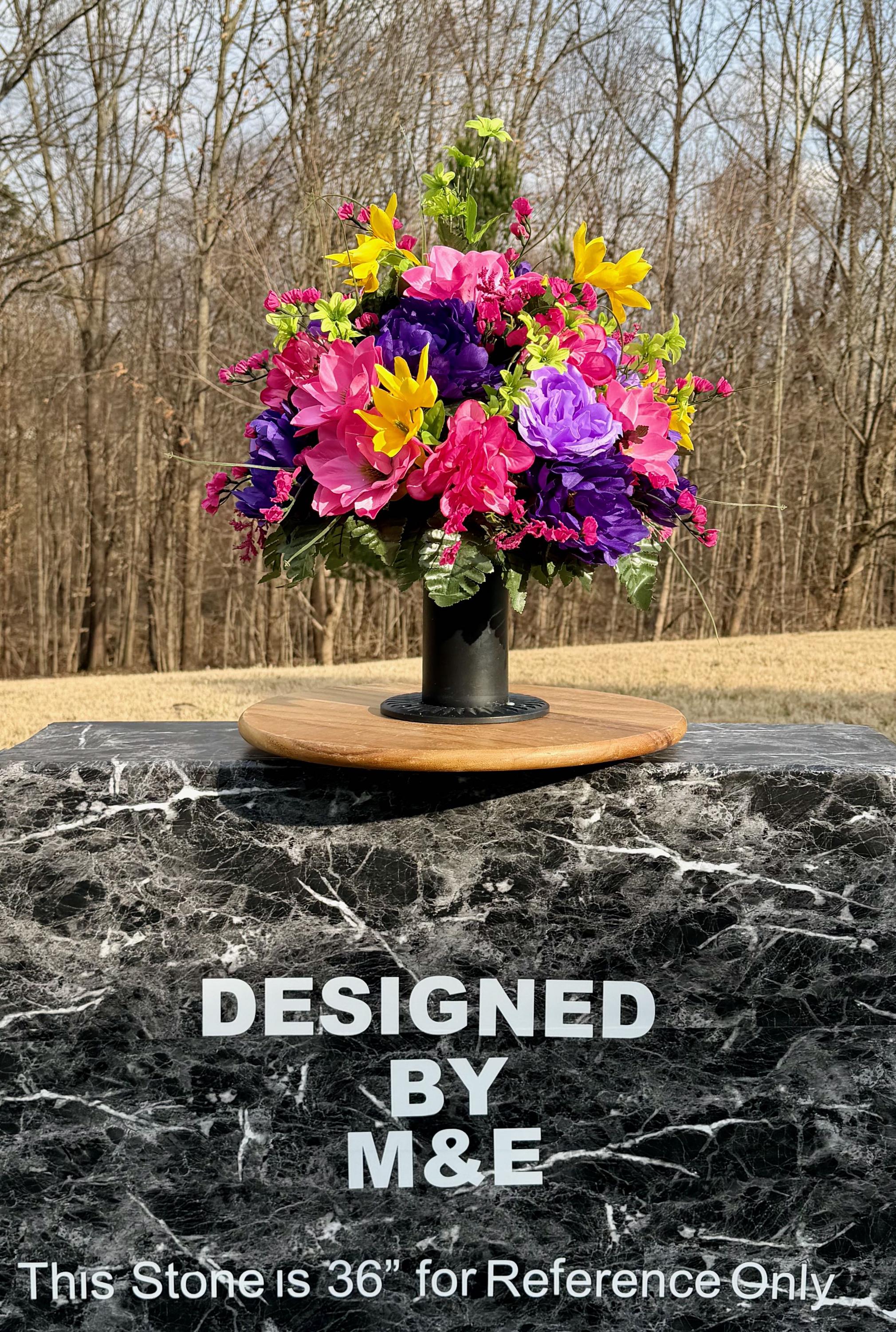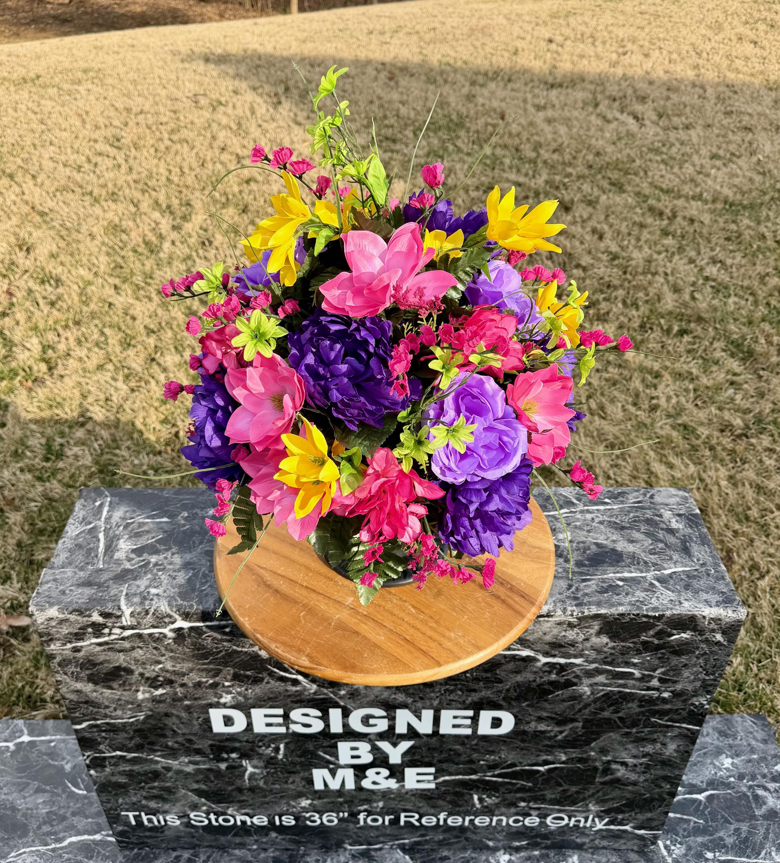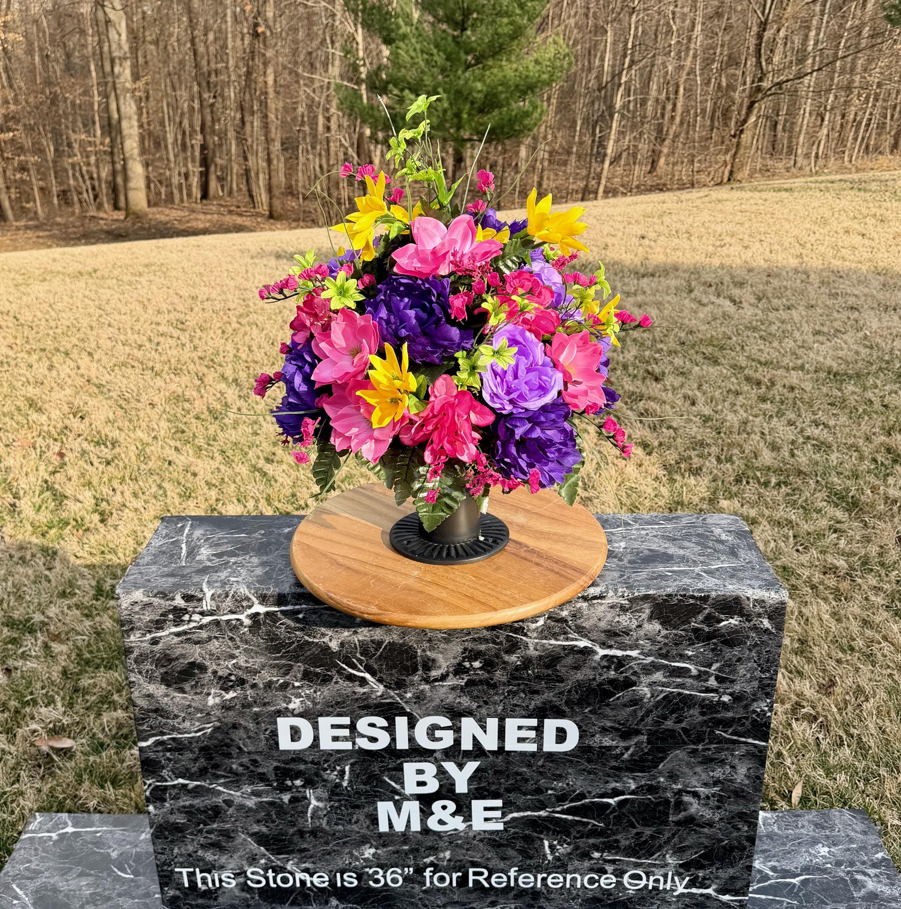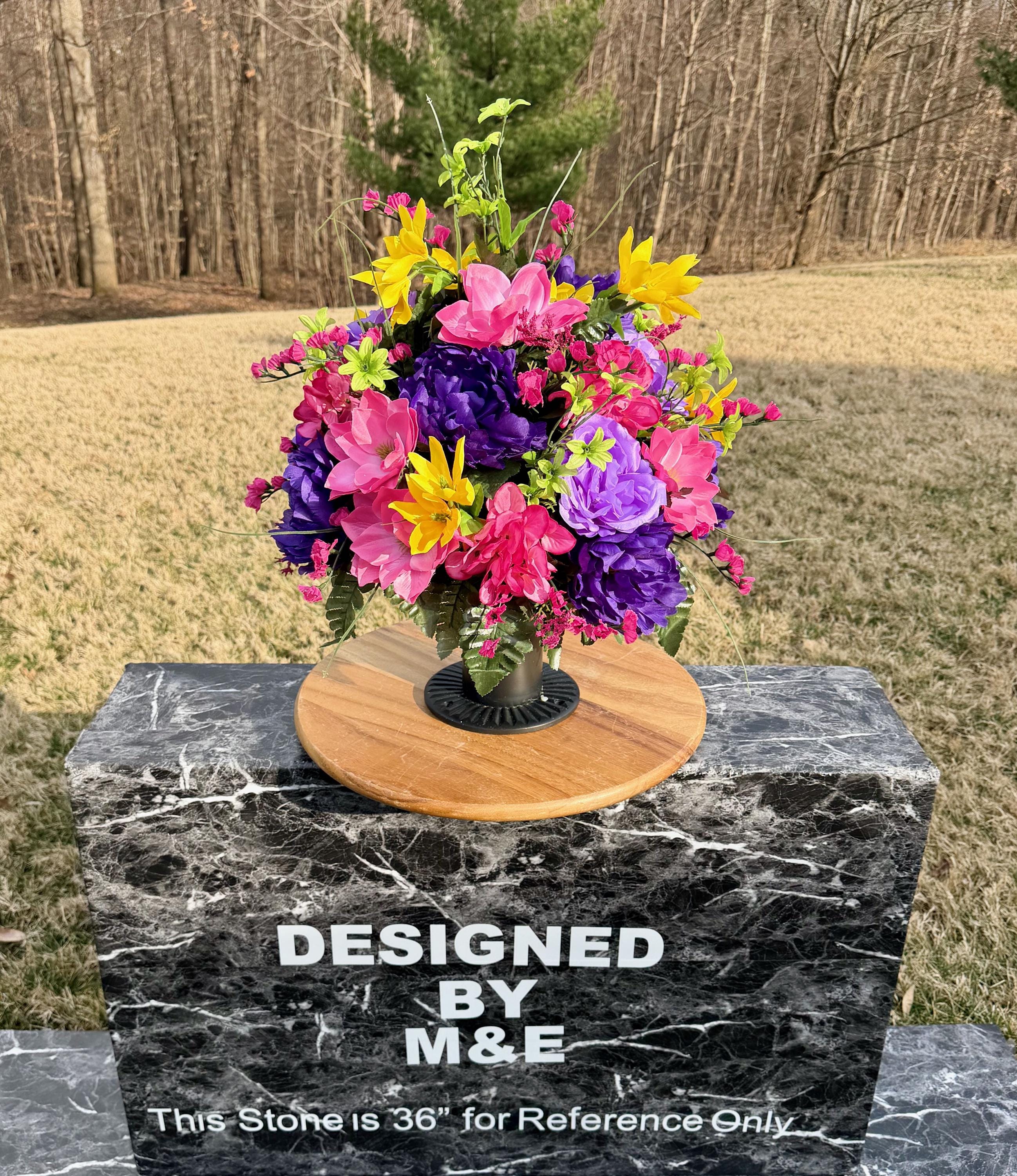 We’re a small, family-operated business consisting of myself, my husband, and my daughter. We personally manage every order and strive for excellent customer service. All our arrangements use high-quality silk flowers, though all silk blooms may fade over time. Each stem is glued into foam to withstand the elements. Designed by M&E uses only premium silks, and we put genuine care into every piece we create. Rest assured, the arrangement shown in our photos is exactly the one you’ll receive, as I design and assemble each one myself. If you’re searching for something unique or have a particular flower, color, or matching vases in mind, please contact me to discuss a custom order.