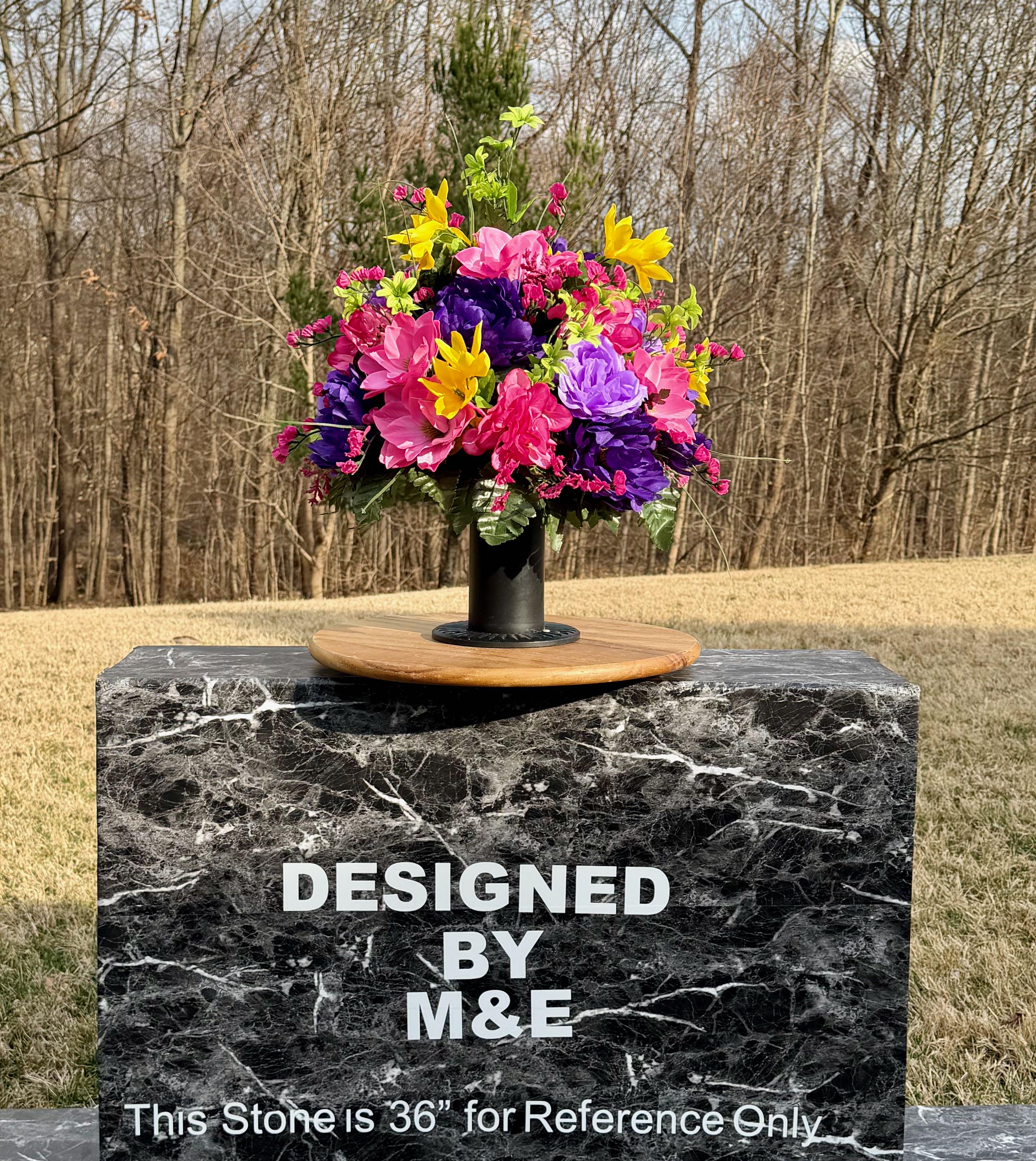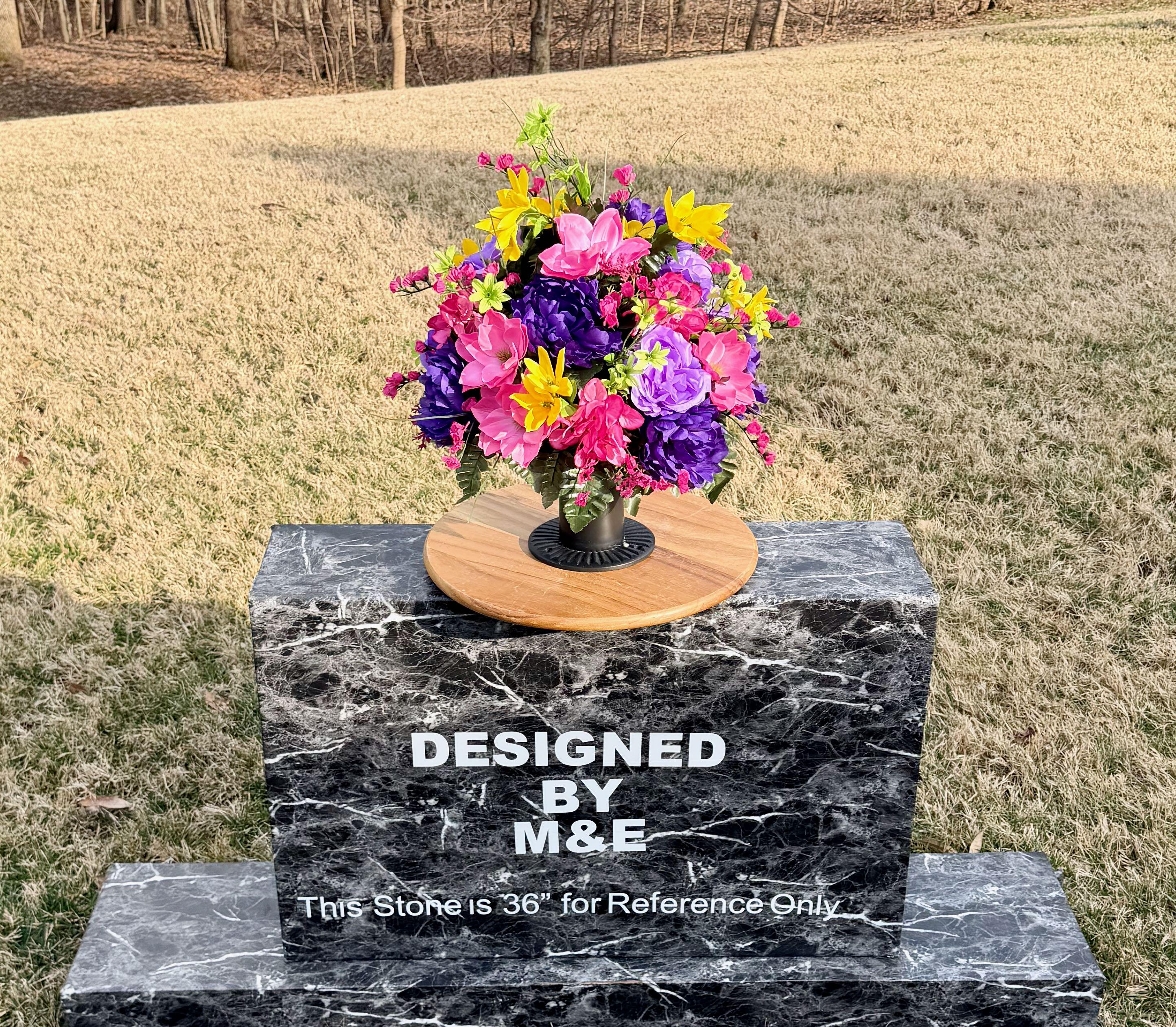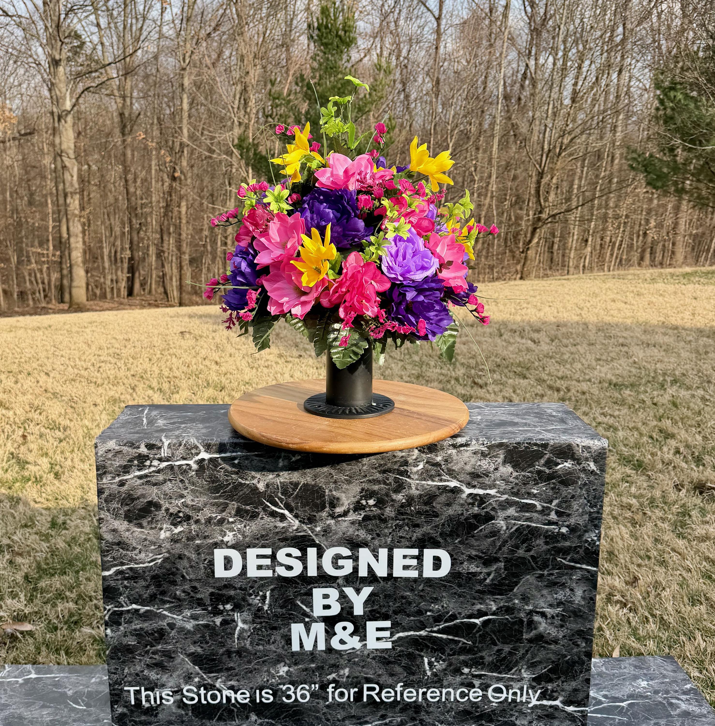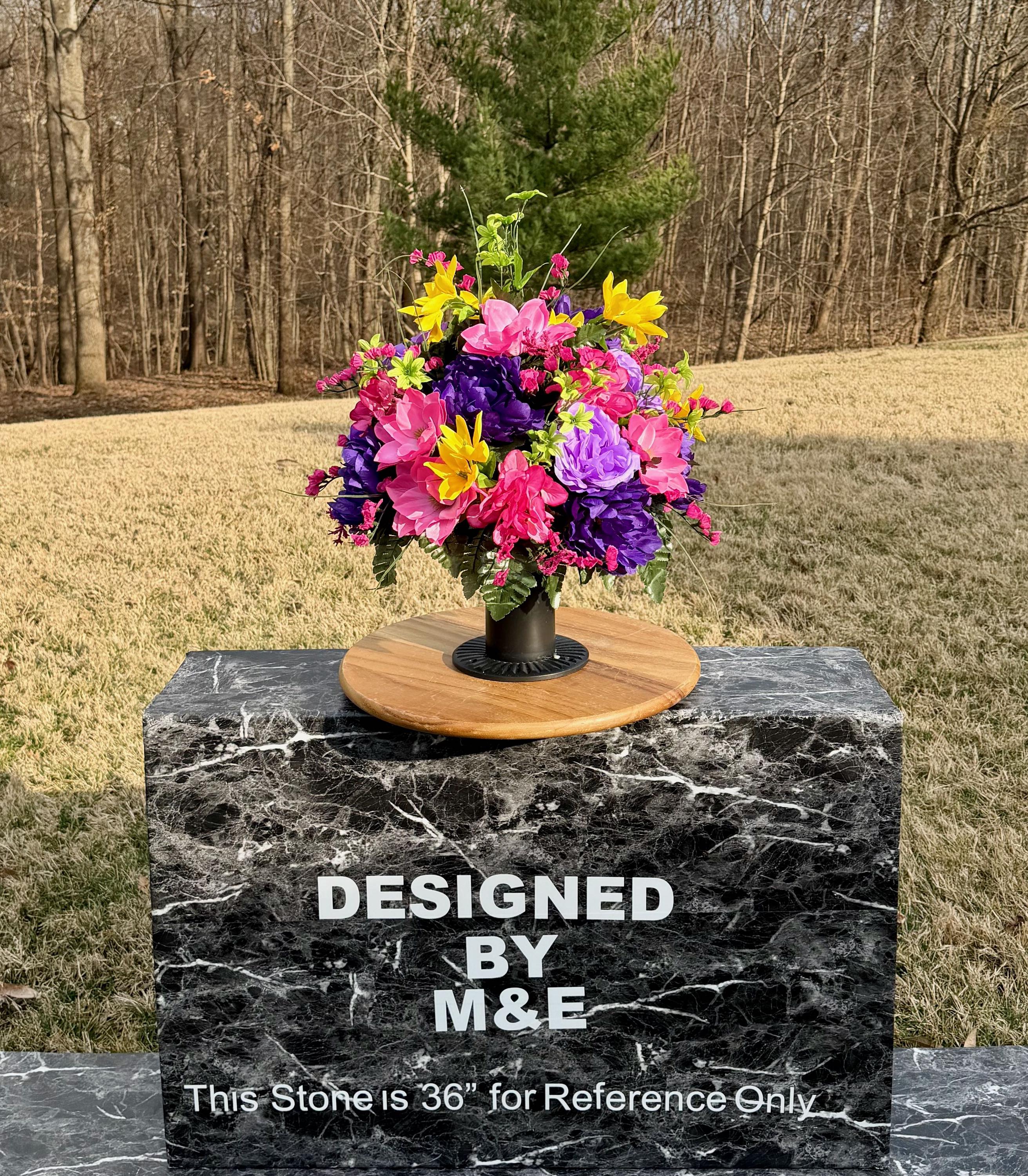 We’re a small, family-operated business consisting of myself, my husband, and my daughter. We personally manage every order and strive for excellent customer service. All our arrangements use high-quality silk flowers, though all silk blooms may fade over time. Each stem is glued into foam to withstand the elements. Designed by M&E uses only premium silks, and we put genuine care into every piece we create. Rest assured, the arrangement shown in our photos is exactly the one you’ll receive, as I design and assemble each one myself. If you’re searching for something unique or have a particular flower, color, or matching vases in mind, please contact me to discuss a custom order.