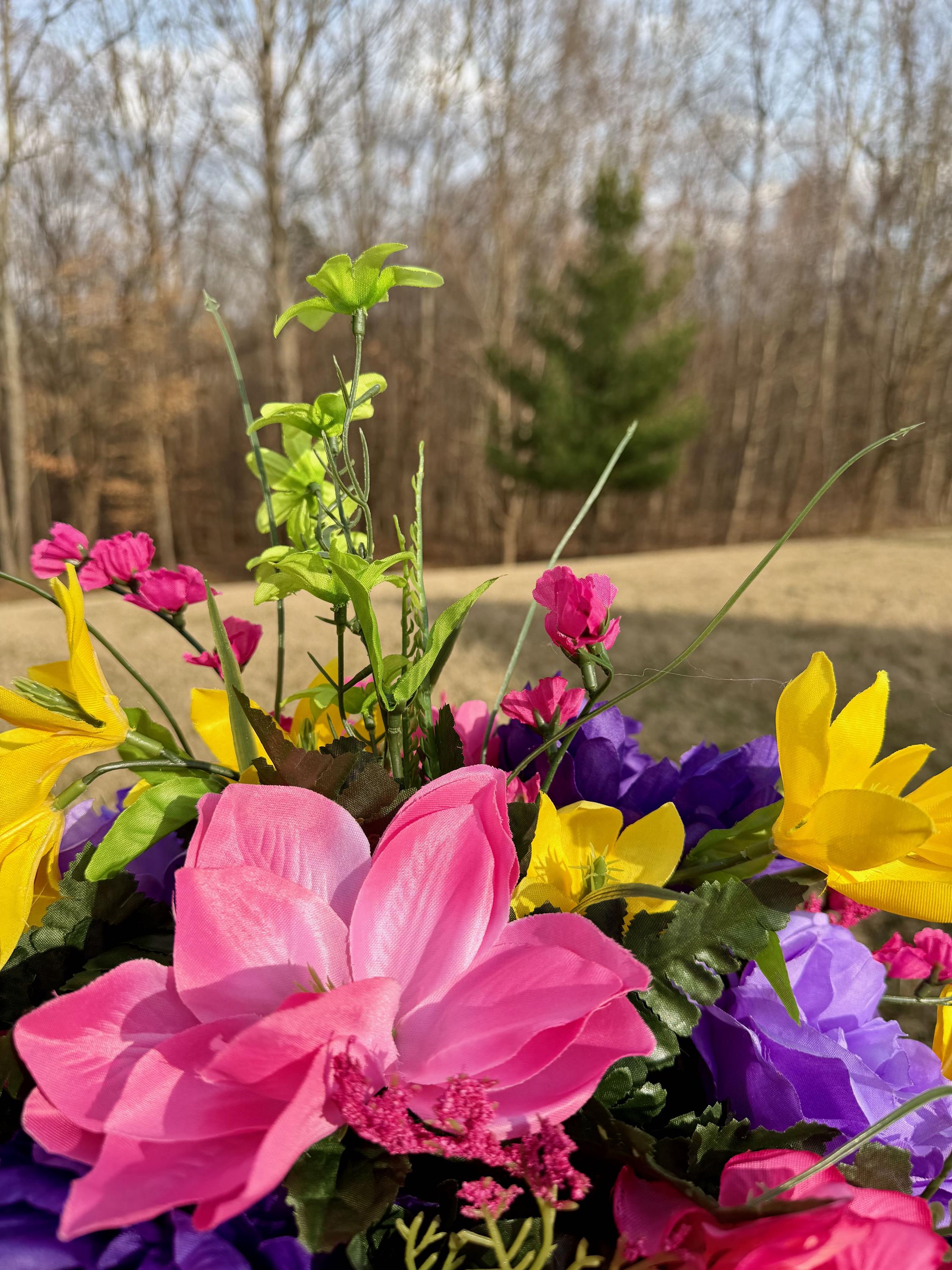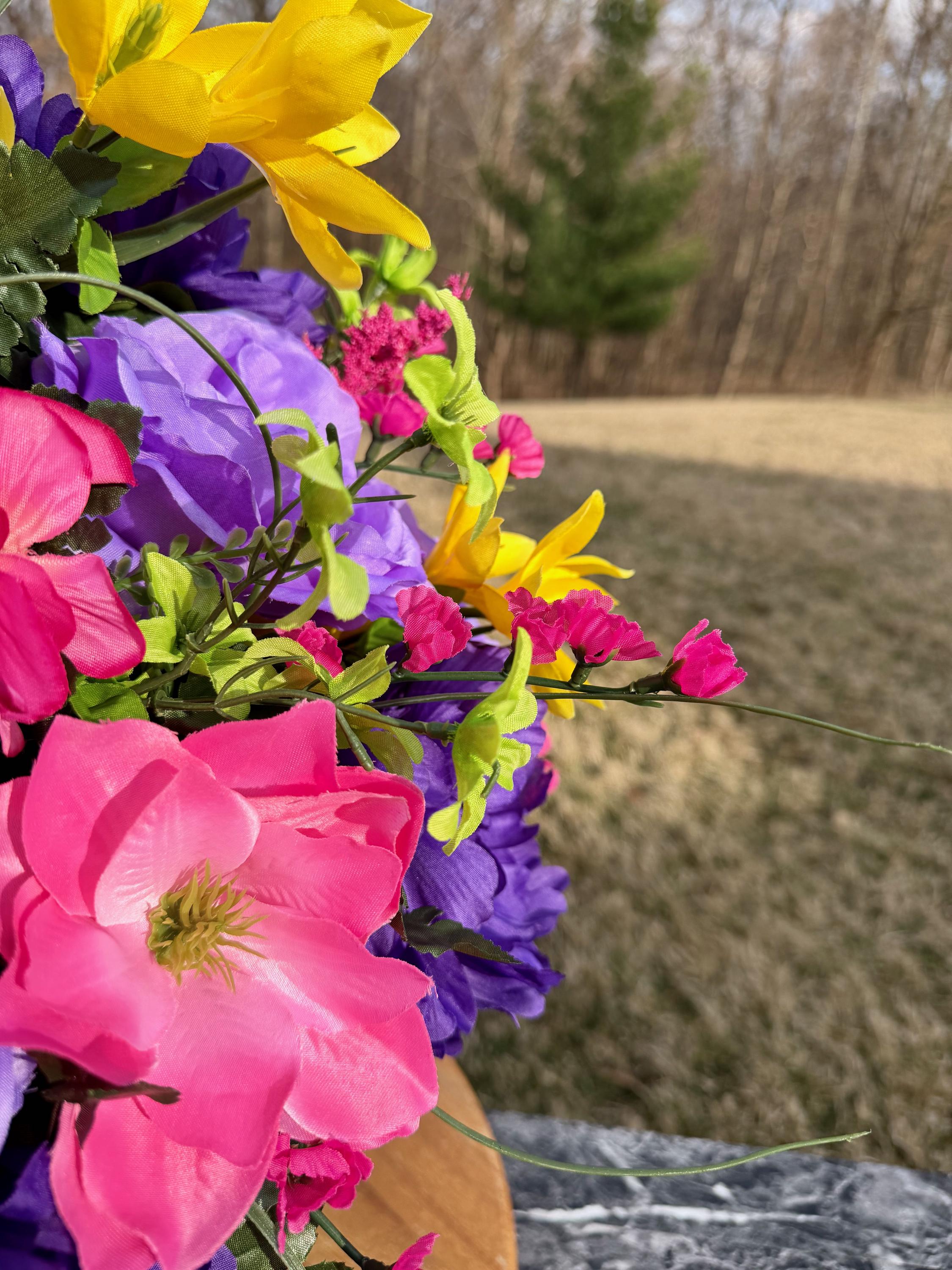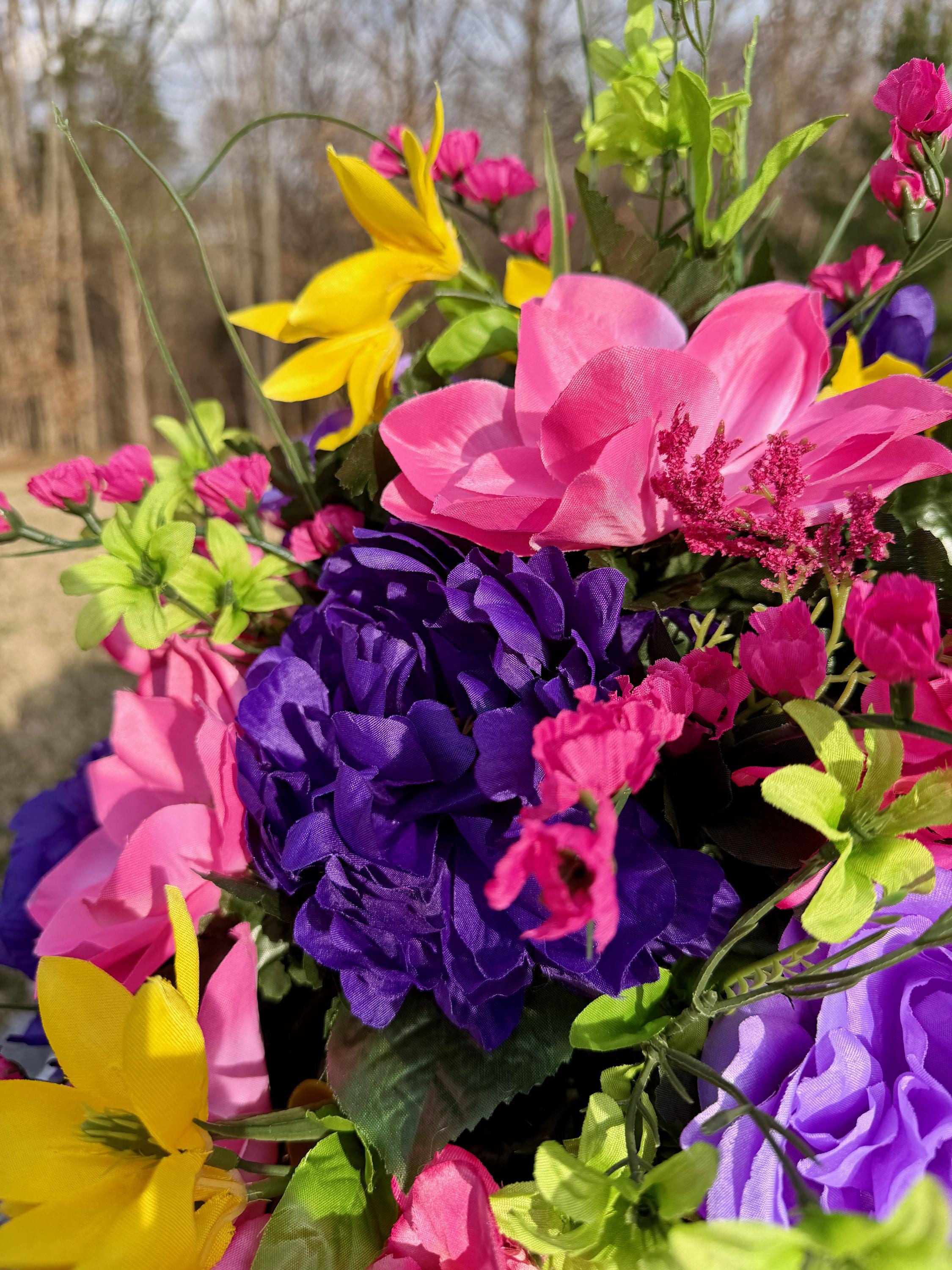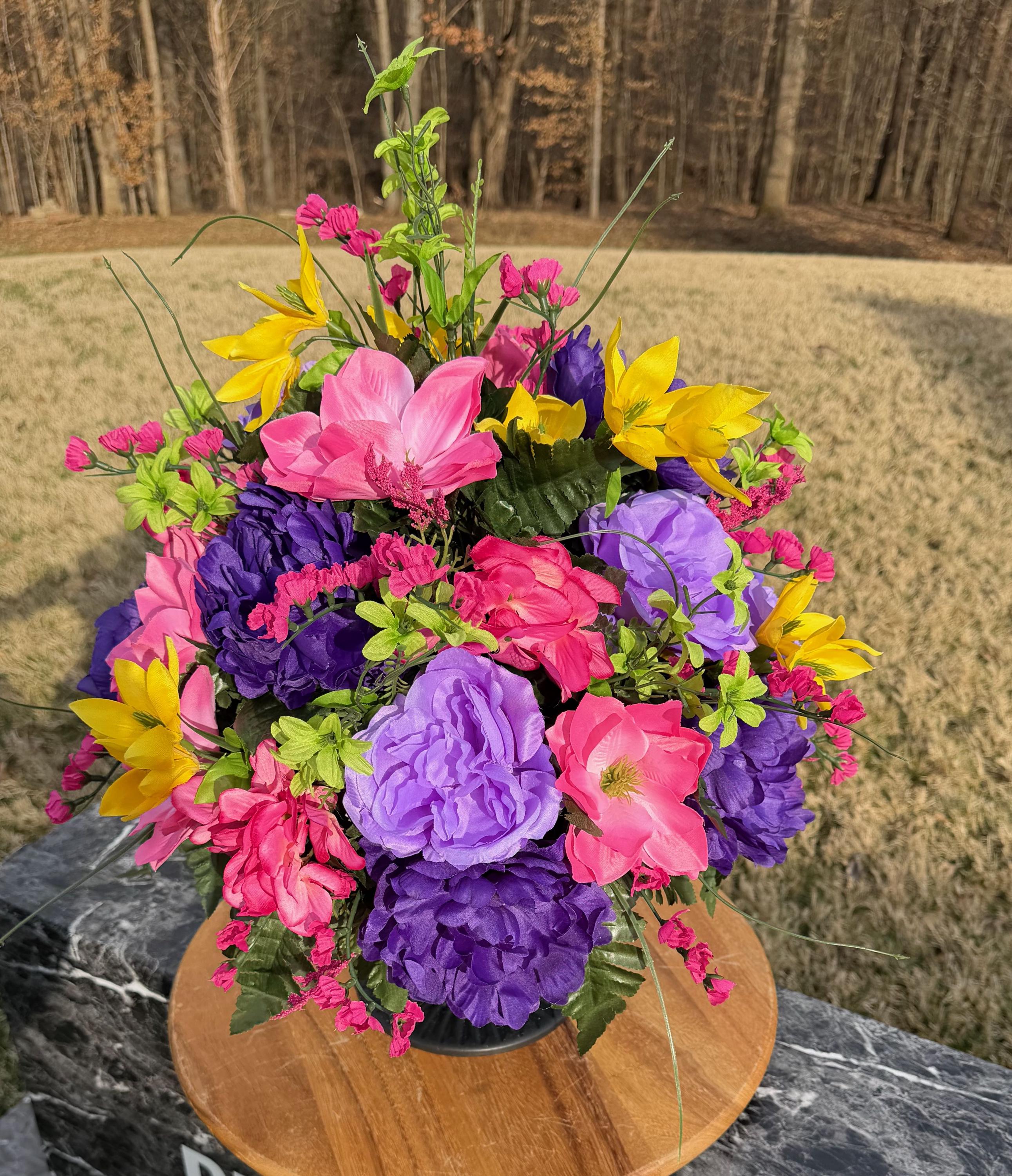 We’re a small, family-operated business consisting of myself, my husband, and my daughter. We personally manage every order and strive for excellent customer service. All our arrangements use high-quality silk flowers, though all silk blooms may fade over time. Each stem is glued into foam to withstand the elements. Designed by M&E uses only premium silks, and we put genuine care into every piece we create. Rest assured, the arrangement shown in our photos is exactly the one you’ll receive, as I design and assemble each one myself. If you’re searching for something unique or have a particular flower, color, or matching vases in mind, please contact me to discuss a custom order.