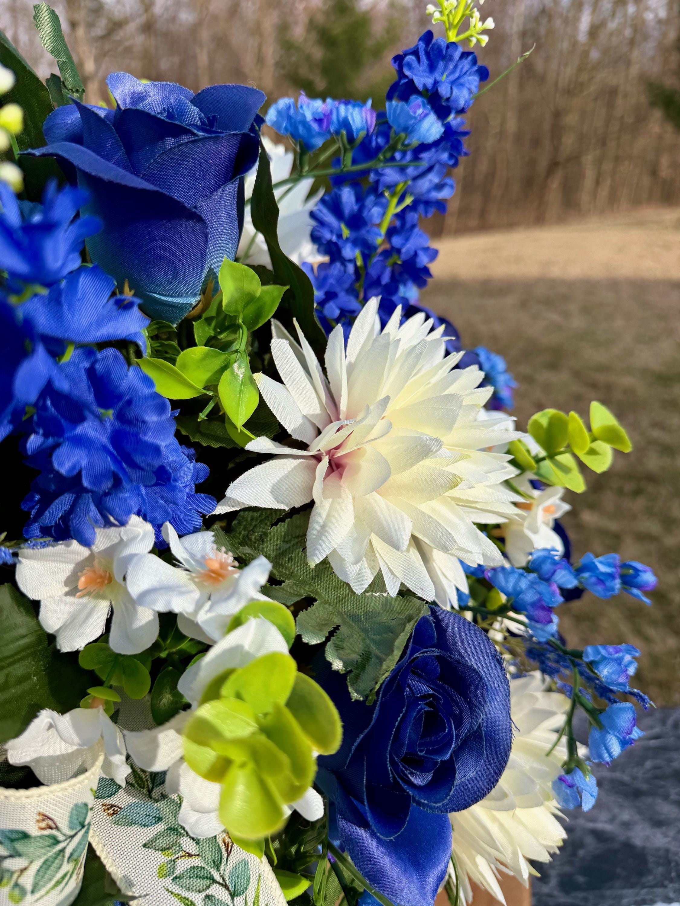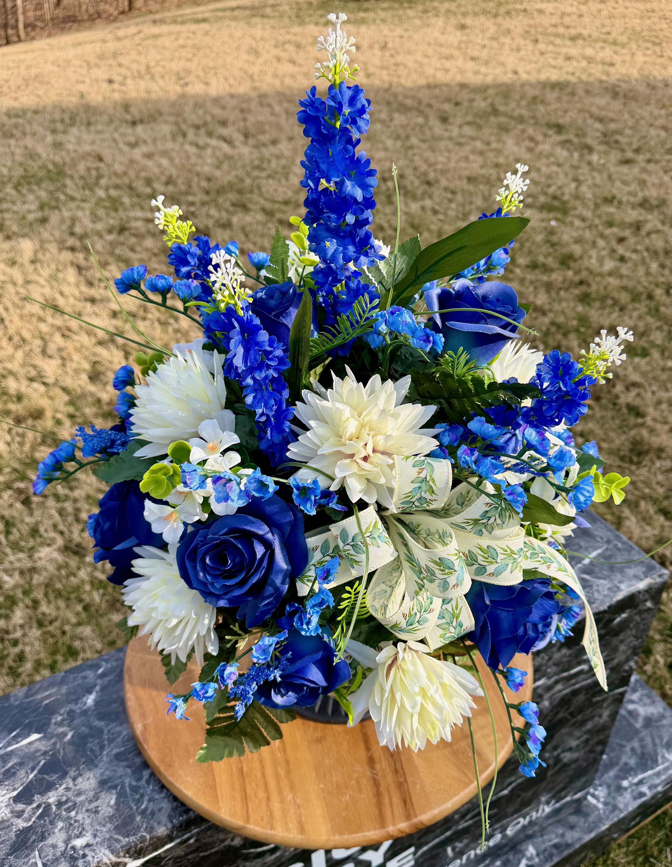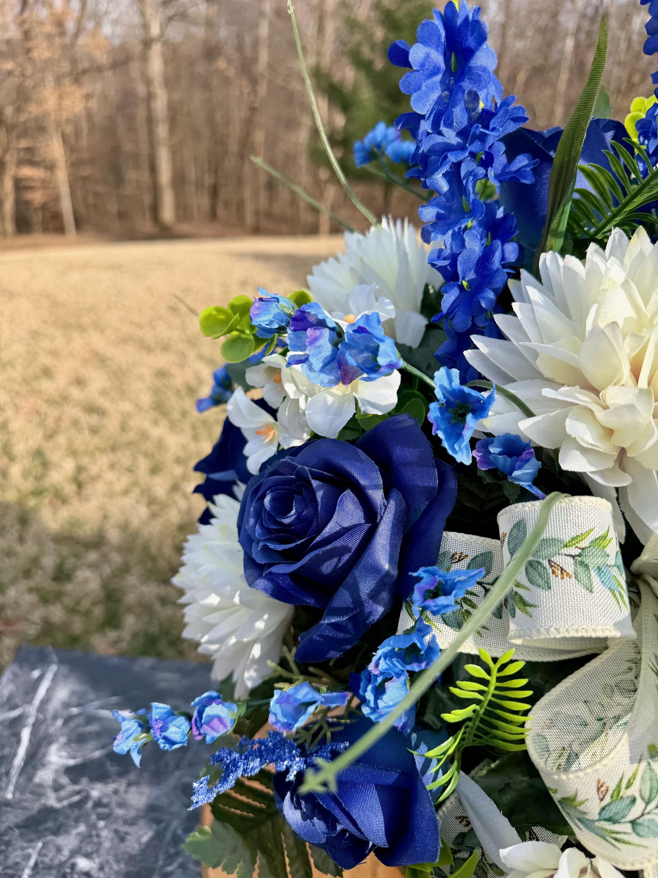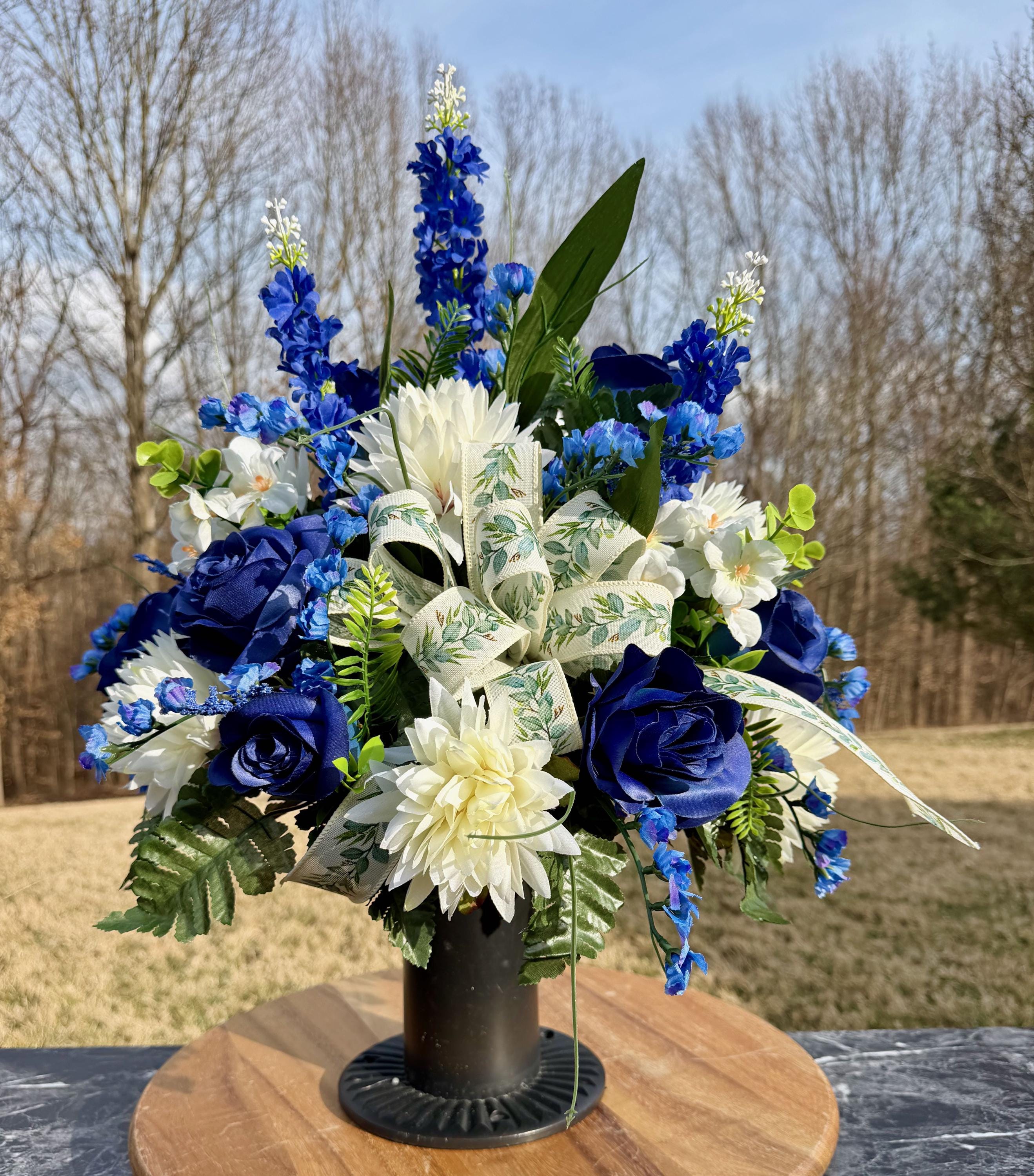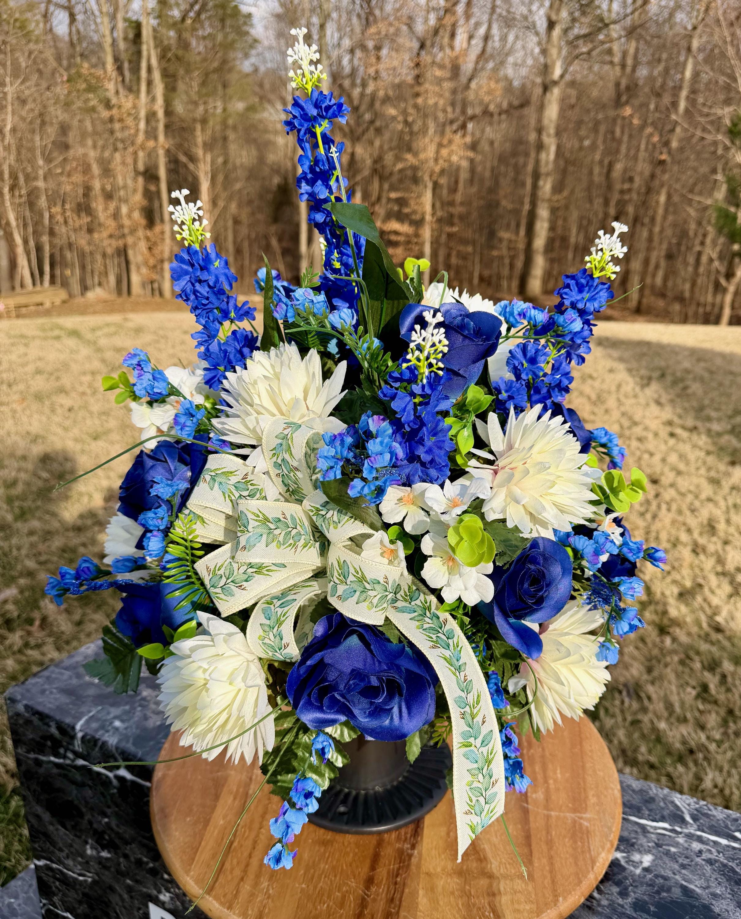 Blue and White with Bow Cemetery Vase Arrangement, Headstone Arrangement, Memorial Flowers