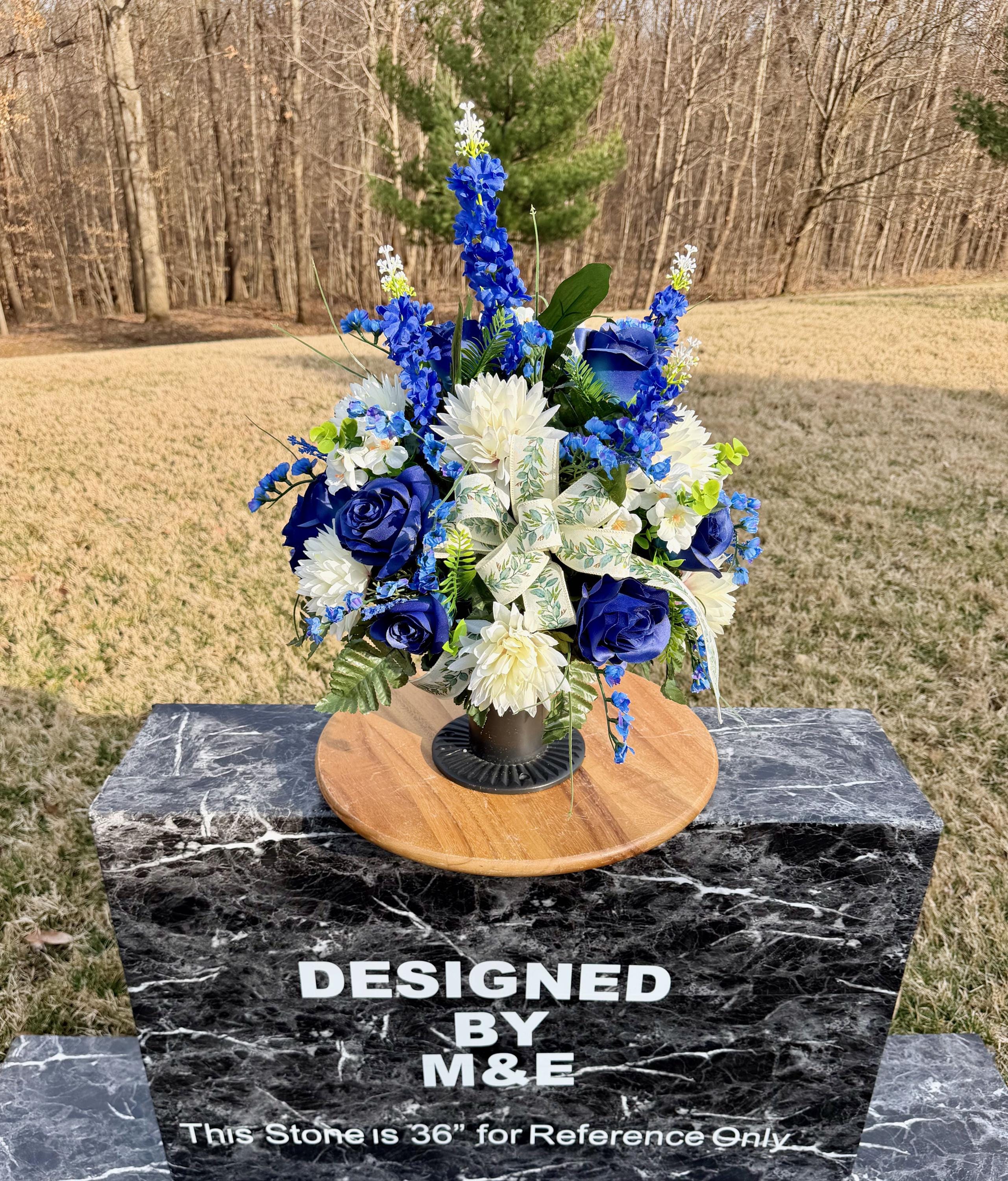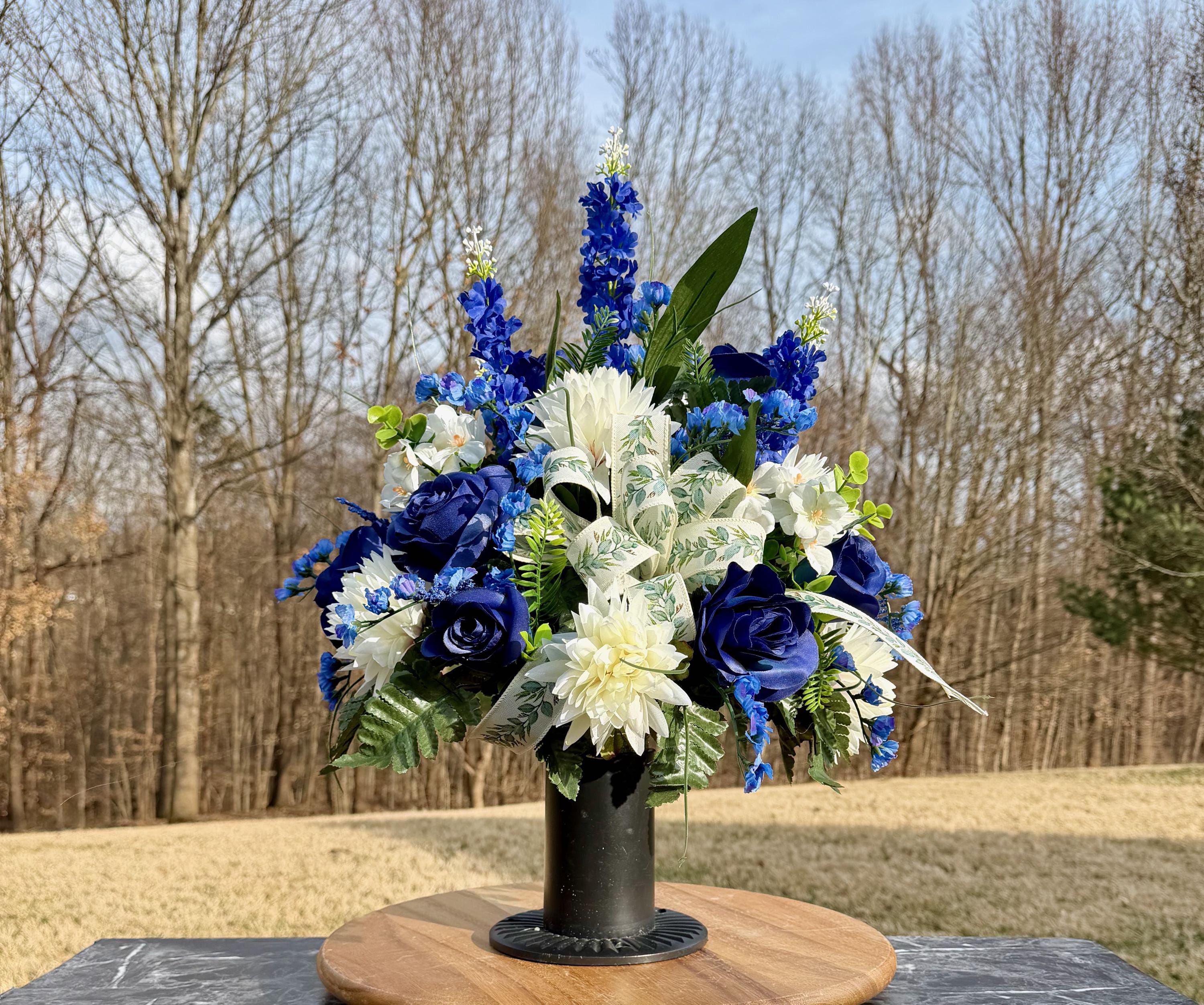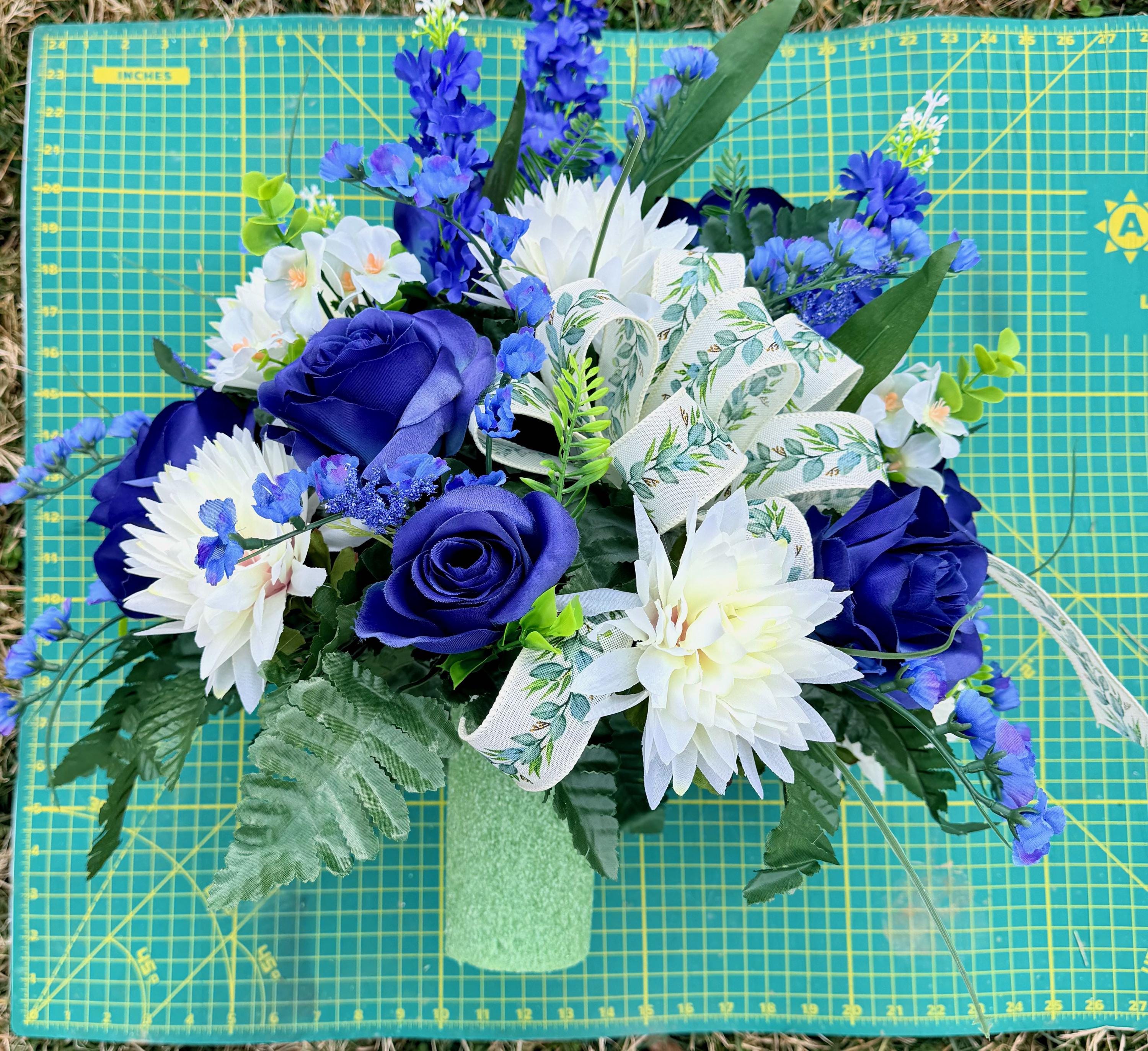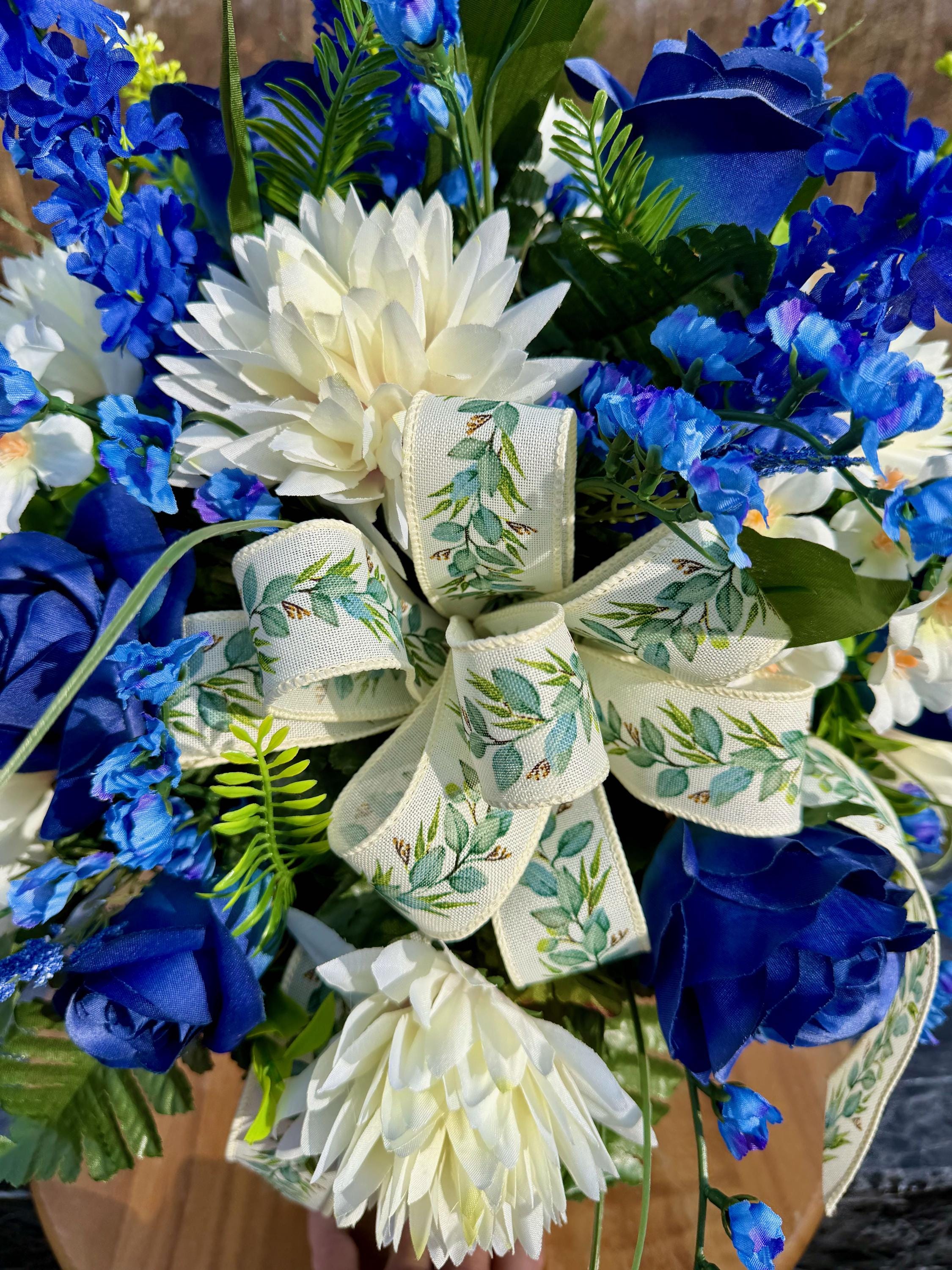 Blue and White with Bow Cemetery Vase Arrangement, Headstone Arrangement, Memorial Flowers