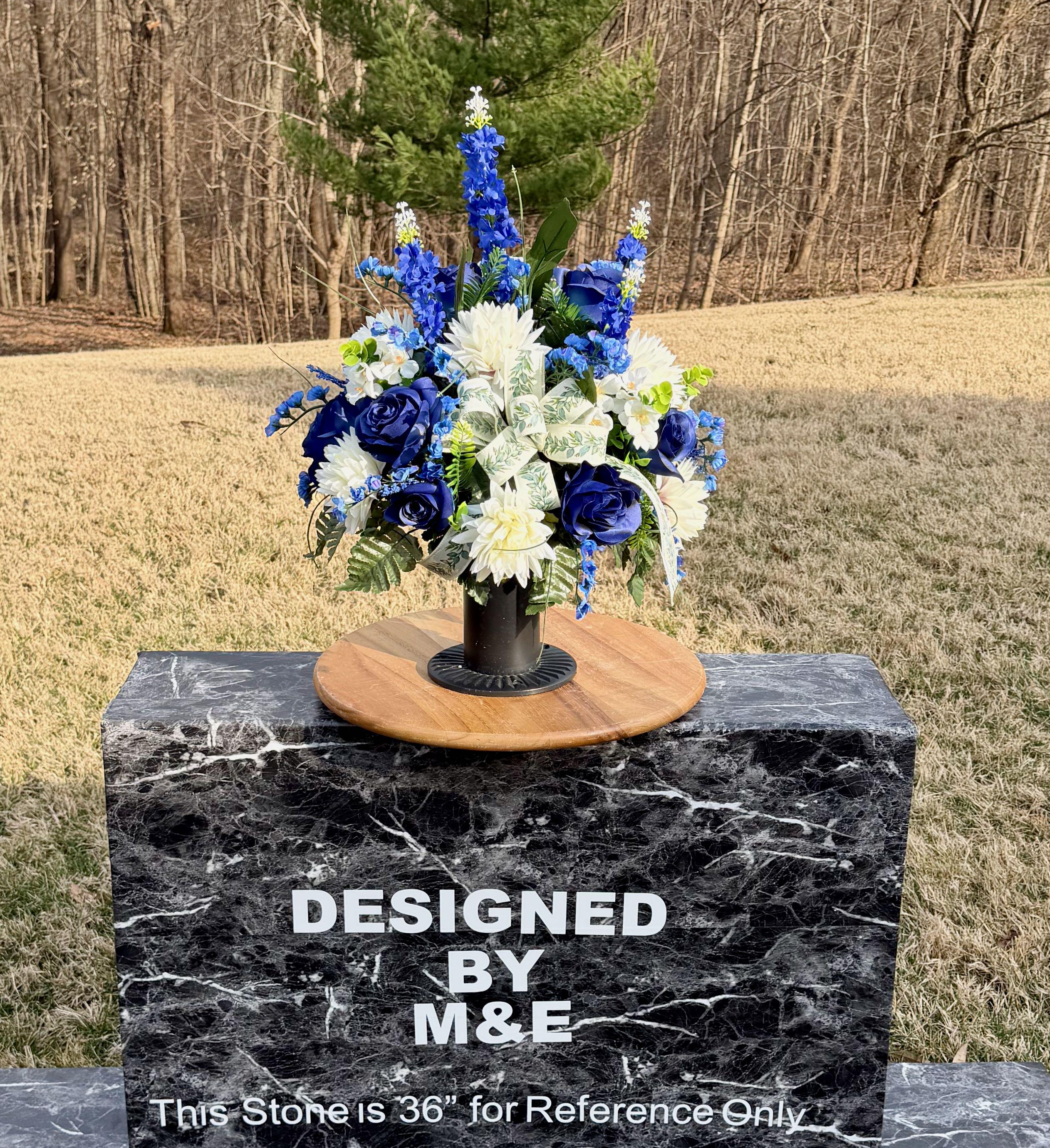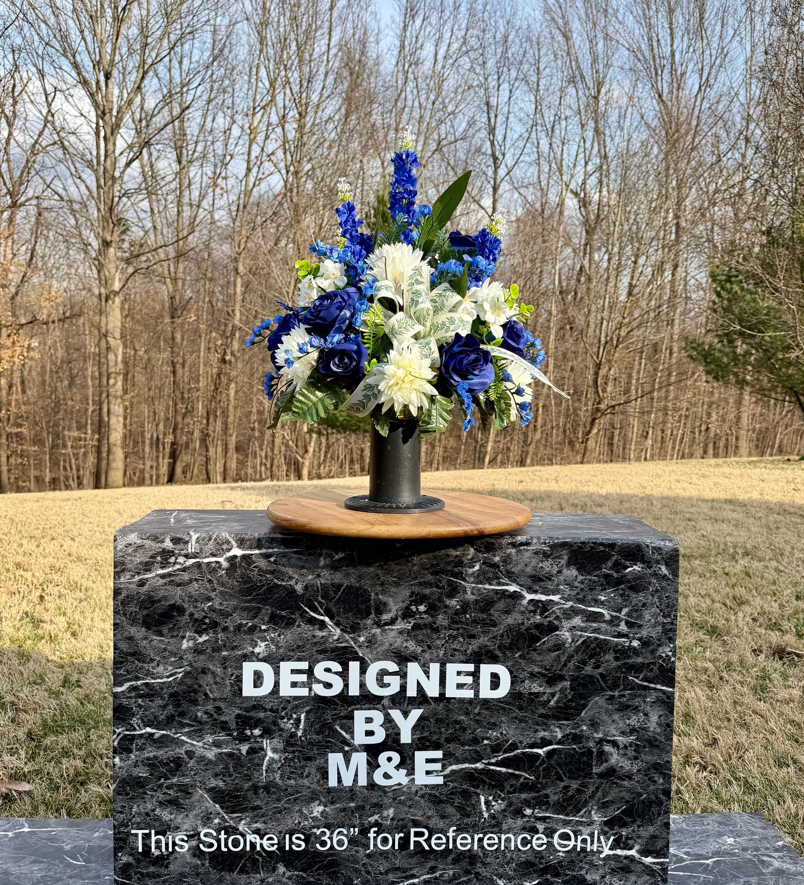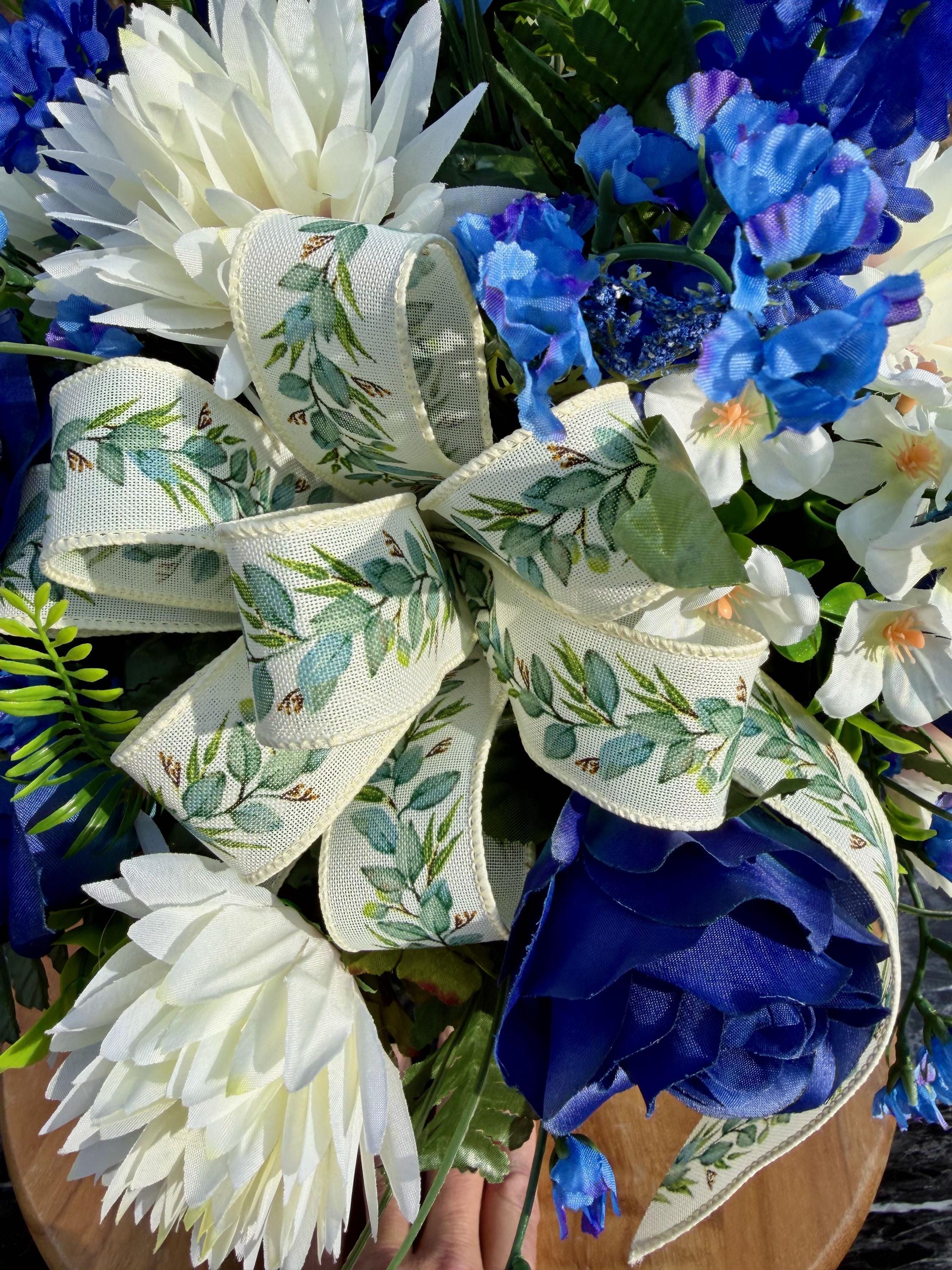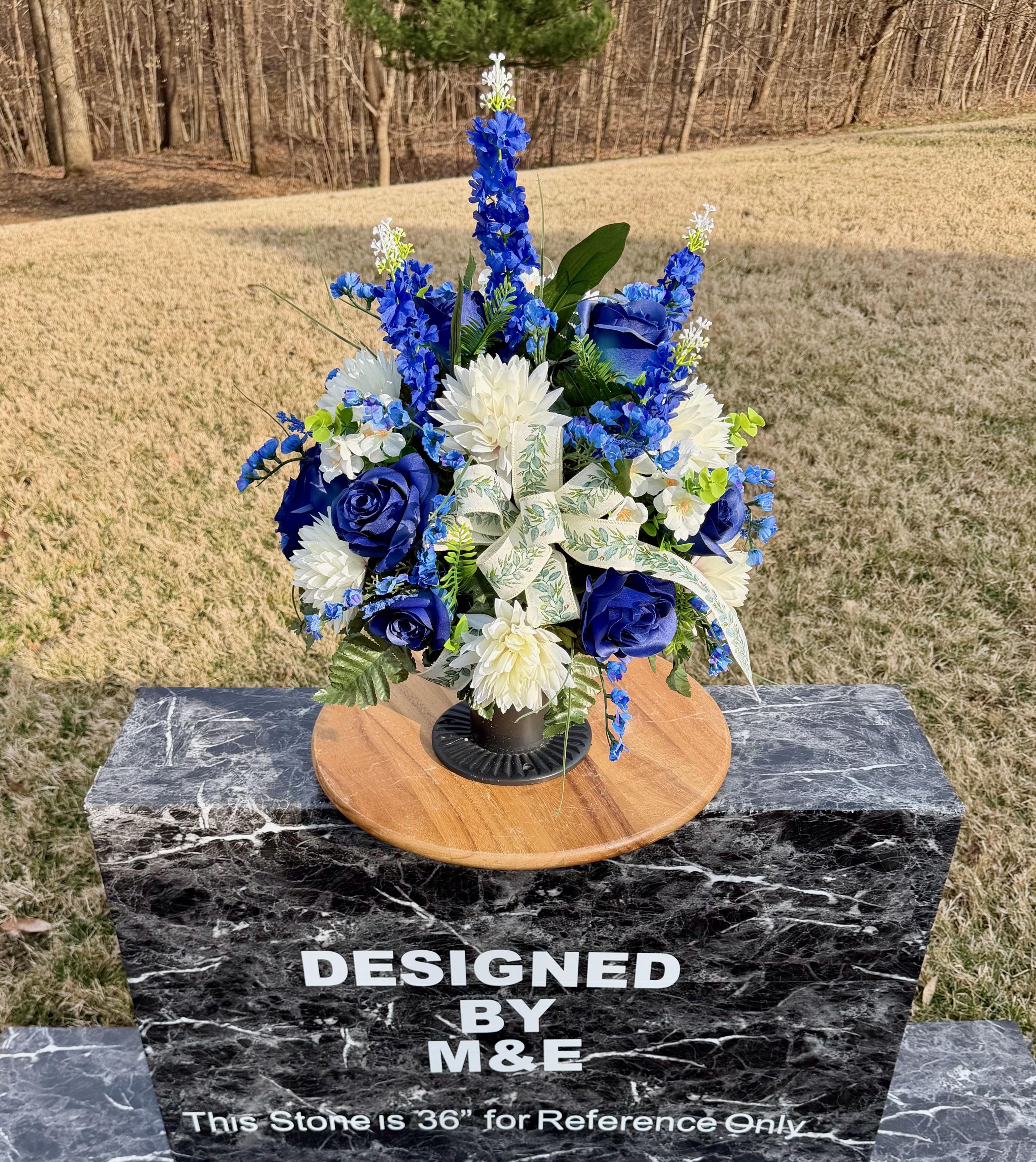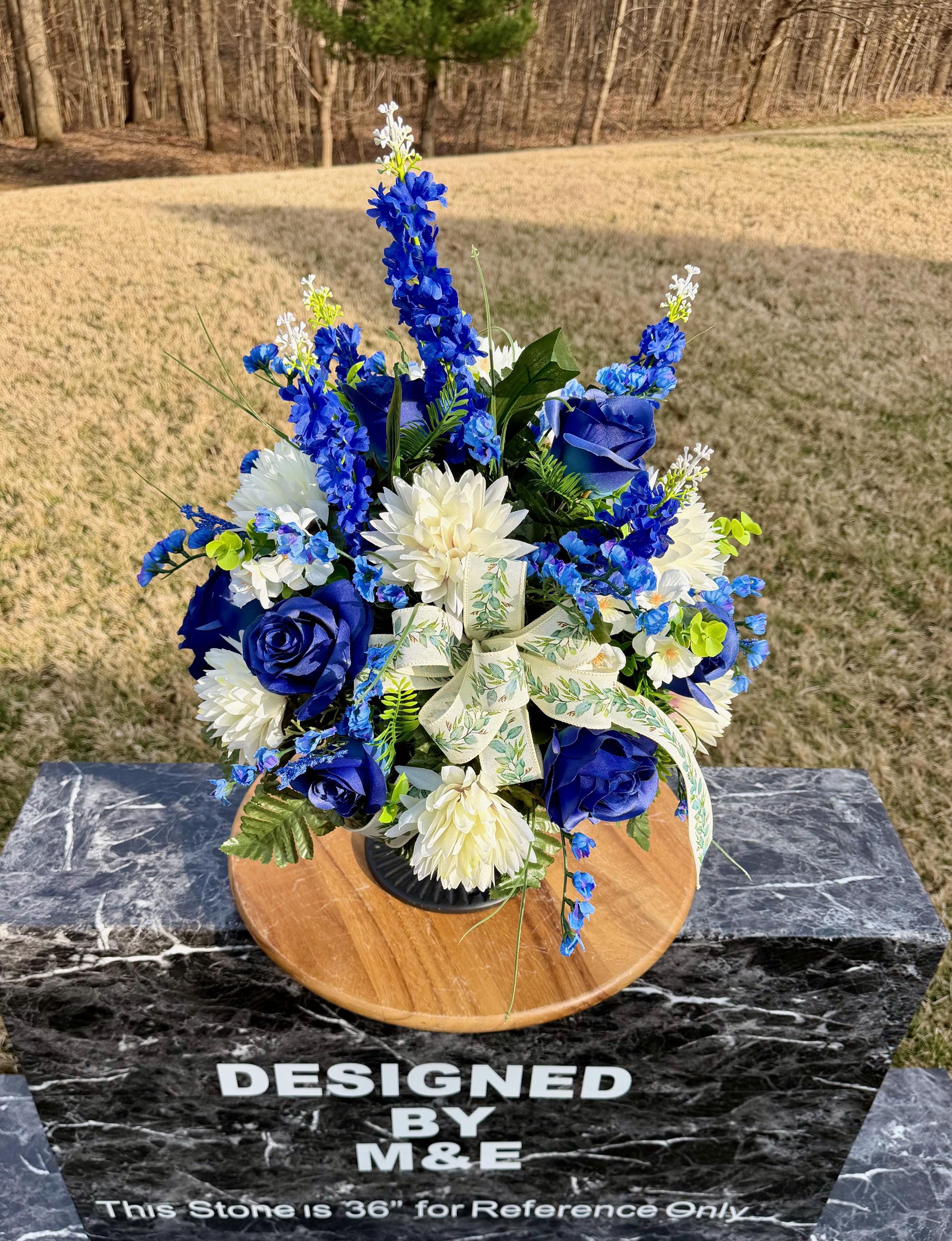 Blue and White with Bow Cemetery Vase Arrangement, Headstone Arrangement, Memorial Flowers
