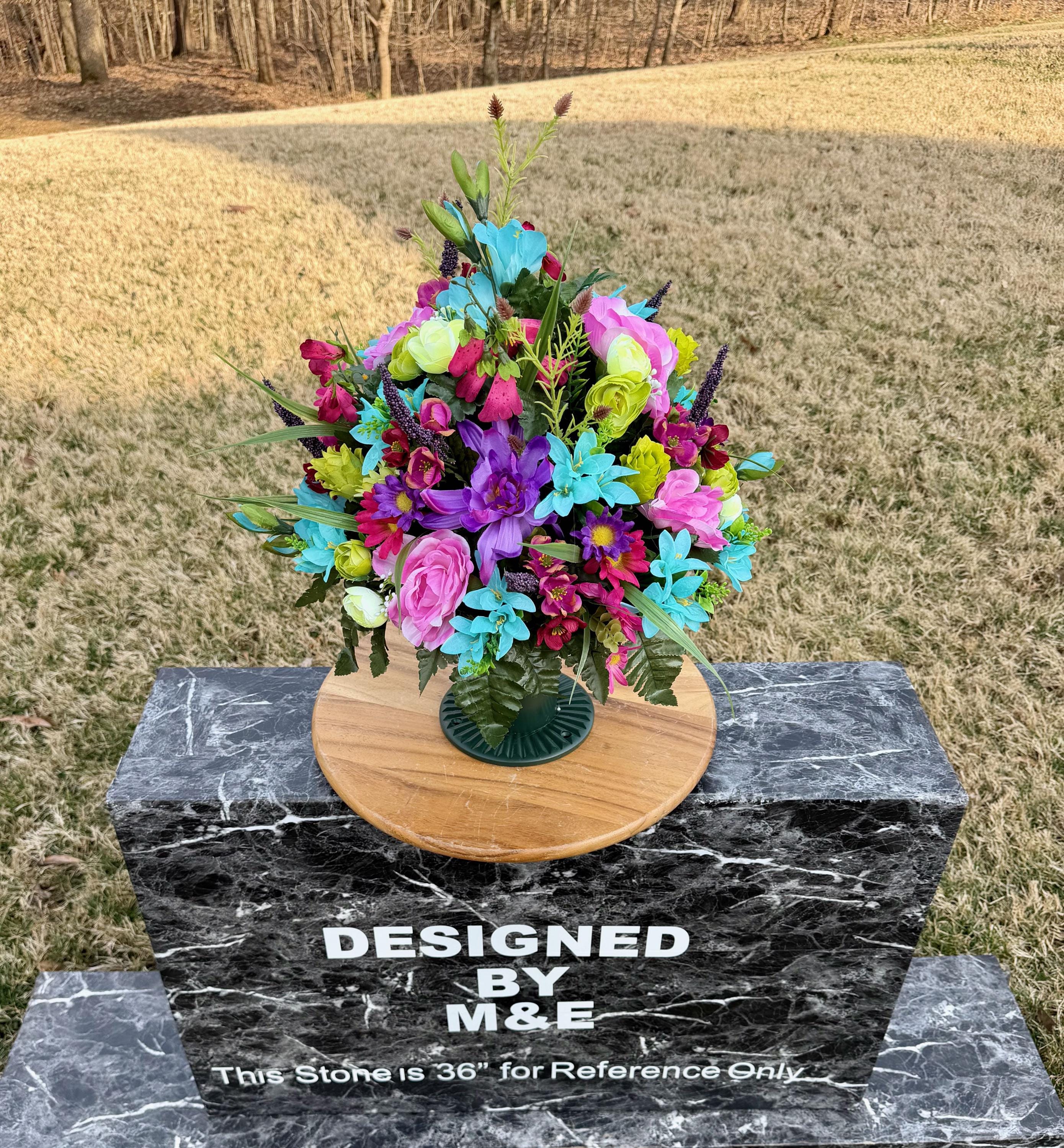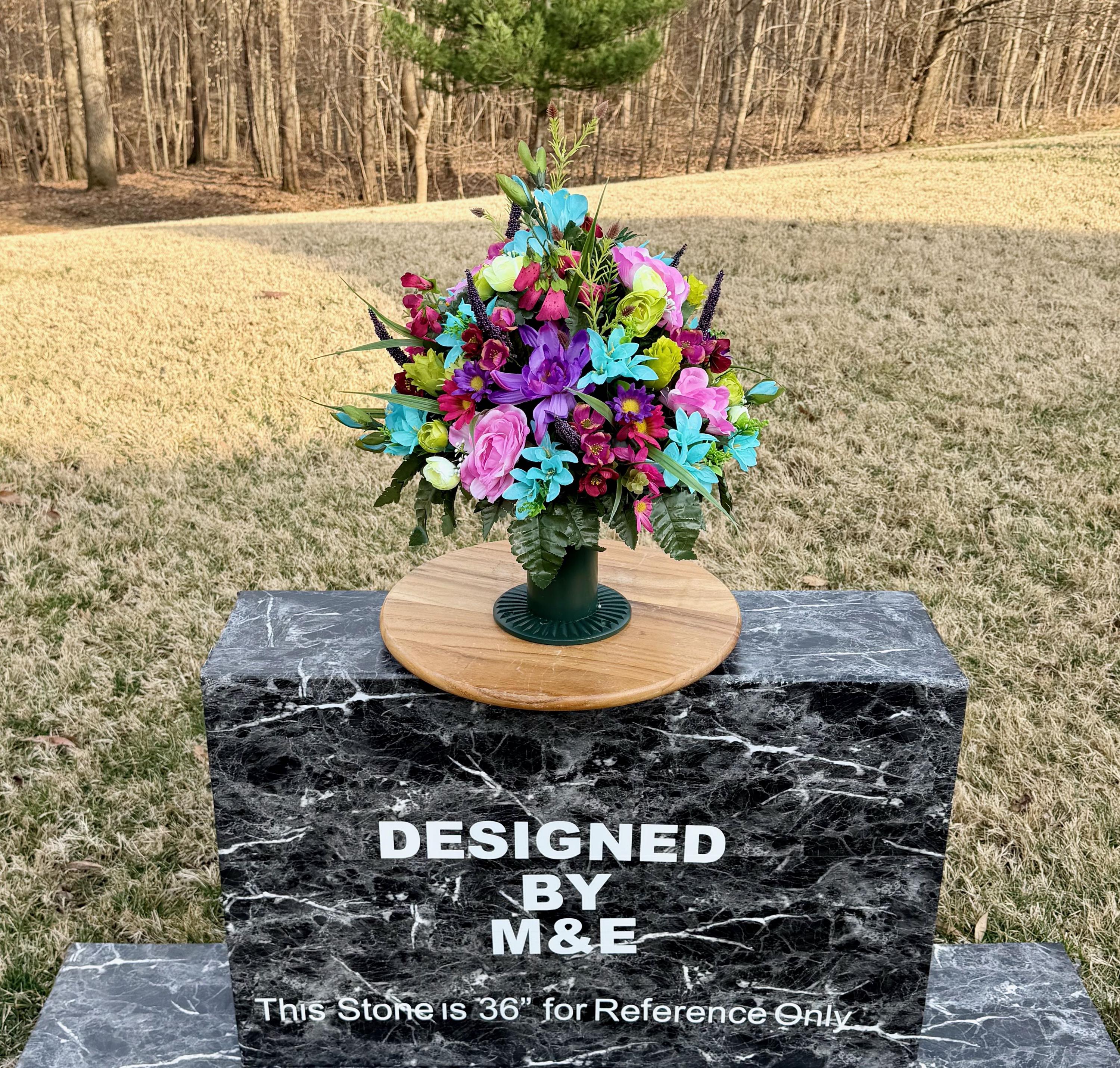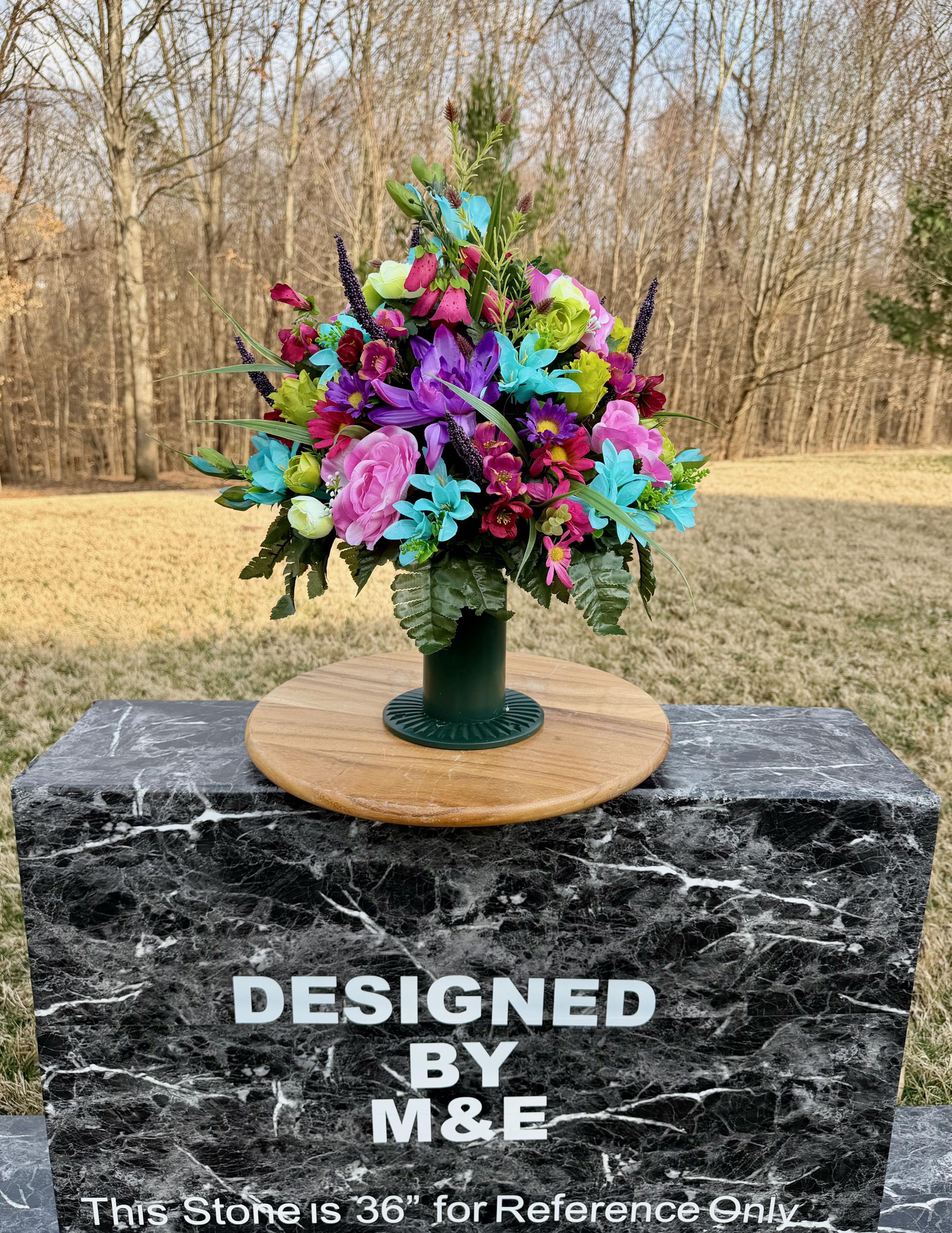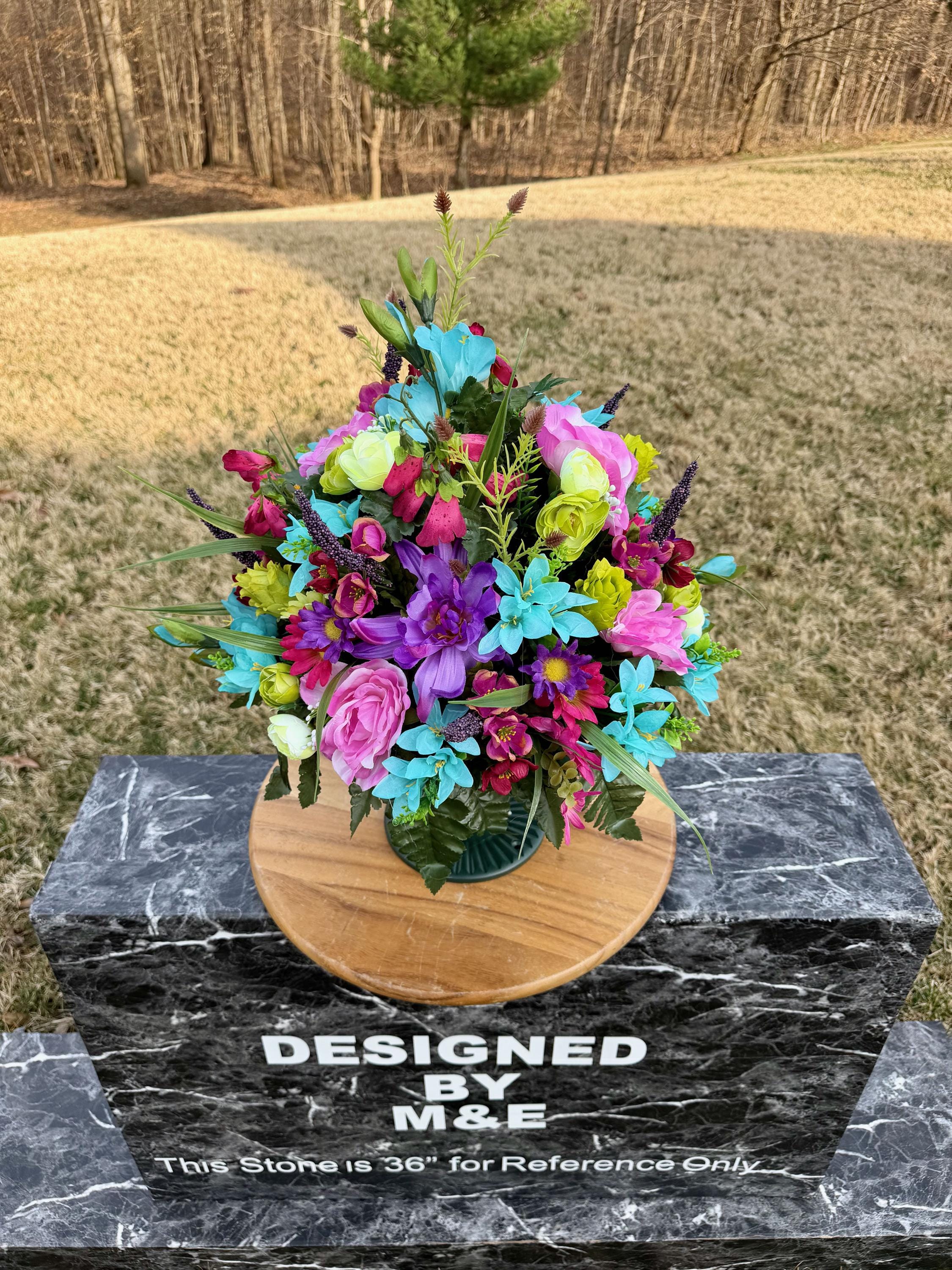We’re a small, family-operated business consisting of myself, my husband, and my daughter. We personally manage every order and strive for excellent customer service. All our arrangements use high-quality silk flowers, though all silk blooms may fade over time. Each stem is glued into foam to withstand the elements. Designed by M&E uses only premium silks, and we put genuine care into every piece we create. Rest assured, the arrangement shown in our photos is exactly the one you’ll receive, as I design and assemble each one myself. If you’re searching for something unique or have a particular flower, color, or matching vases in mind, please contact me to discuss a custom order.