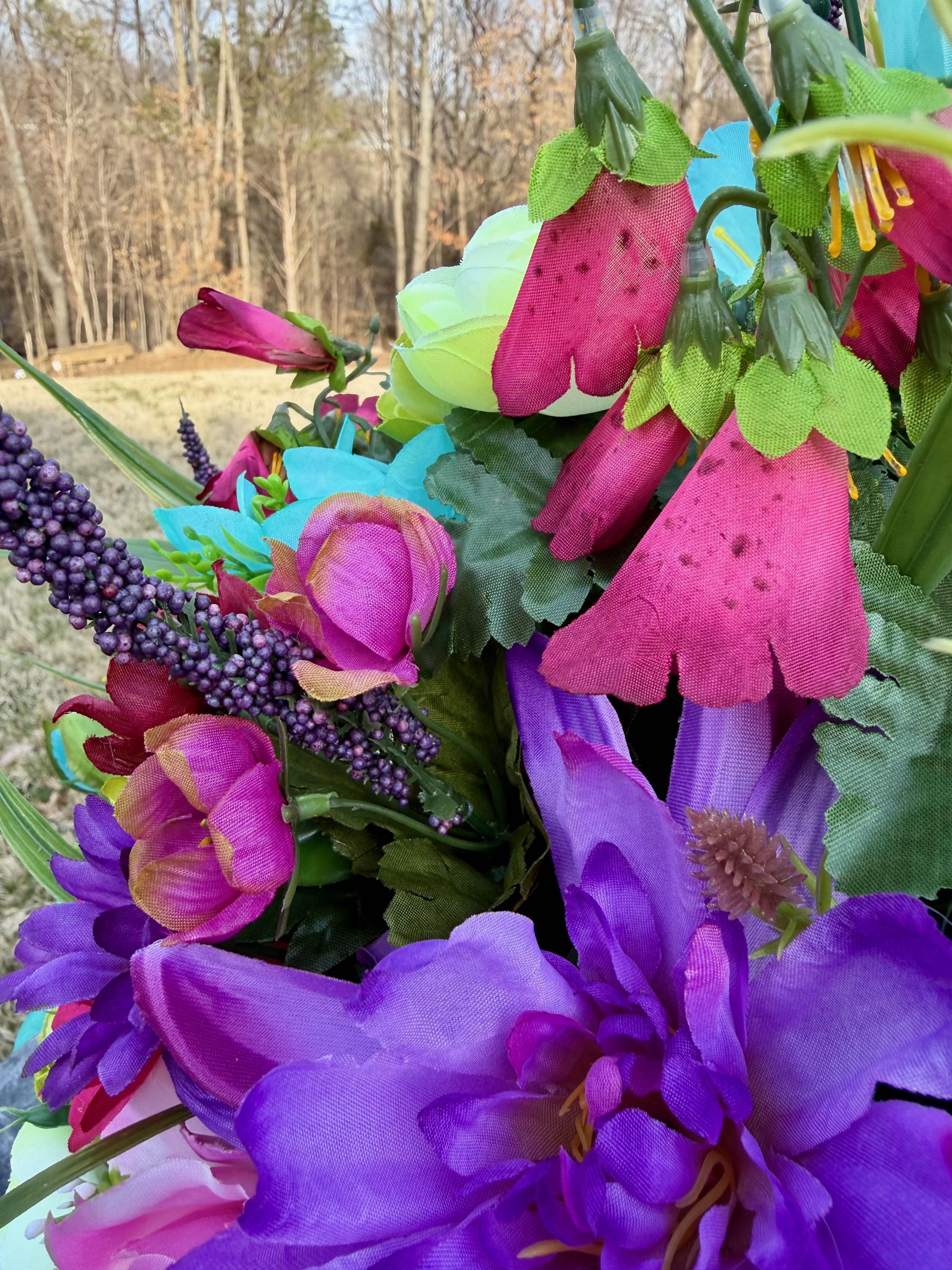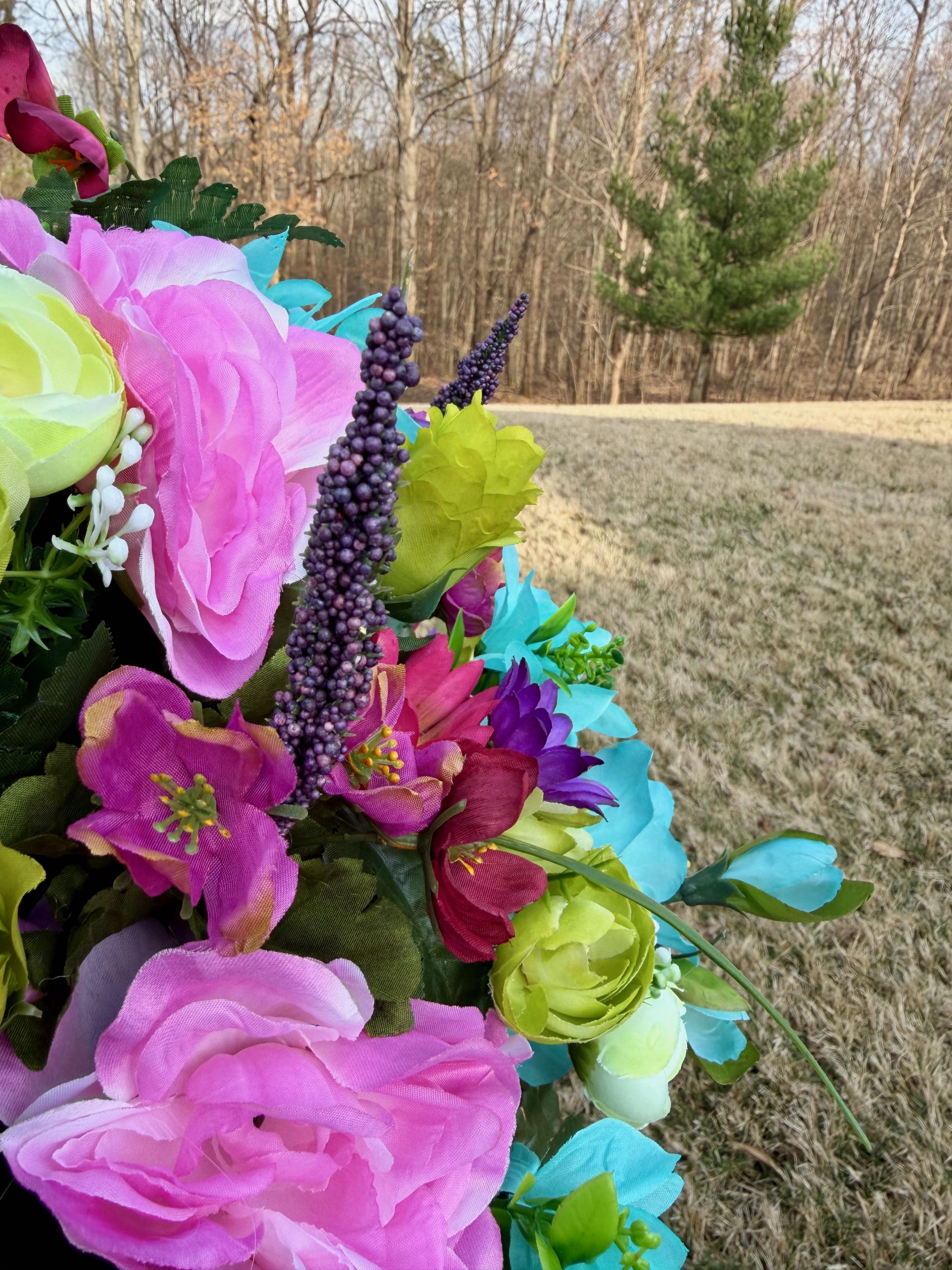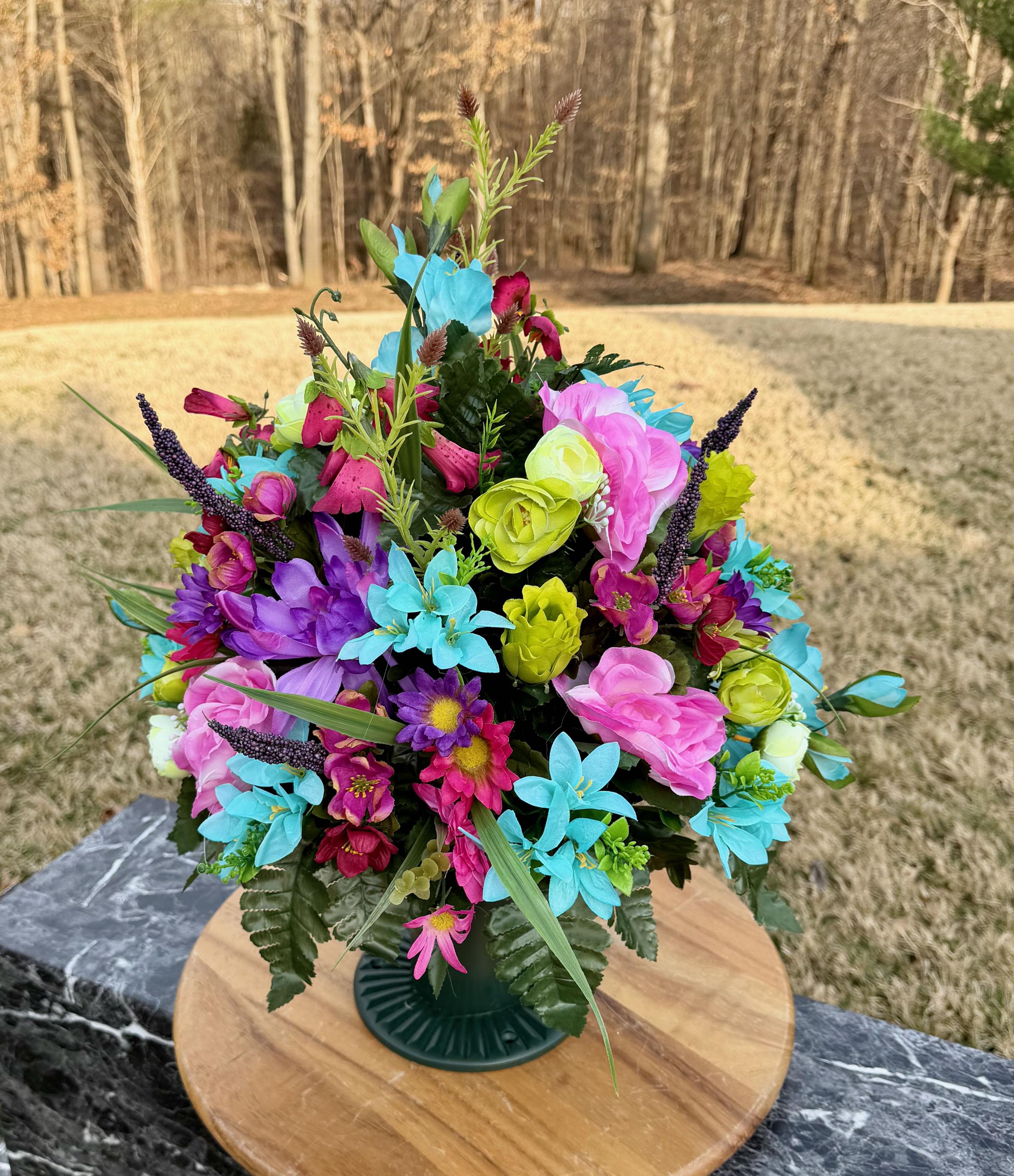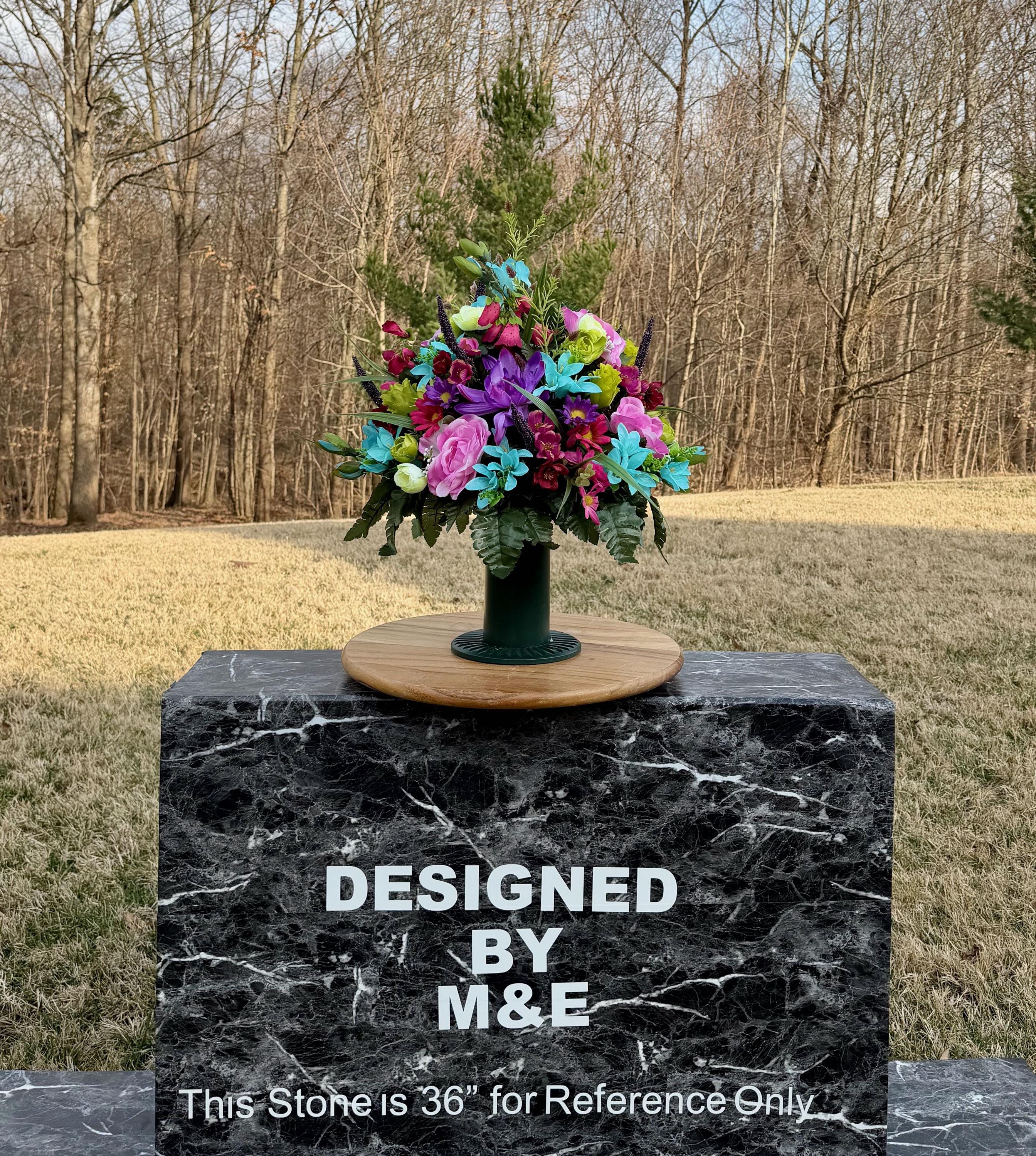 We’re a small, family-operated business consisting of myself, my husband, and my daughter. We personally manage every order and strive for excellent customer service. All our arrangements use high-quality silk flowers, though all silk blooms may fade over time. Each stem is glued into foam to withstand the elements. Designed by M&E uses only premium silks, and we put genuine care into every piece we create. Rest assured, the arrangement shown in our photos is exactly the one you’ll receive, as I design and assemble each one myself. If you’re searching for something unique or have a particular flower, color, or matching vases in mind, please contact me to discuss a custom order.