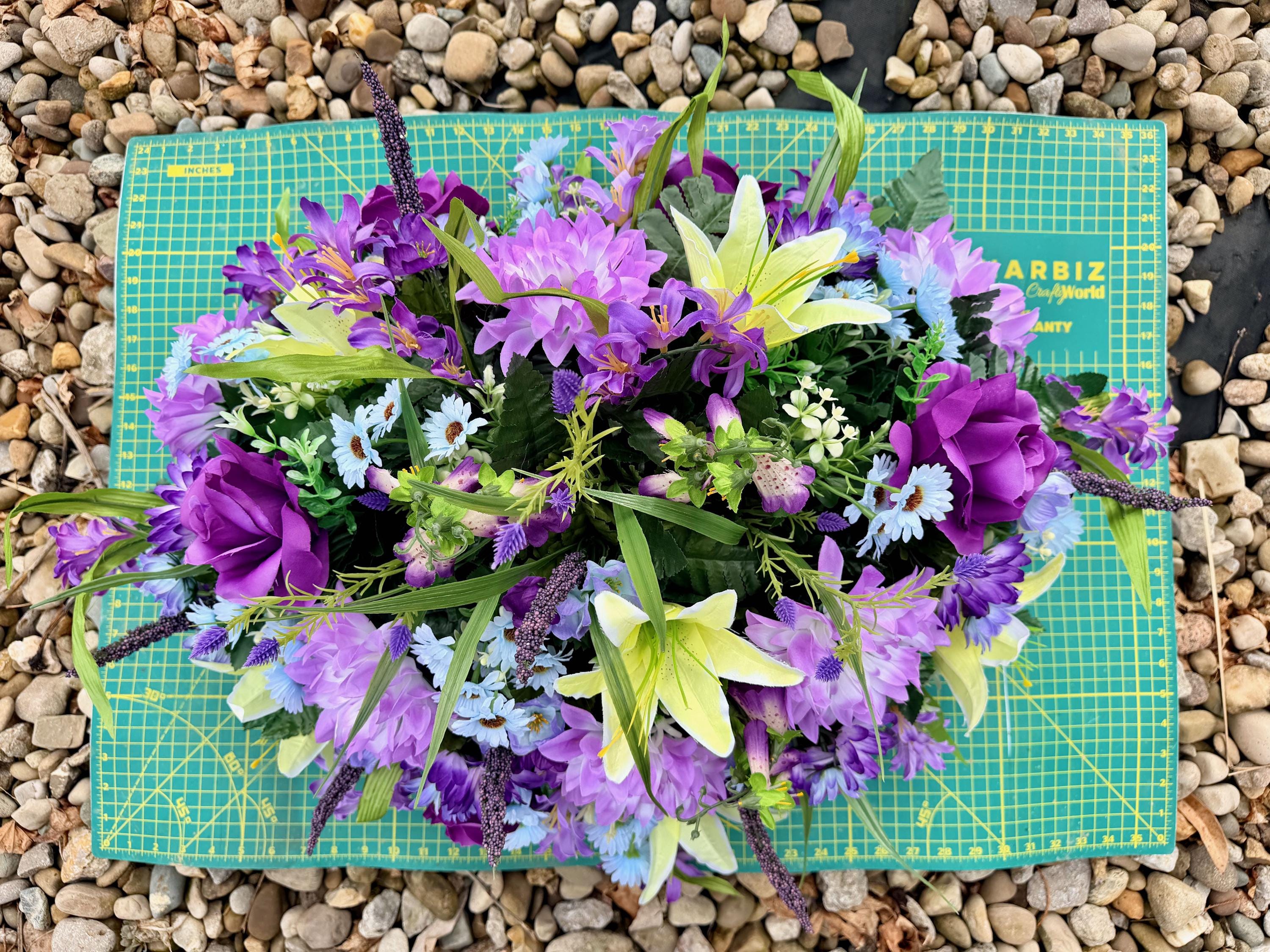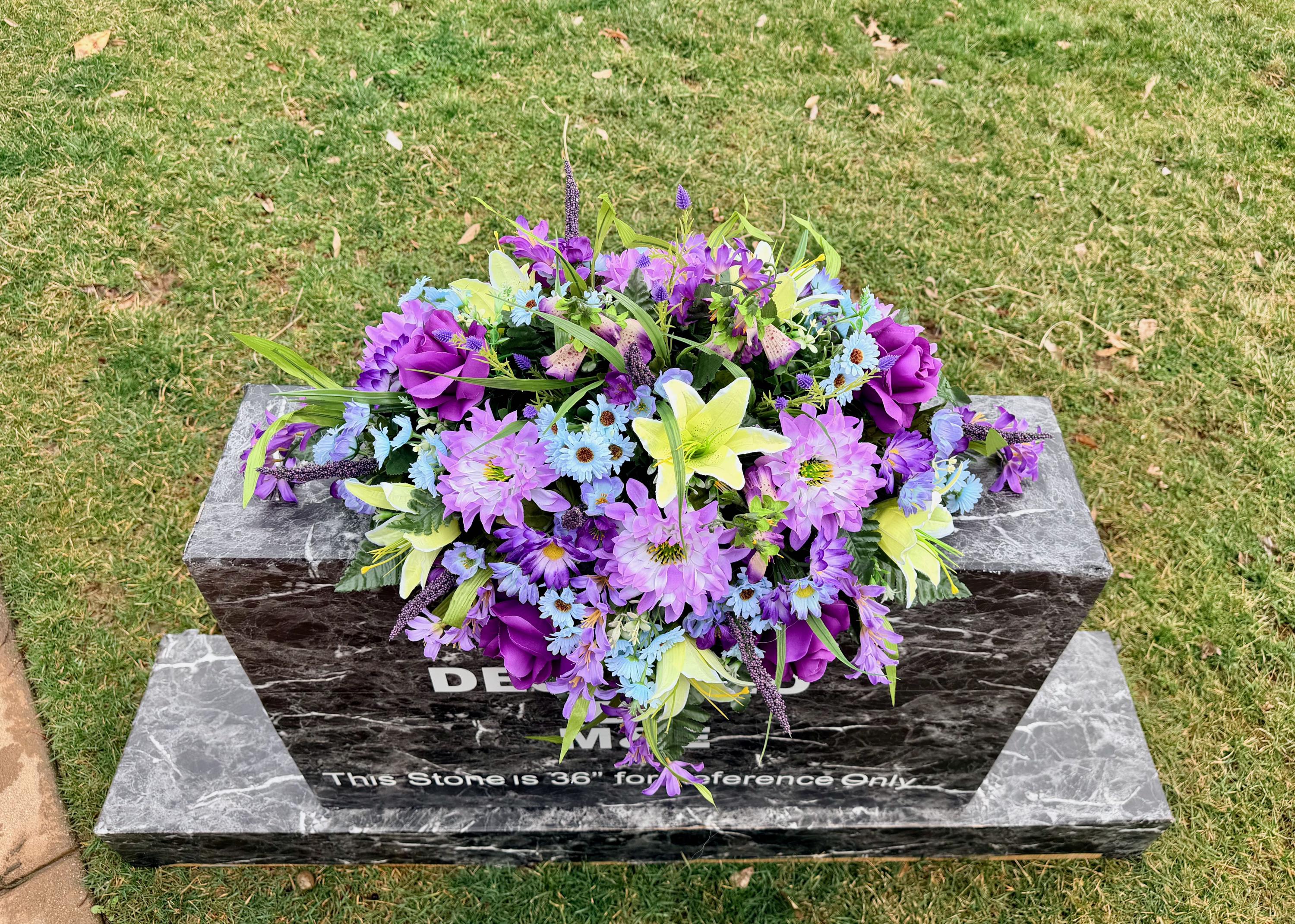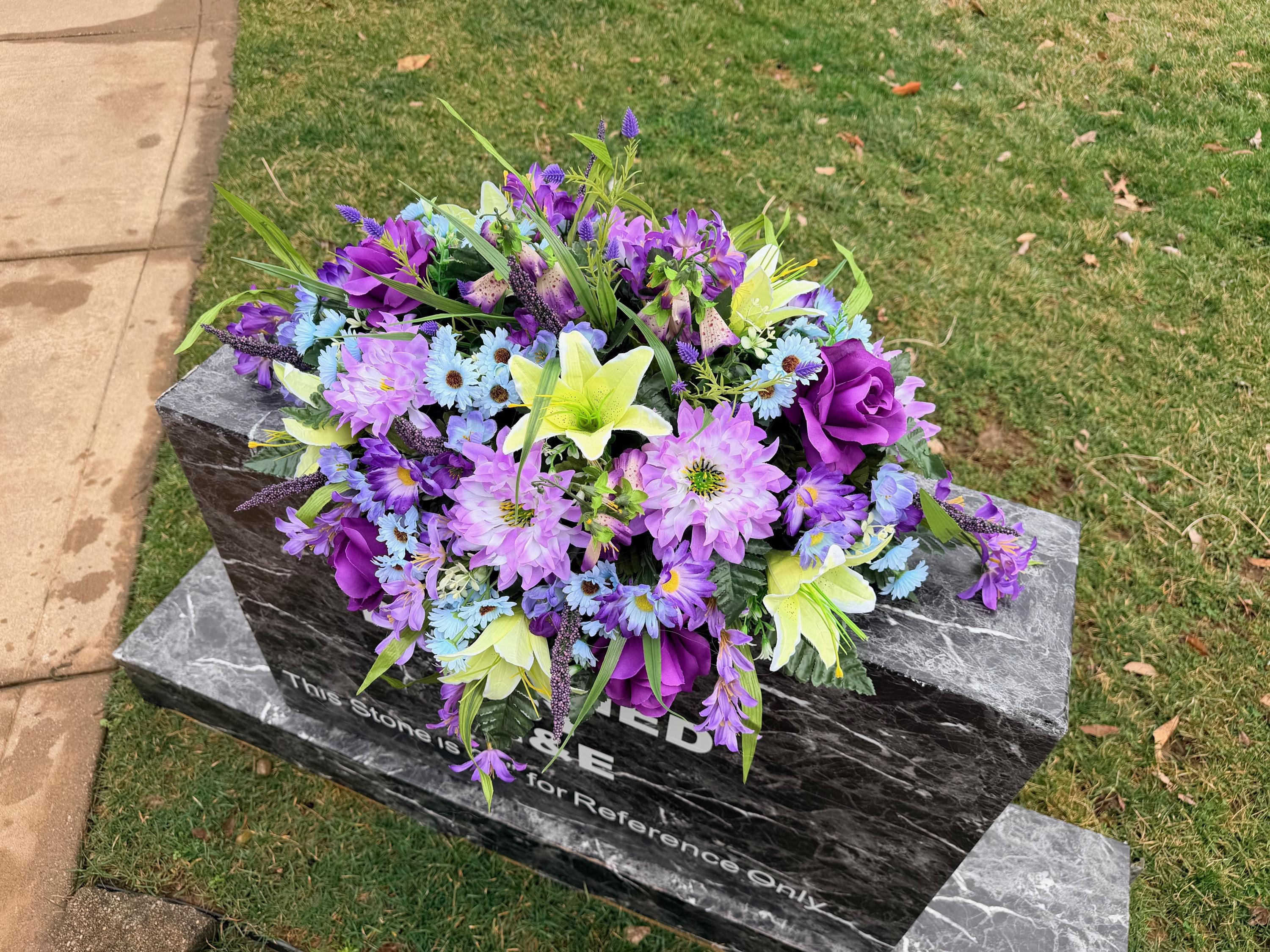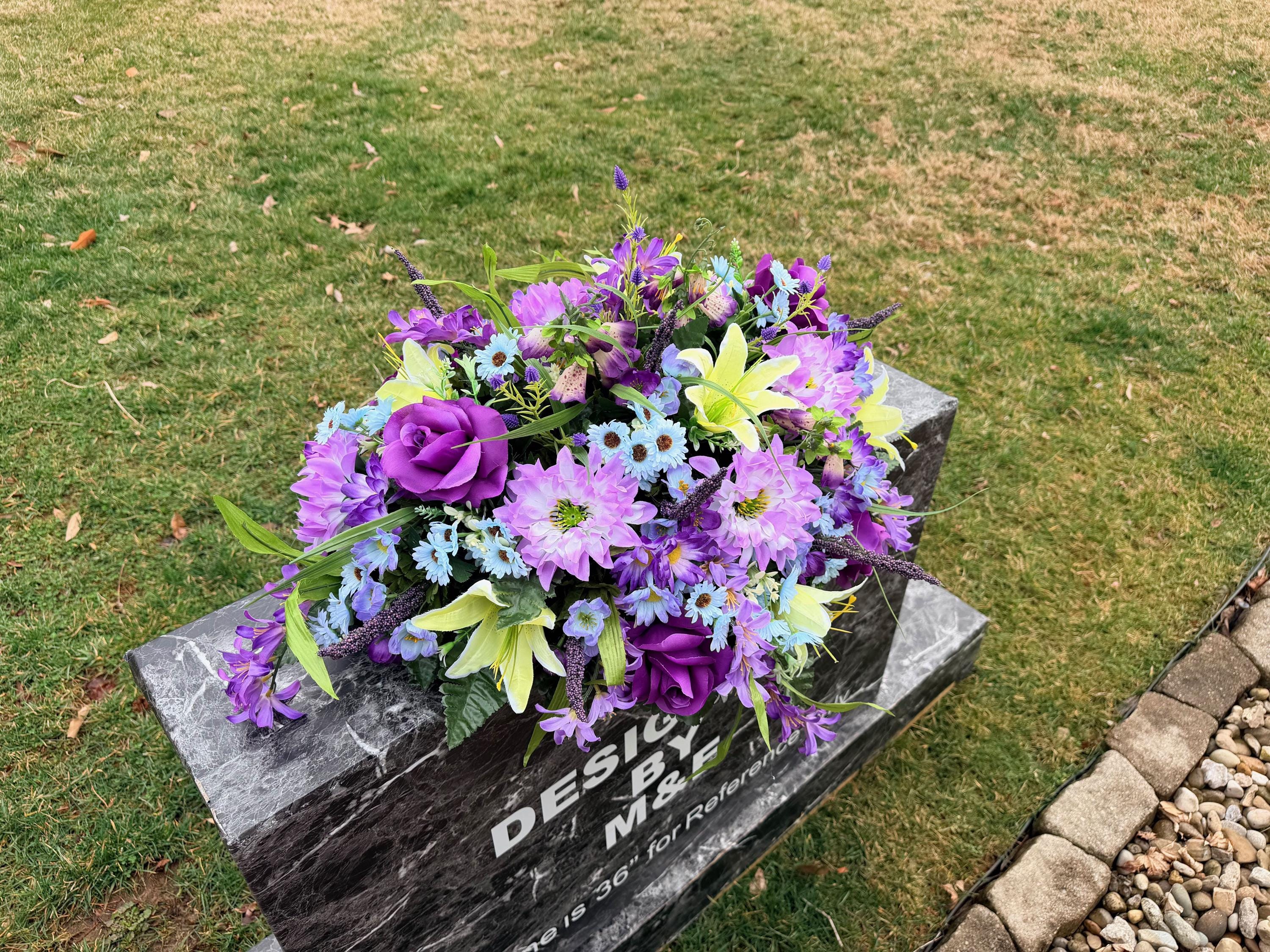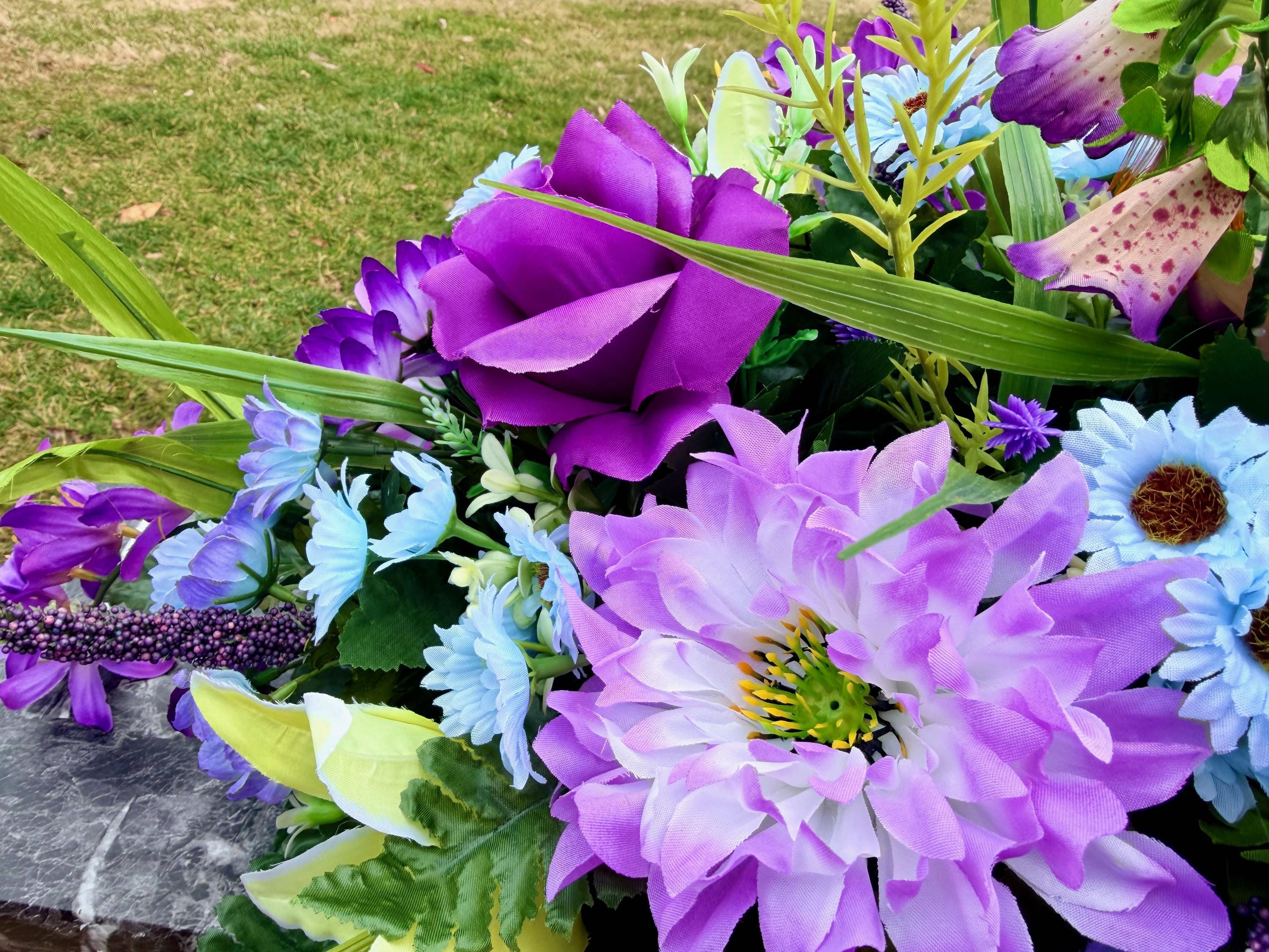 Blue, Yellow and Purple Quality Silk Flowers, Cemetery Saddle, Cemetery Flowers, Headstone Saddle, Cemetery Arrangement, Memorial Day Flower