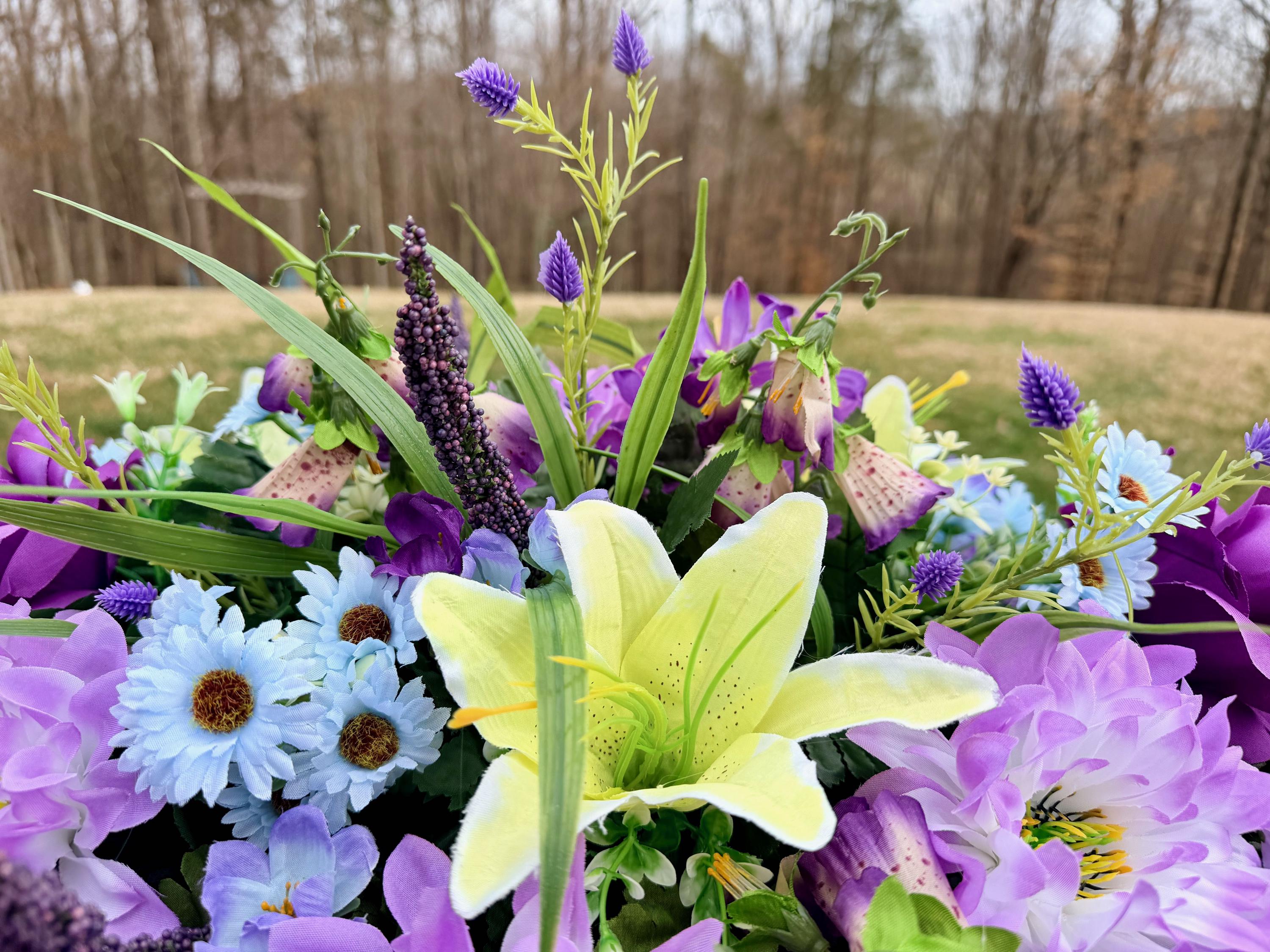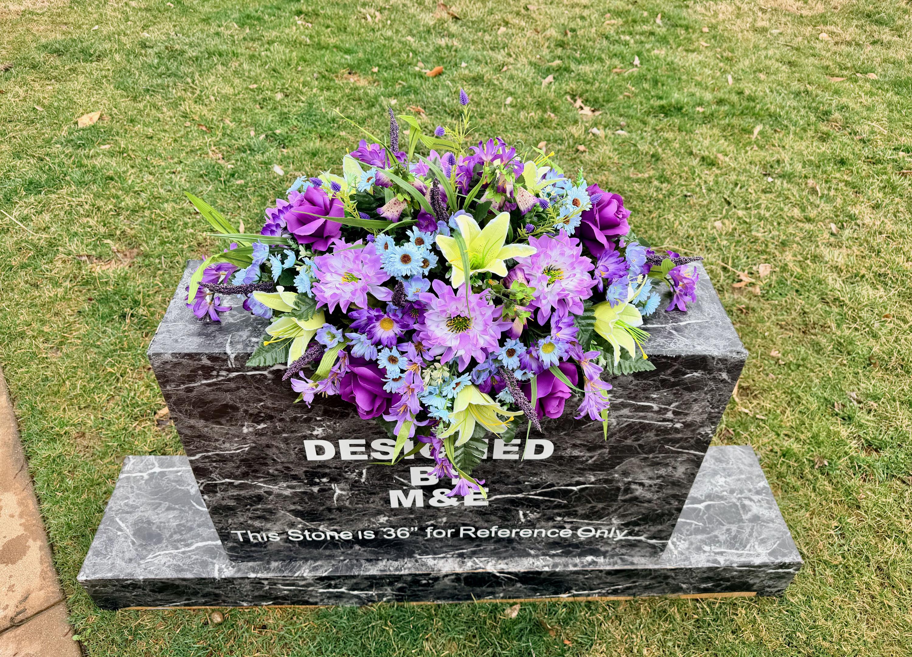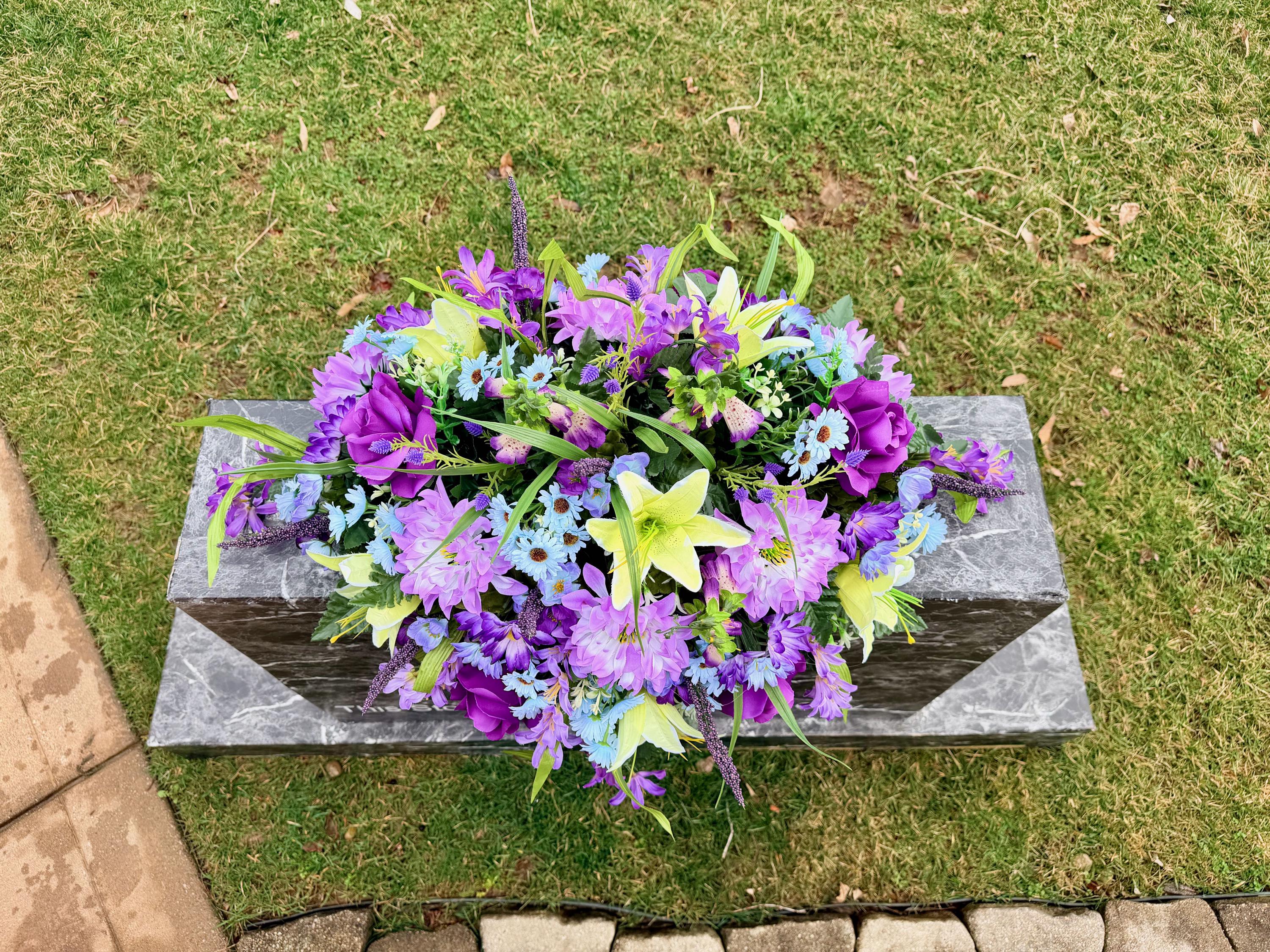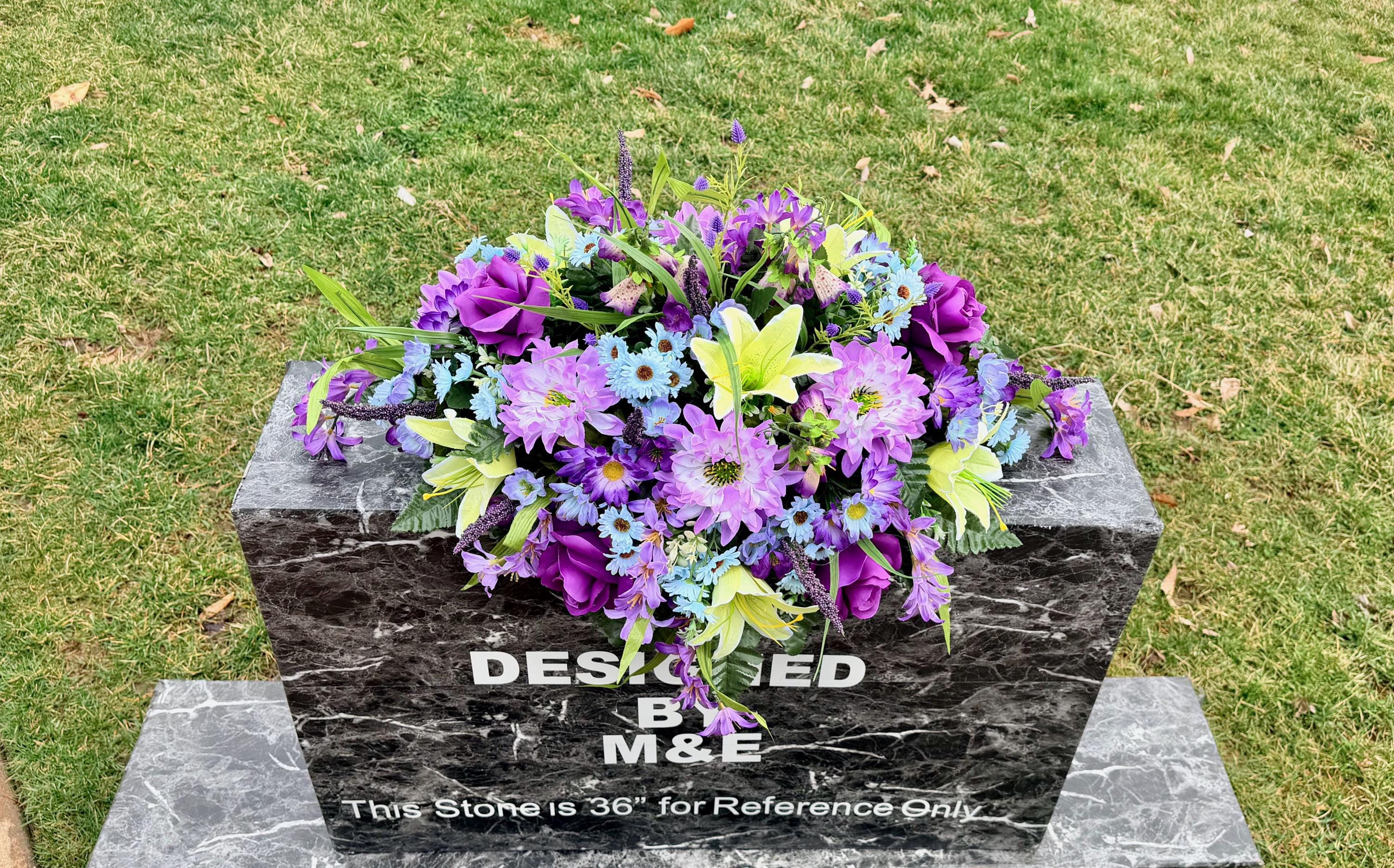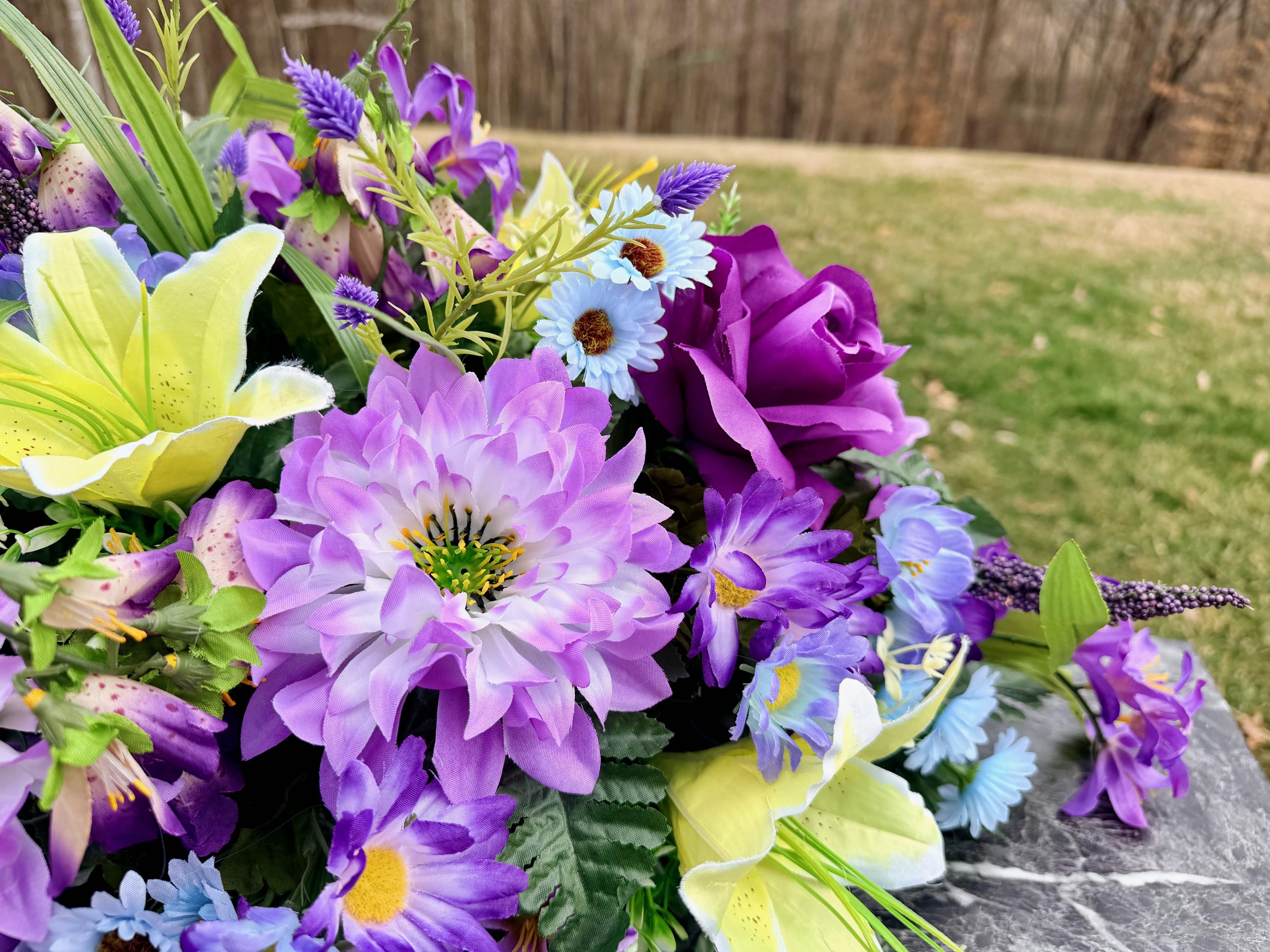 Blue, Yellow and Purple Quality Silk Flowers, Cemetery Saddle, Cemetery Flowers, Headstone Saddle, Cemetery Arrangement, Memorial Day Flower