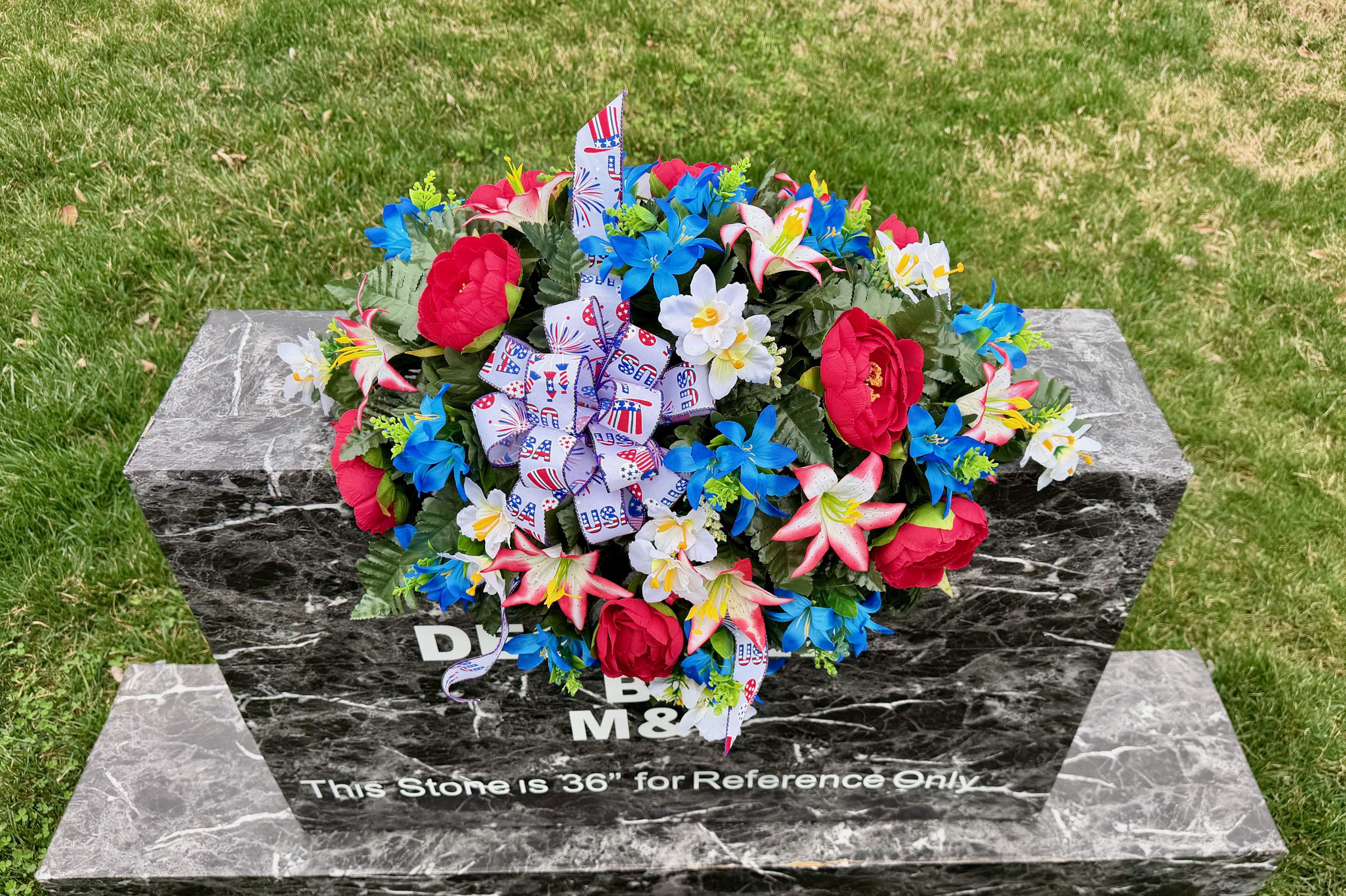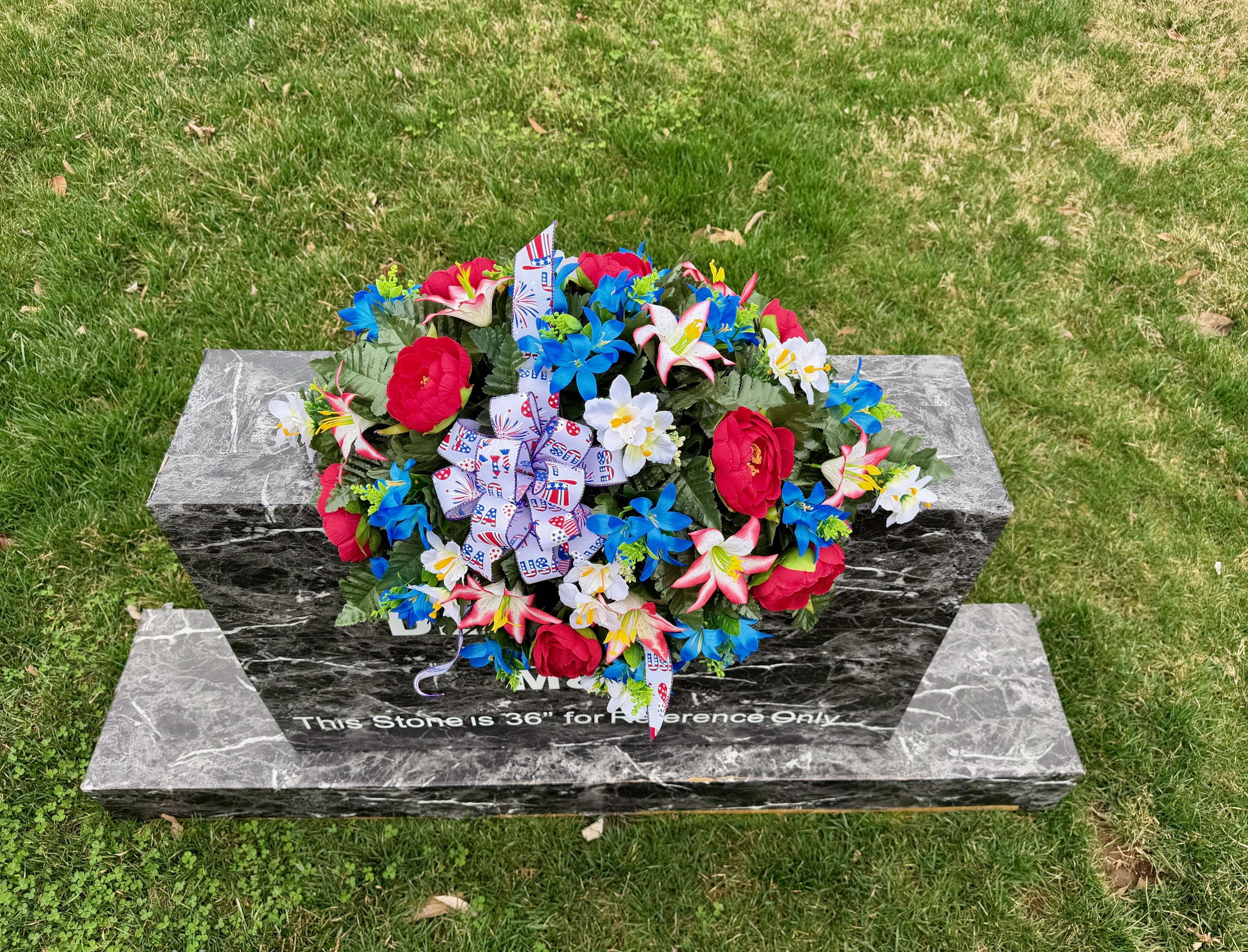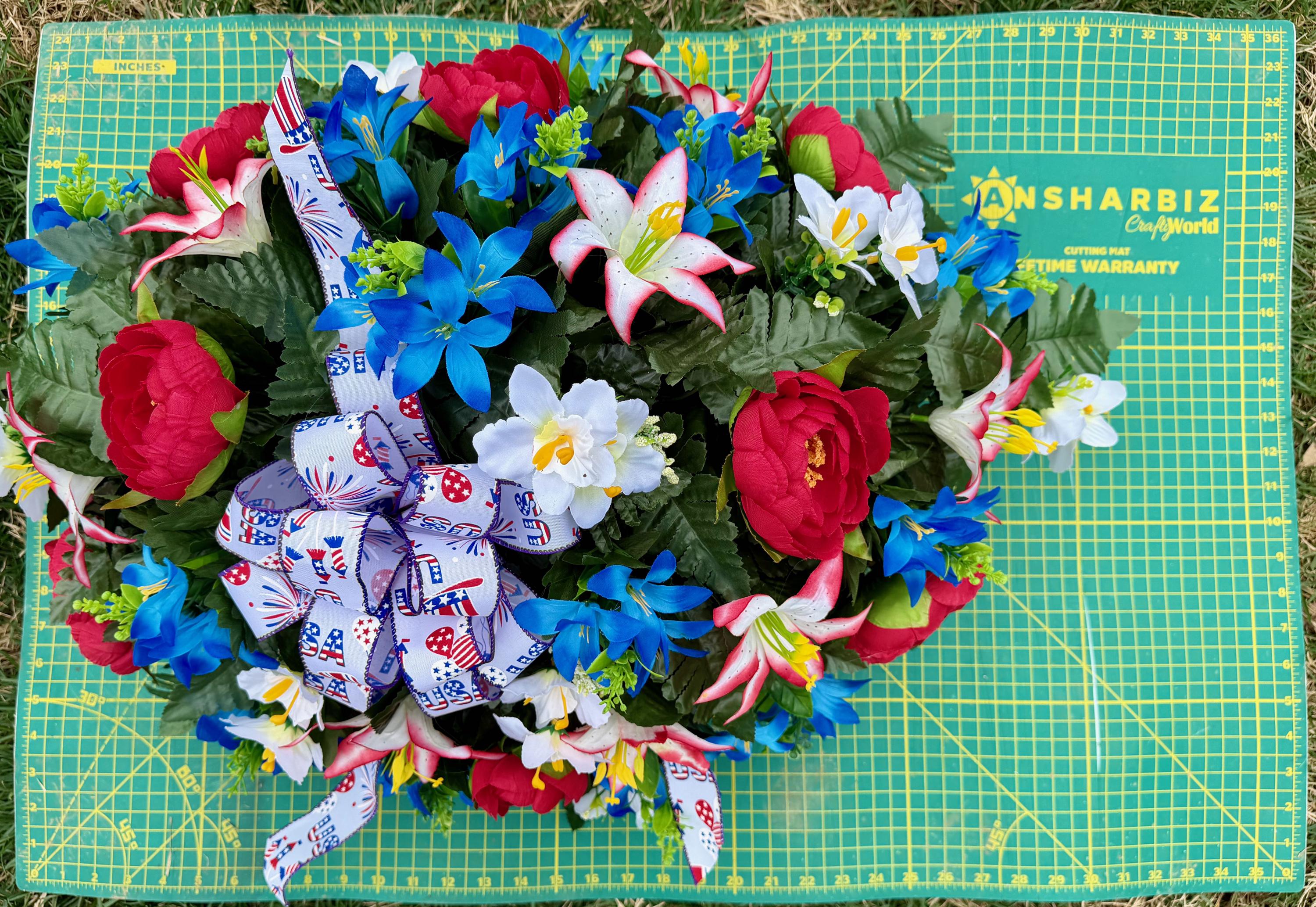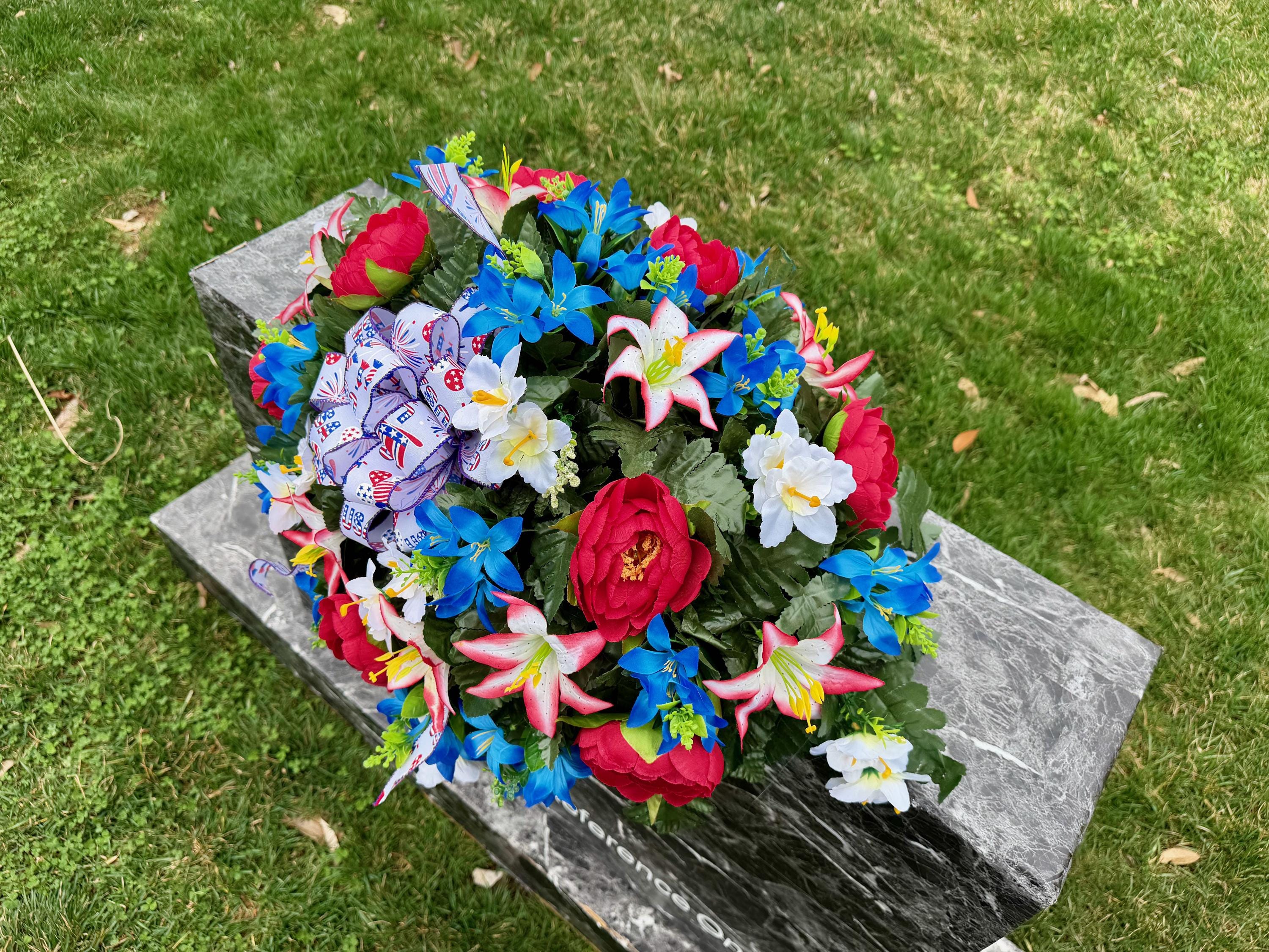 USA Ribbon with Red, White and Blue Flowers Cemetery Saddle: Red, White & Blue Silk Memorial Flowers