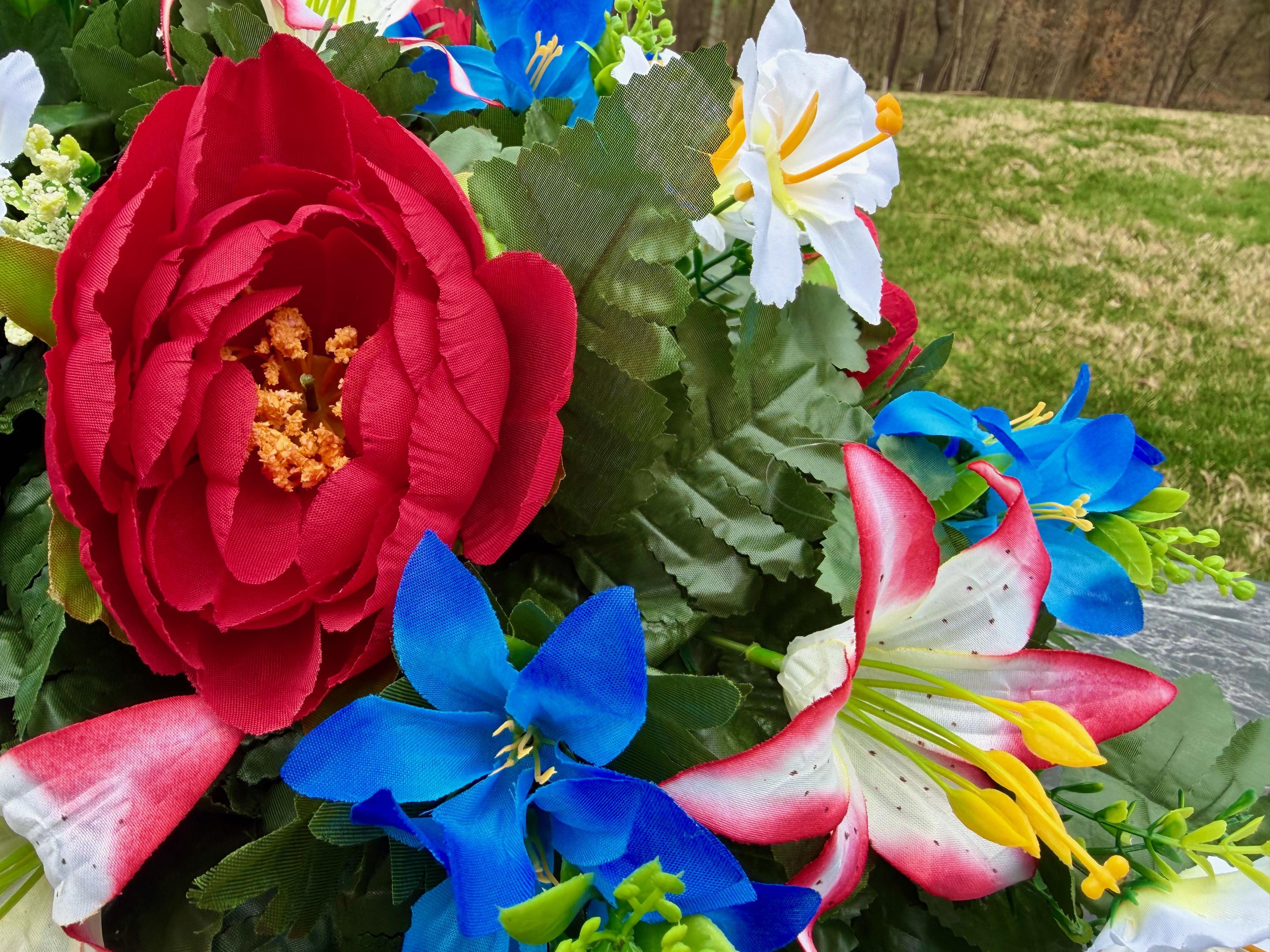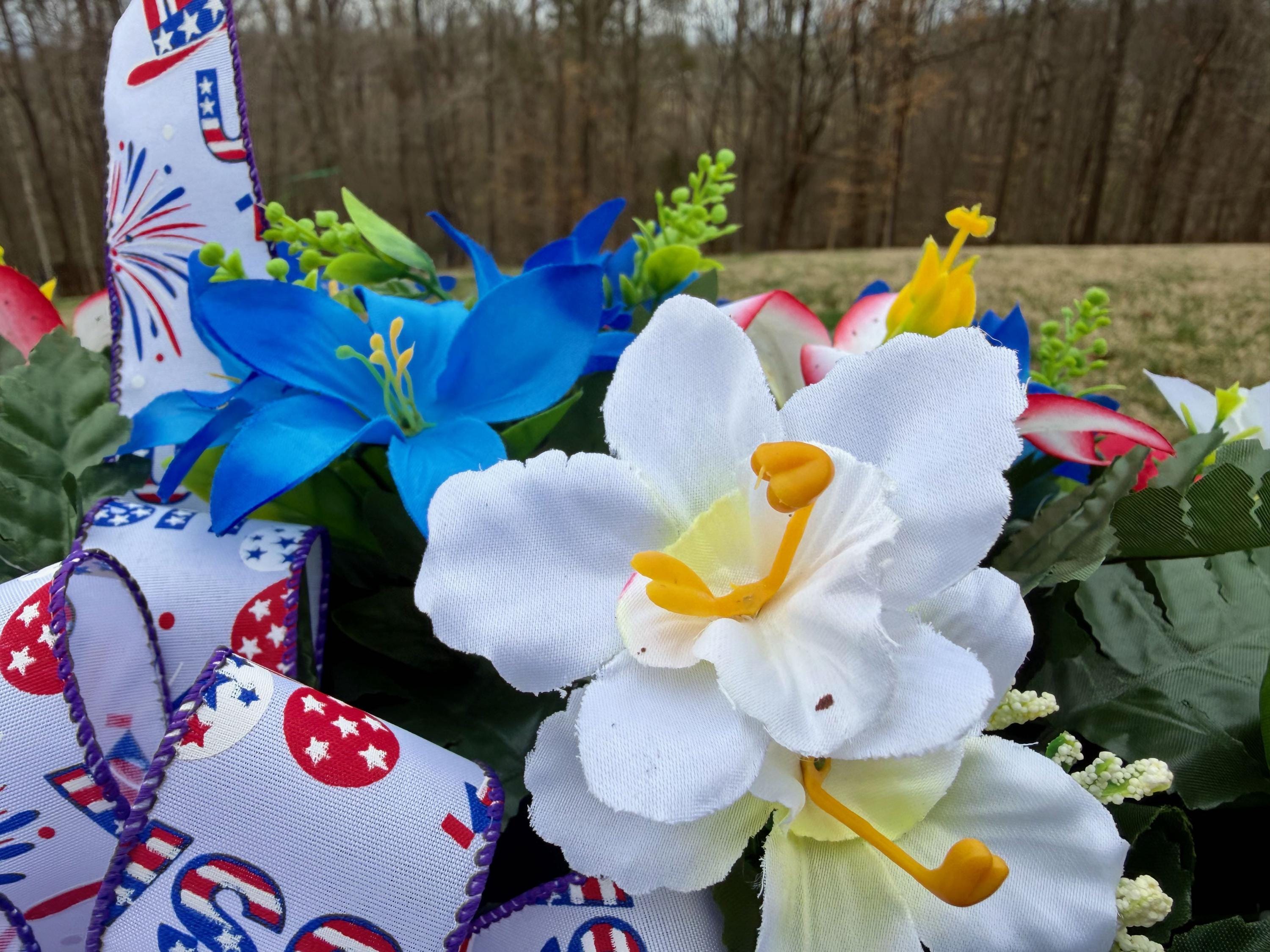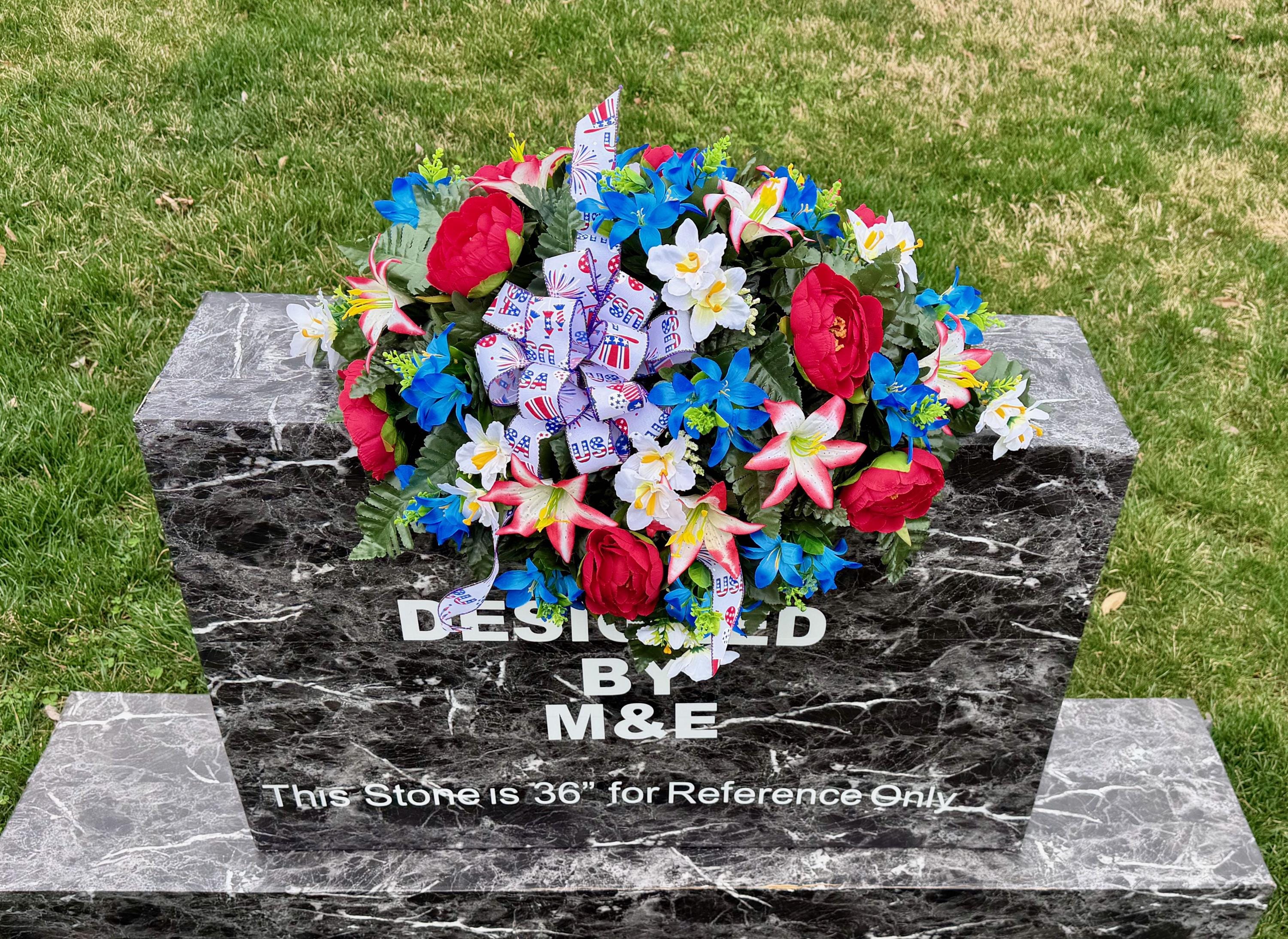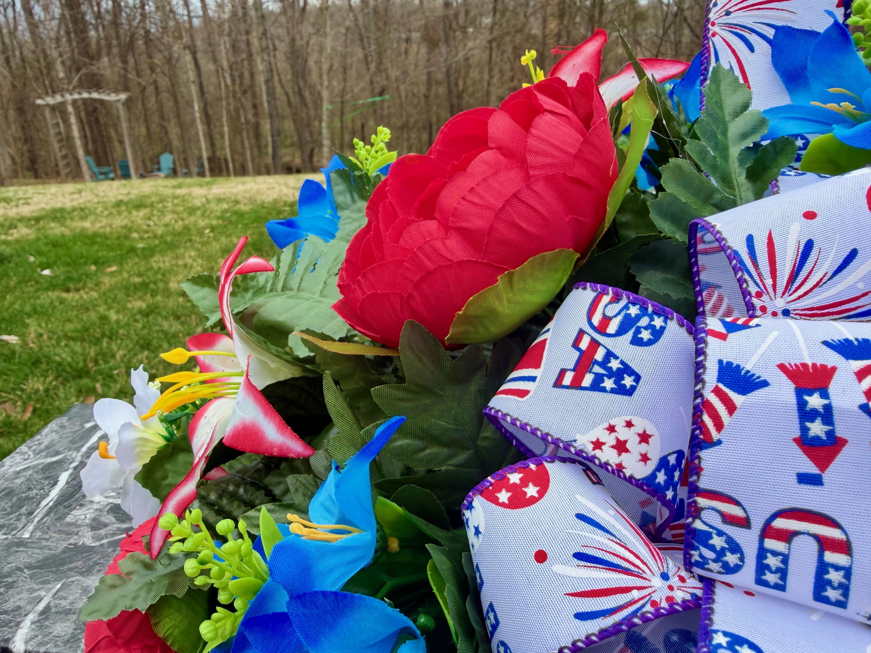 USA Ribbon with Red, White and Blue Flowers Cemetery Saddle: Red, White & Blue Silk Memorial Flowers