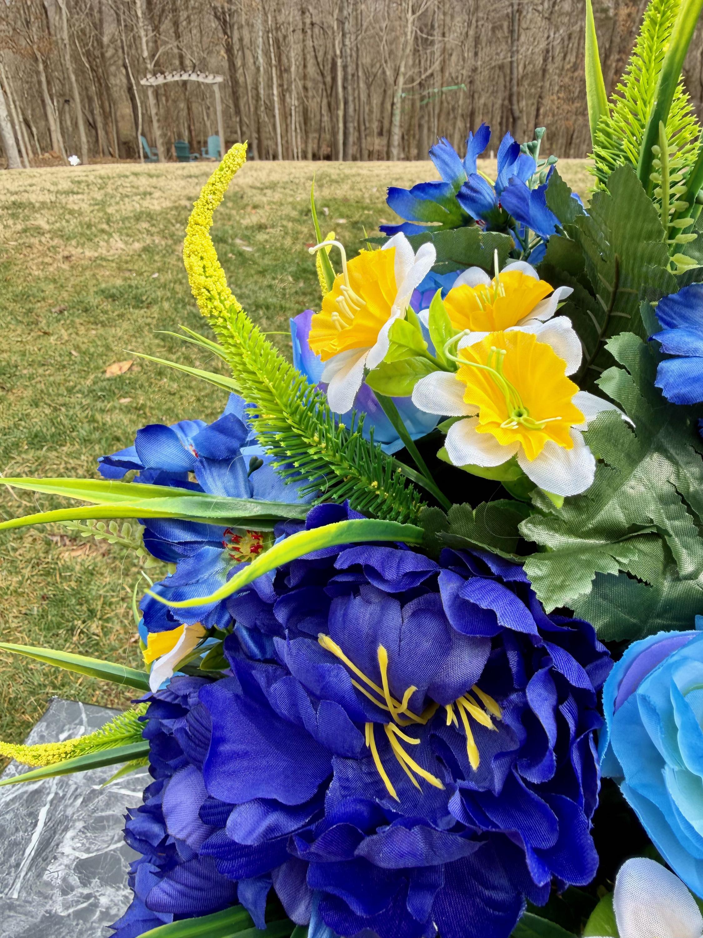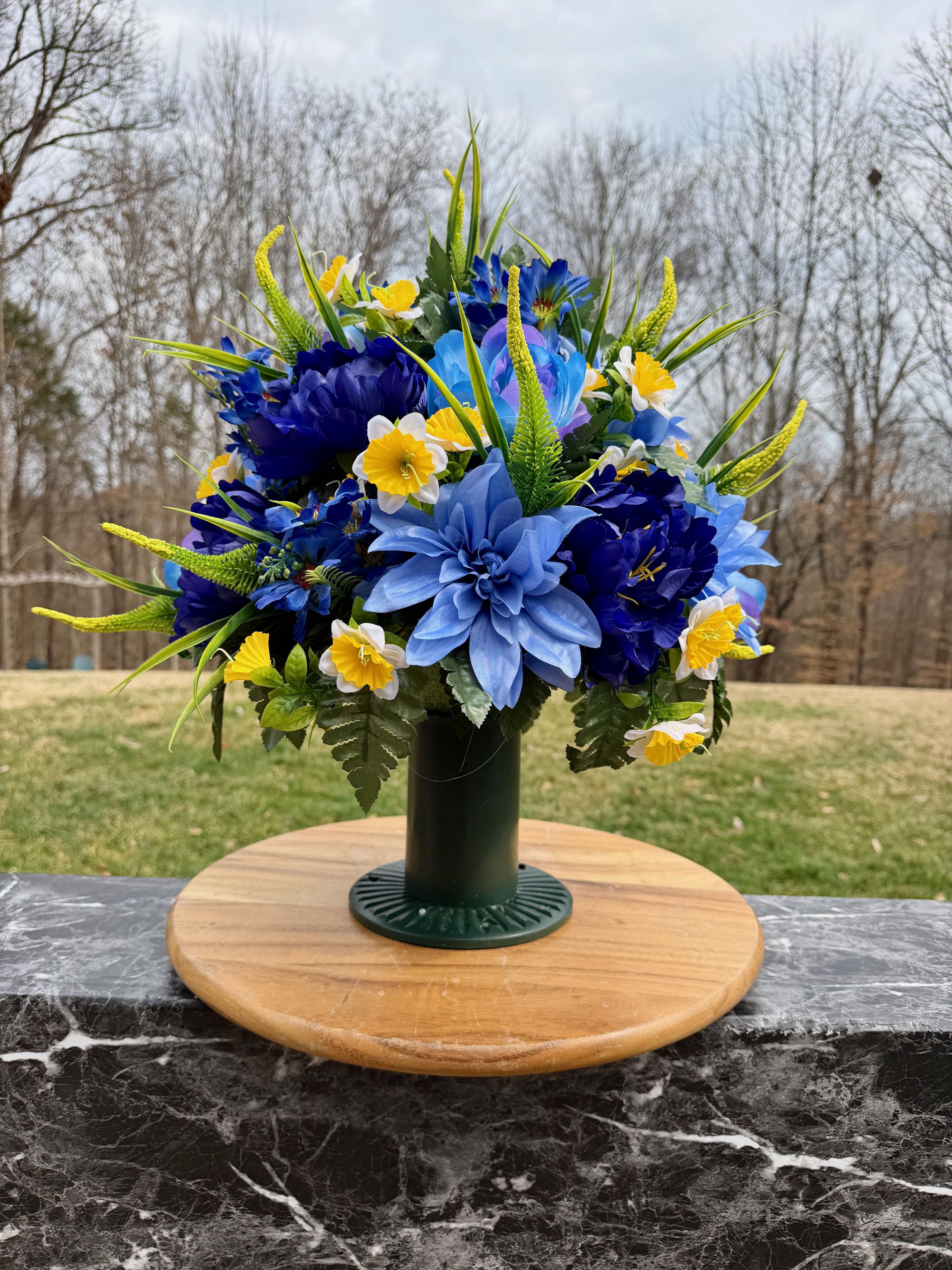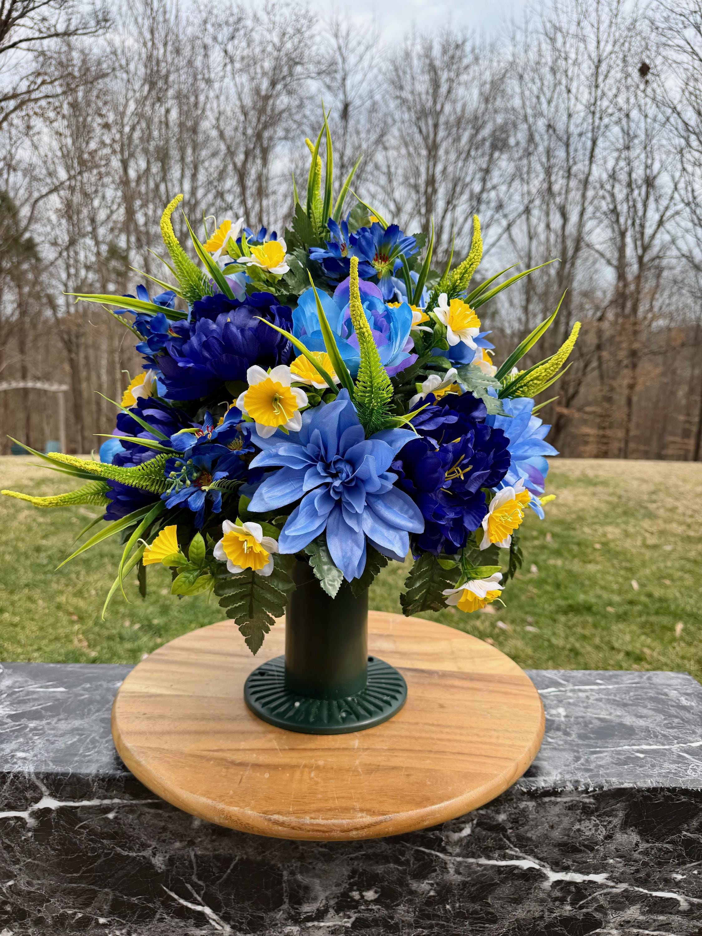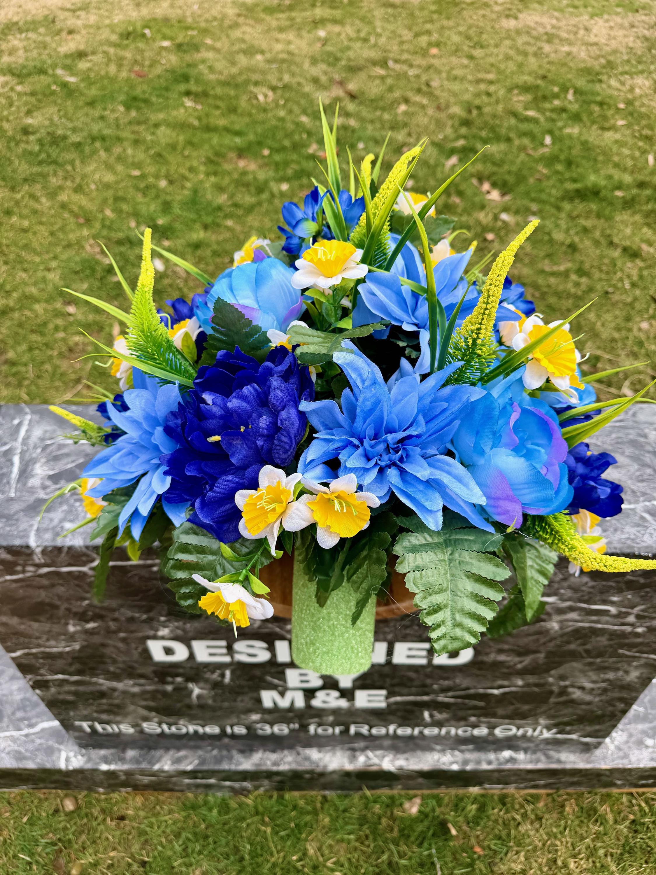 Blue and Yellow Cemetery Vase Arrangement, Headstone Arrangement, Memorial Flowers