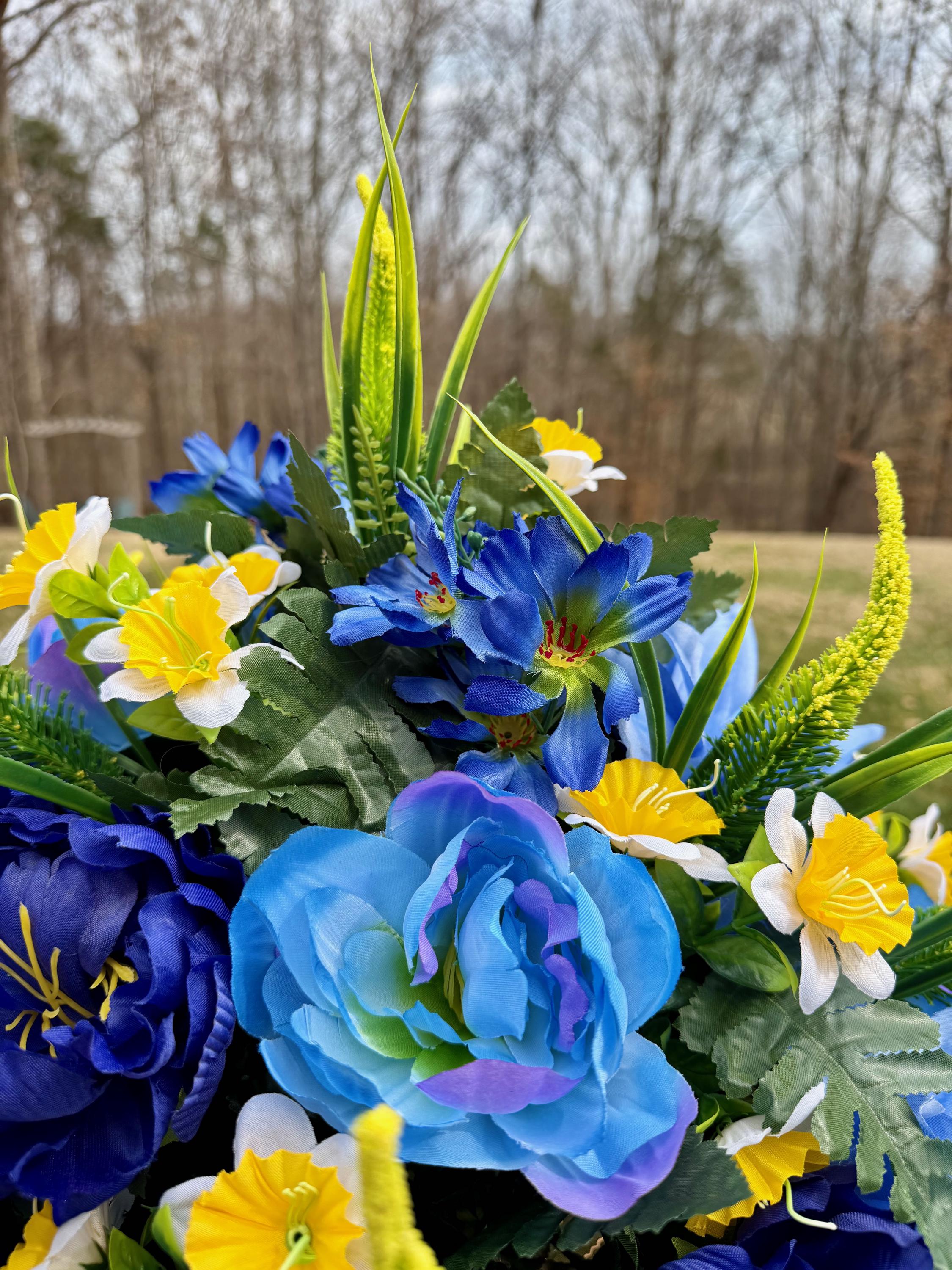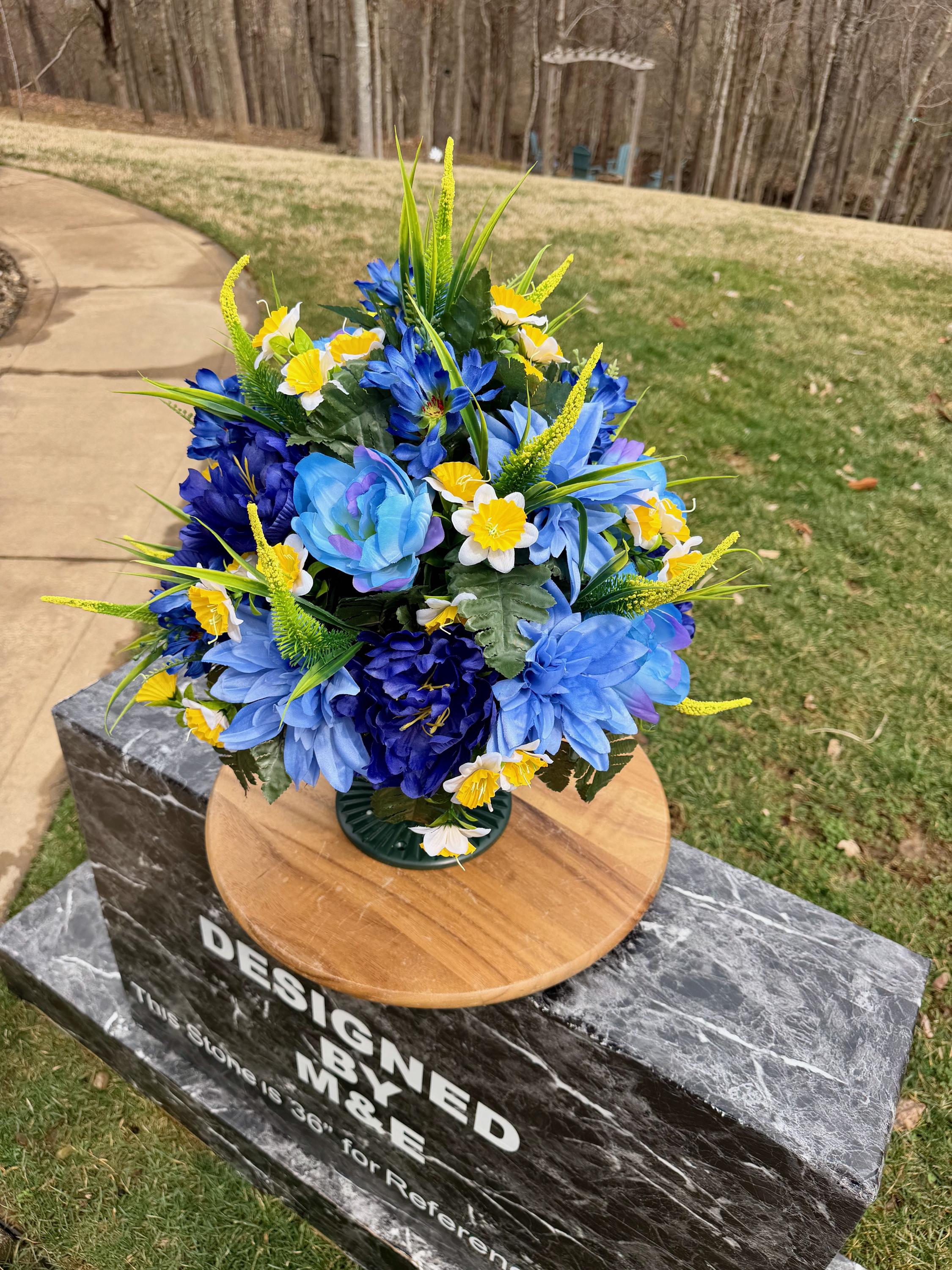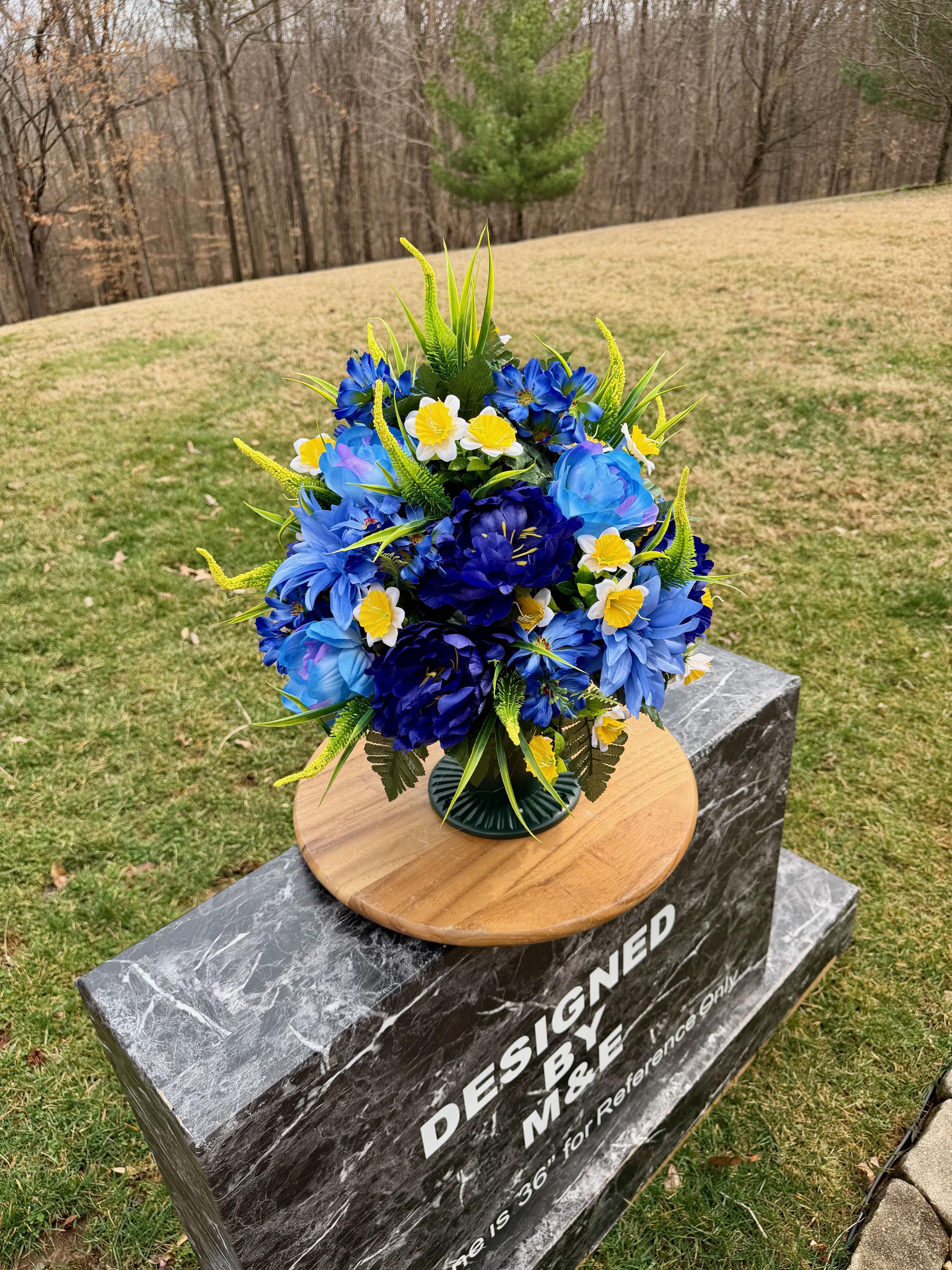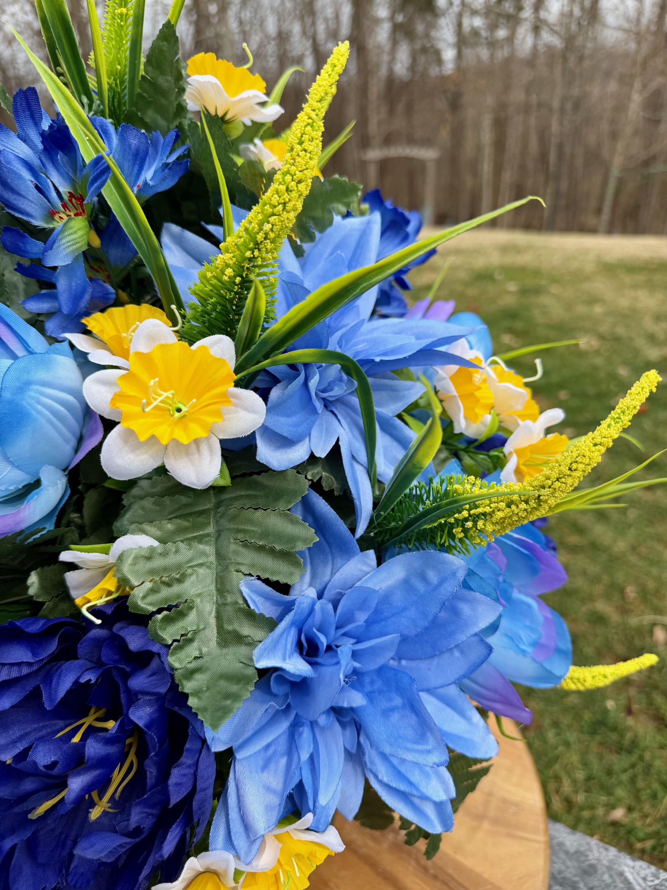 Blue and Yellow Cemetery Vase Arrangement, Headstone Arrangement, Memorial Flowers