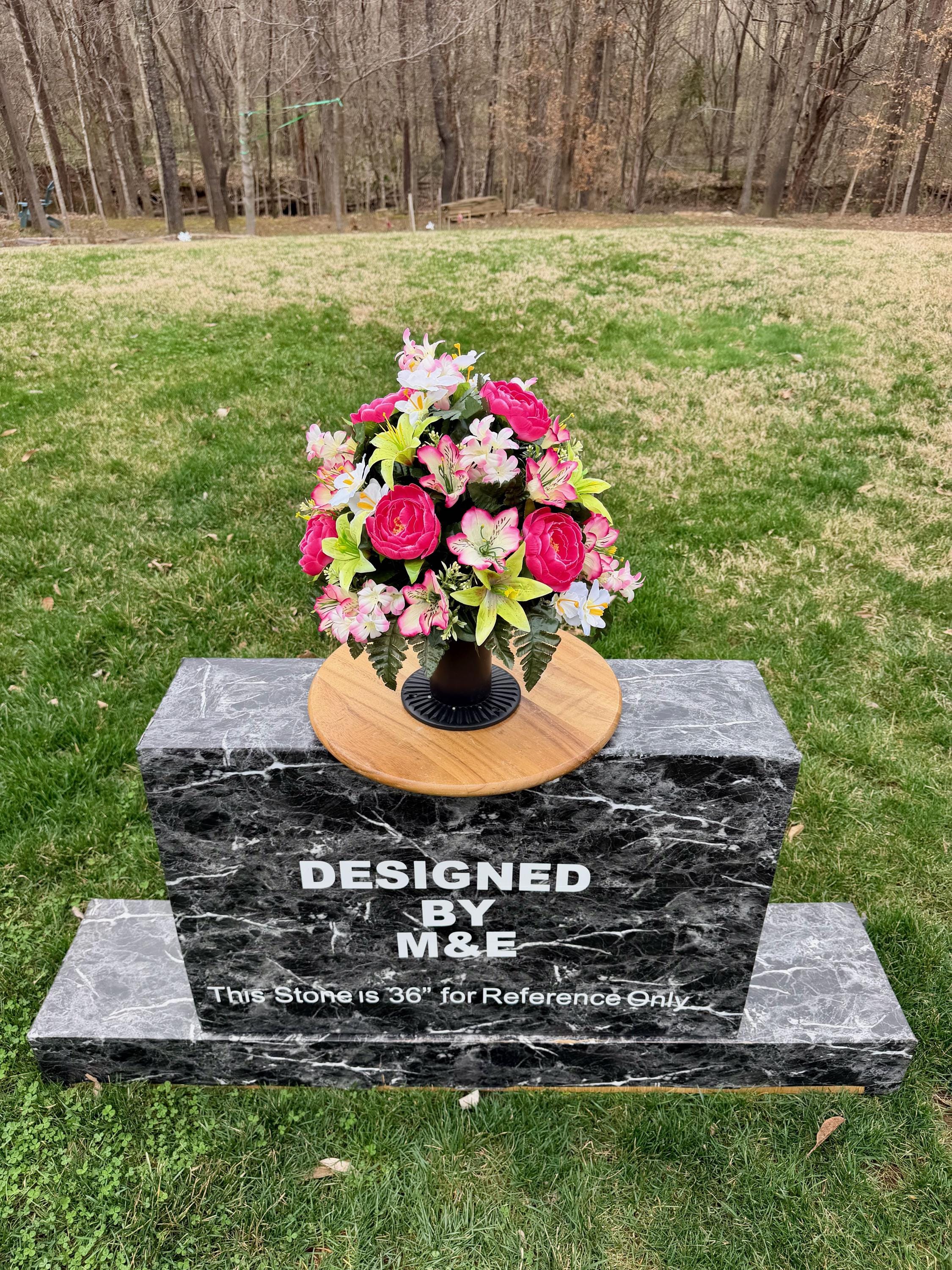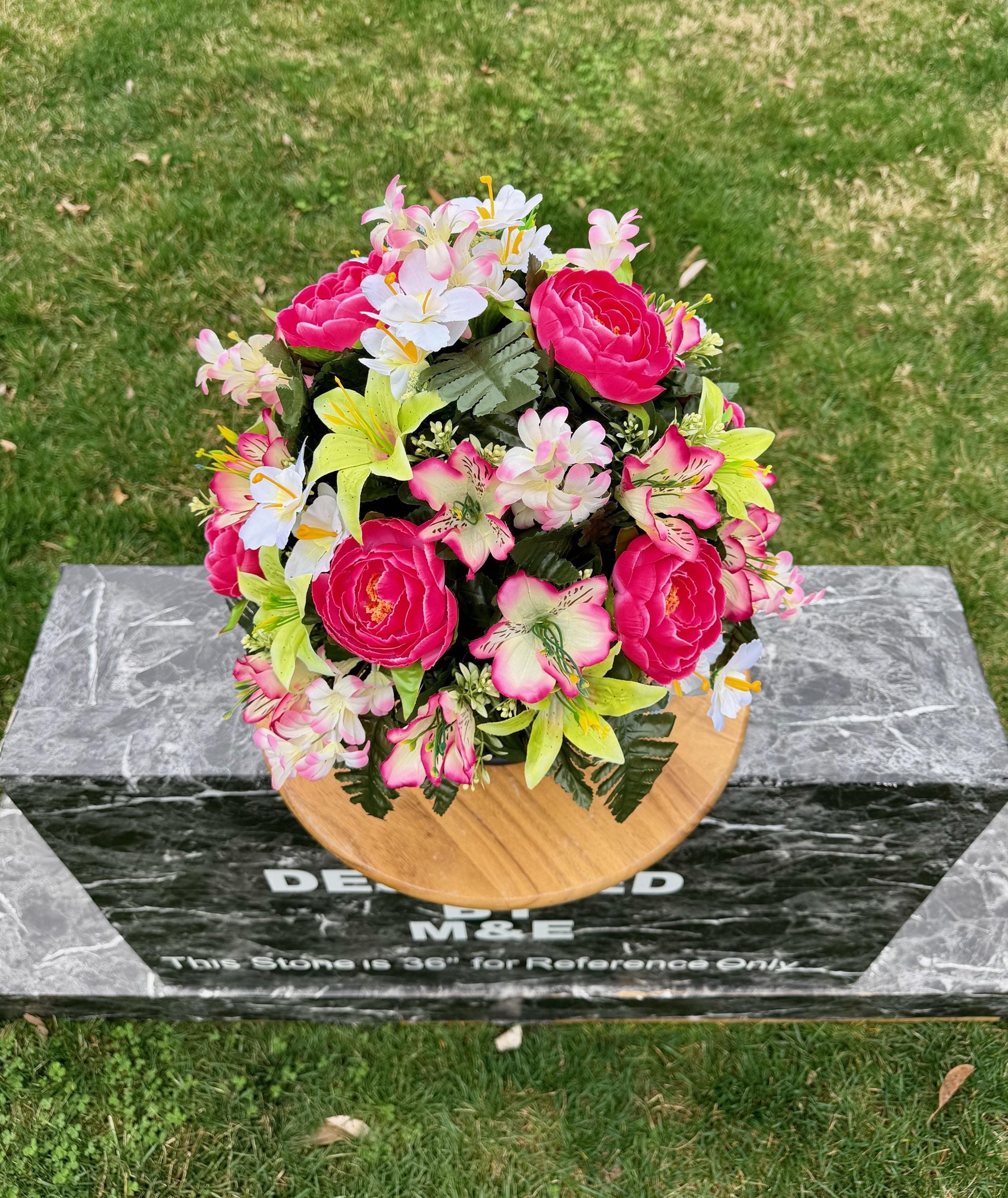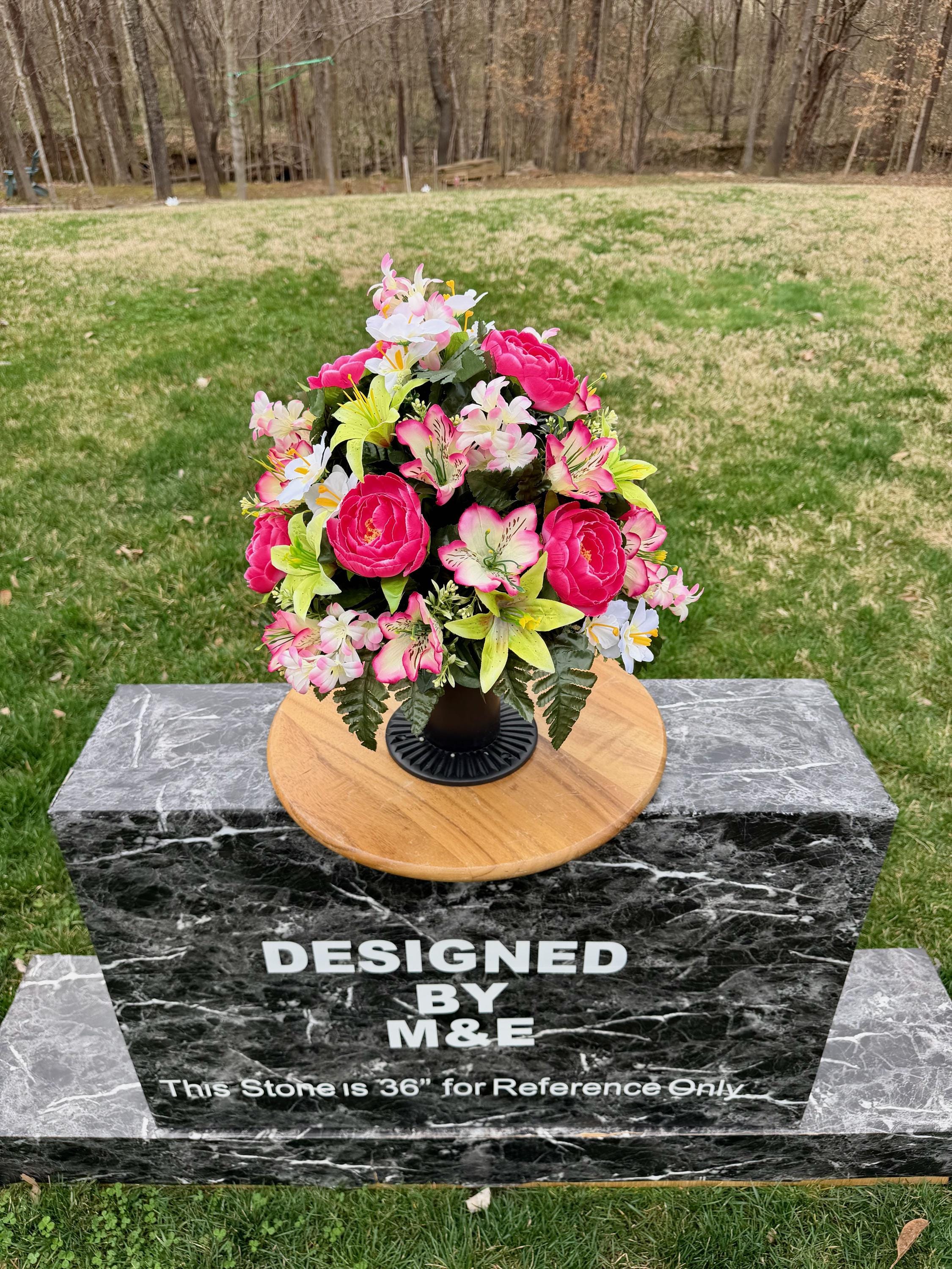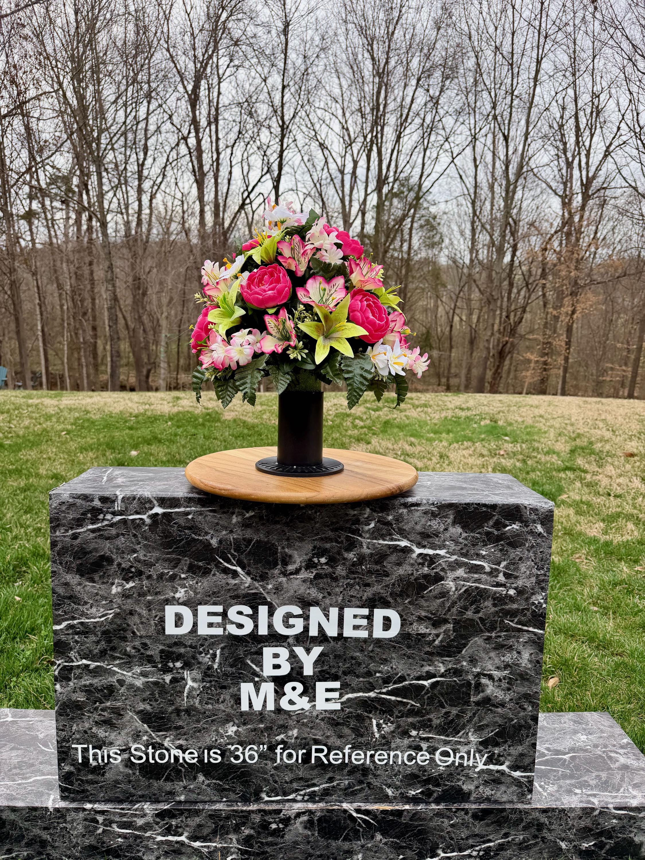 We’re a small, family-operated business consisting of myself, my husband, and my daughter. We personally manage every order and strive for excellent customer service. All our arrangements use high-quality silk flowers, though all silk blooms may fade over time. Each stem is glued into foam to withstand the elements. Designed by M&E uses only premium silks, and we put genuine care into every piece we create. Rest assured, the arrangement shown in our photos is exactly the one you’ll receive, as I design and assemble each one myself. If you’re searching for something unique or have a particular flower, color, or matching vases in mind, please contact me to discuss a custom order.