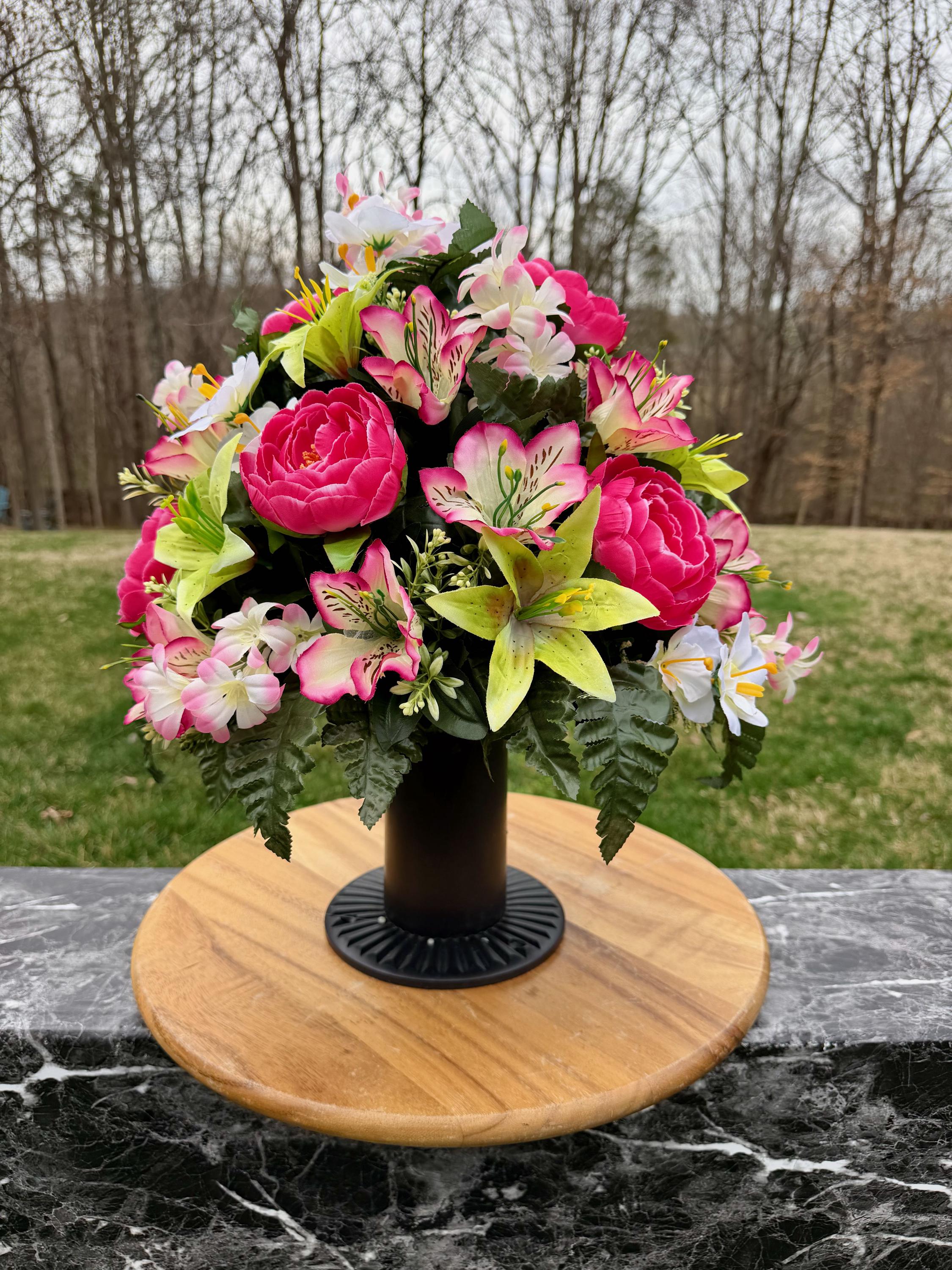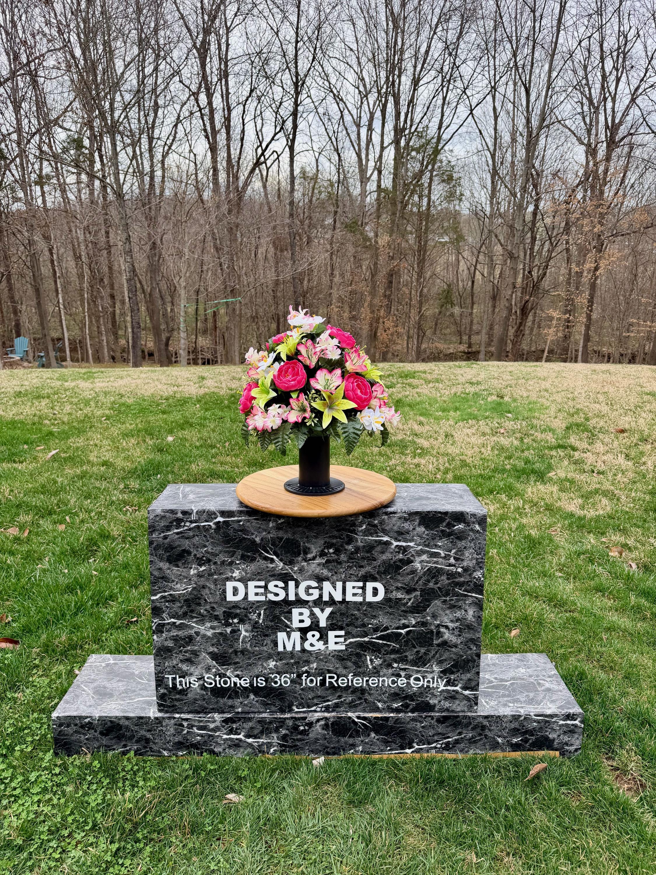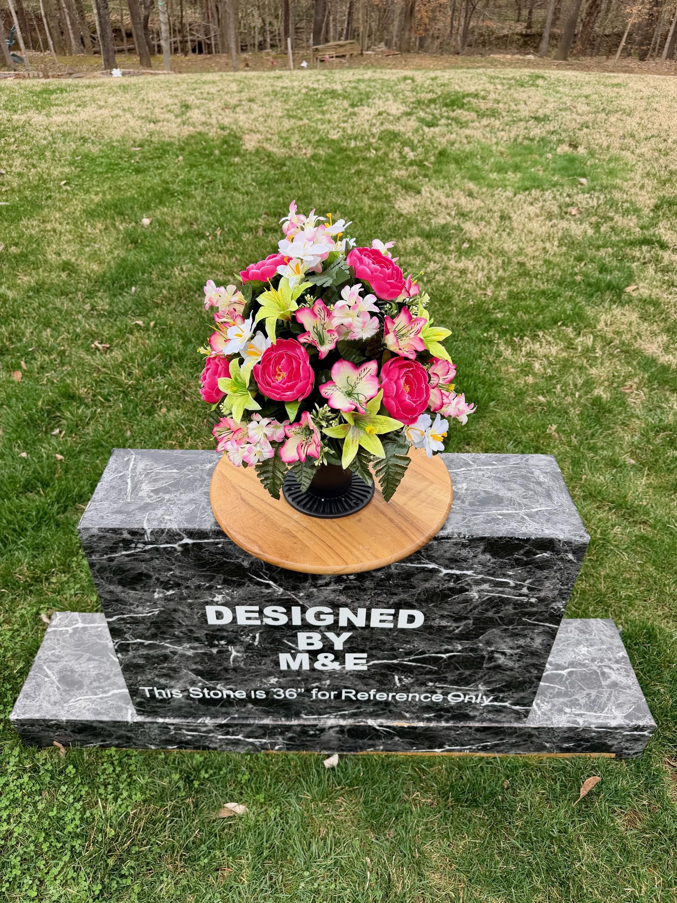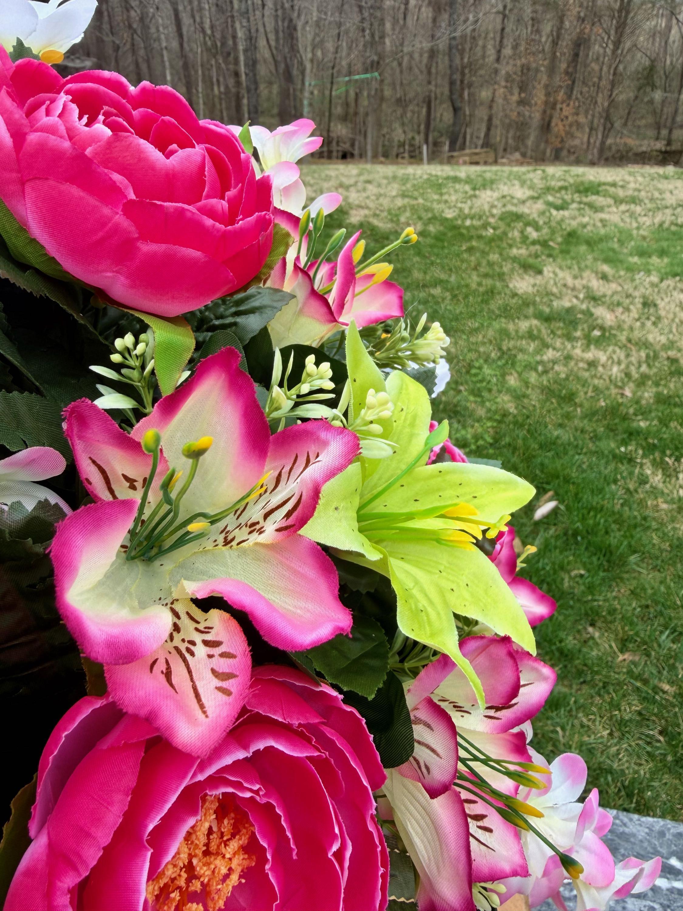 We’re a small, family-operated business consisting of myself, my husband, and my daughter. We personally manage every order and strive for excellent customer service. All our arrangements use high-quality silk flowers, though all silk blooms may fade over time. Each stem is glued into foam to withstand the elements. Designed by M&E uses only premium silks, and we put genuine care into every piece we create. Rest assured, the arrangement shown in our photos is exactly the one you’ll receive, as I design and assemble each one myself. If you’re searching for something unique or have a particular flower, color, or matching vases in mind, please contact me to discuss a custom order.