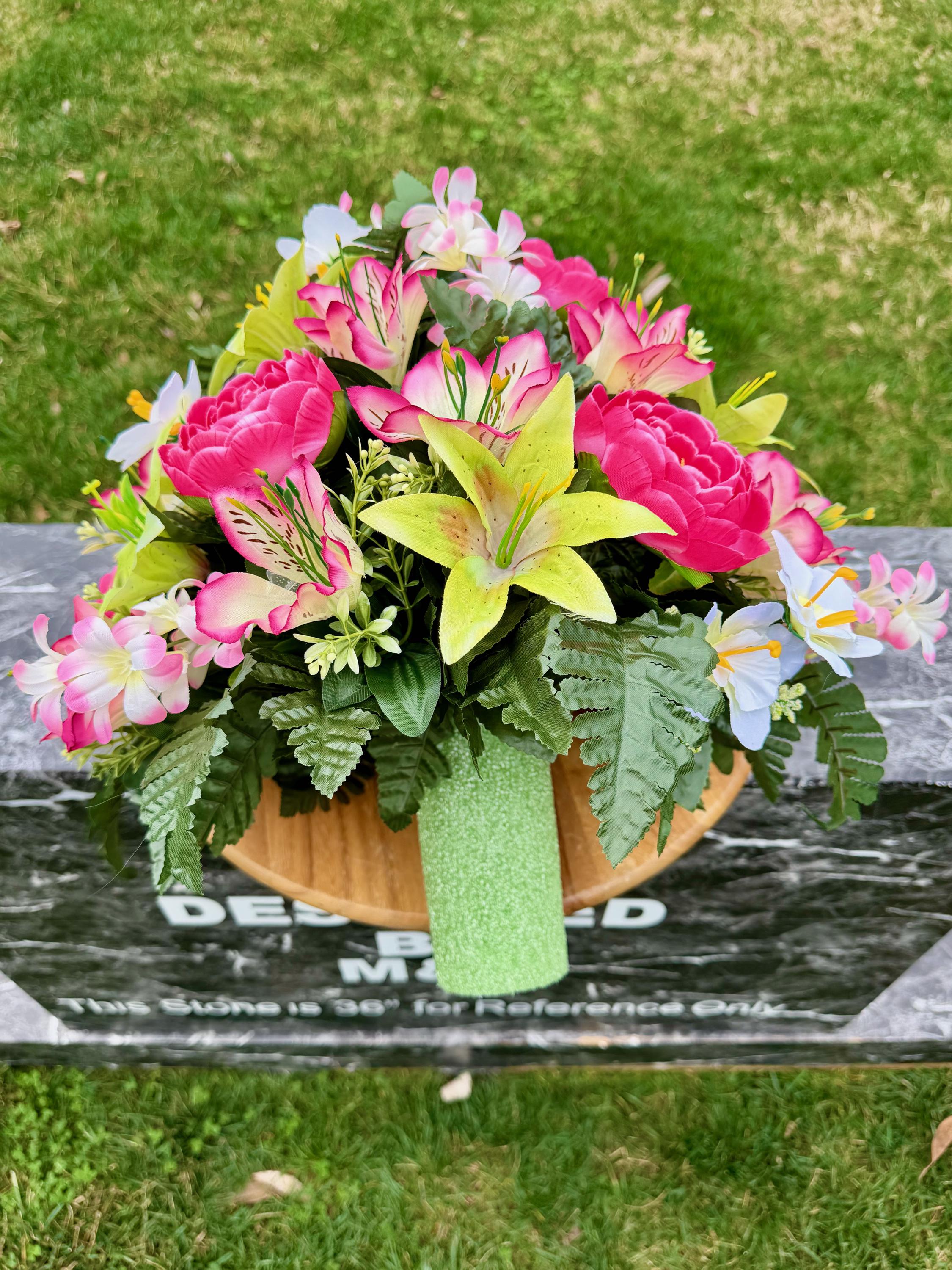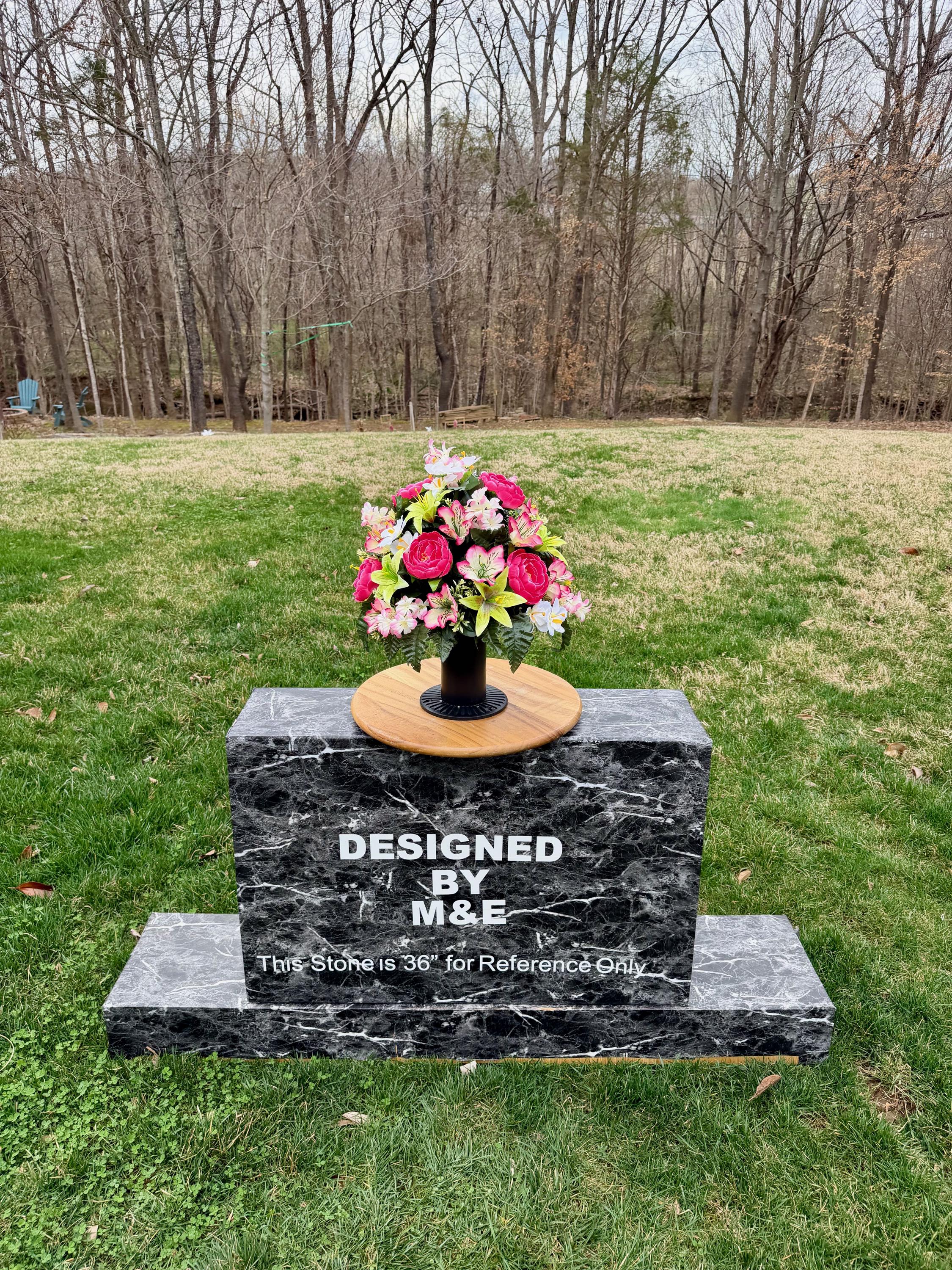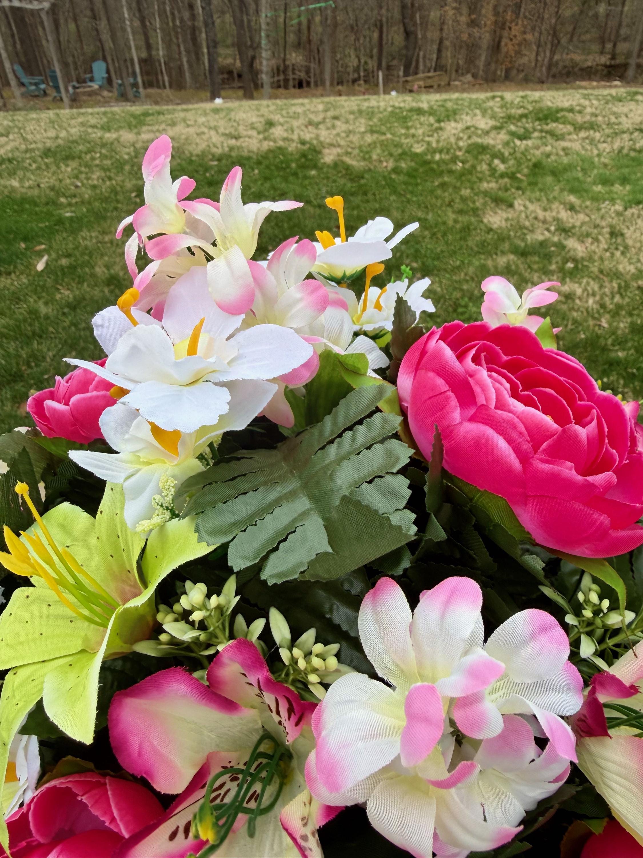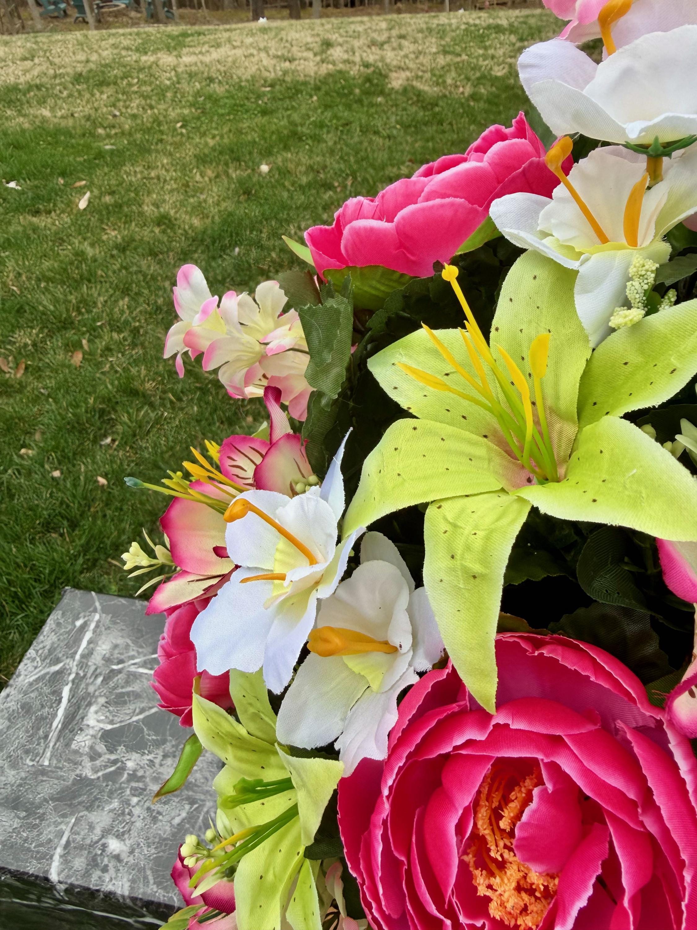 We’re a small, family-operated business consisting of myself, my husband, and my daughter. We personally manage every order and strive for excellent customer service. All our arrangements use high-quality silk flowers, though all silk blooms may fade over time. Each stem is glued into foam to withstand the elements. Designed by M&E uses only premium silks, and we put genuine care into every piece we create. Rest assured, the arrangement shown in our photos is exactly the one you’ll receive, as I design and assemble each one myself. If you’re searching for something unique or have a particular flower, color, or matching vases in mind, please contact me to discuss a custom order.