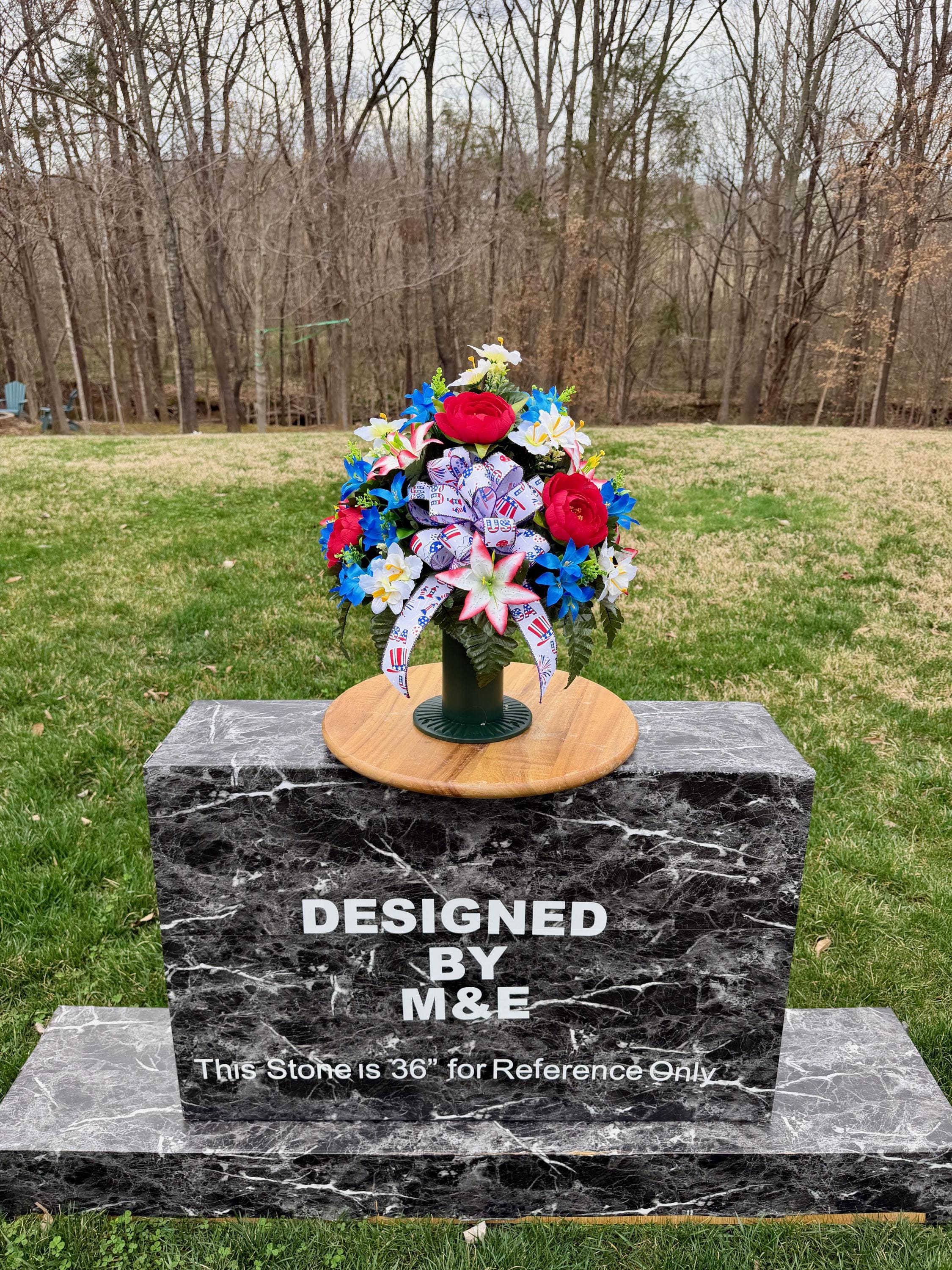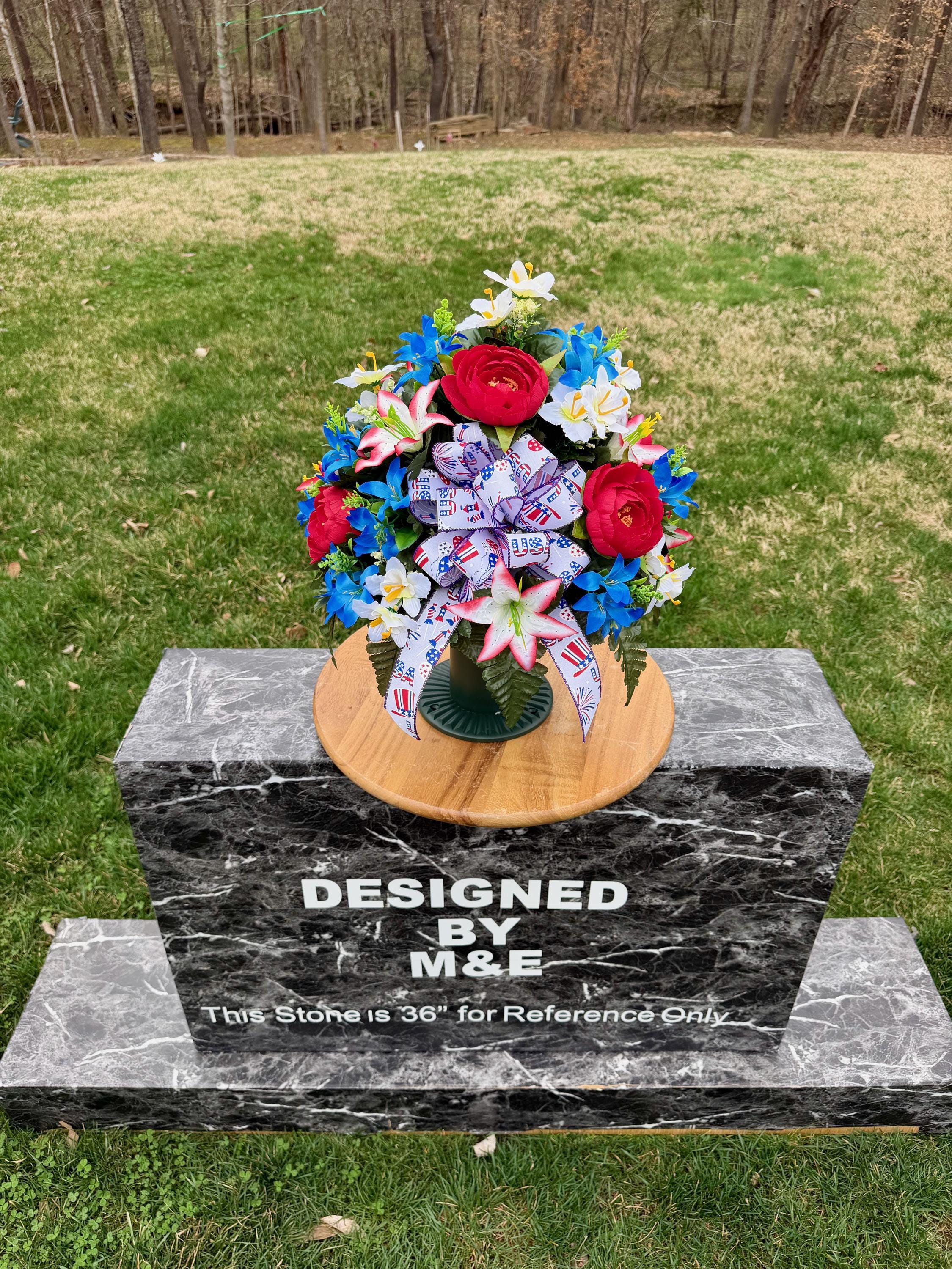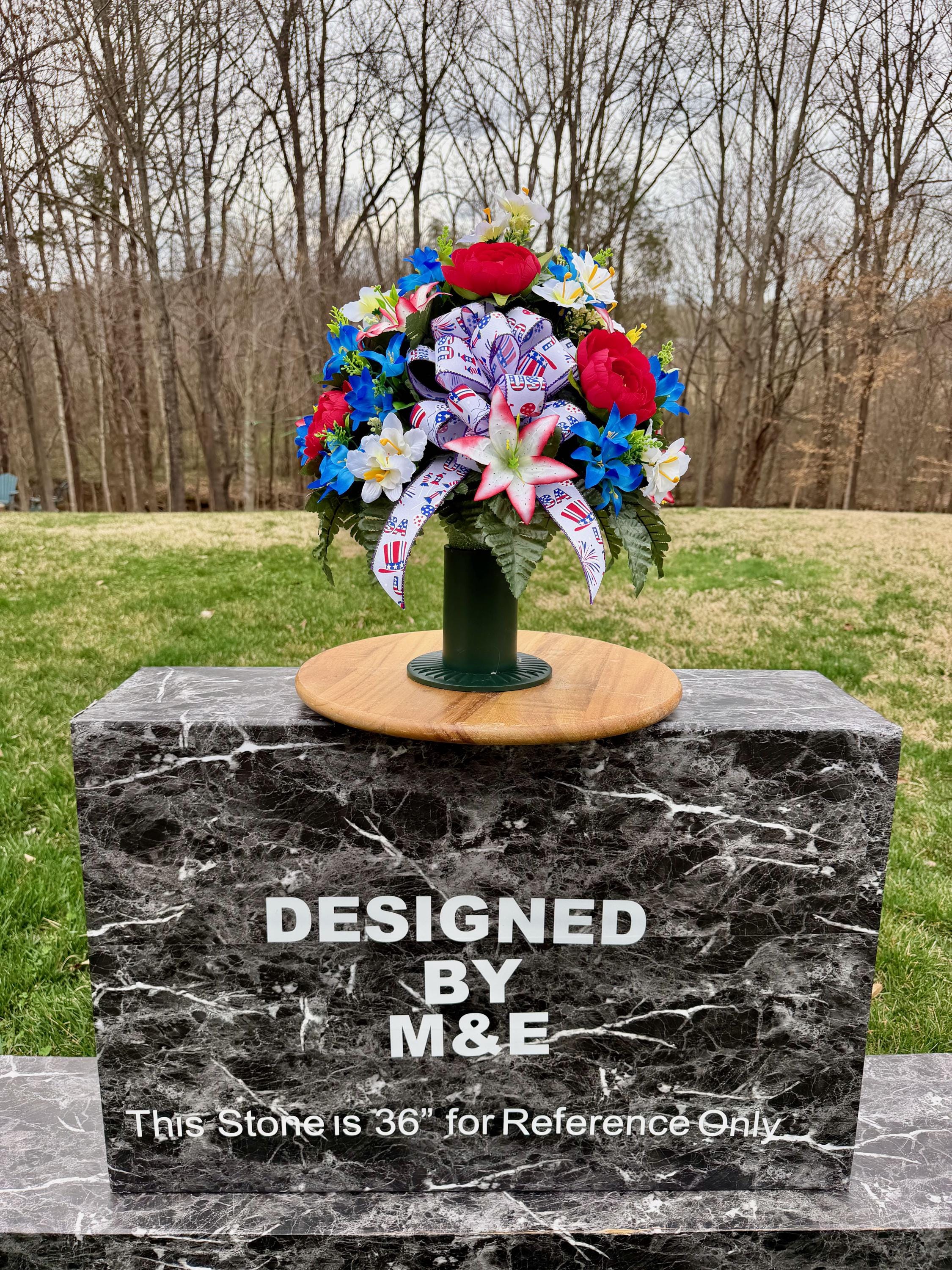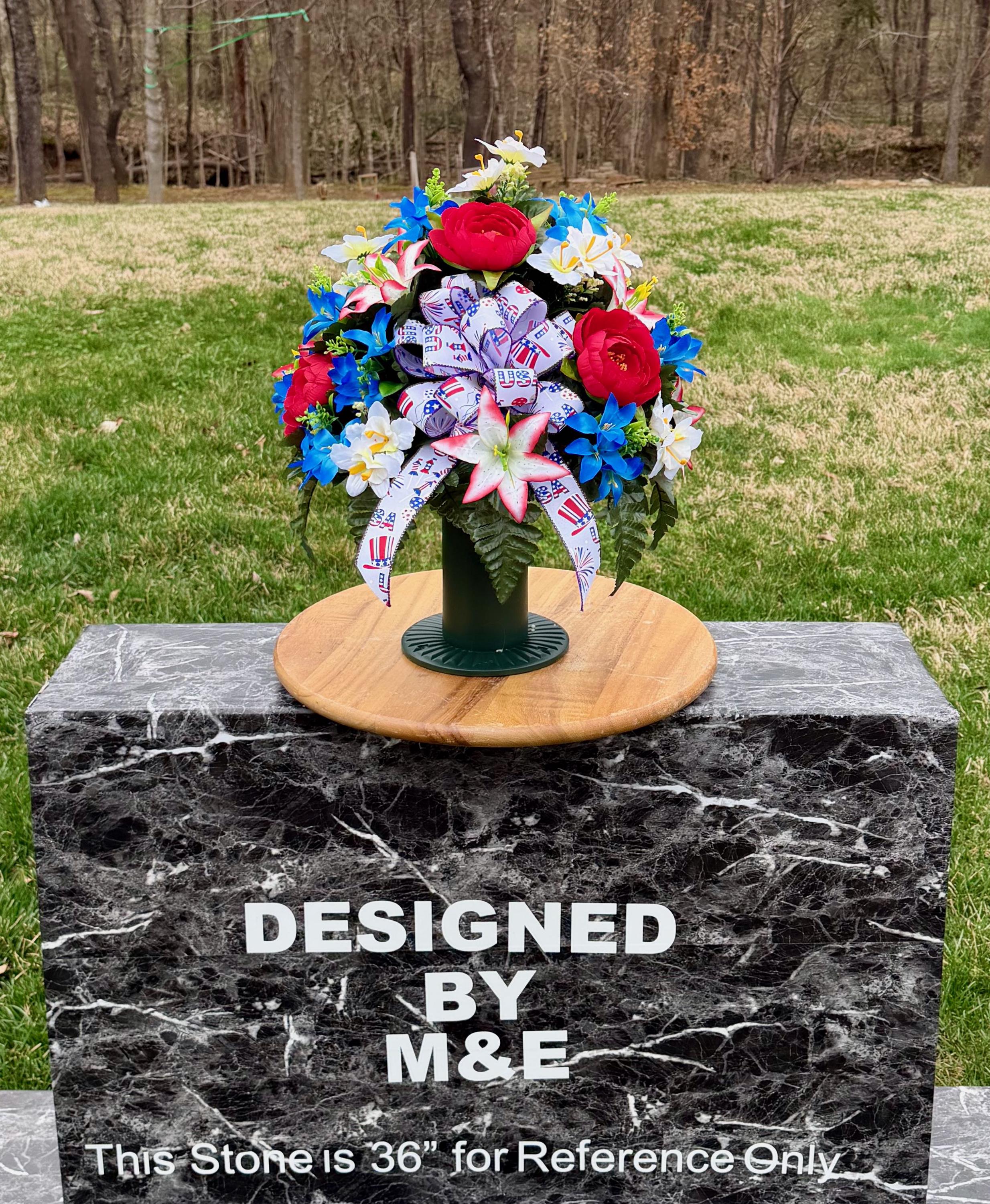 We’re a small, family-operated business consisting of myself, my husband, and my daughter. We personally manage every order and strive for excellent customer service. All our arrangements use high-quality silk flowers, though all silk blooms may fade over time. Each stem is glued into foam to withstand the elements. Designed by M&E uses only premium silks, and we put genuine care into every piece we create. Rest assured, the arrangement shown in our photos is exactly the one you’ll receive, as I design and assemble each one myself. If you’re searching for something unique or have a particular flower, color, or matching vases in mind, please contact me to discuss a custom order.