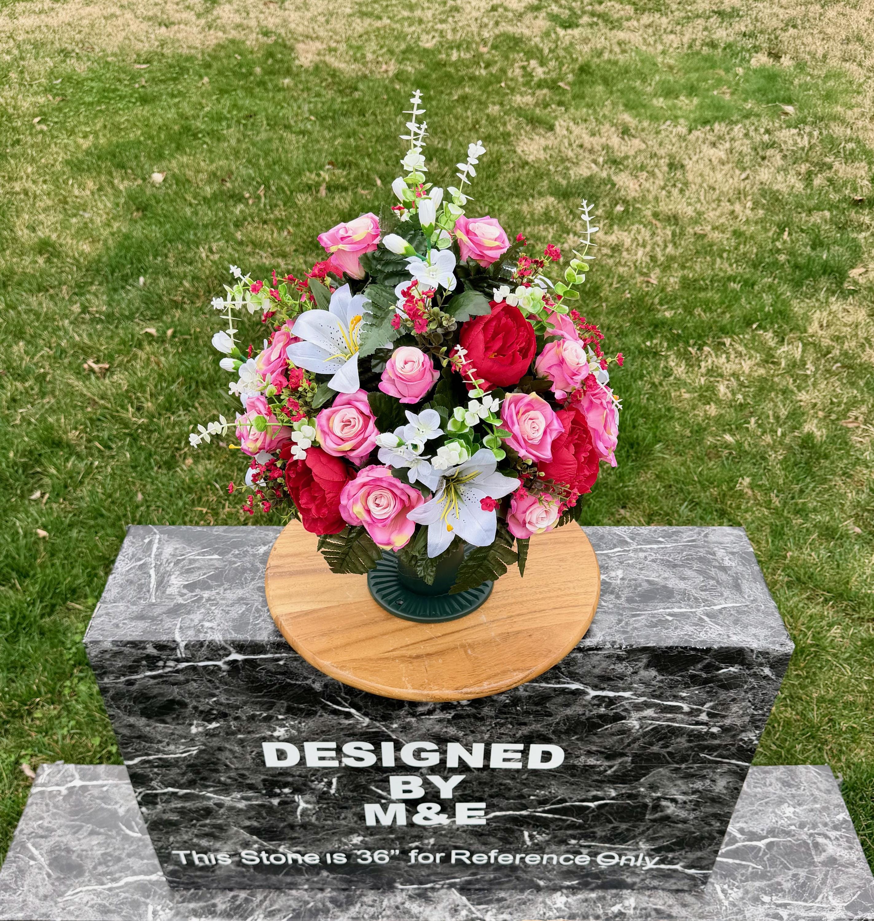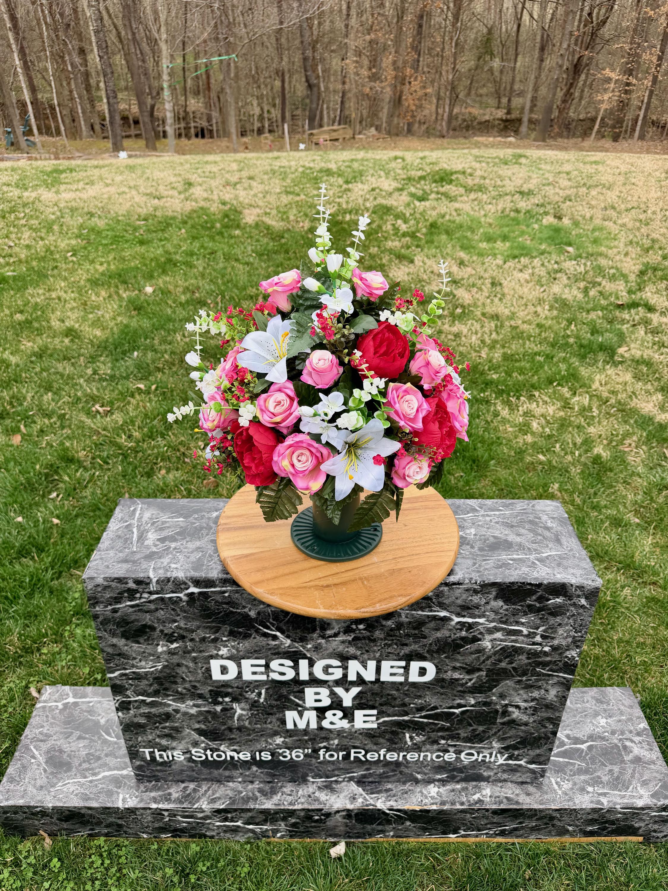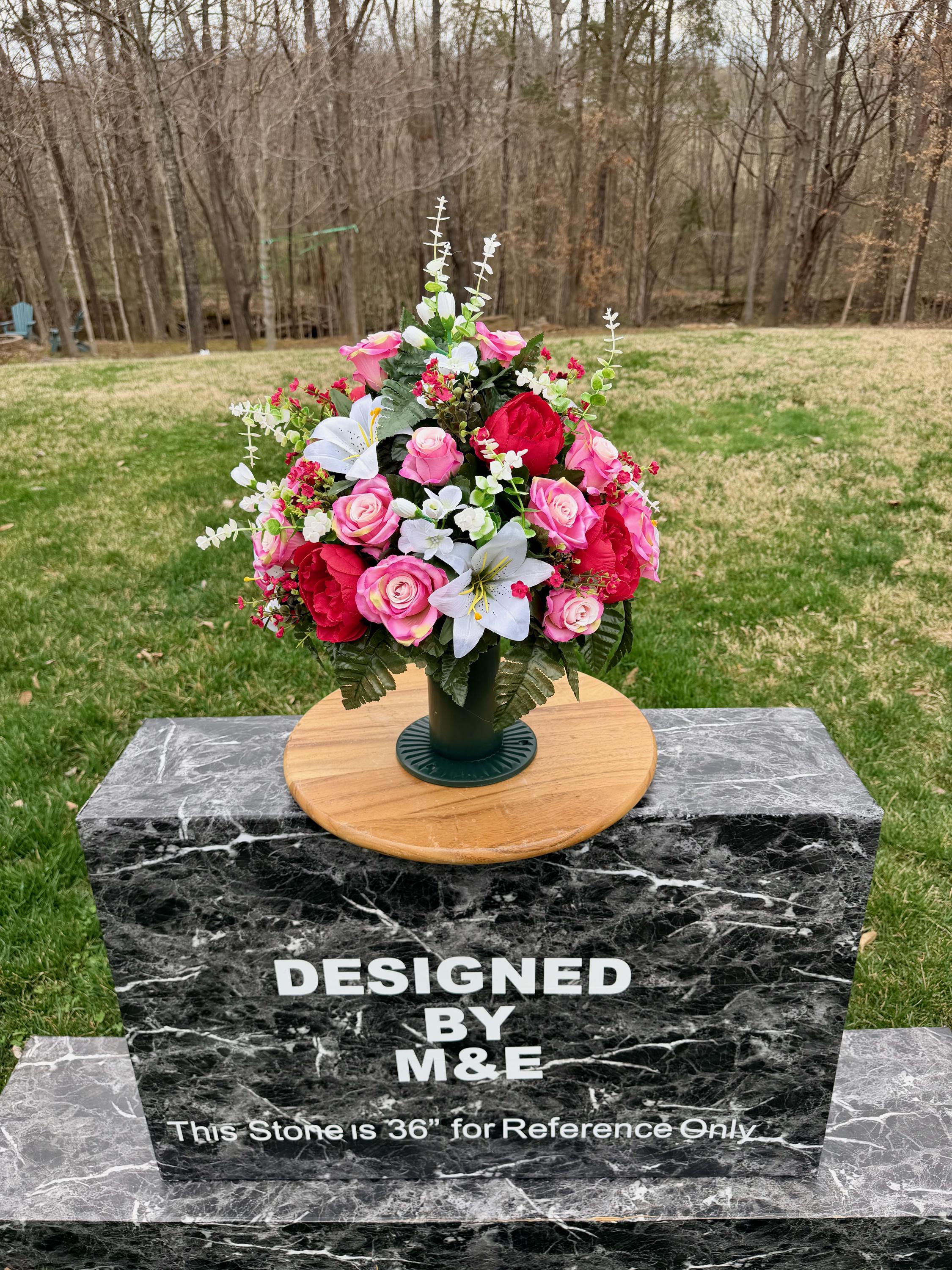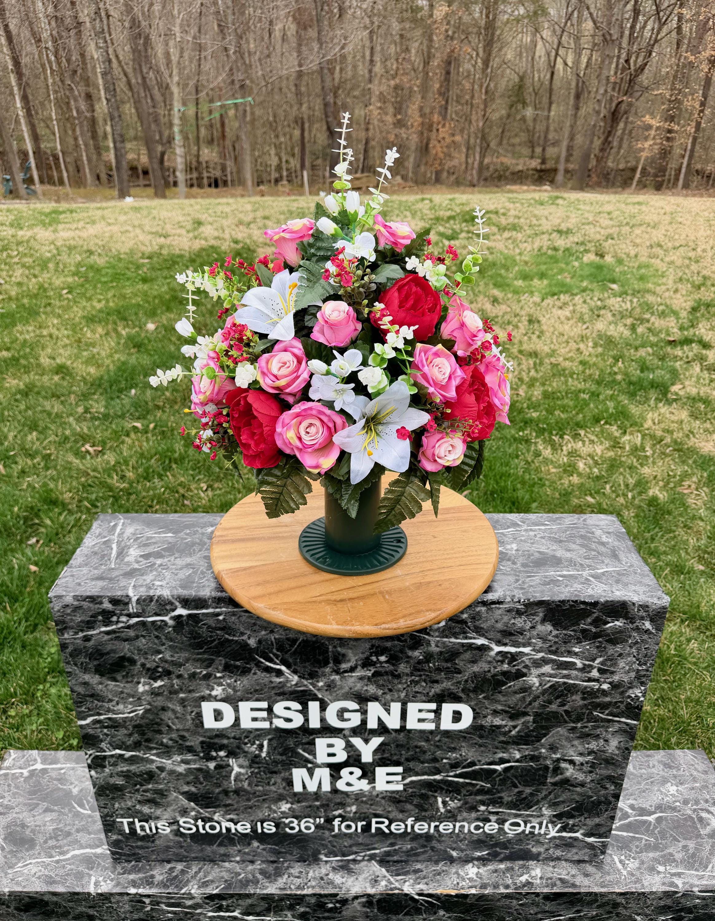 We’re a small, family-operated business consisting of myself, my husband, and my daughter. We personally manage every order and strive for excellent customer service. All our arrangements use high-quality silk flowers, though all silk blooms may fade over time. Each stem is glued into foam to withstand the elements. Designed by M&E uses only premium silks, and we put genuine care into every piece we create. Rest assured, the arrangement shown in our photos is exactly the one you’ll receive, as I design and assemble each one myself. If you’re searching for something unique or have a particular flower, color, or matching vases in mind, please contact me to discuss a custom order.
