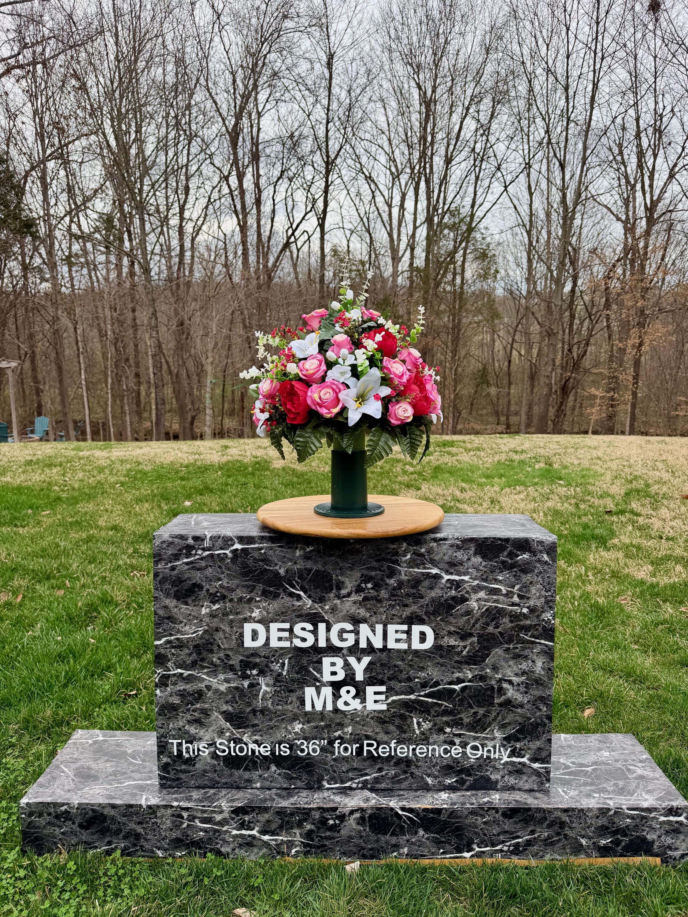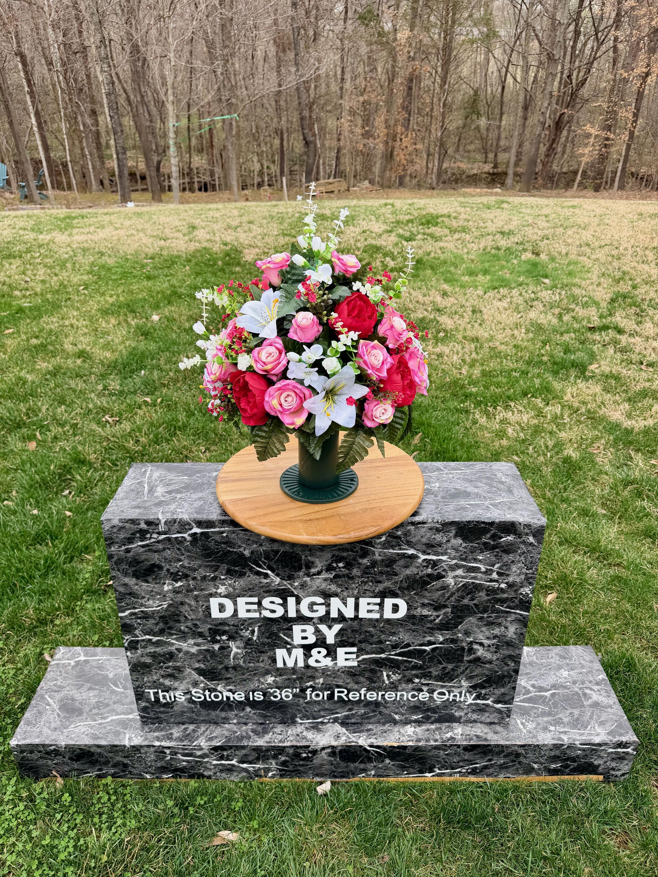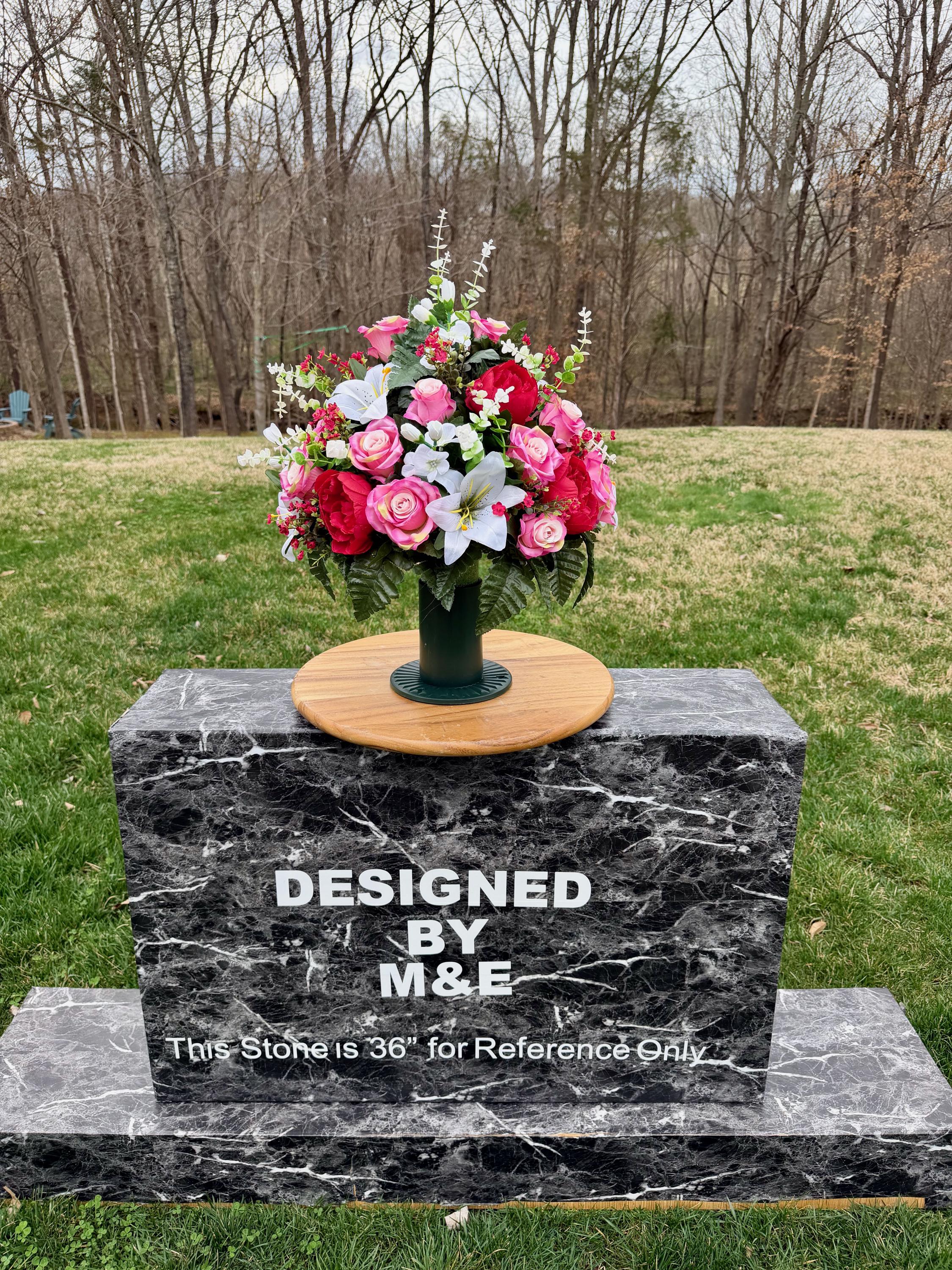 We’re a small, family-operated business consisting of myself, my husband, and my daughter. We personally manage every order and strive for excellent customer service. All our arrangements use high-quality silk flowers, though all silk blooms may fade over time. Each stem is glued into foam to withstand the elements. Designed by M&E uses only premium silks, and we put genuine care into every piece we create. Rest assured, the arrangement shown in our photos is exactly the one you’ll receive, as I design and assemble each one myself. If you’re searching for something unique or have a particular flower, color, or matching vases in mind, please contact me to discuss a custom order.