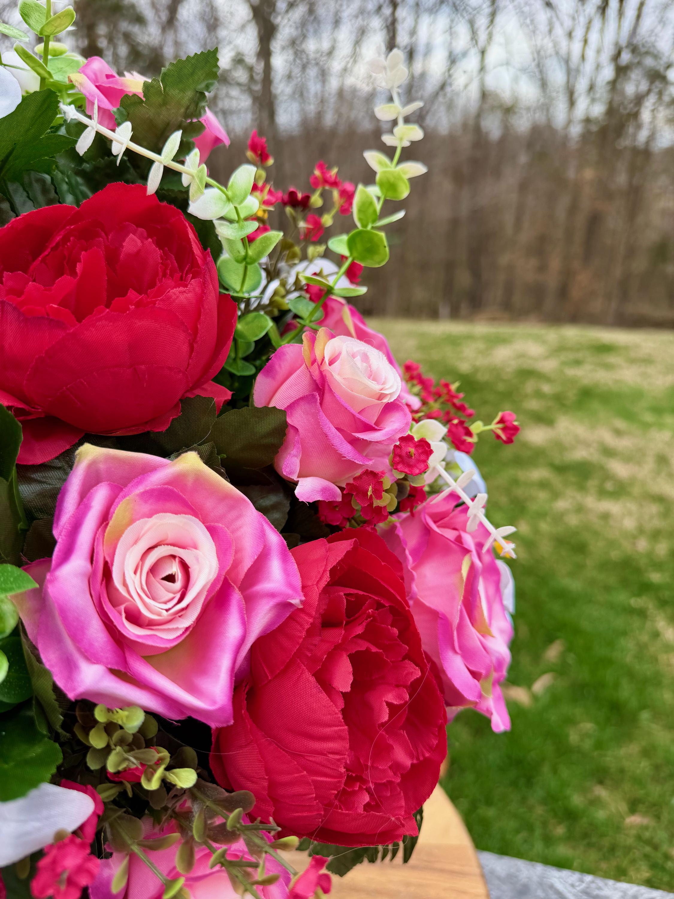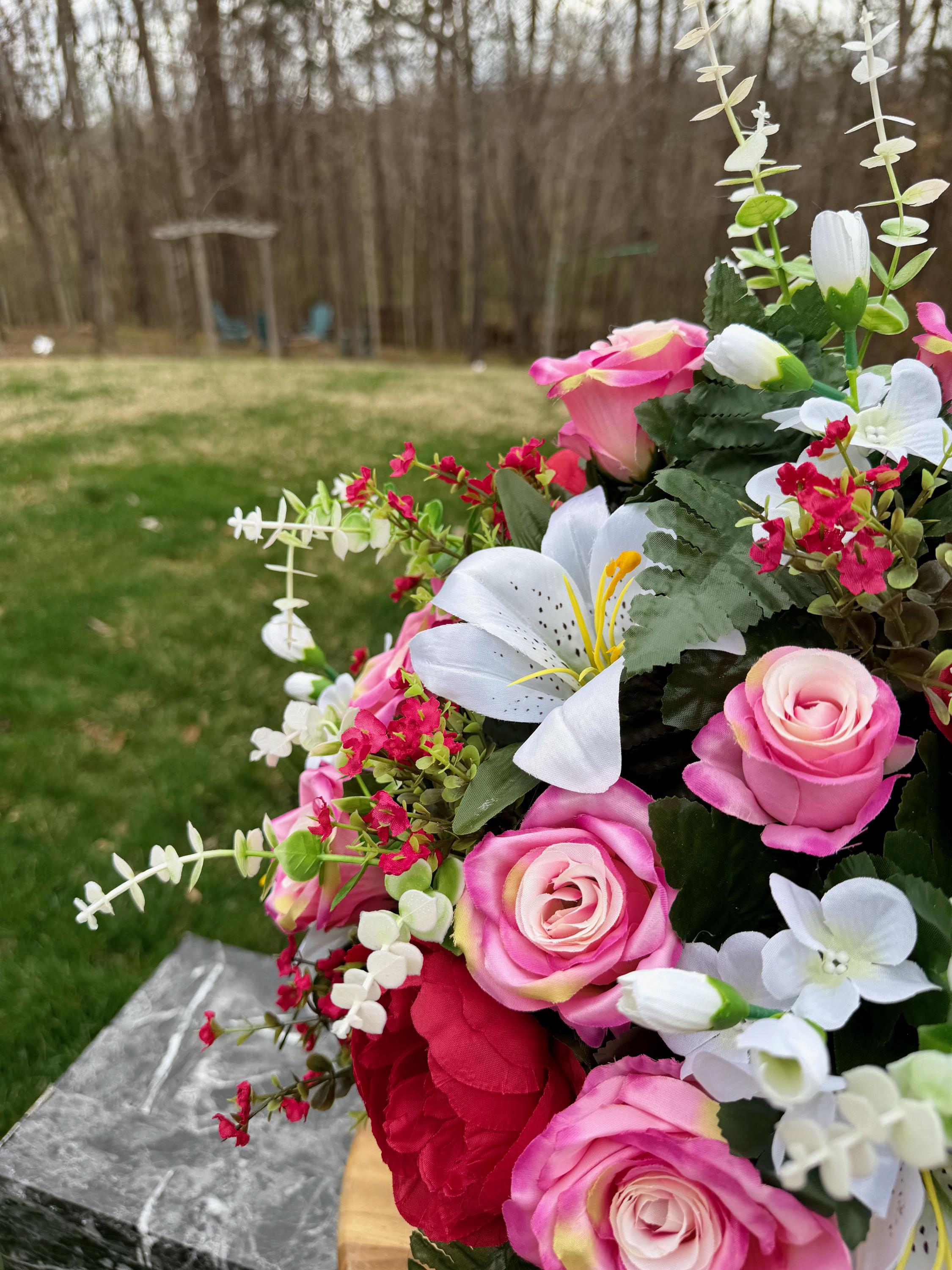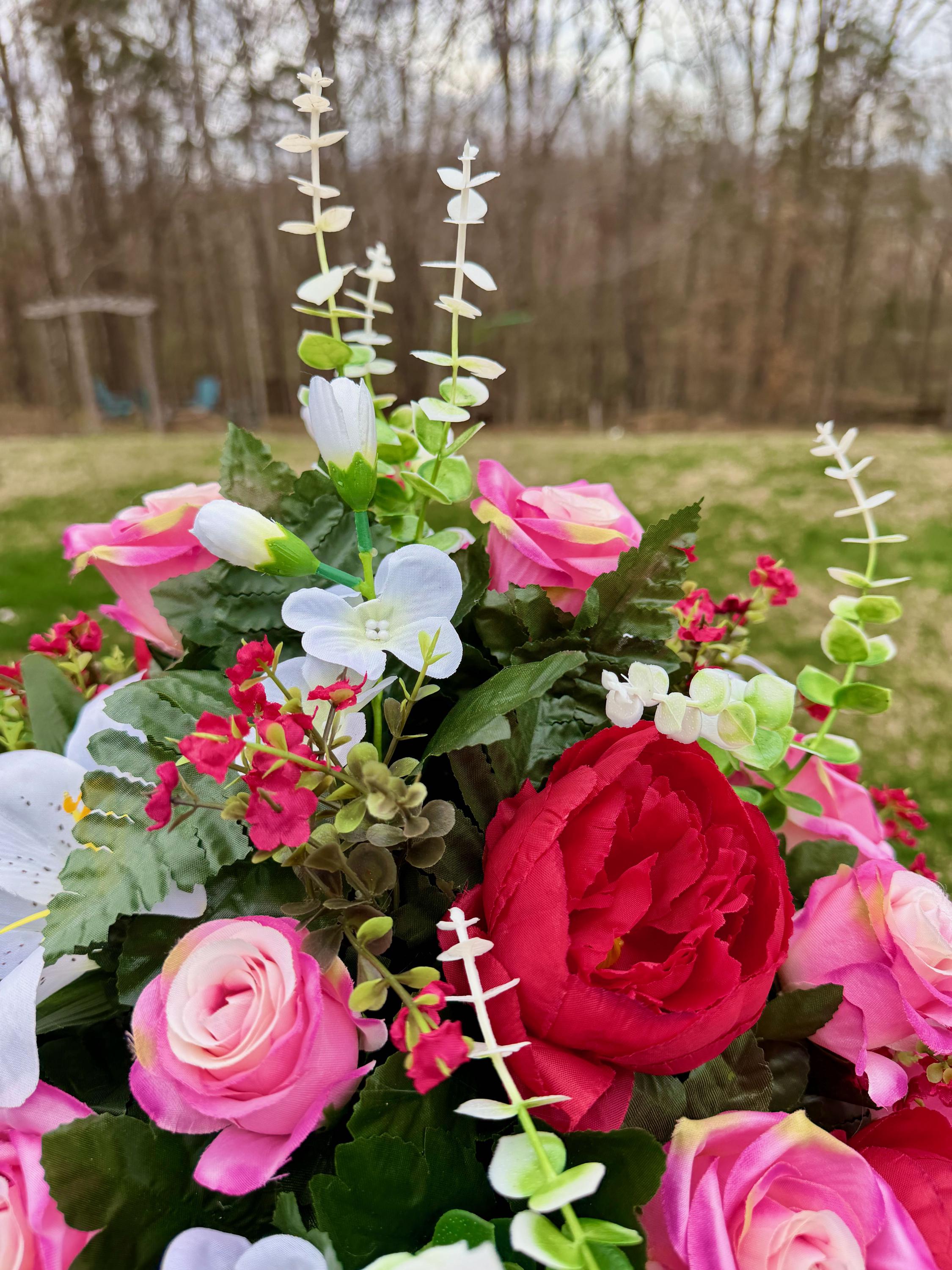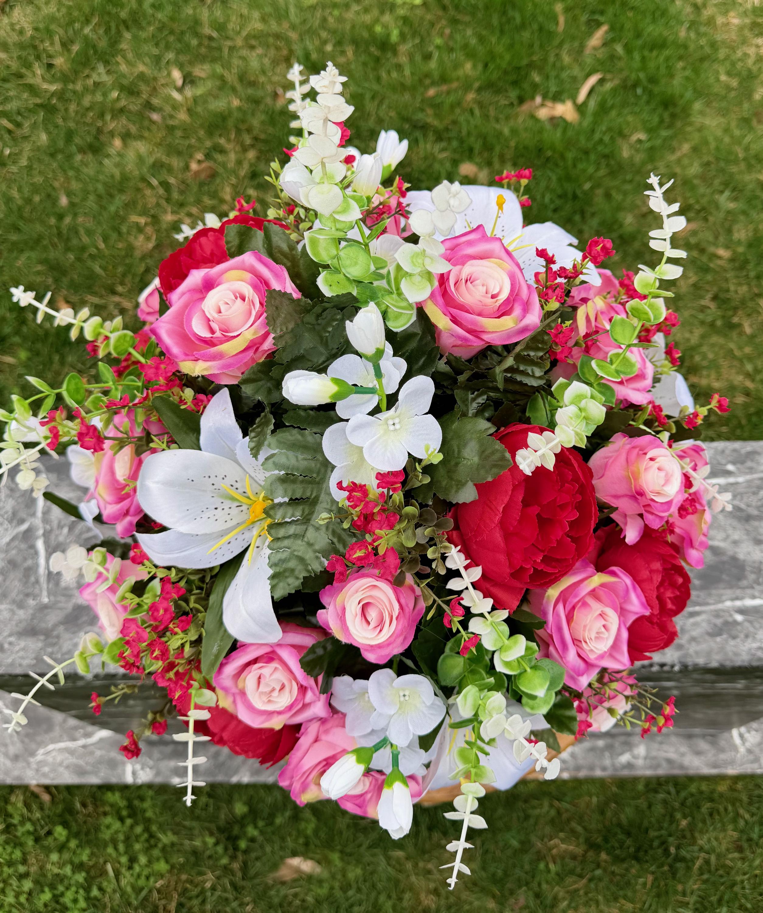 We’re a small, family-operated business consisting of myself, my husband, and my daughter. We personally manage every order and strive for excellent customer service. All our arrangements use high-quality silk flowers, though all silk blooms may fade over time. Each stem is glued into foam to withstand the elements. Designed by M&E uses only premium silks, and we put genuine care into every piece we create. Rest assured, the arrangement shown in our photos is exactly the one you’ll receive, as I design and assemble each one myself. If you’re searching for something unique or have a particular flower, color, or matching vases in mind, please contact me to discuss a custom order.