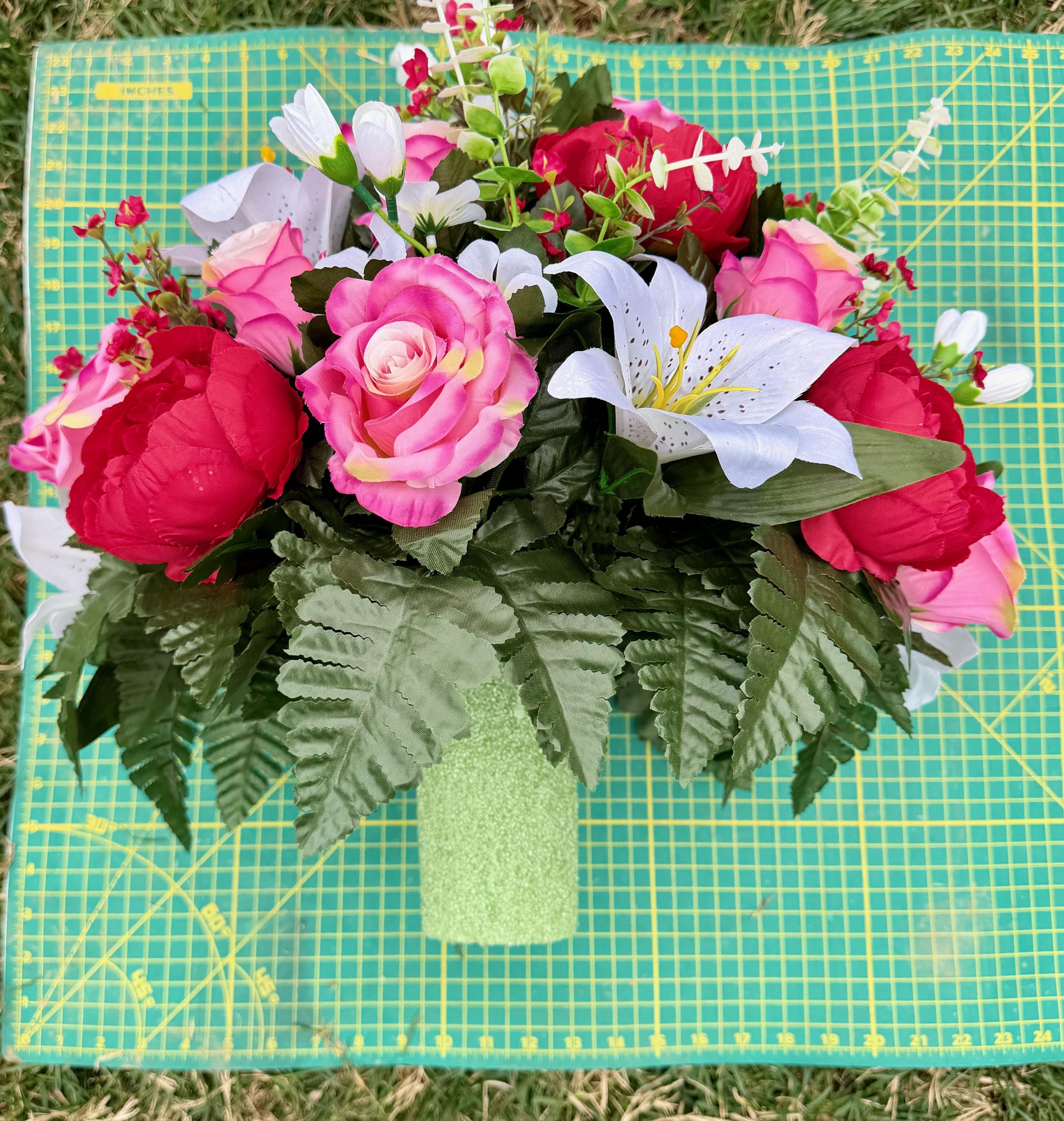 - To find the exact size of each arrangement, please refer to the photo showing it on the green measuring mat.