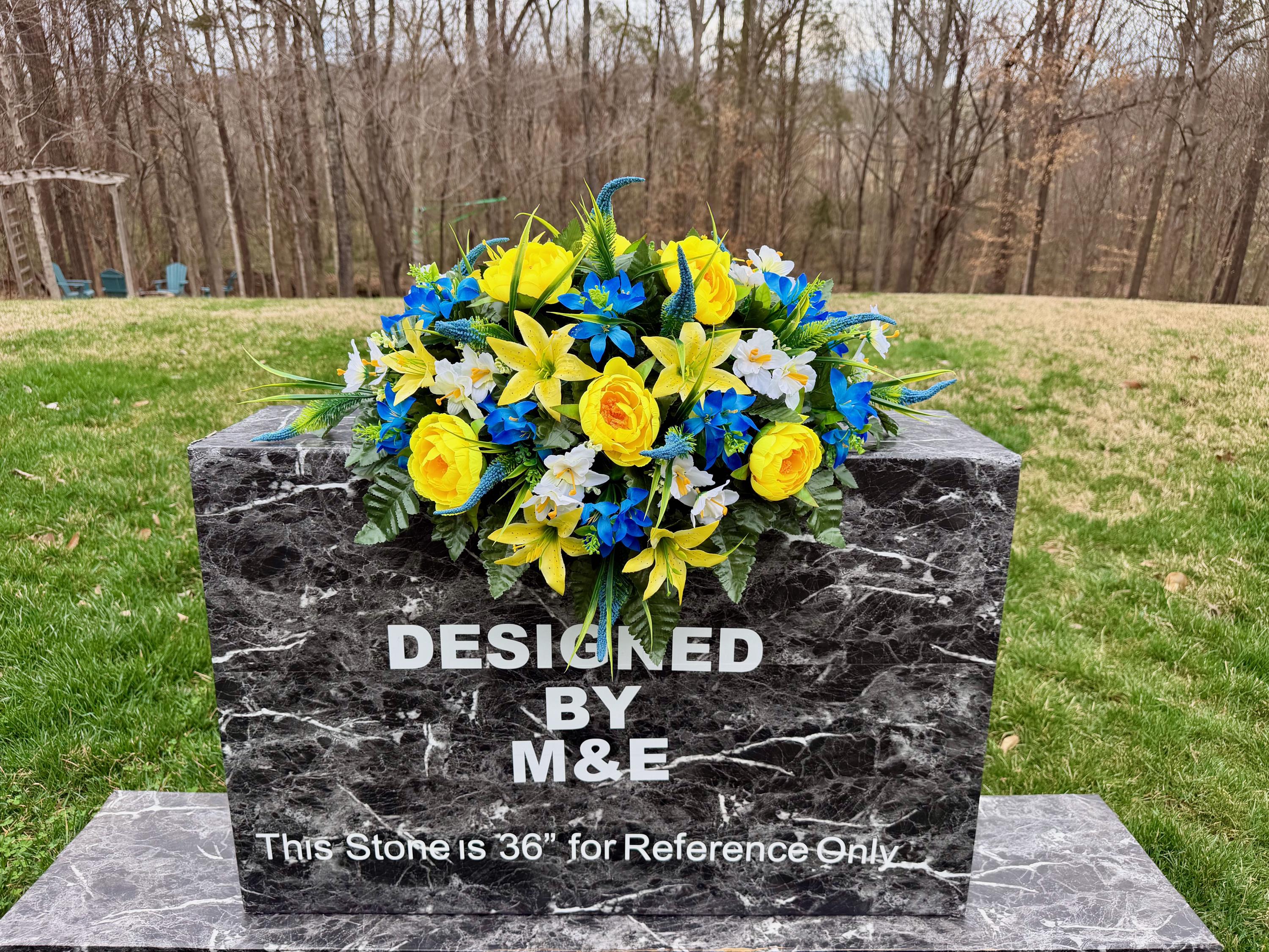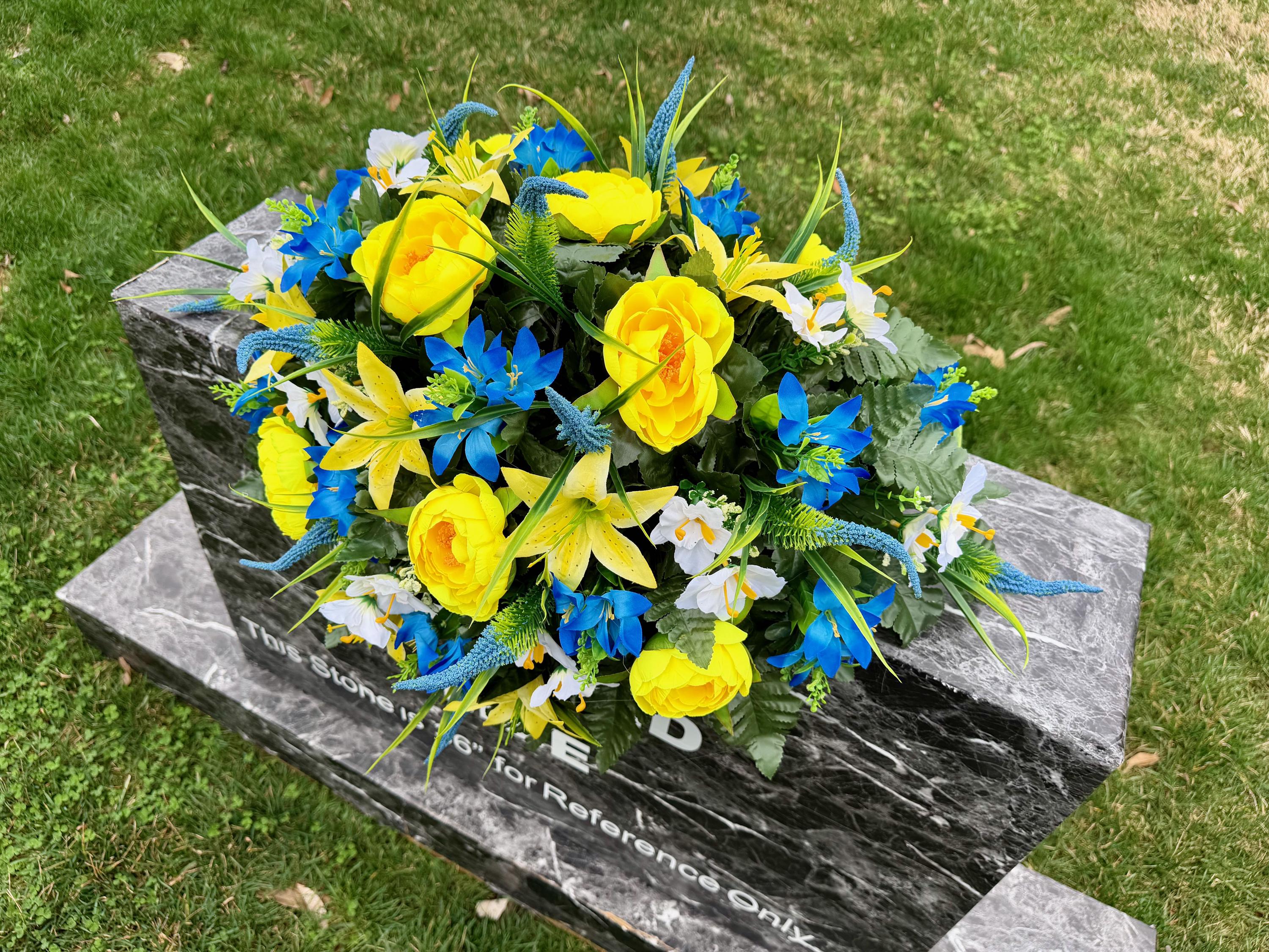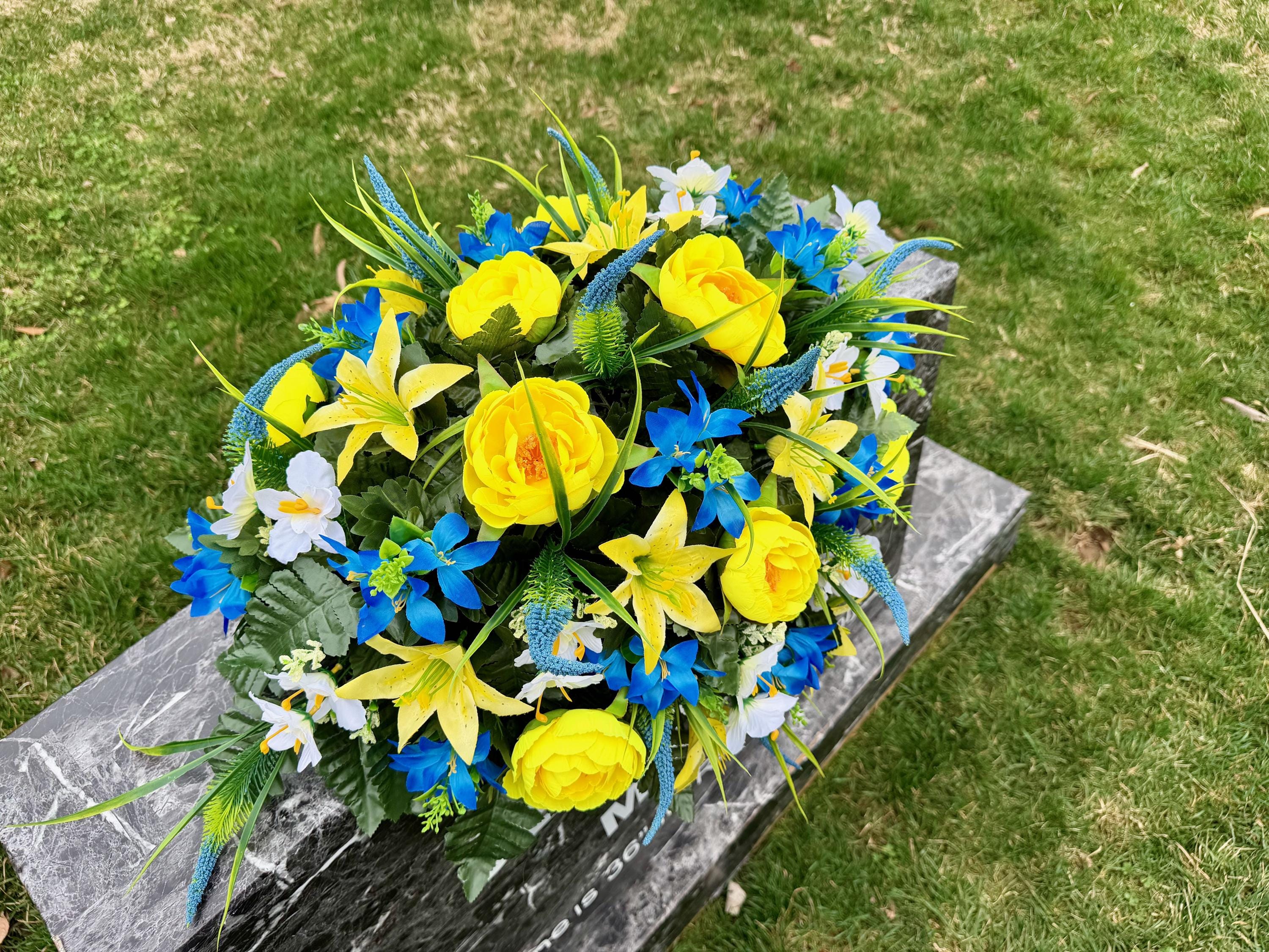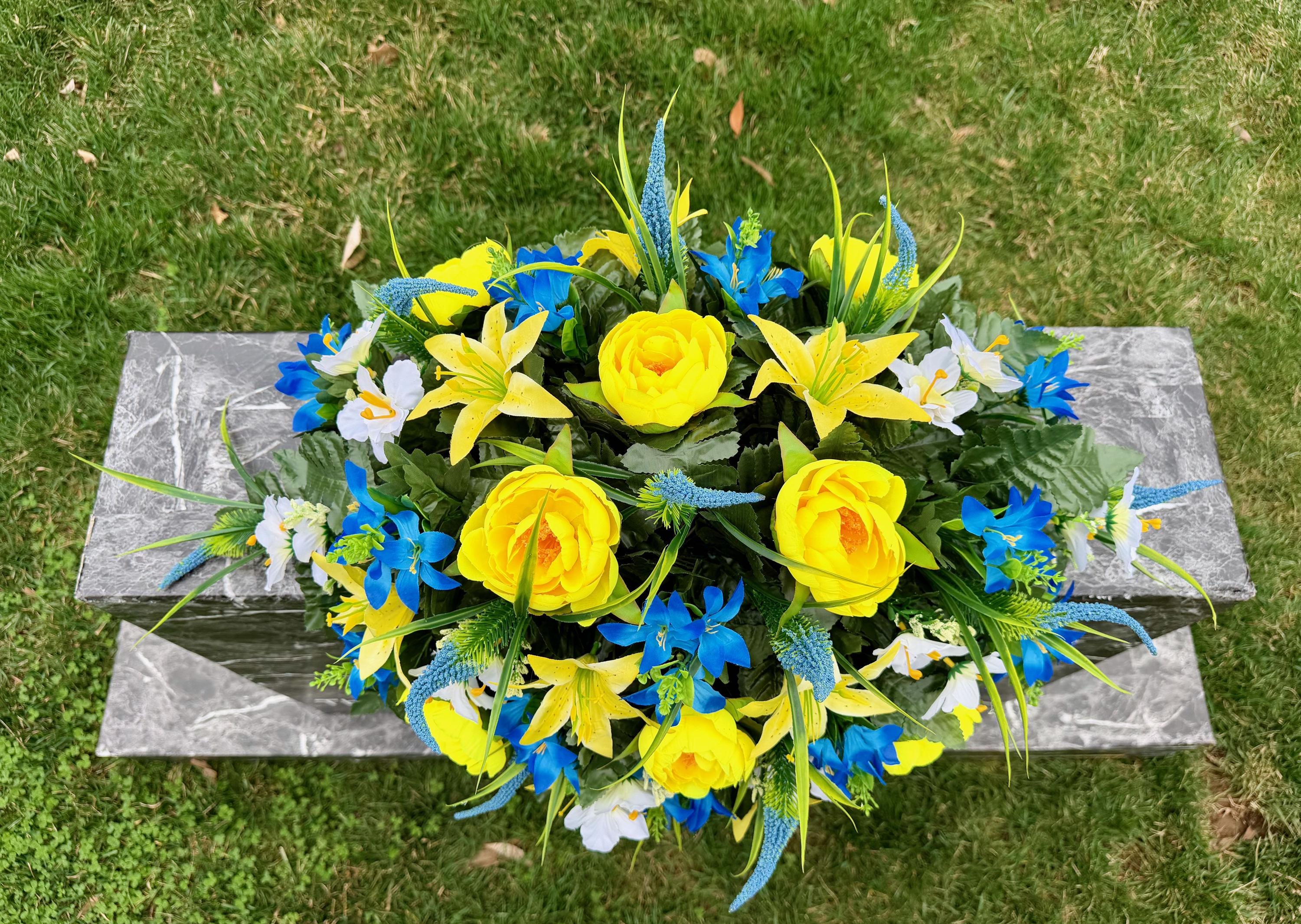 Bright Blue and Yellow Cemetery Saddle, Grave Decoration, Memorial Flowers